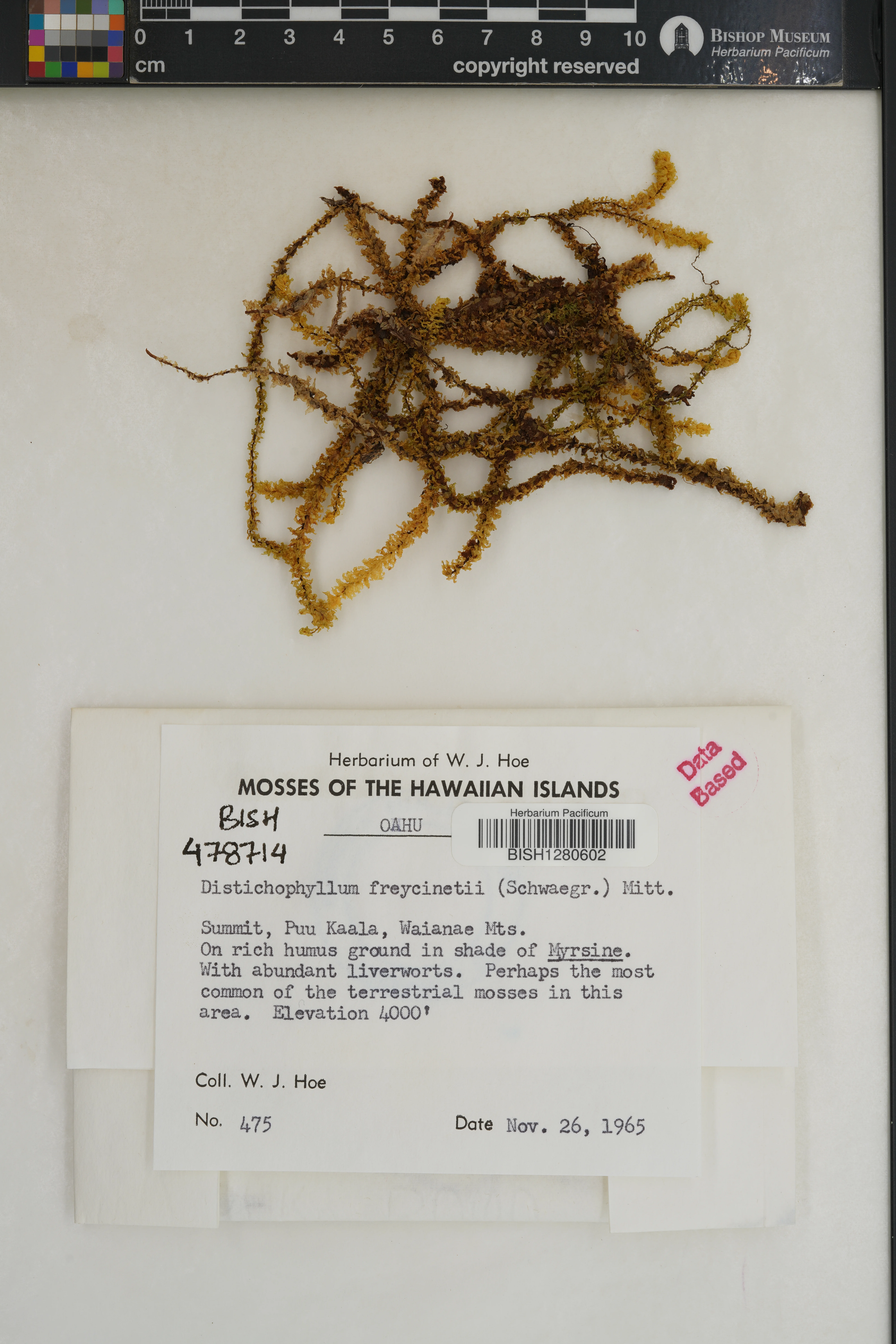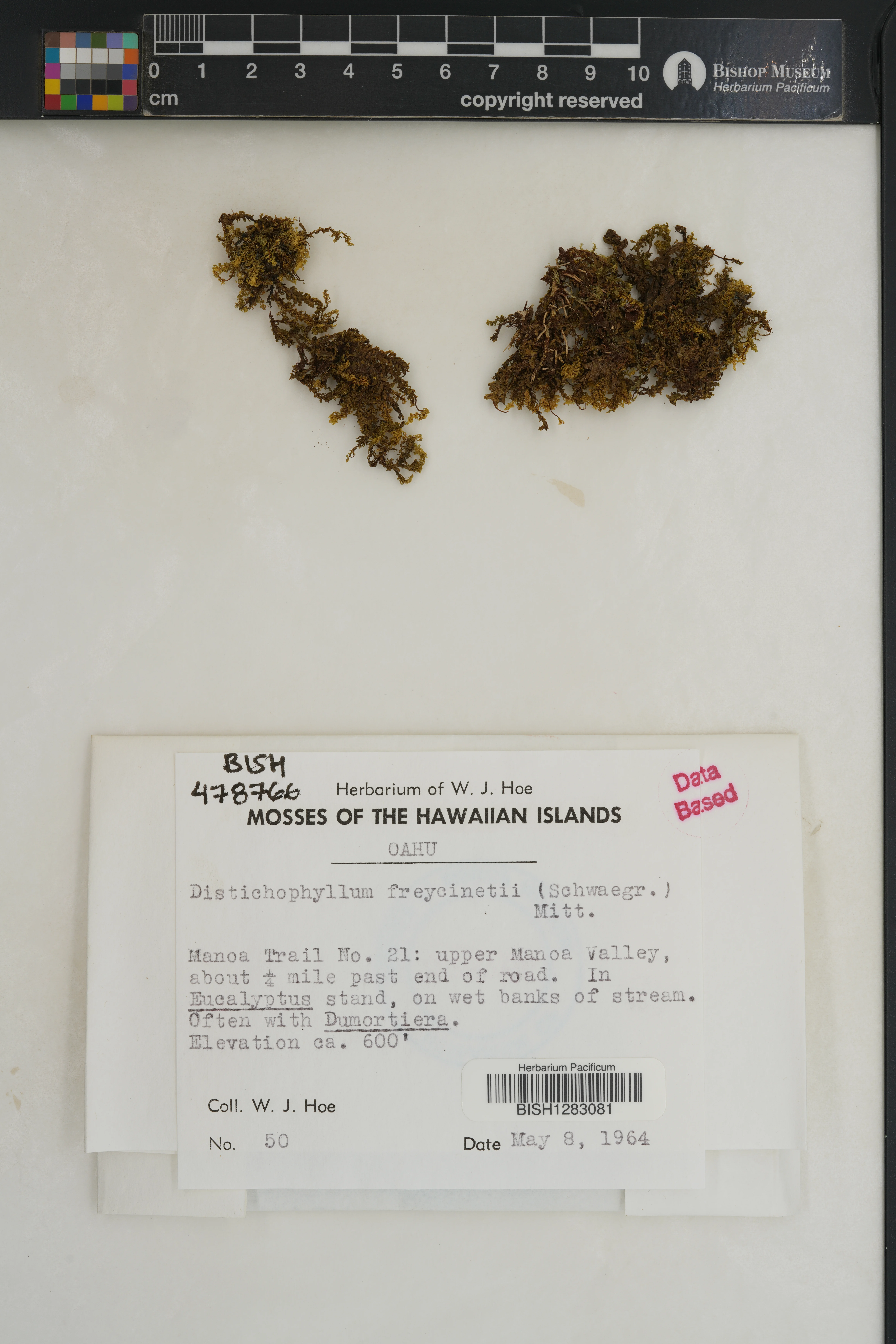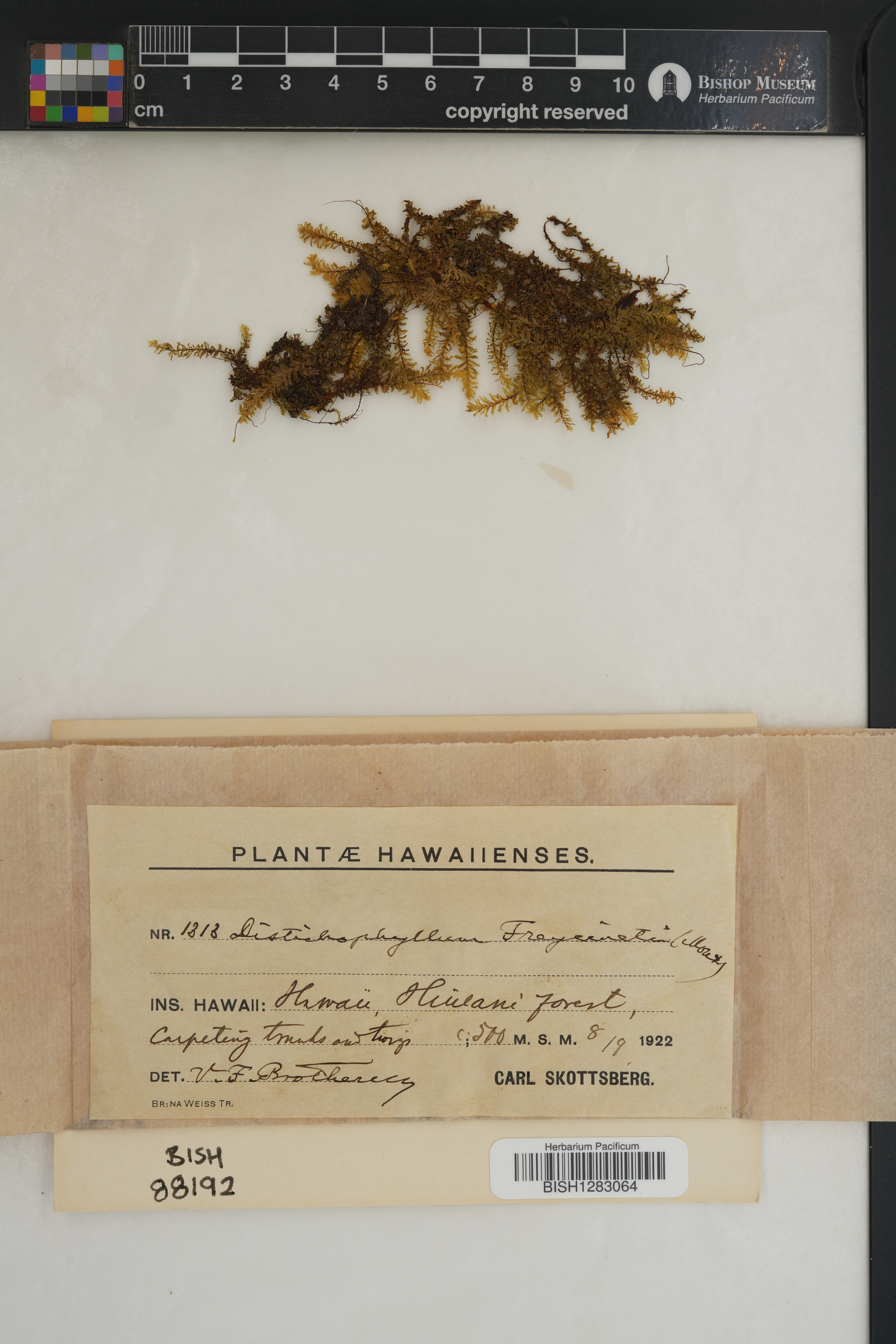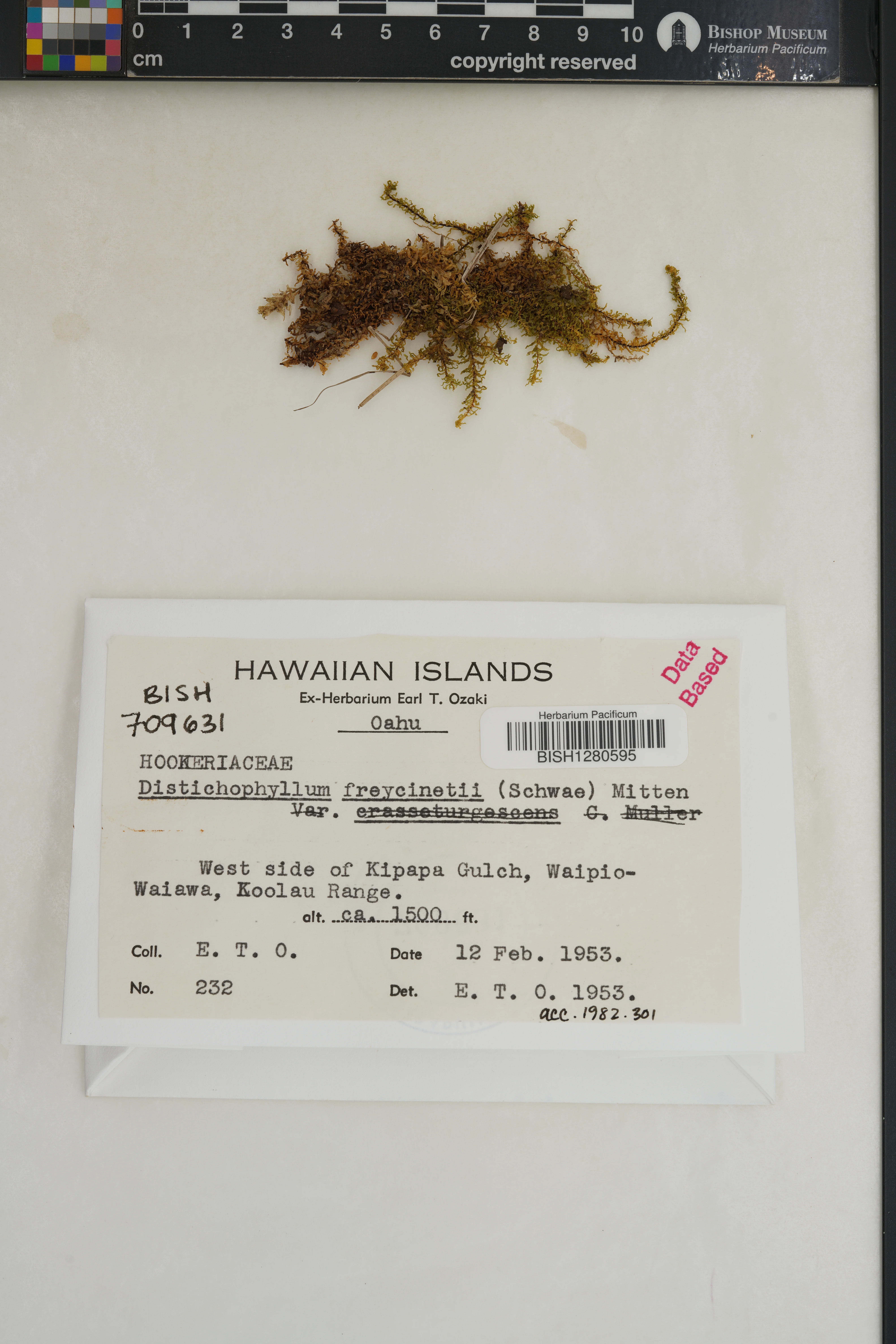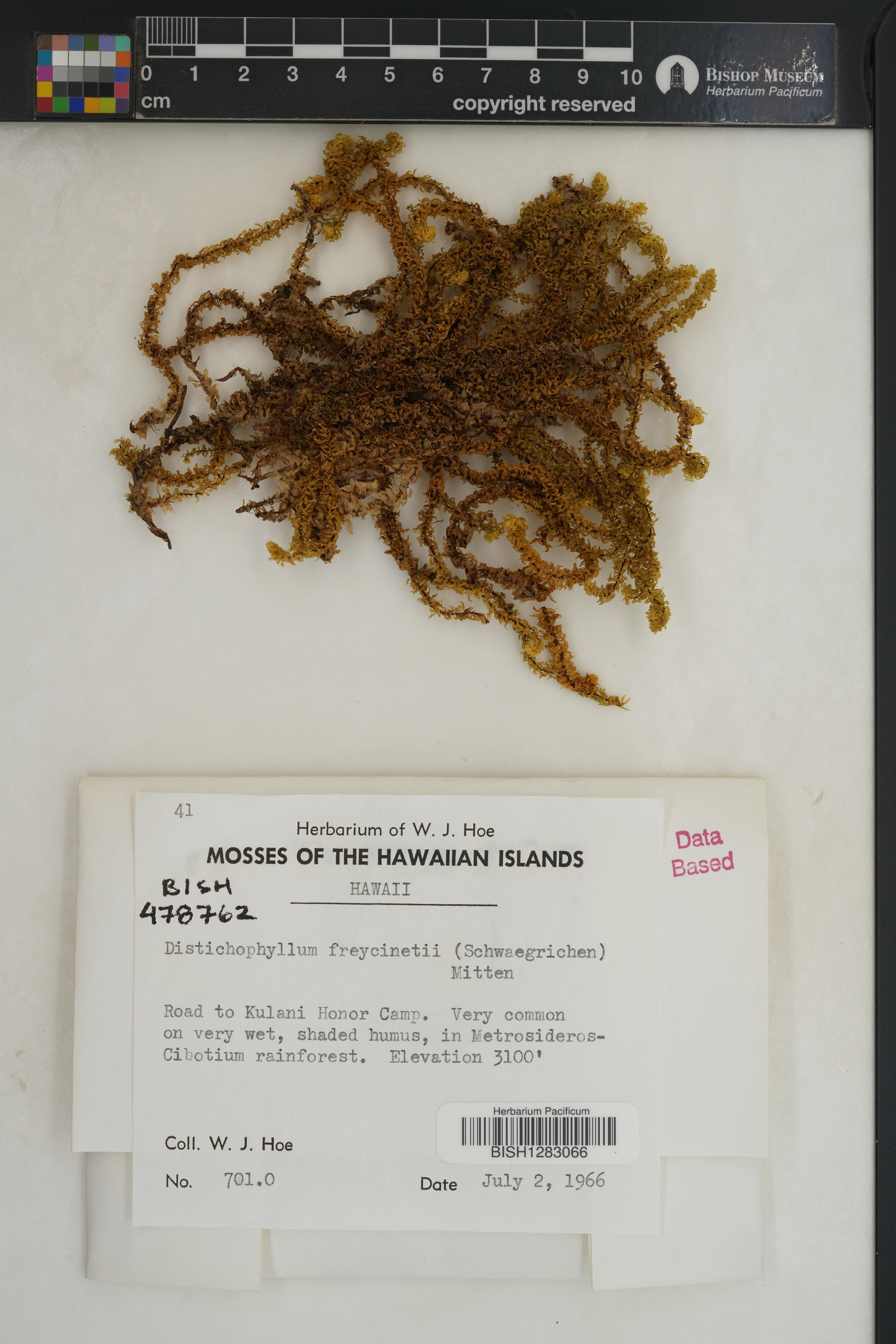 Kingdom: Viridiplantae Phylum: Bryophyta Class/Clade: Bryopsida Order: Hookeriales Family: Hookeriaceae Genus: Distichophyllum