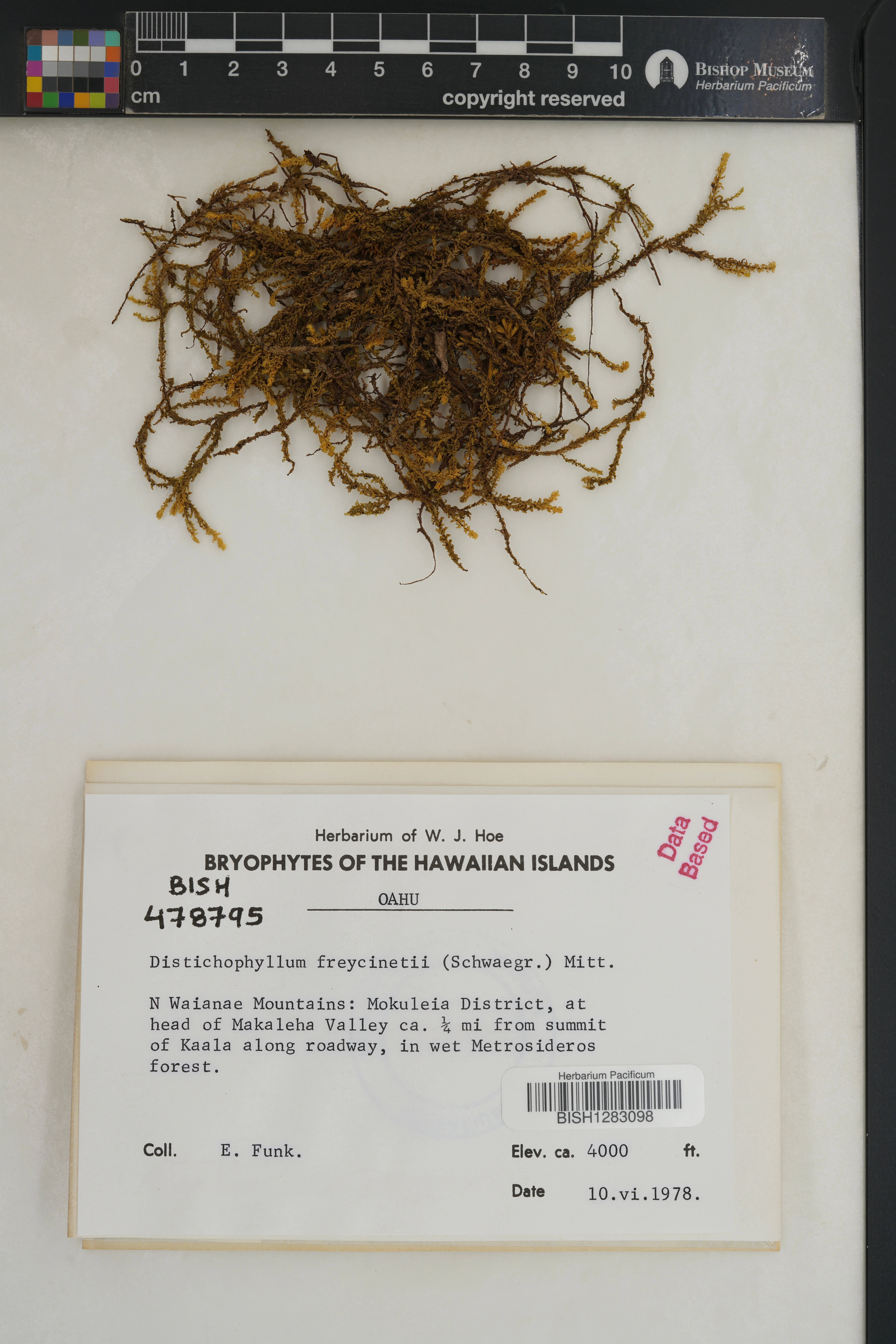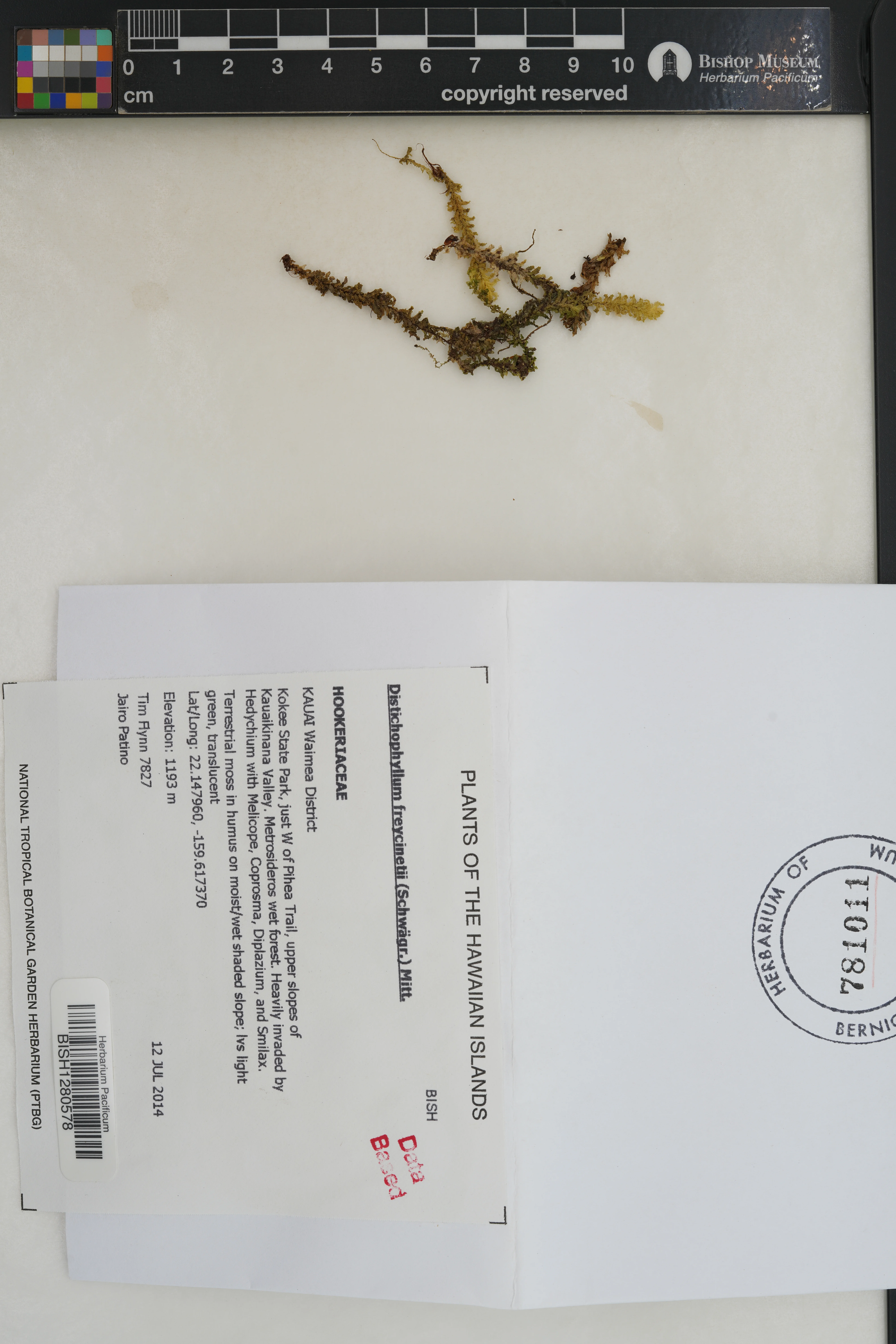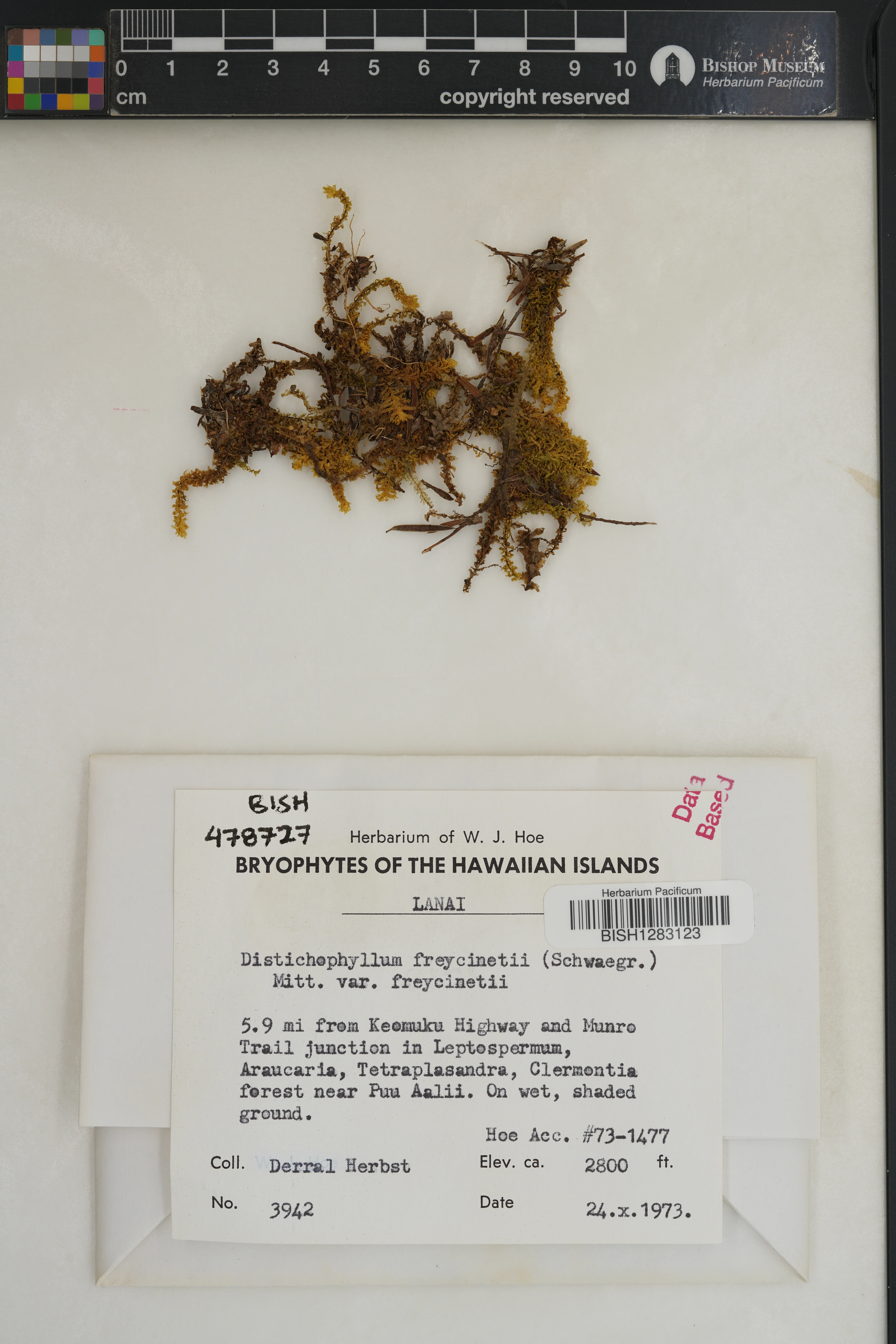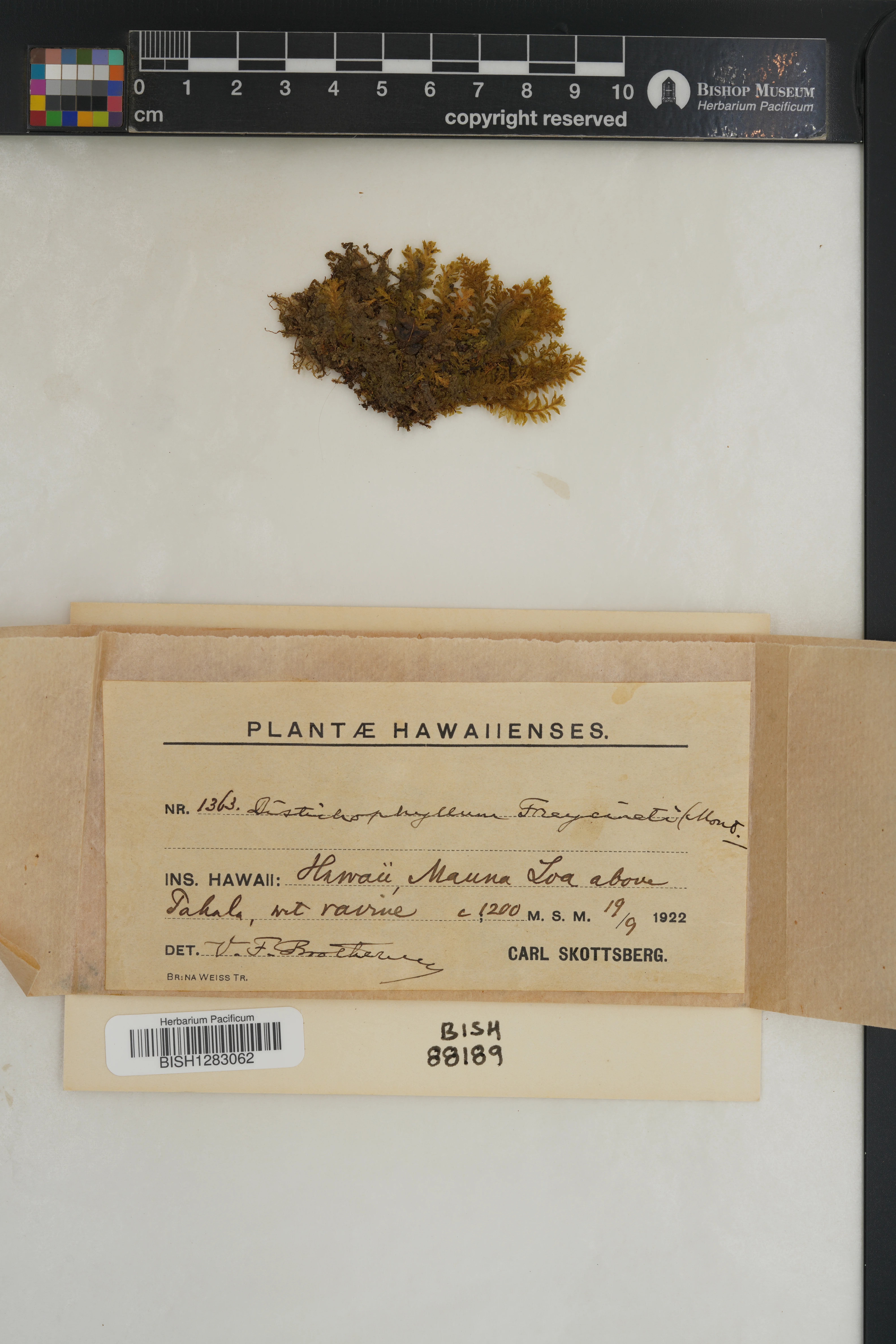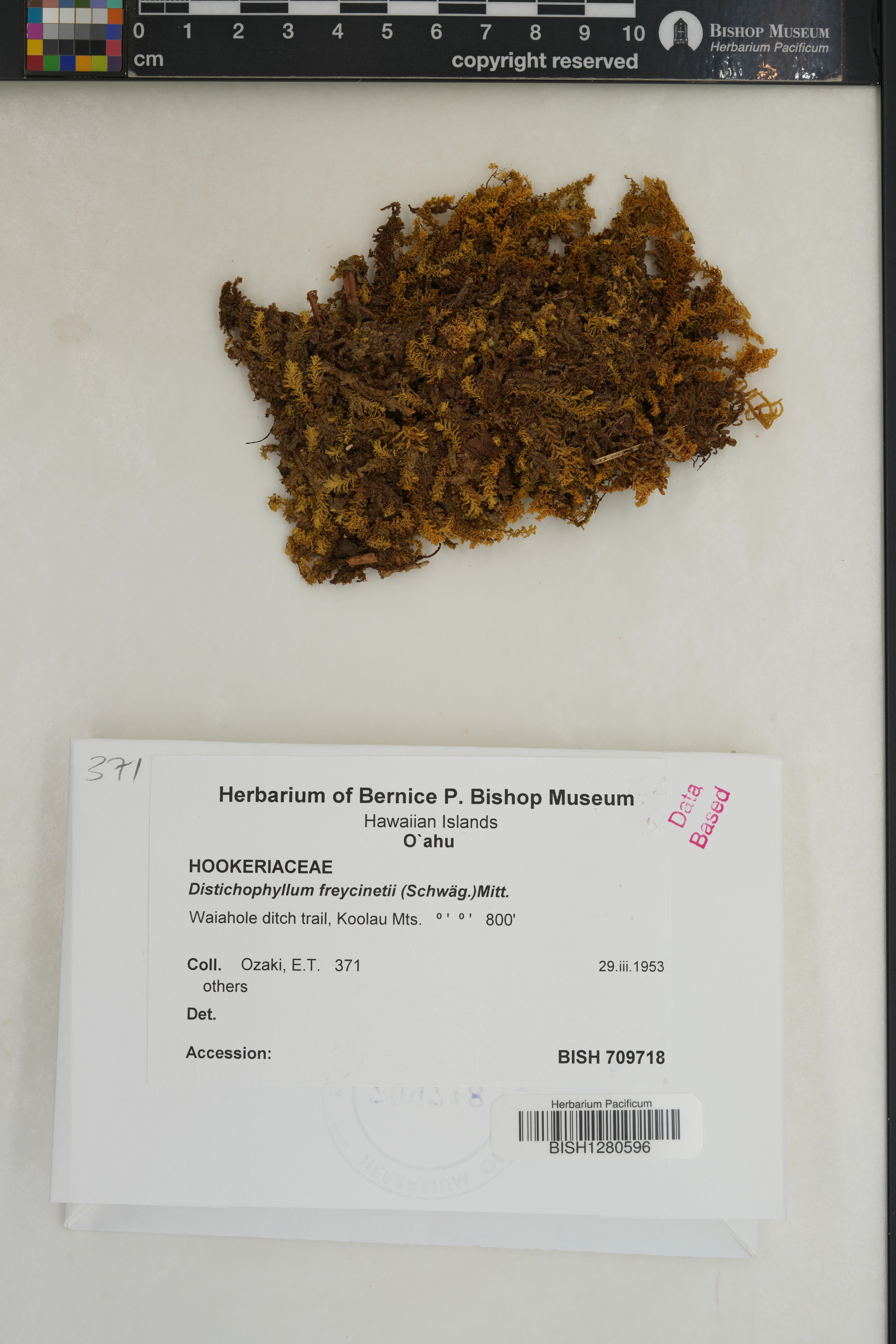 Kingdom: Viridiplantae Phylum: Bryophyta Class/Clade: Bryopsida Order: Hookeriales Family: Hookeriaceae Genus: Distichophyllum