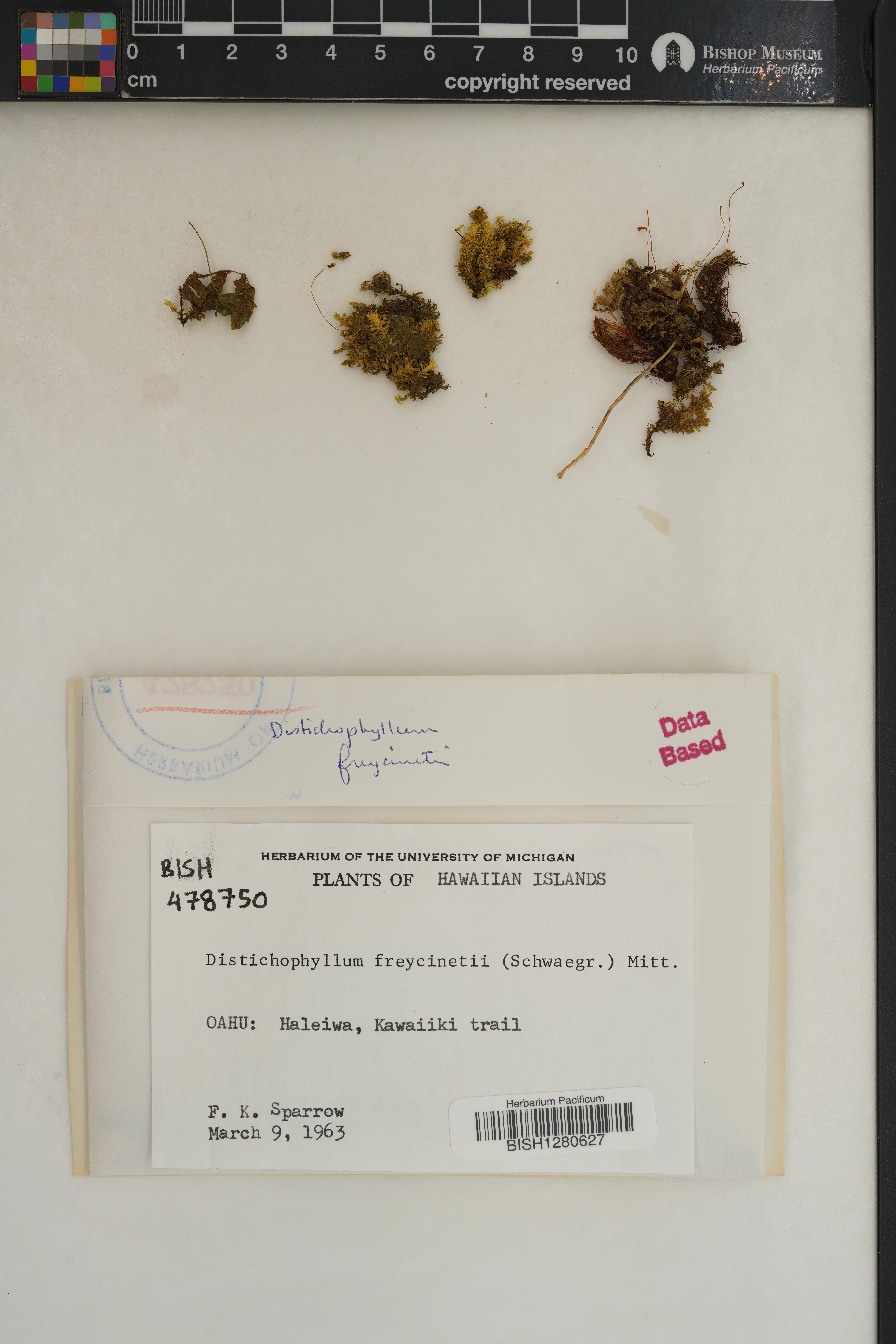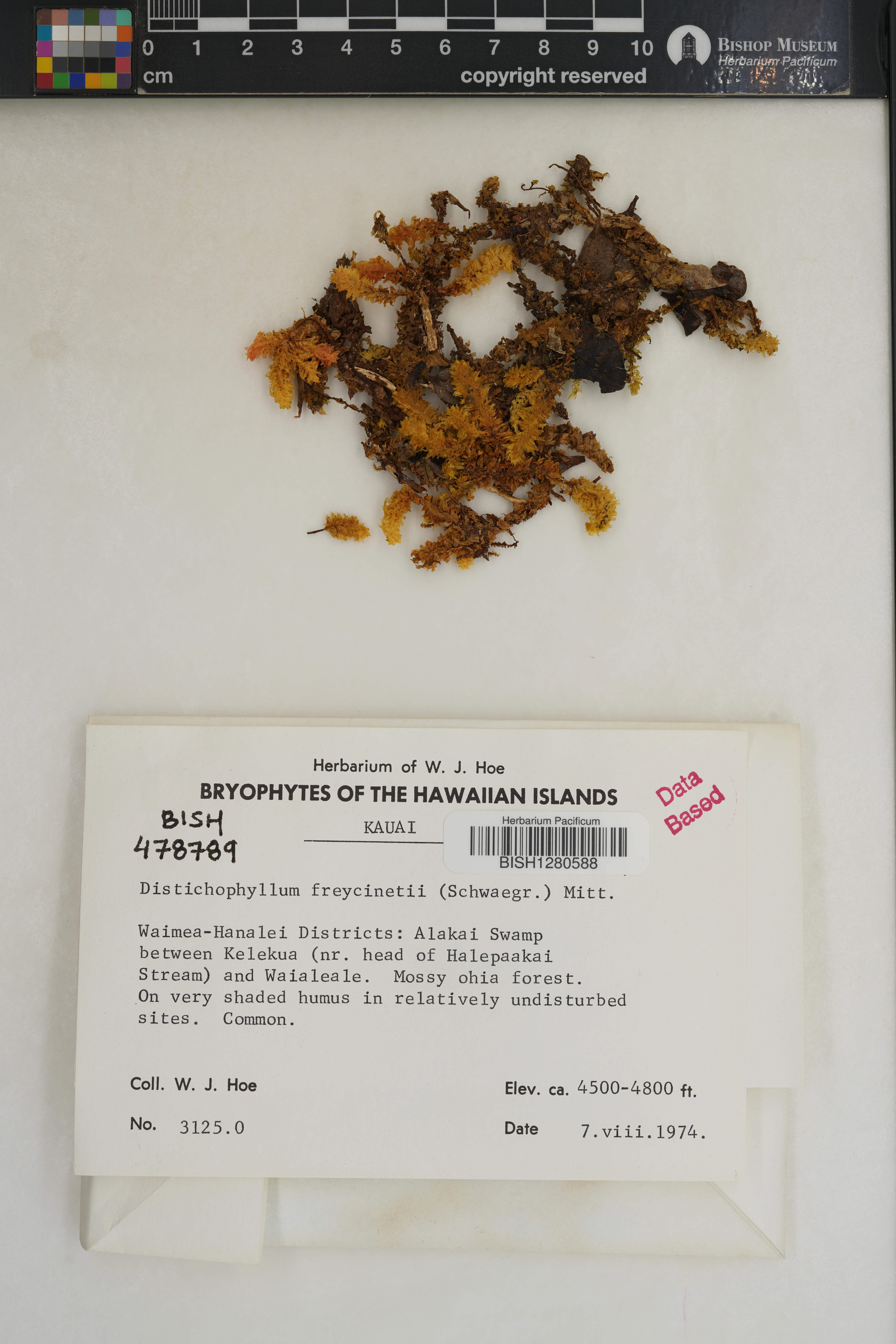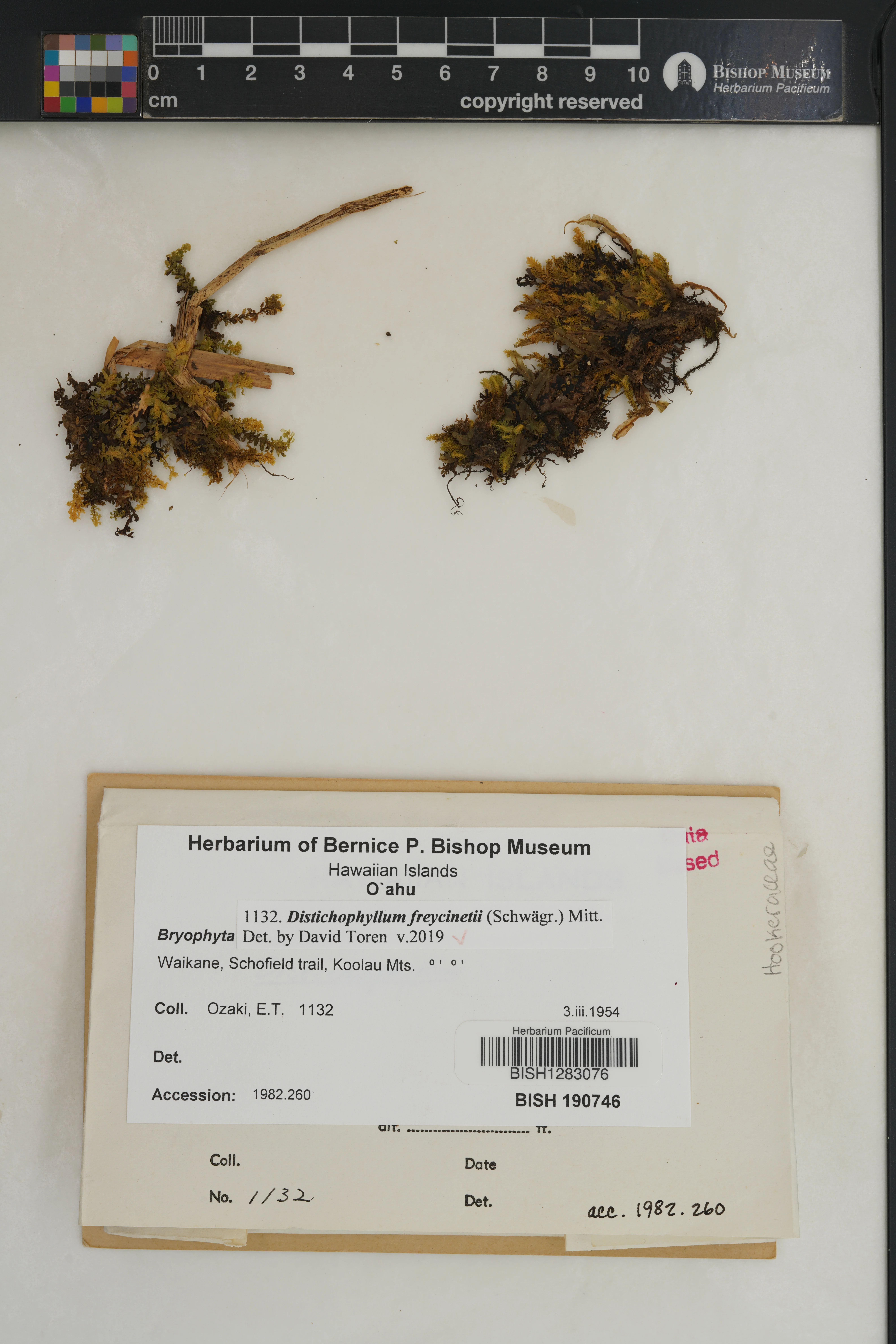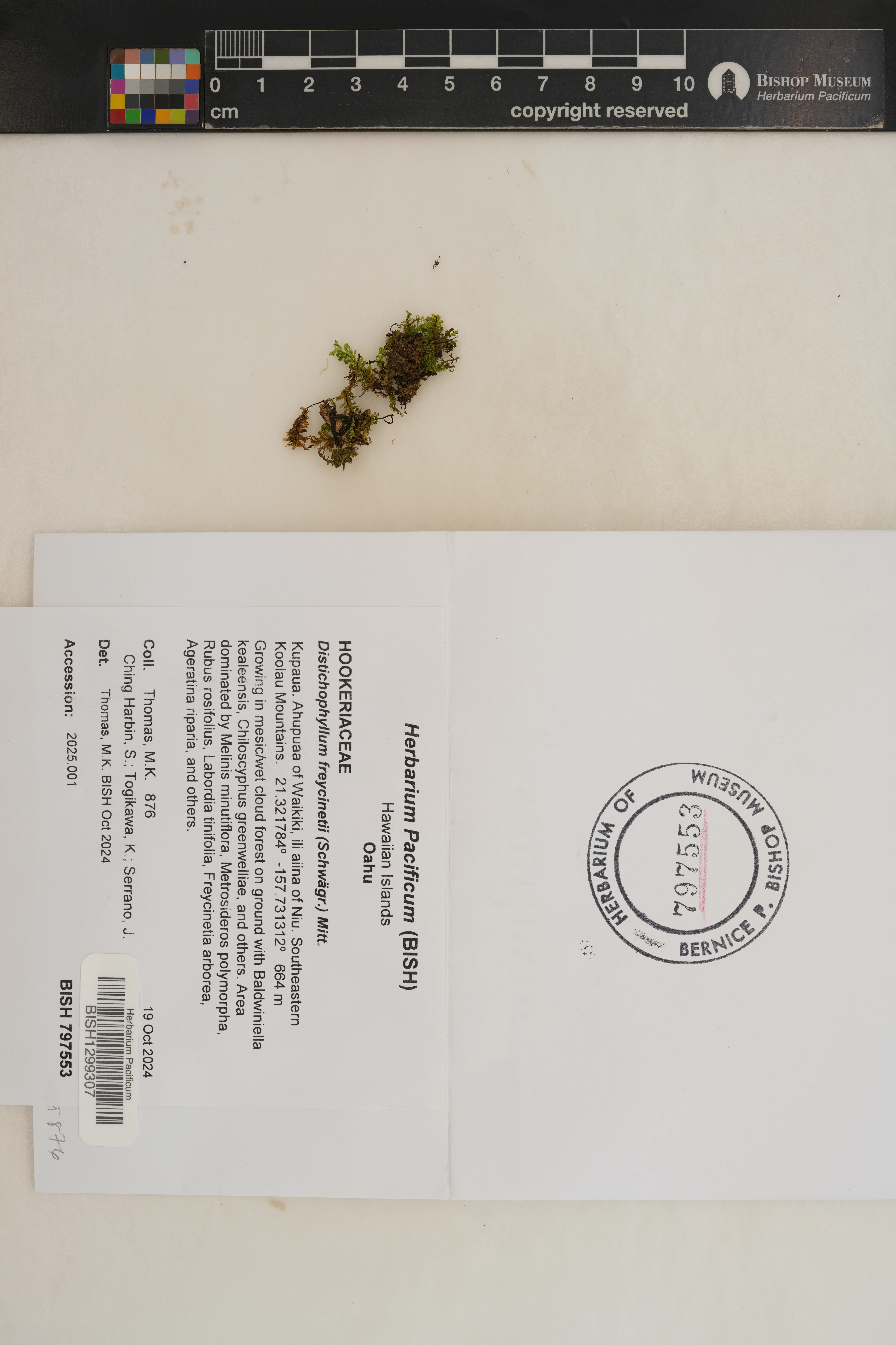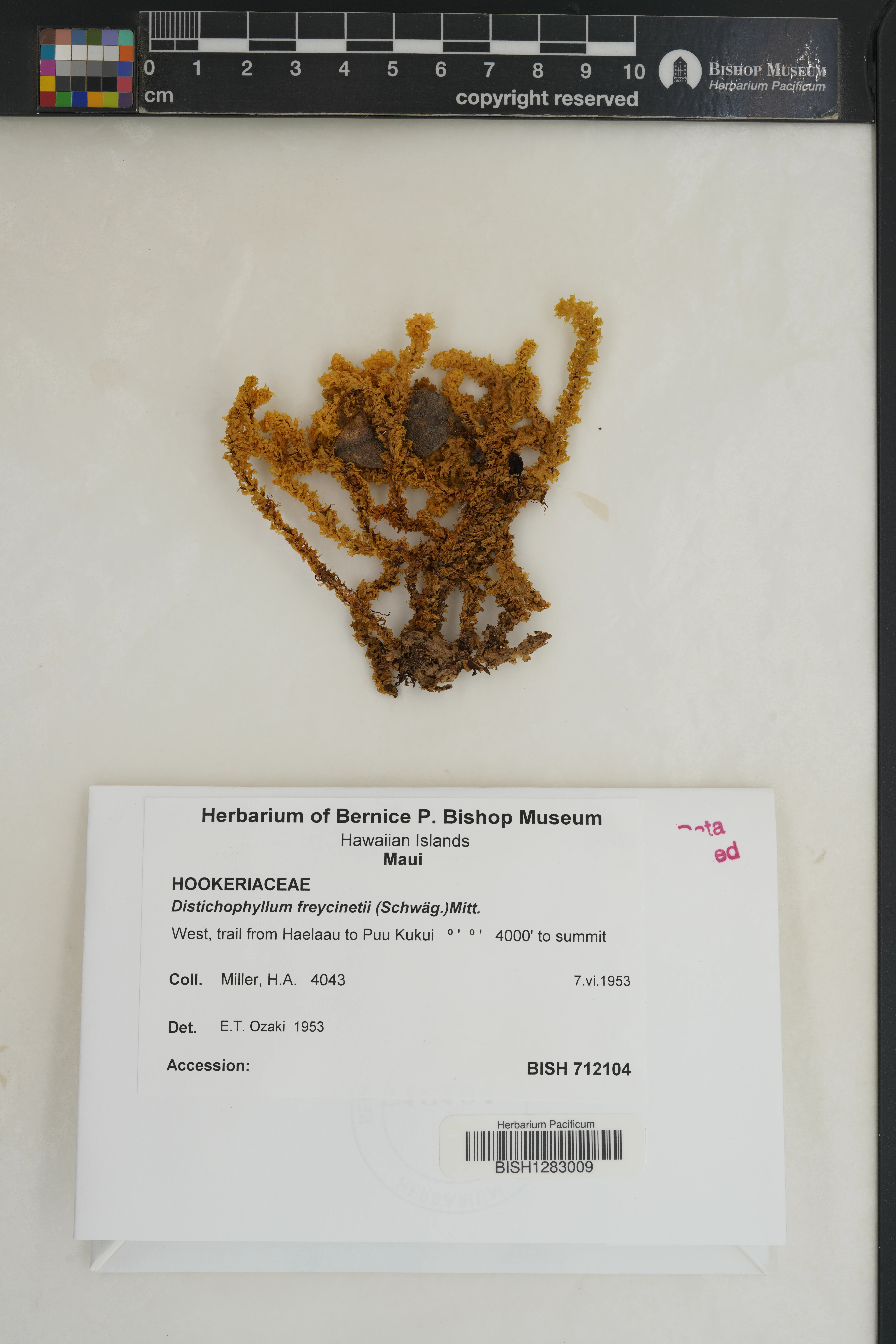 Kingdom: Viridiplantae Phylum: Bryophyta Class/Clade: Bryopsida Order: Hookeriales Family: Hookeriaceae Genus: Distichophyllum
