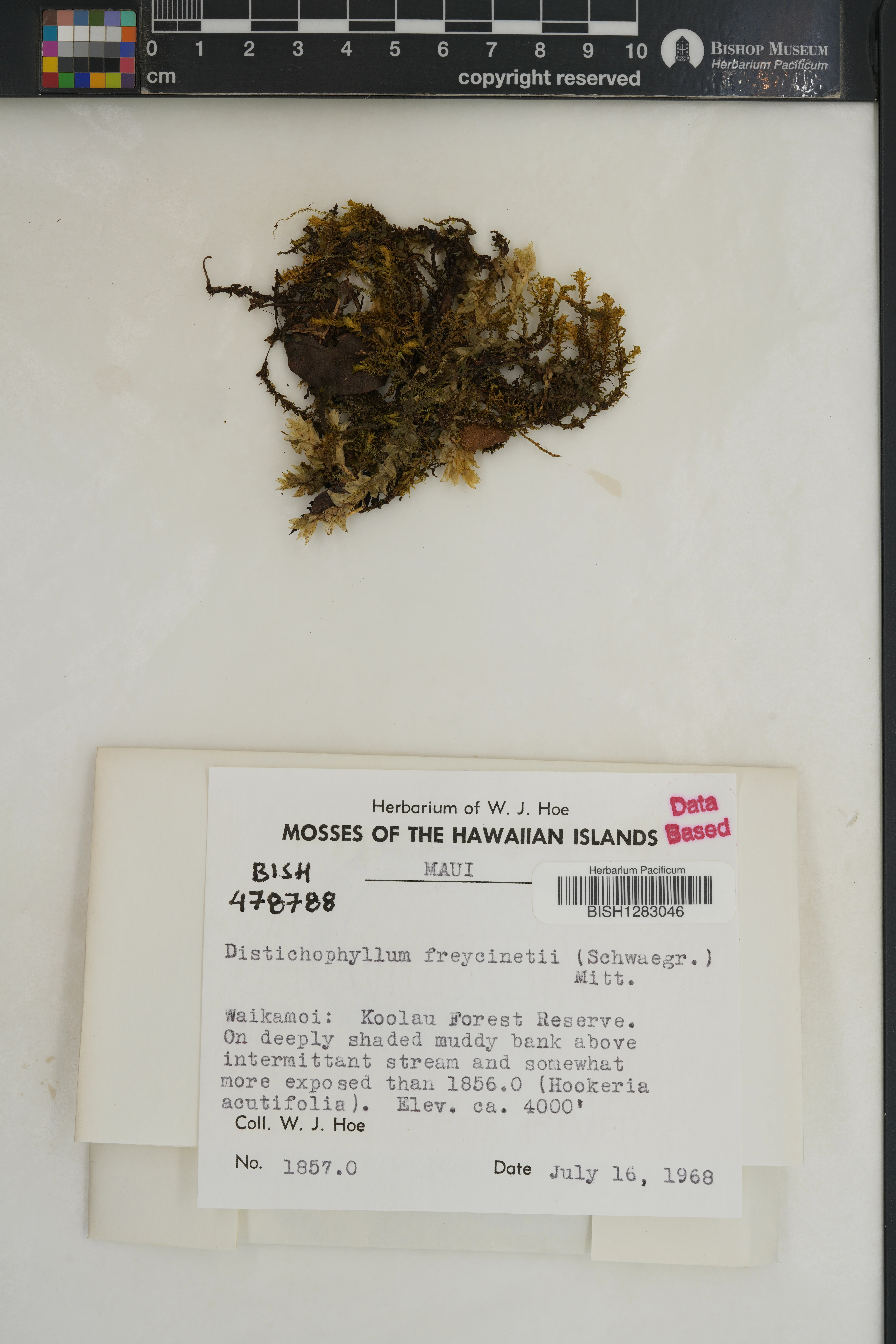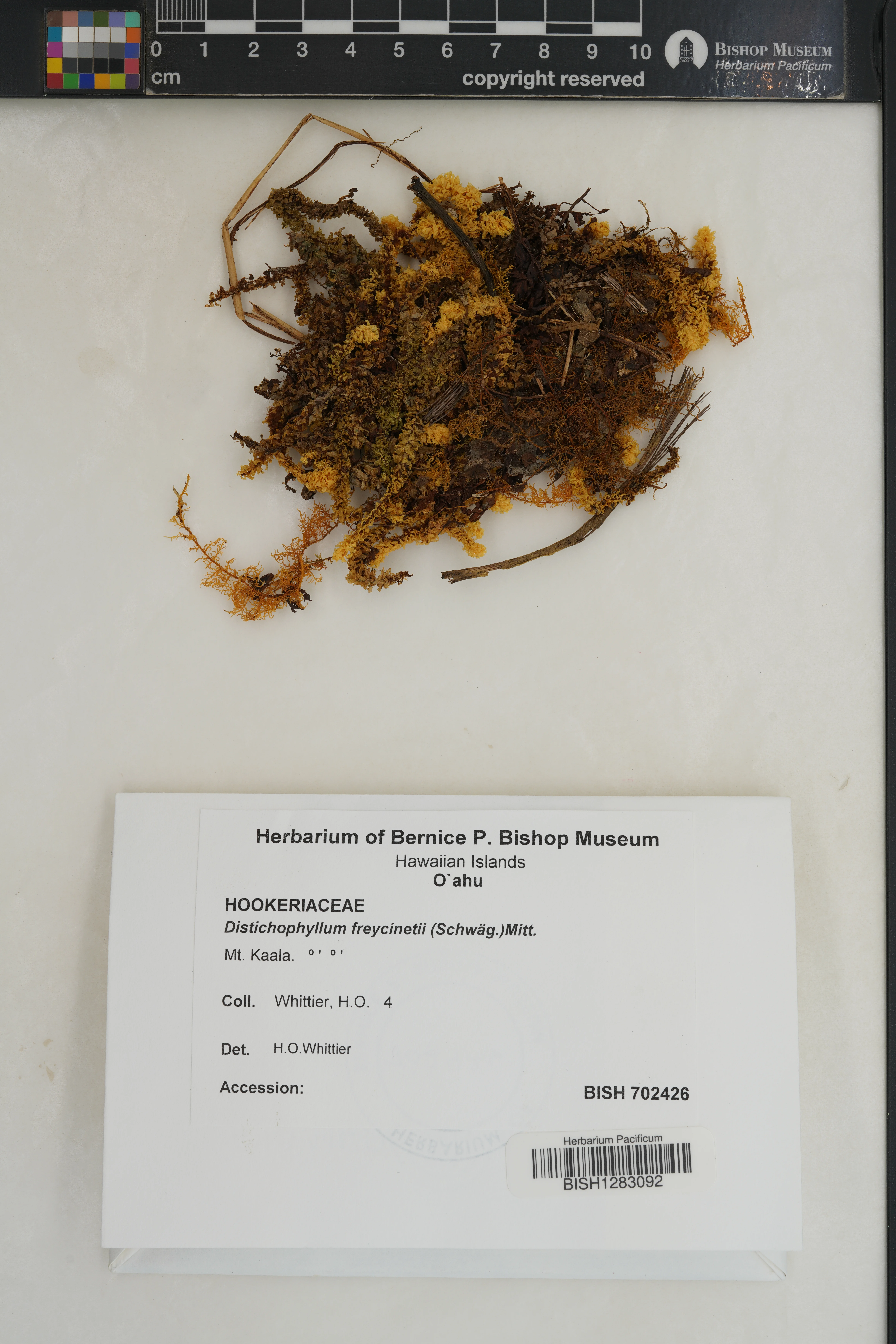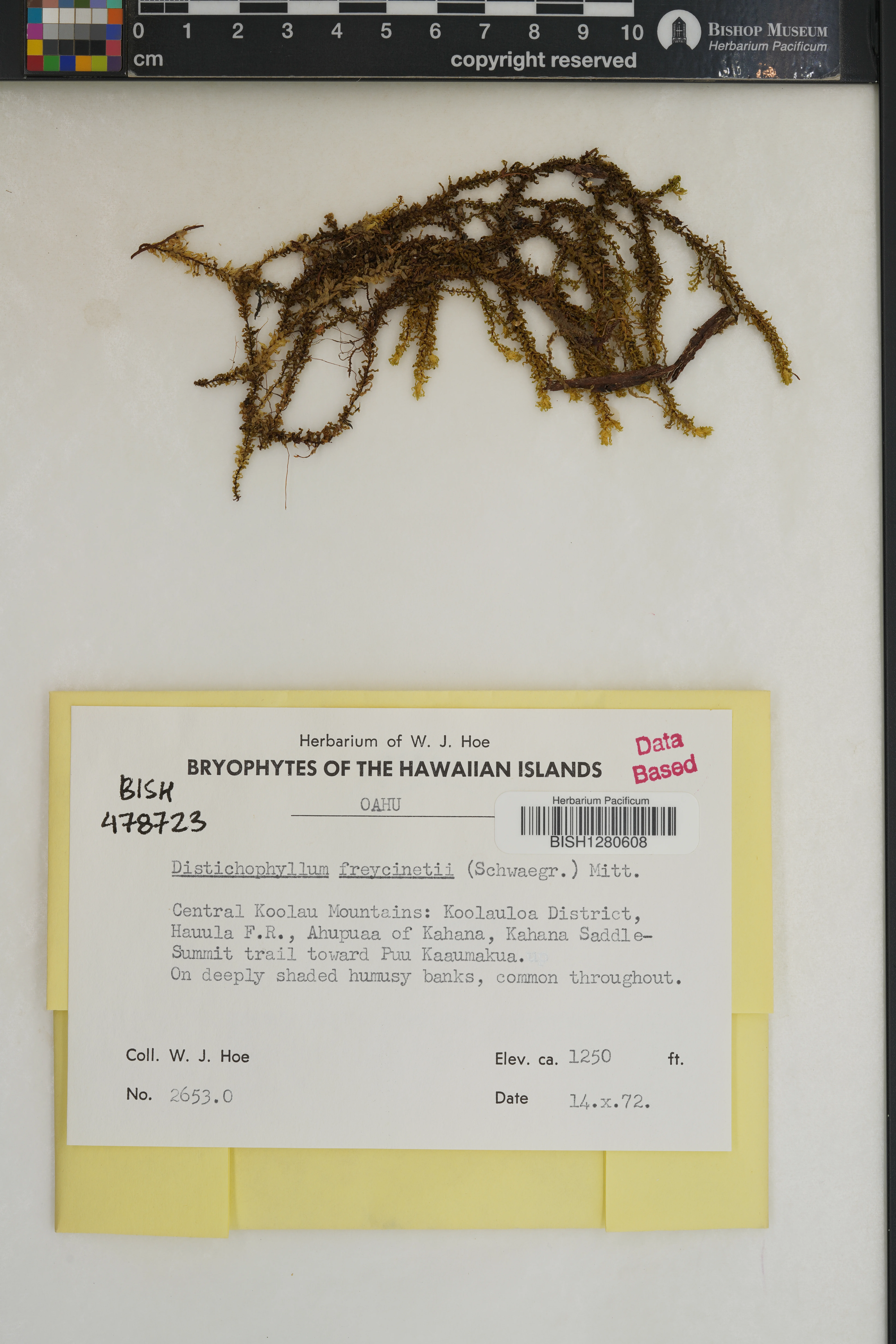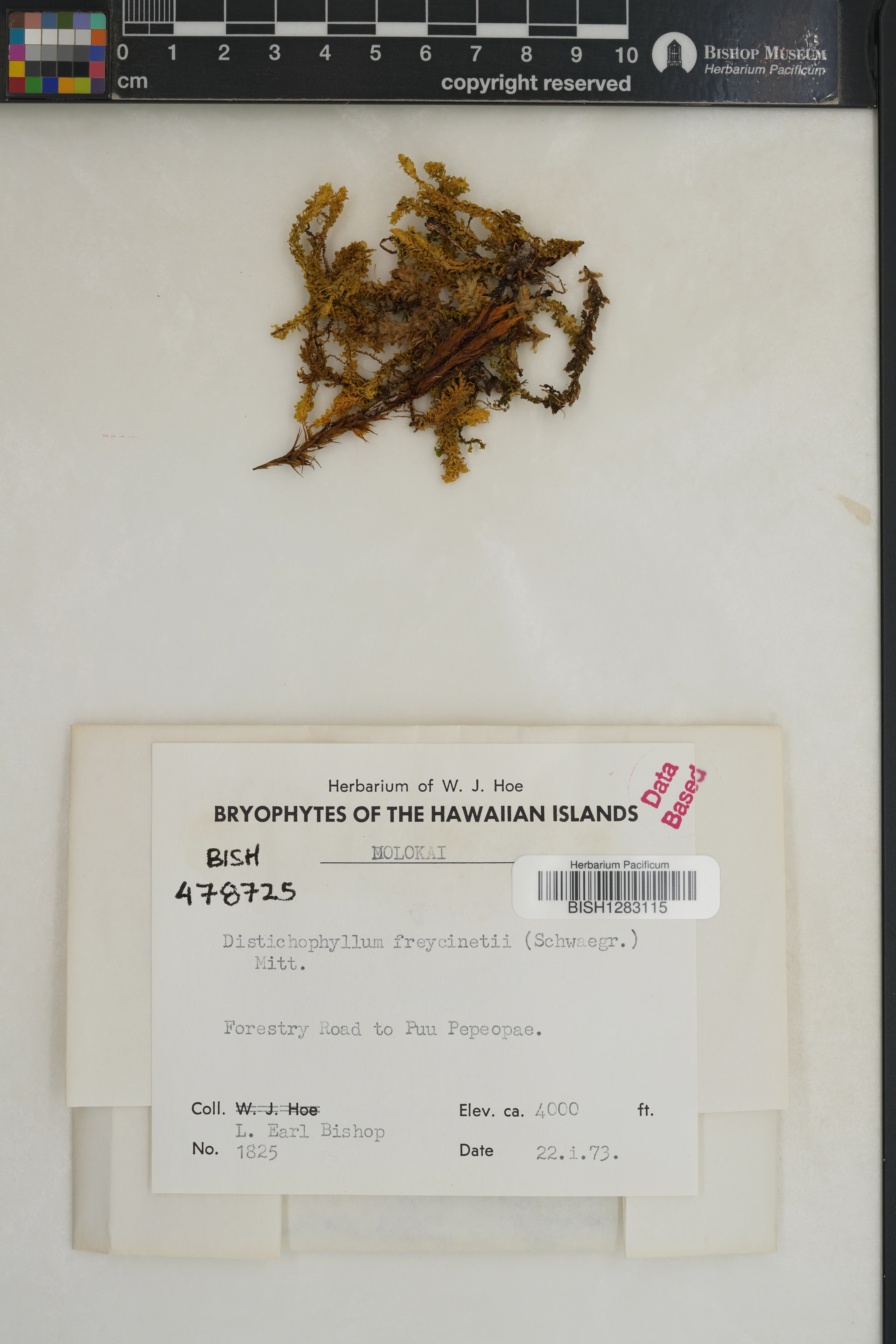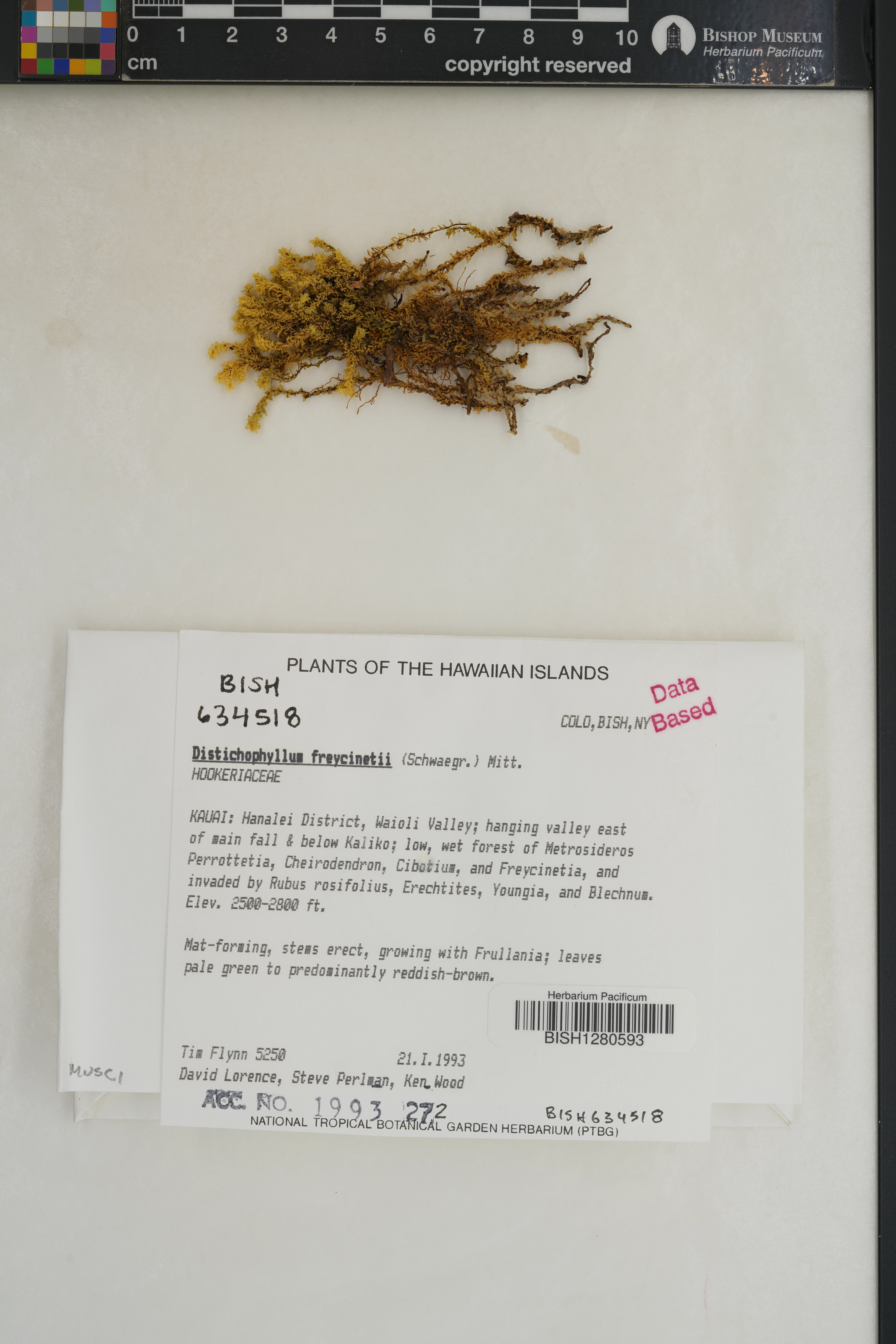Kingdom: Viridiplantae Phylum: Bryophyta Class/Clade: Bryopsida Order: Hookeriales Family: Hookeriaceae Genus: Distichophyllum