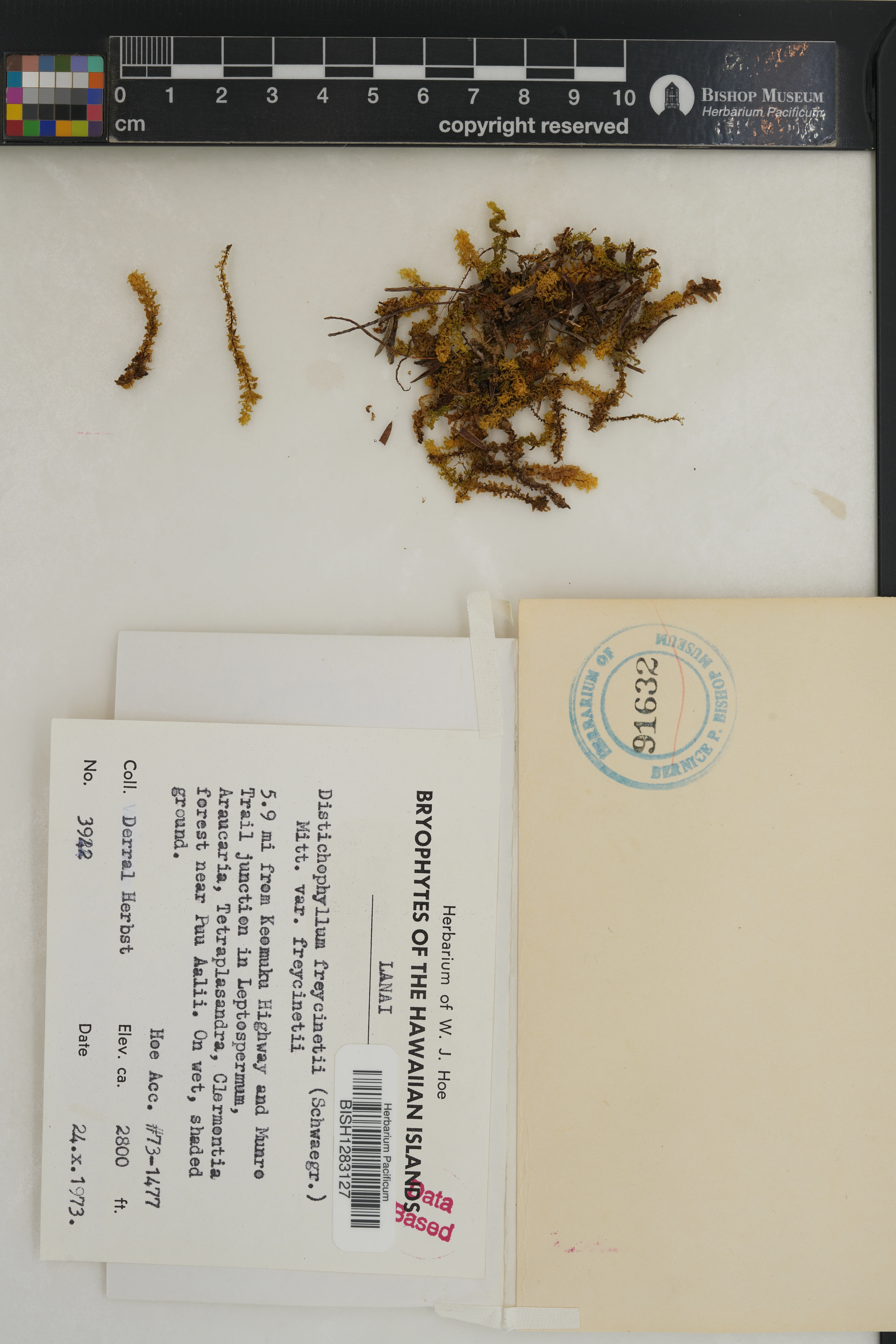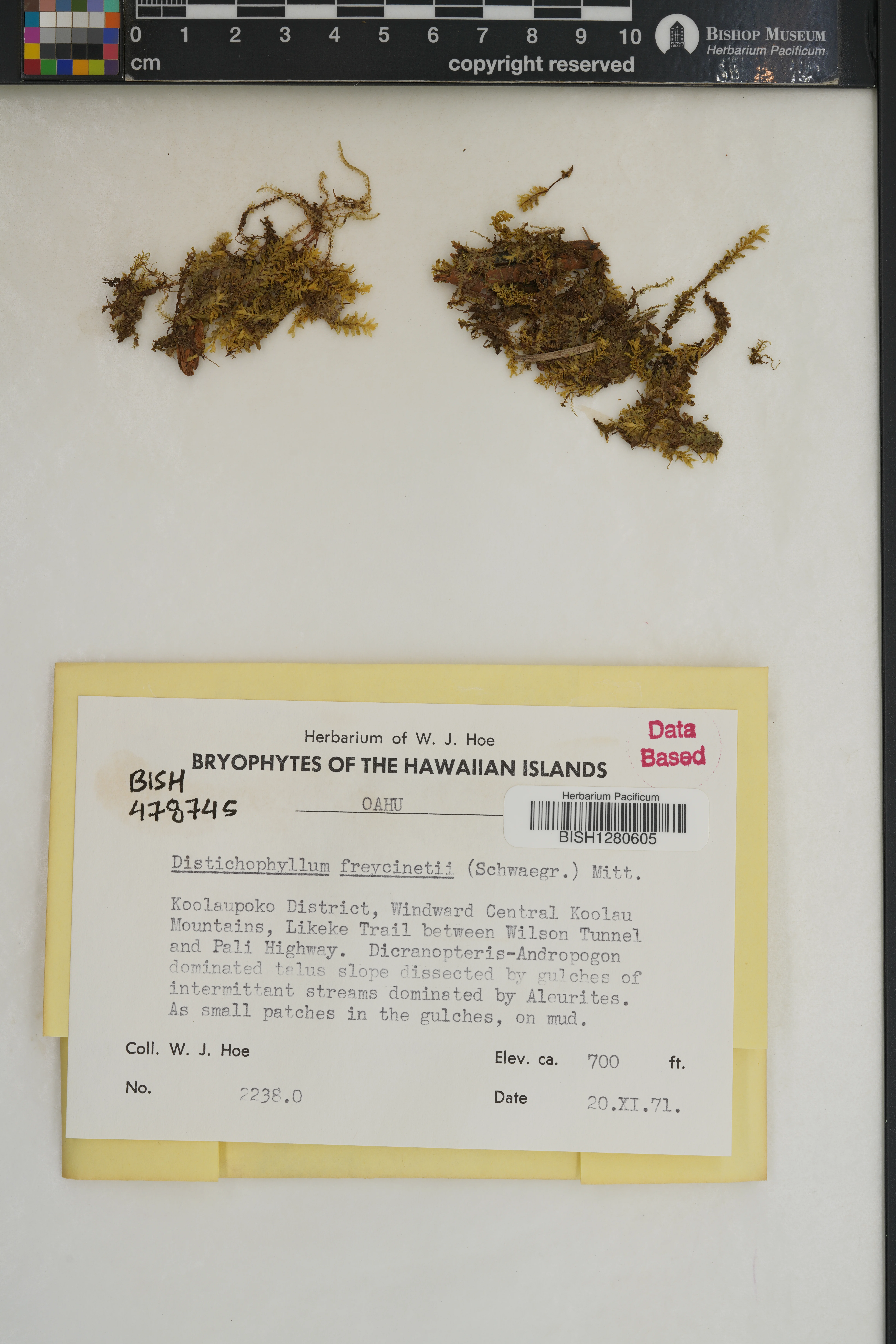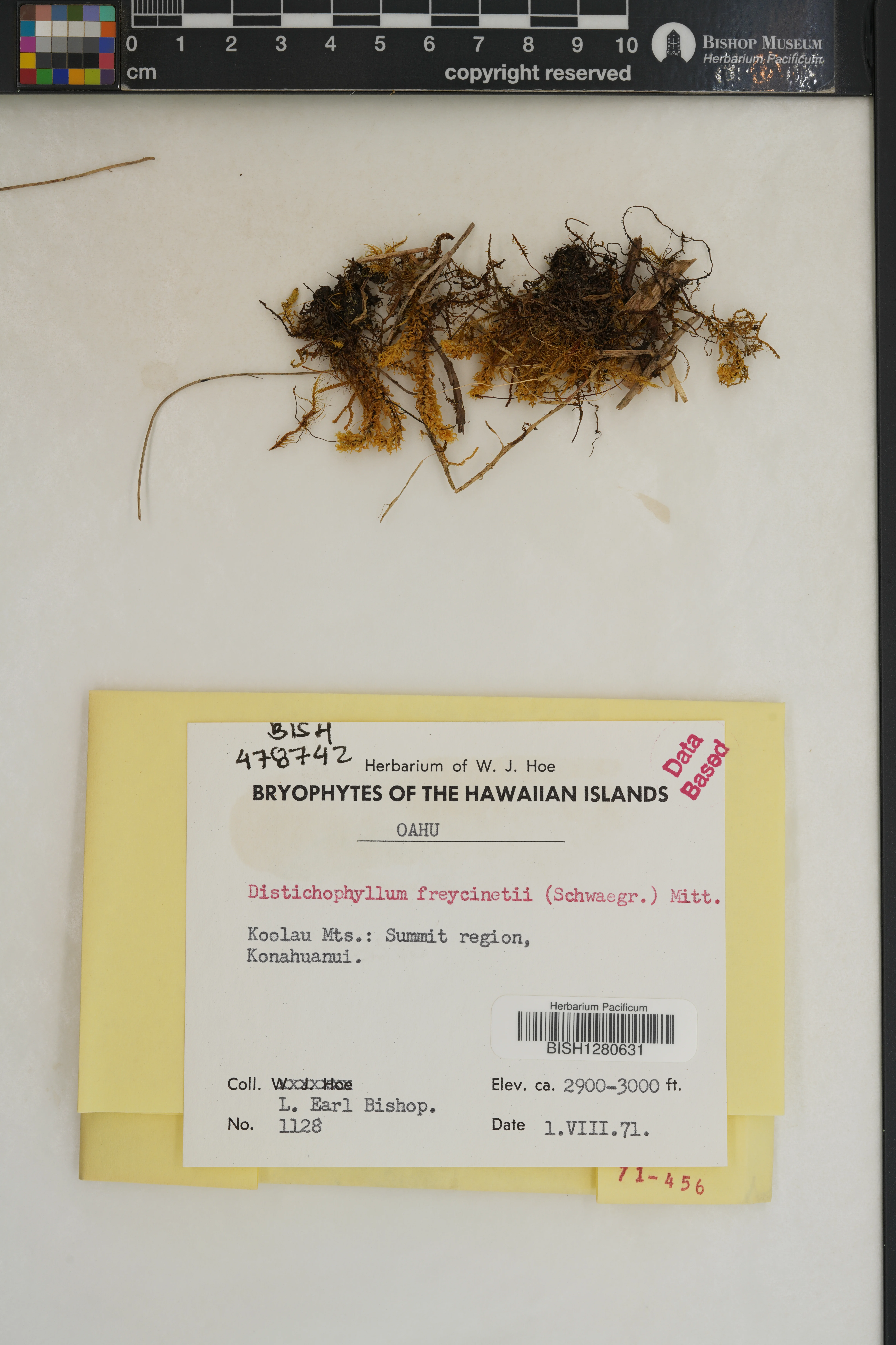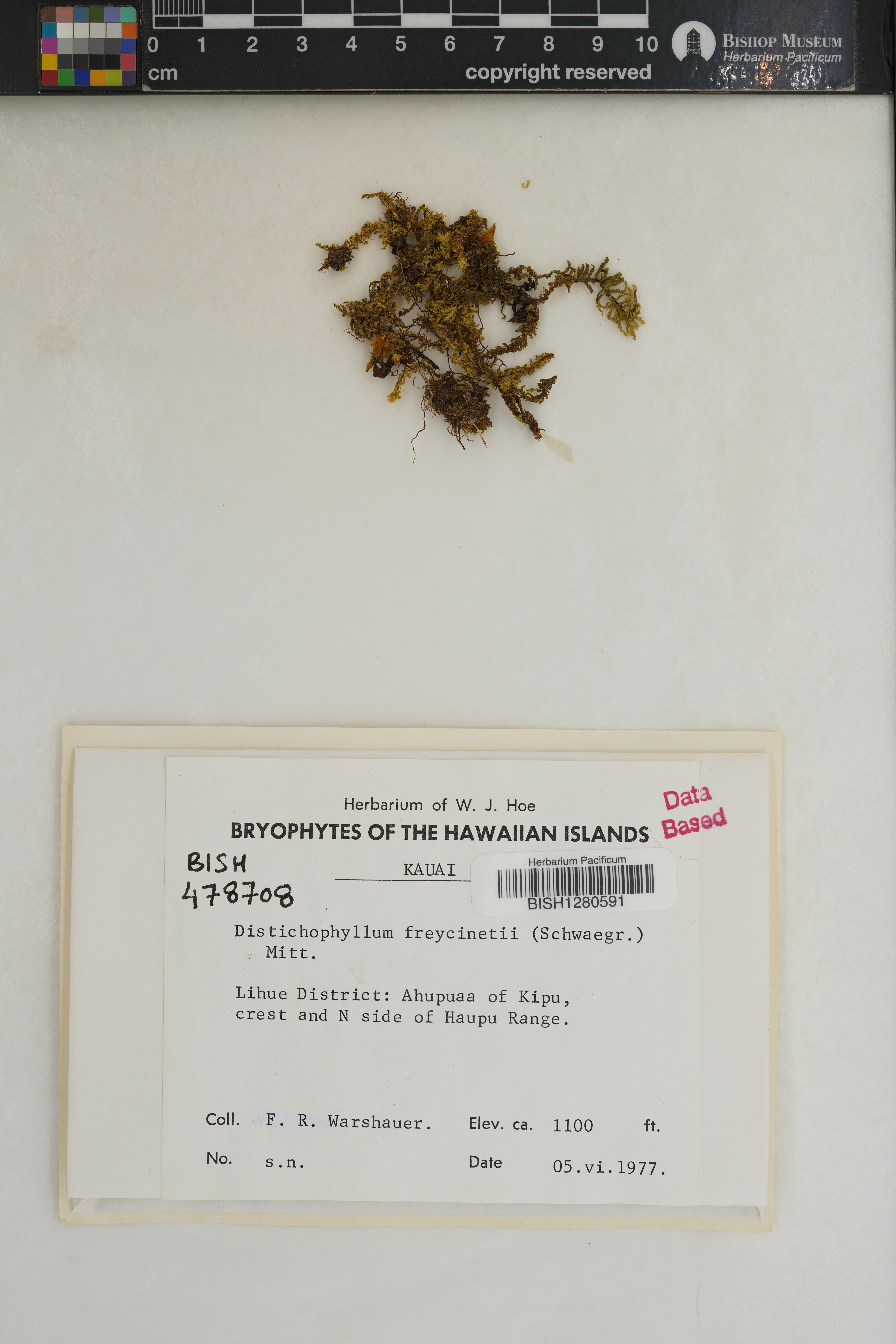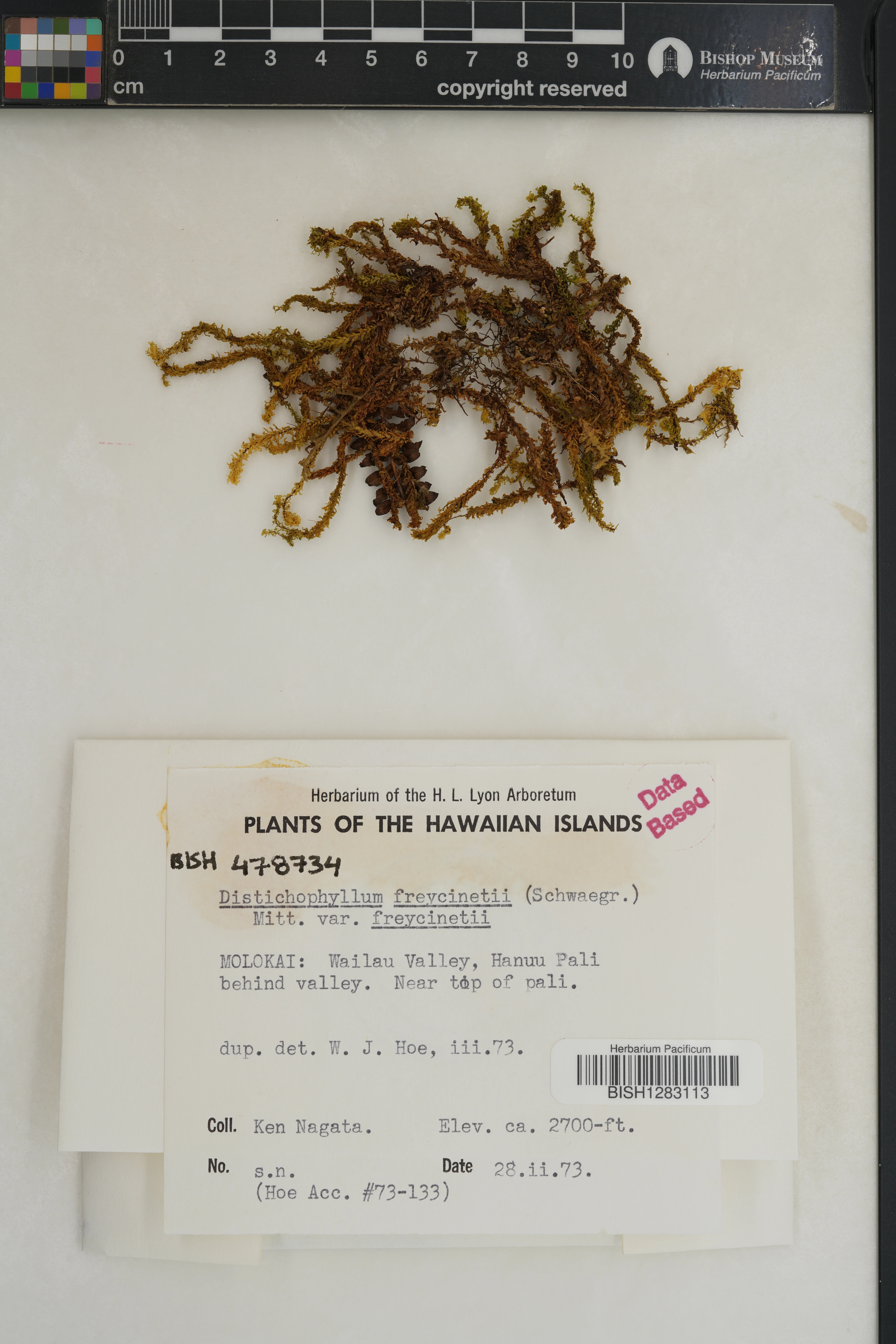 Kingdom: Viridiplantae Phylum: Bryophyta Class/Clade: Bryopsida Order: Hookeriales Family: Hookeriaceae Genus: Distichophyllum