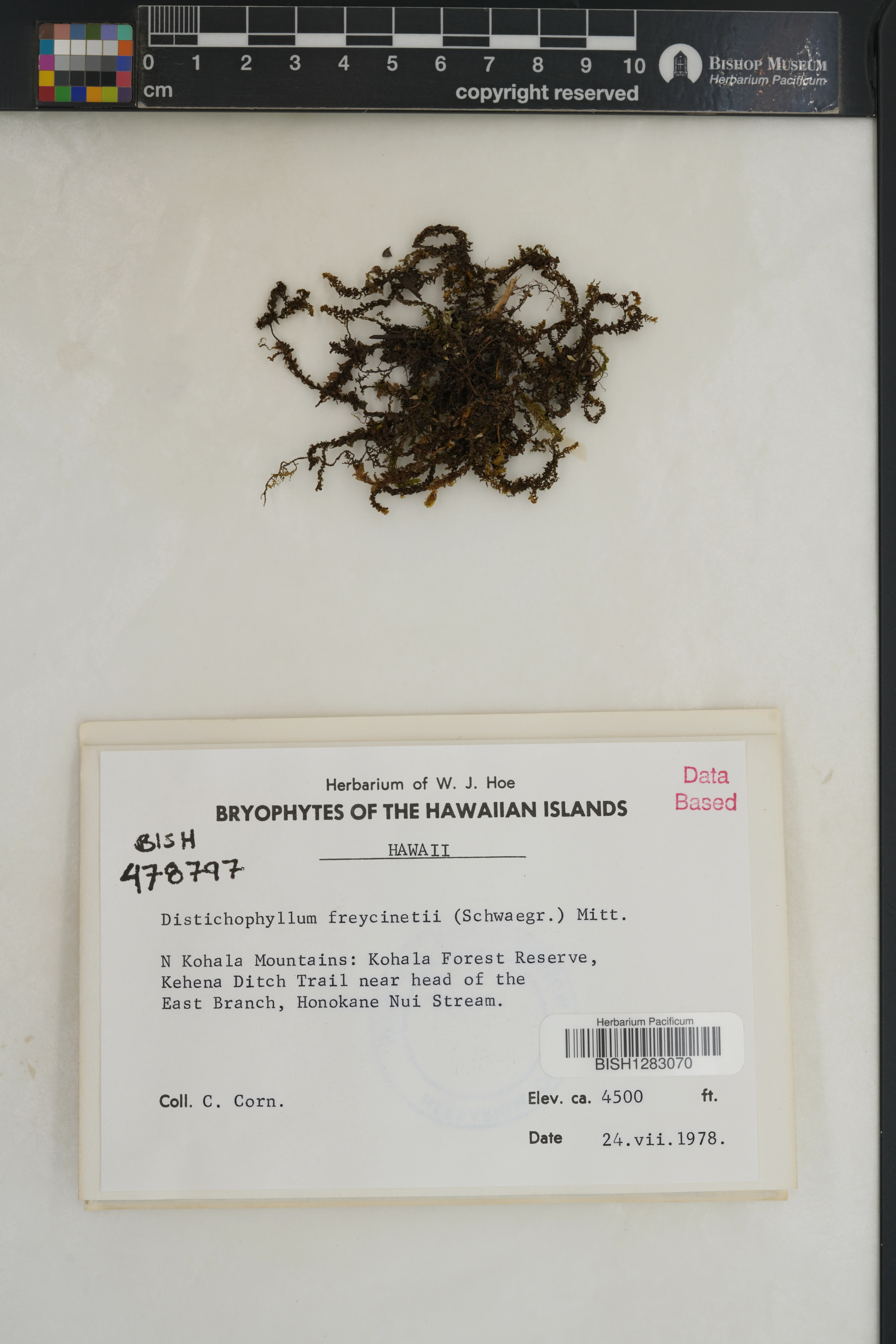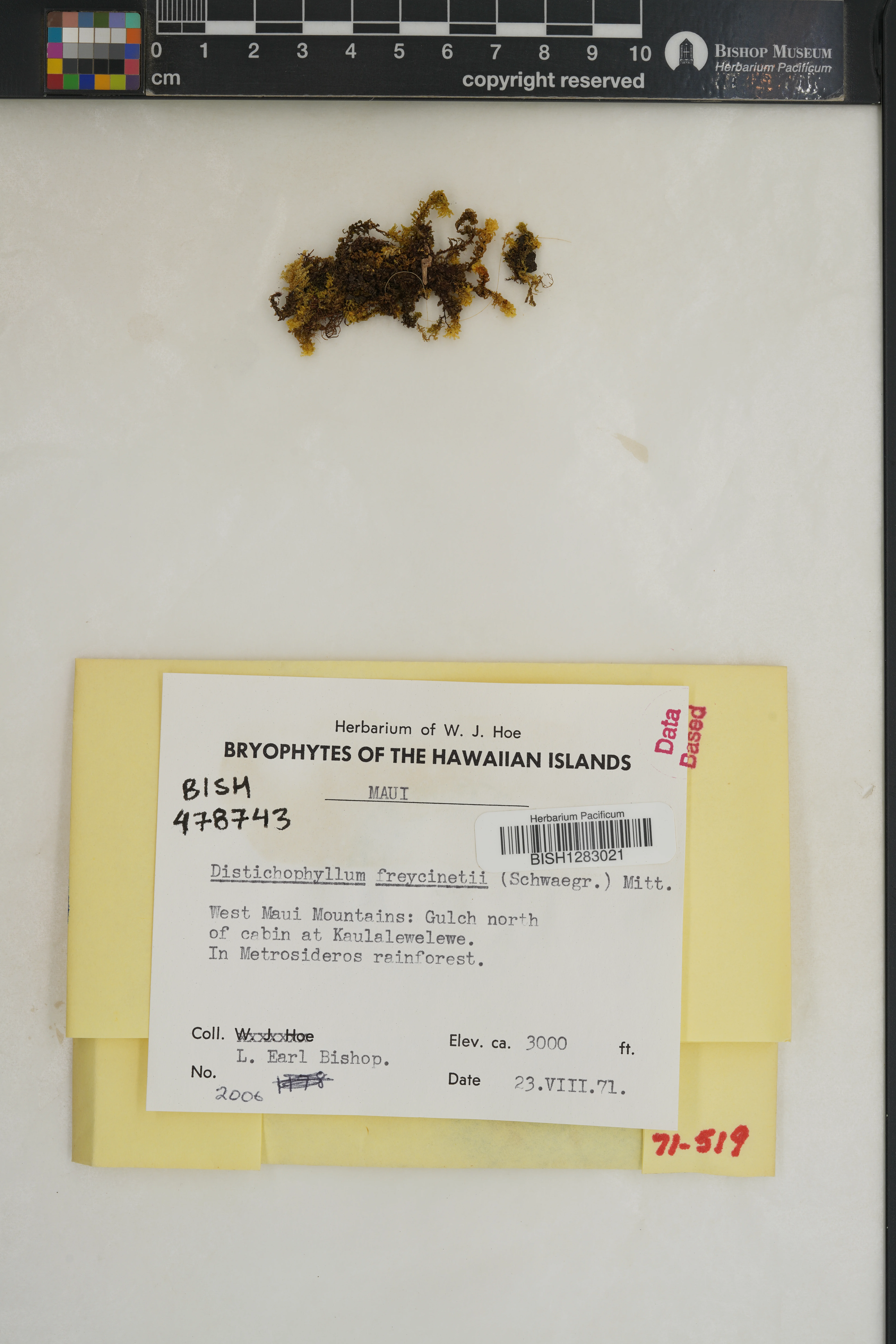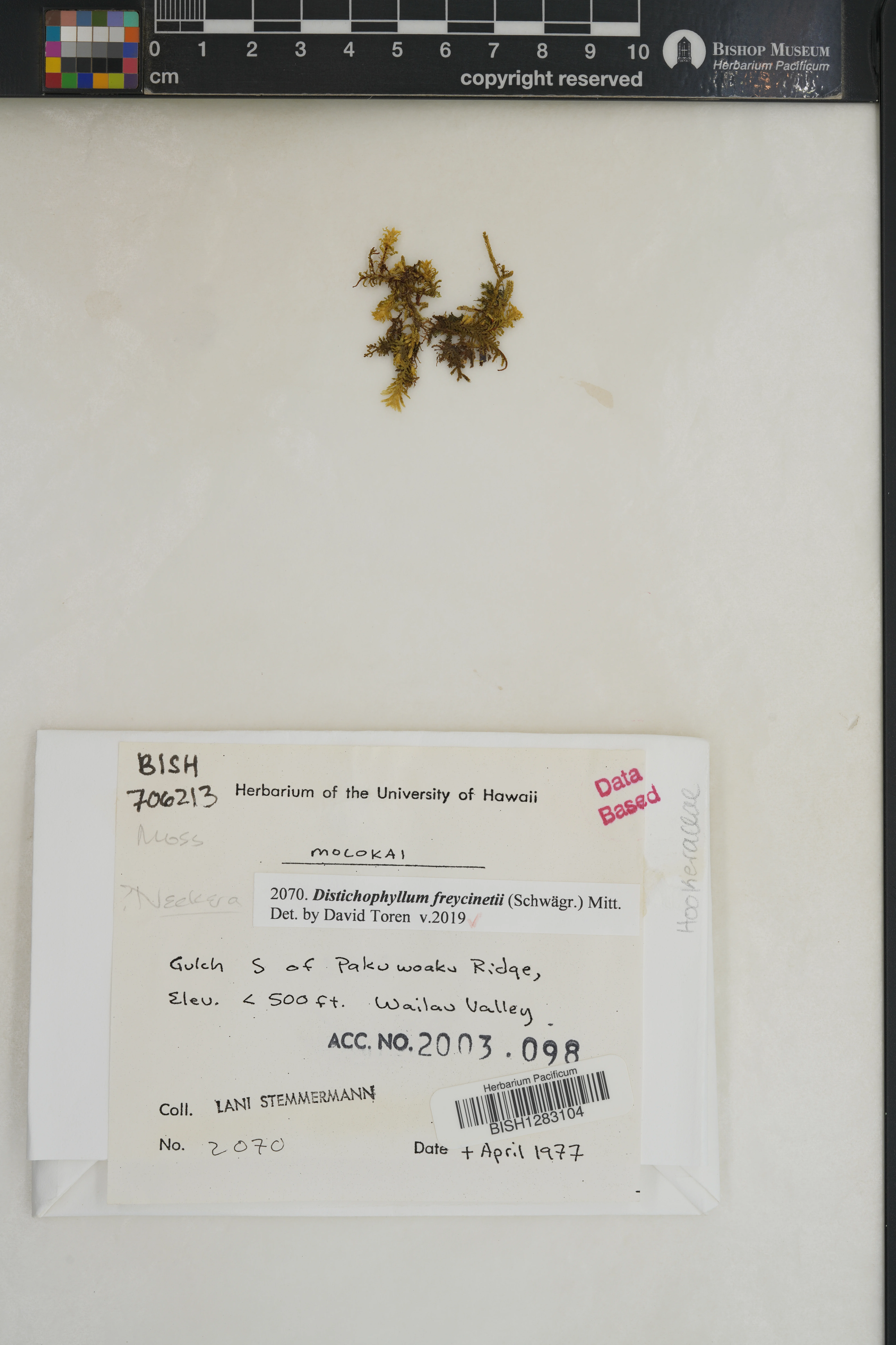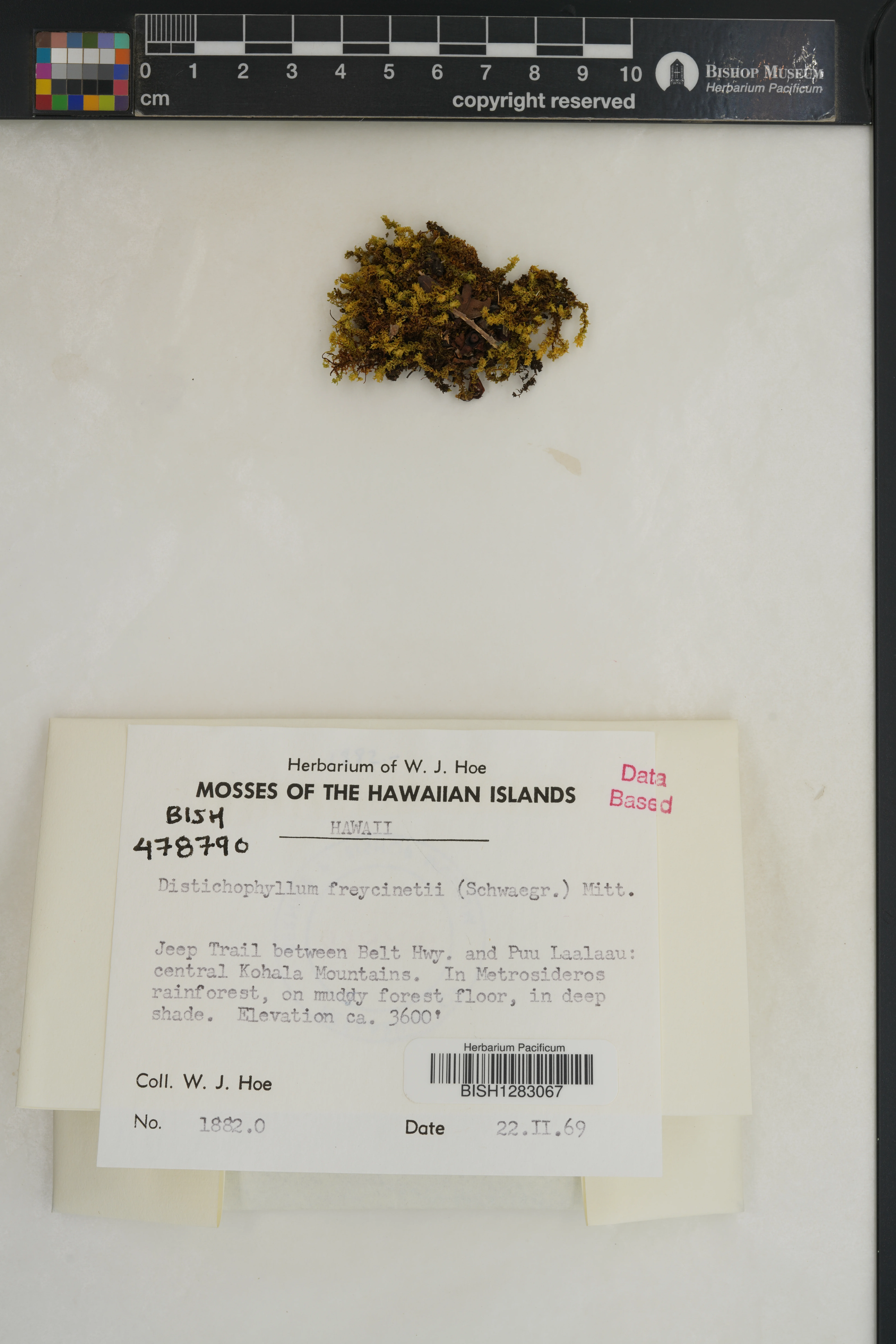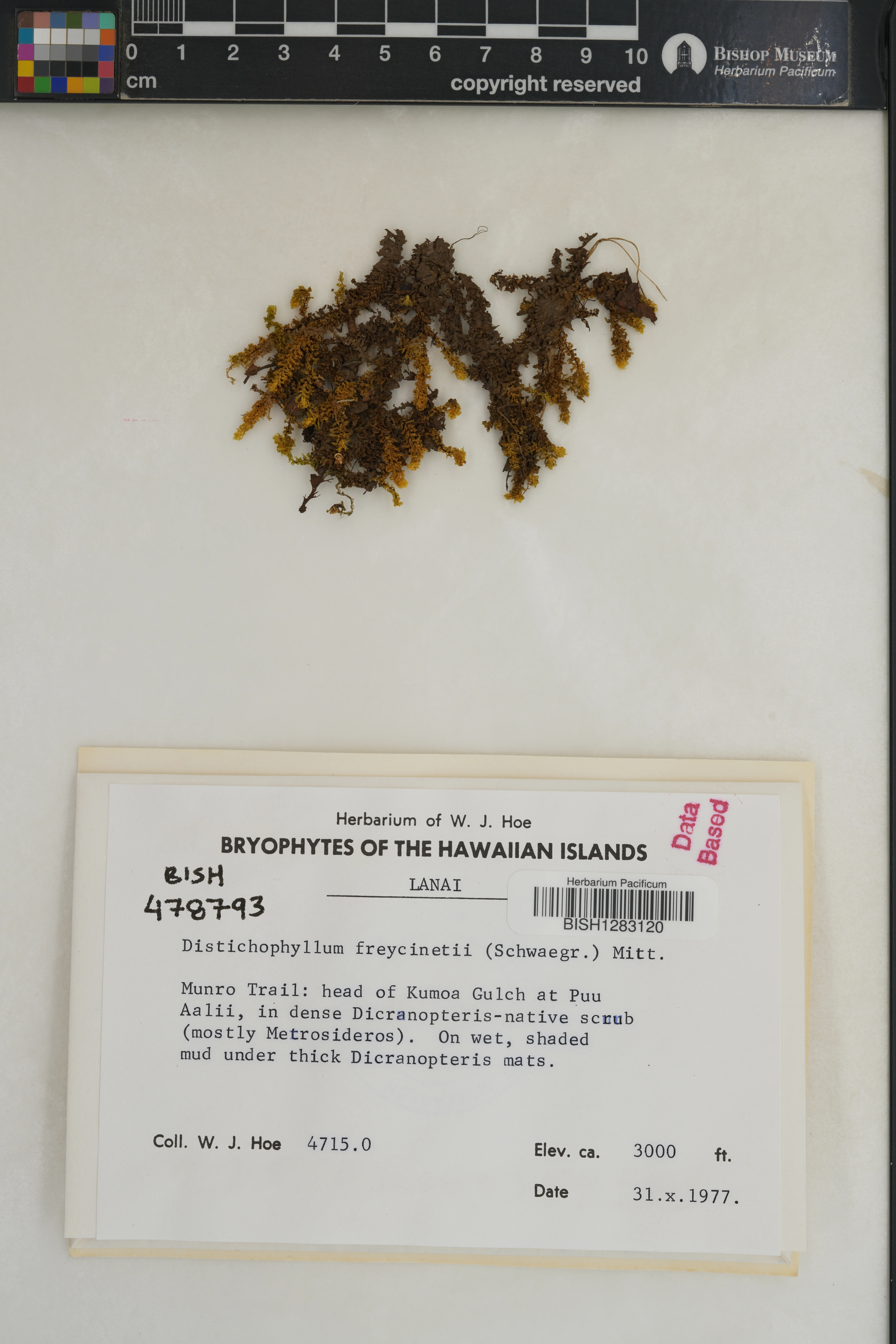 Kingdom: Viridiplantae Phylum: Bryophyta Class/Clade: Bryopsida Order: Hookeriales Family: Hookeriaceae Genus: Distichophyllum