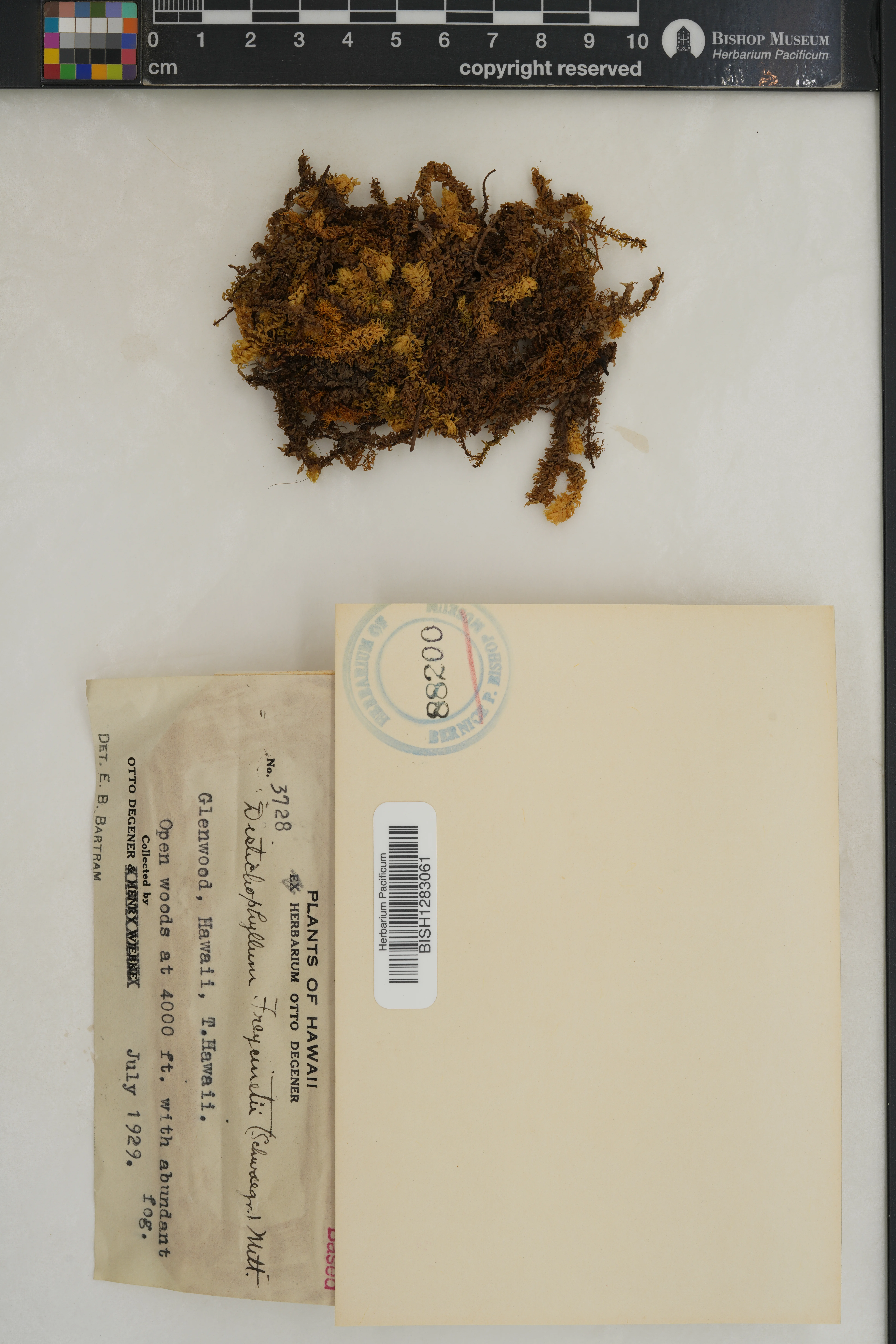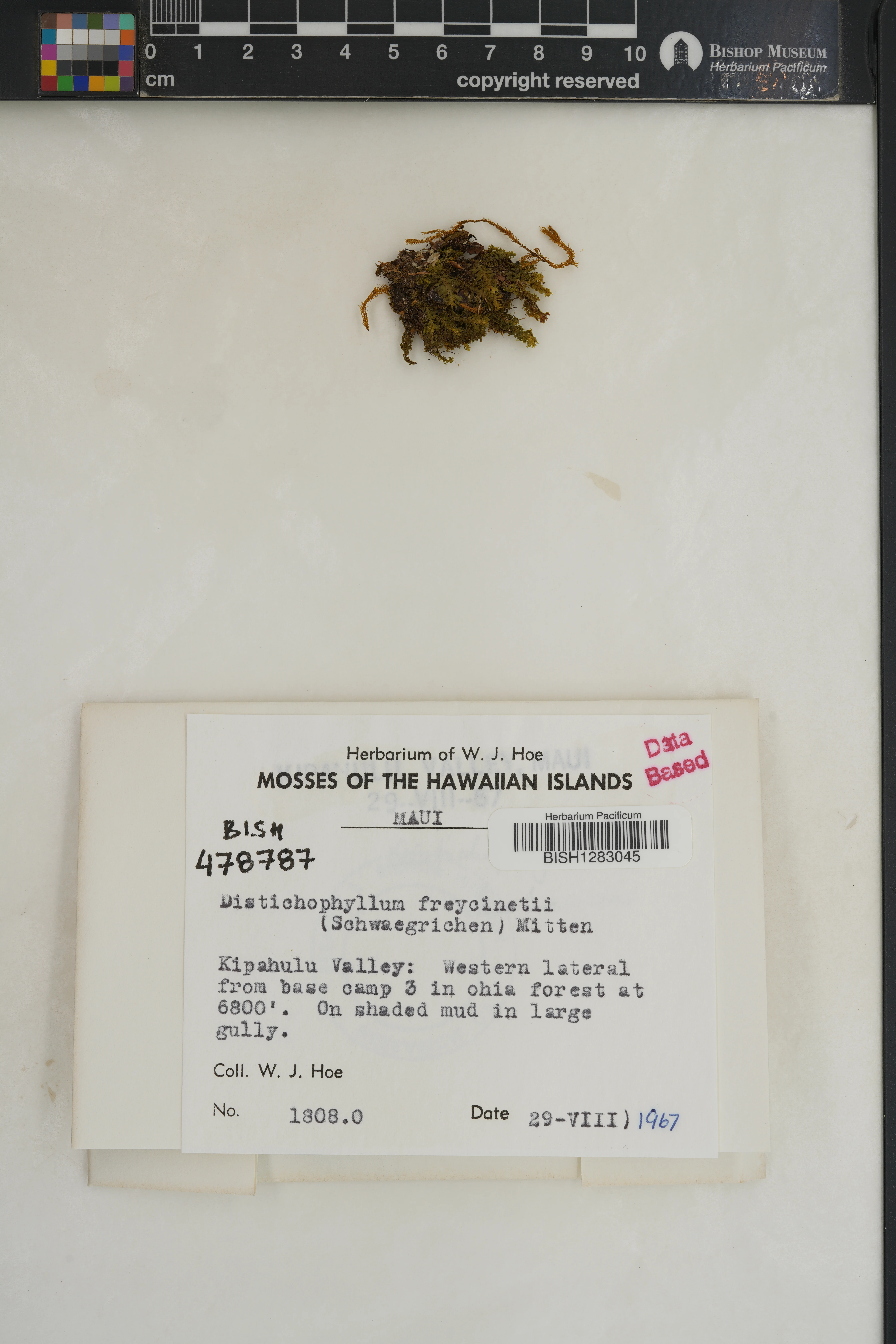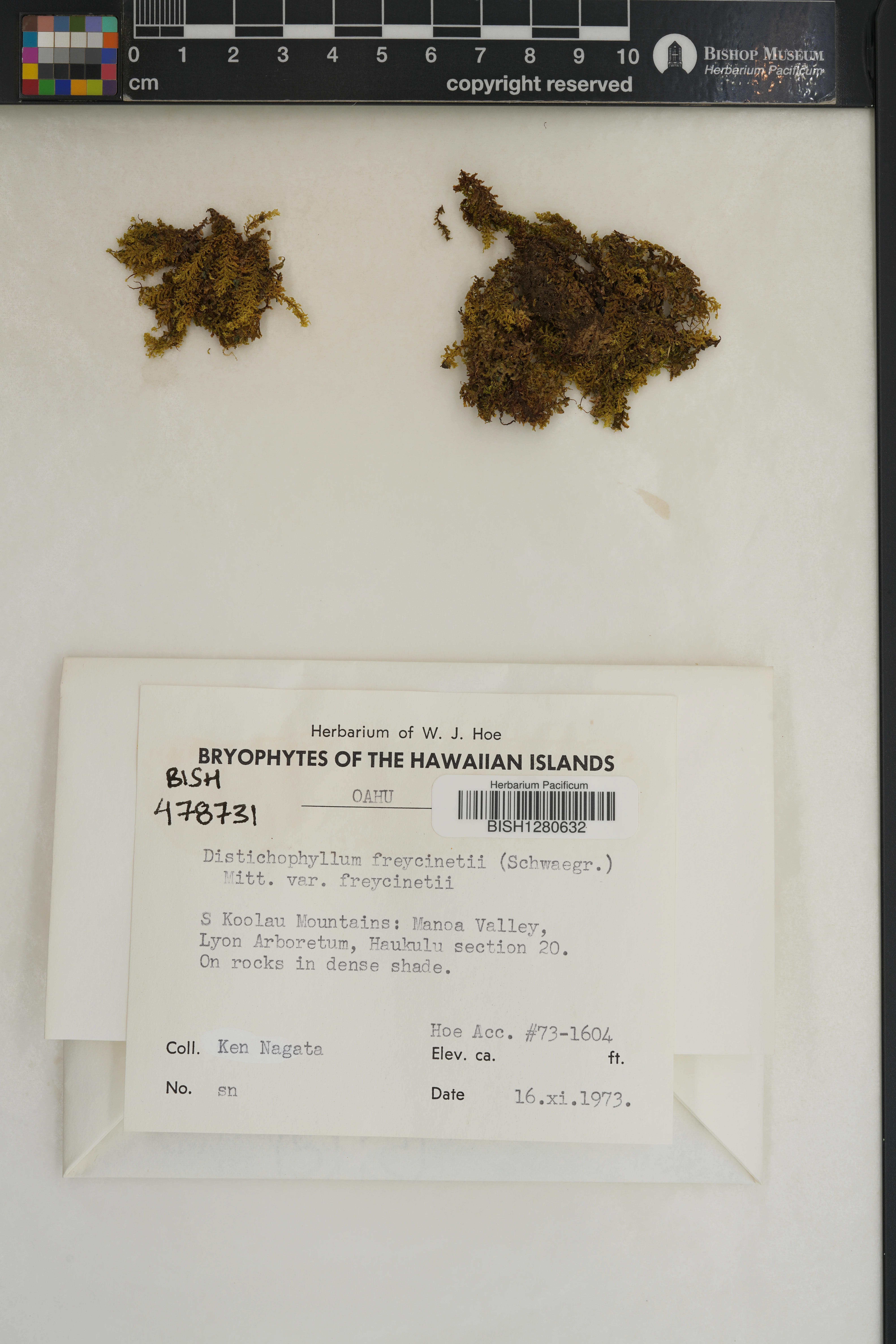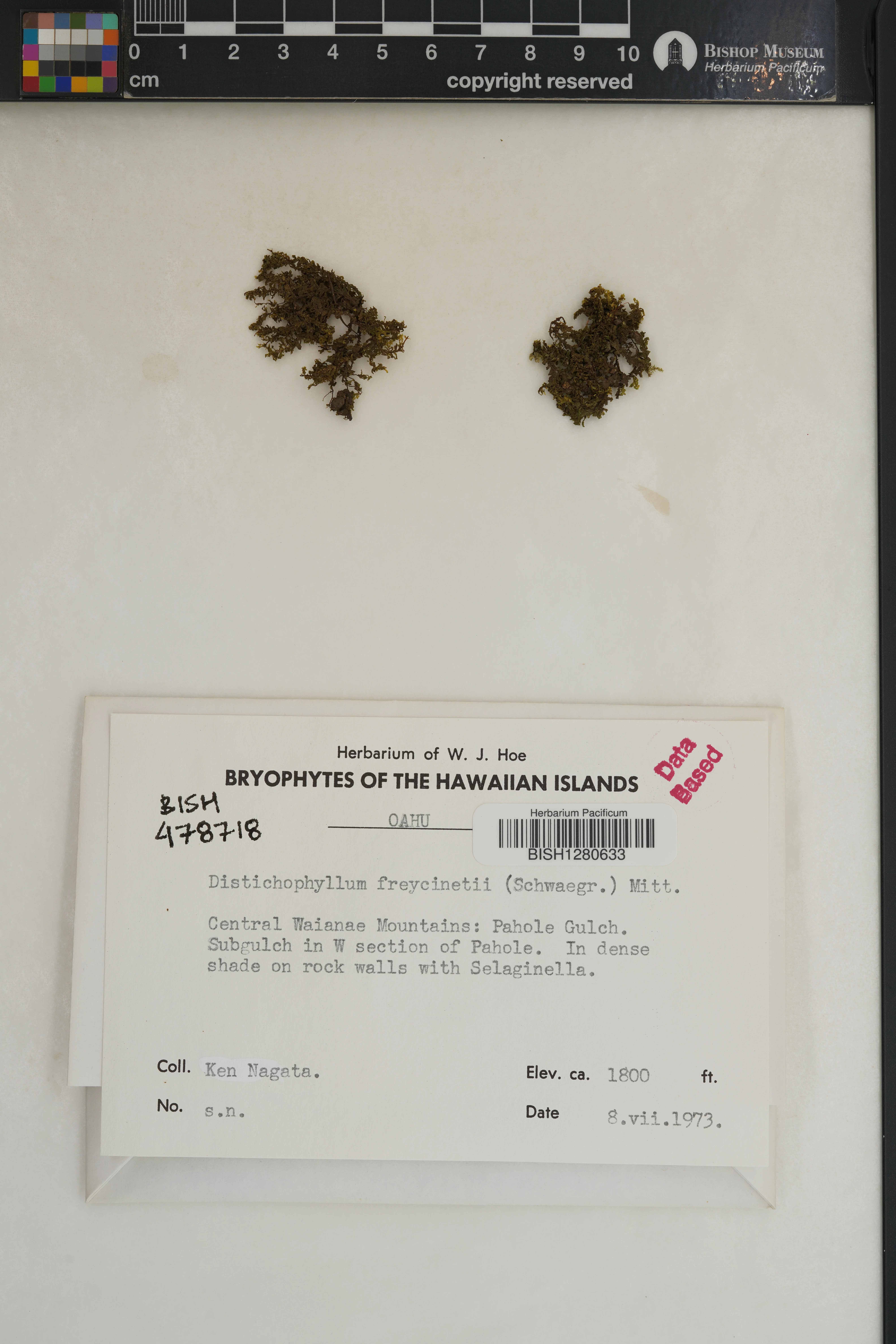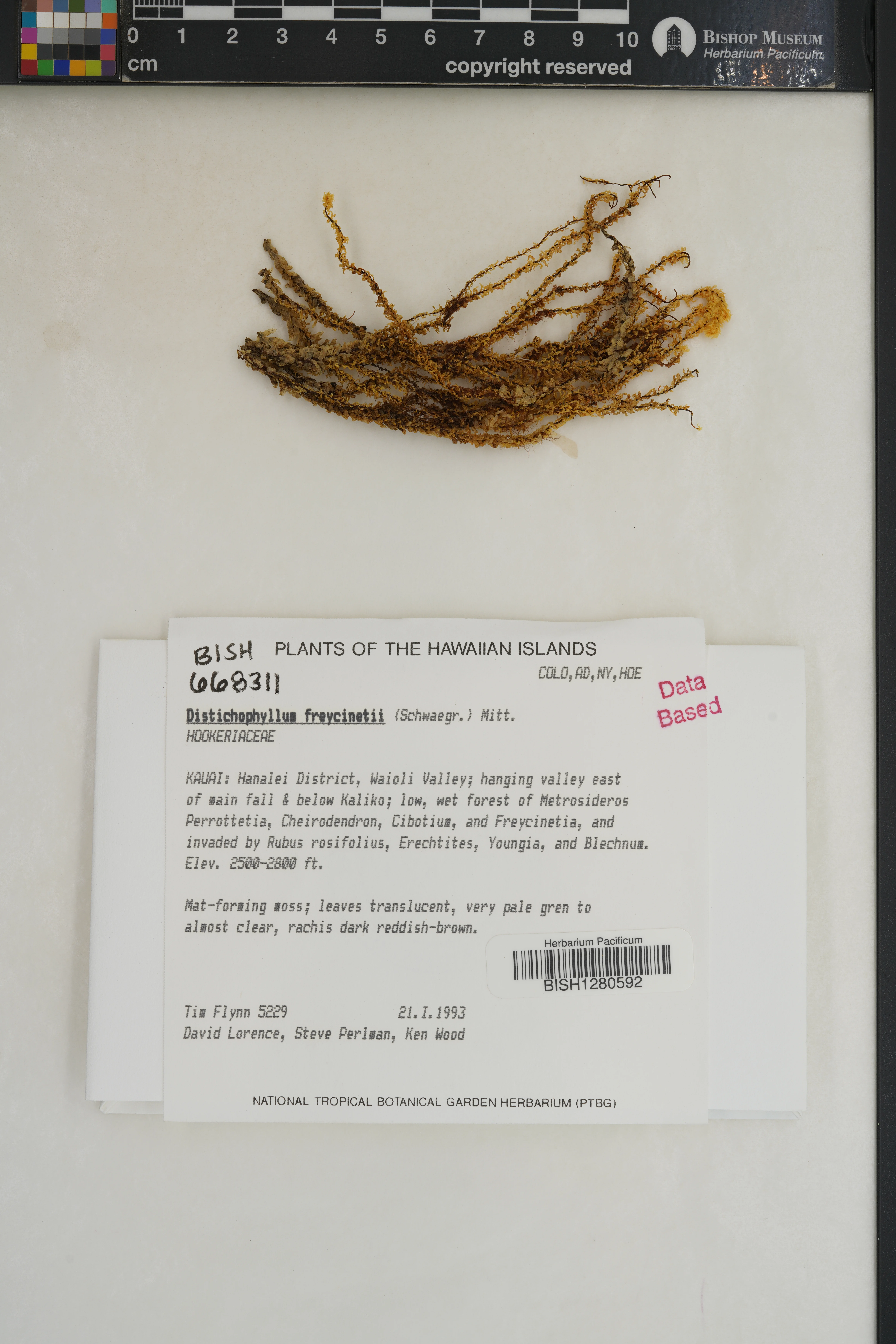 Kingdom: Viridiplantae Phylum: Bryophyta Class/Clade: Bryopsida Order: Hookeriales Family: Hookeriaceae Genus: Distichophyllum