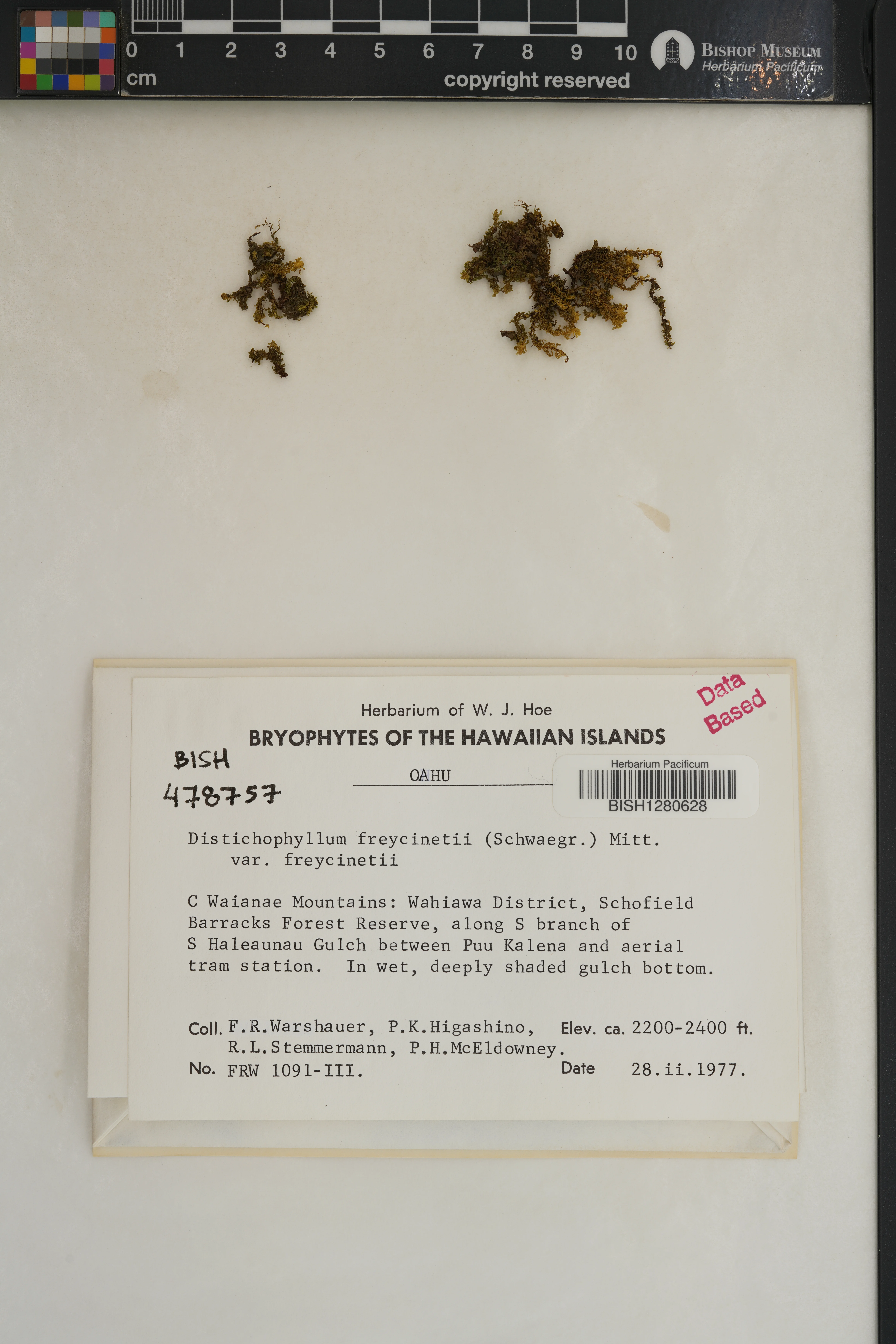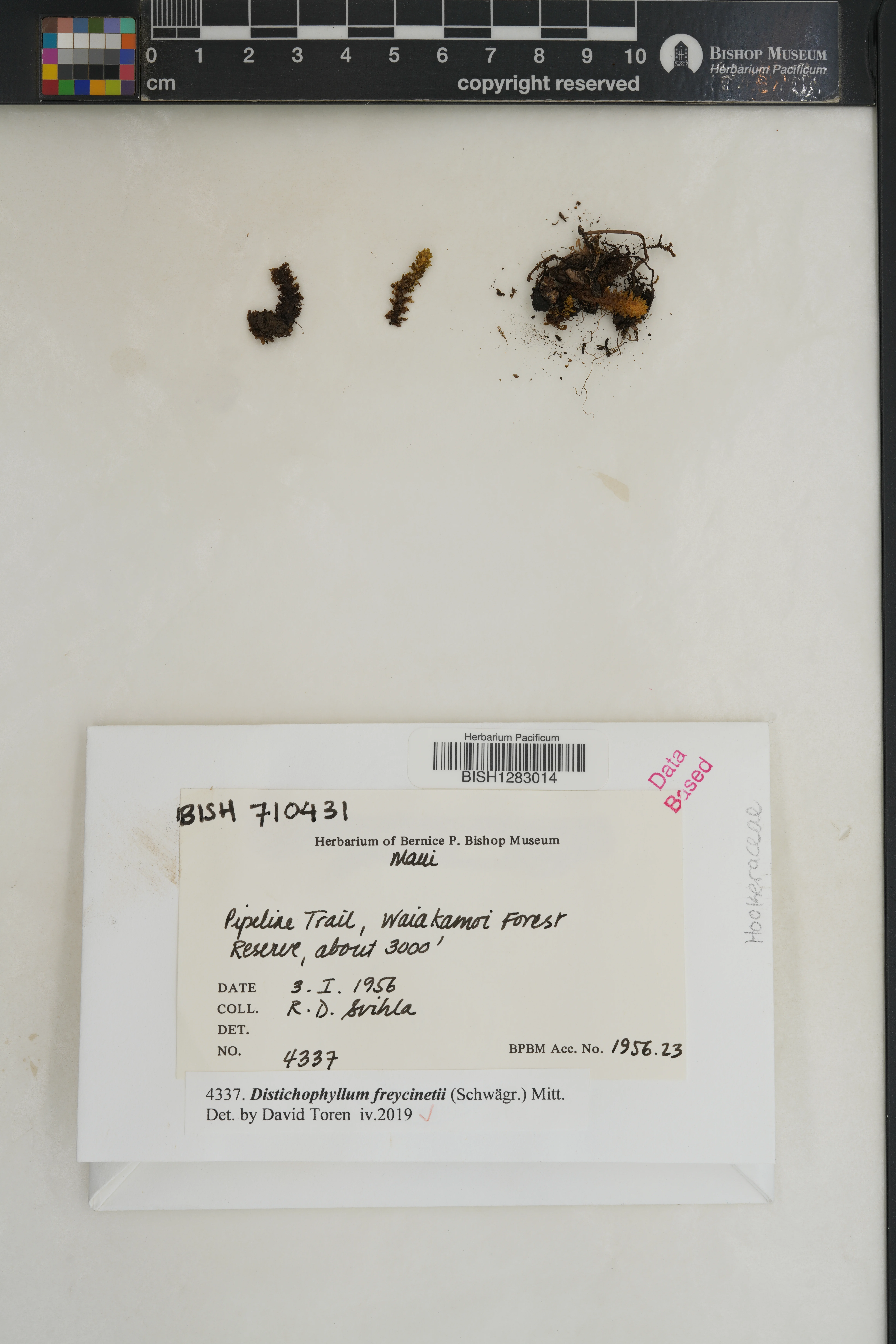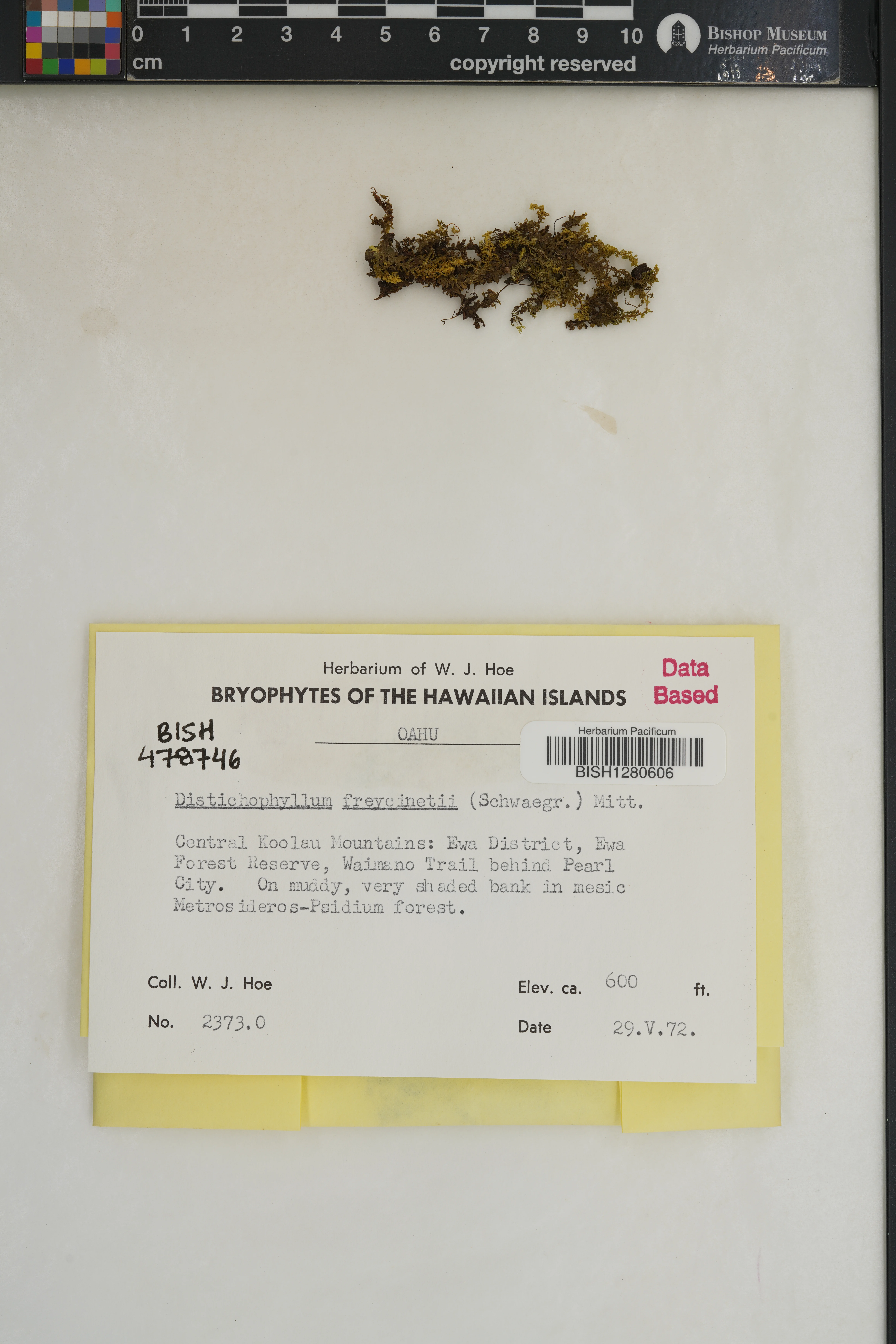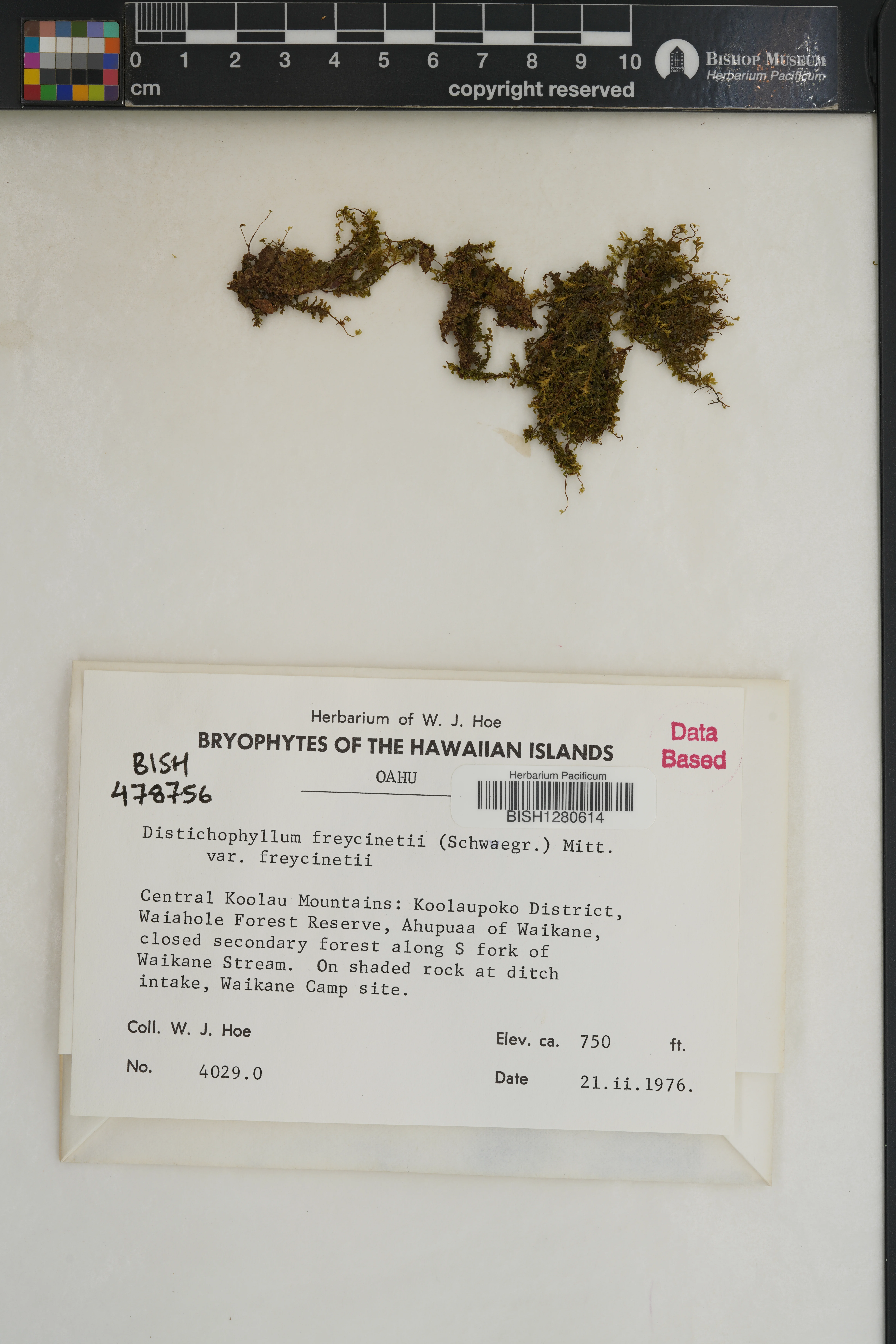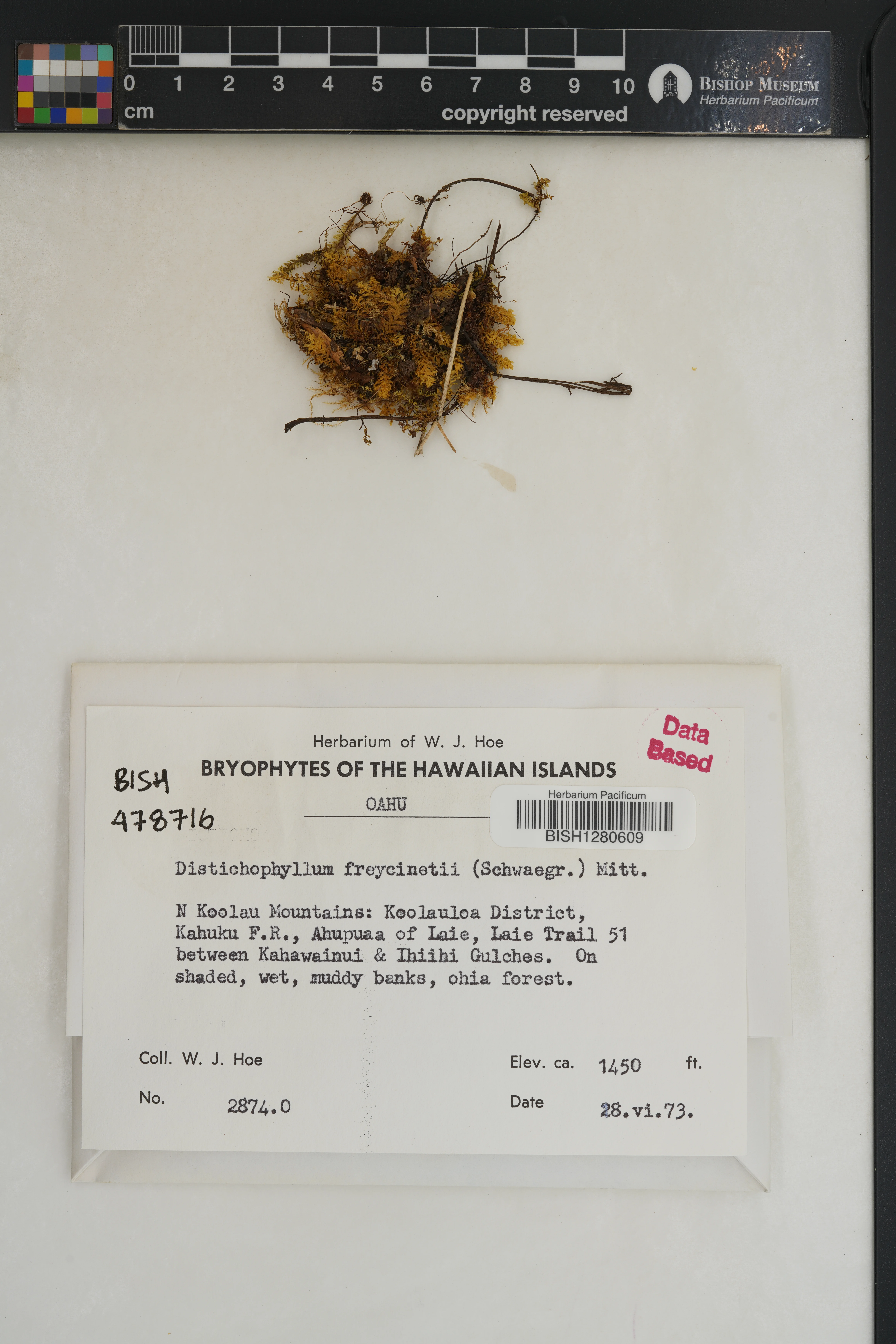 Kingdom: Viridiplantae Phylum: Bryophyta Class/Clade: Bryopsida Order: Hookeriales Family: Hookeriaceae Genus: Distichophyllum