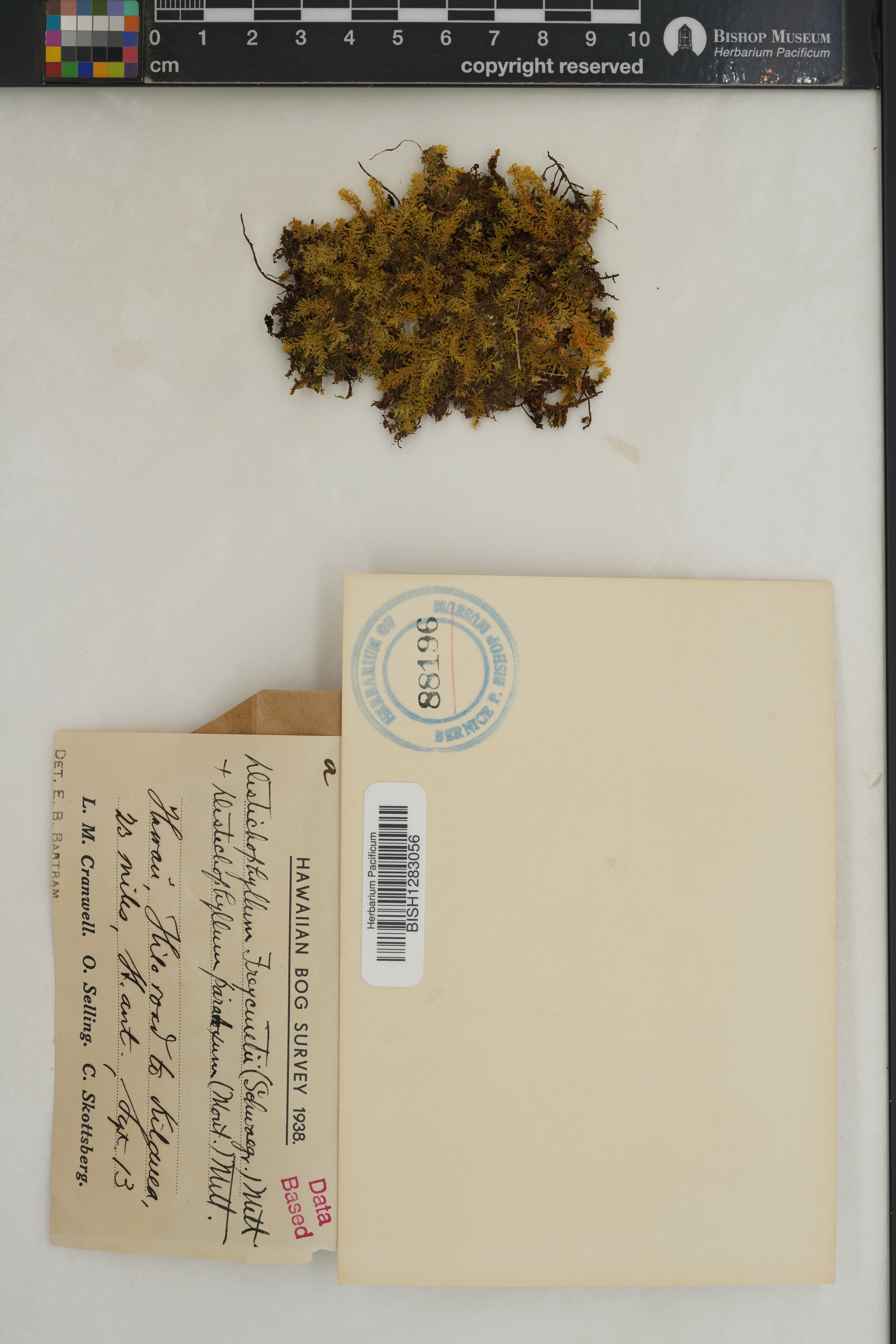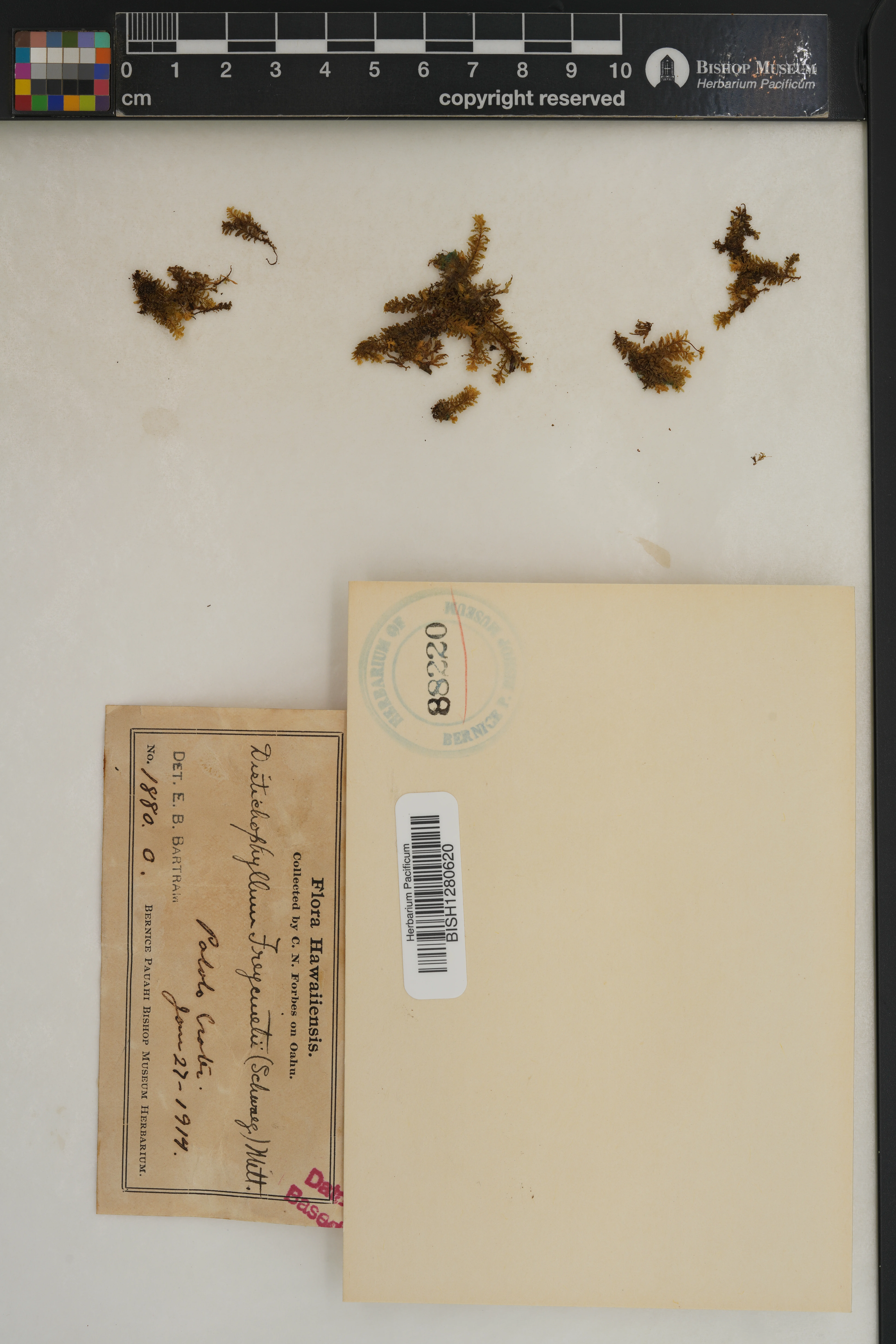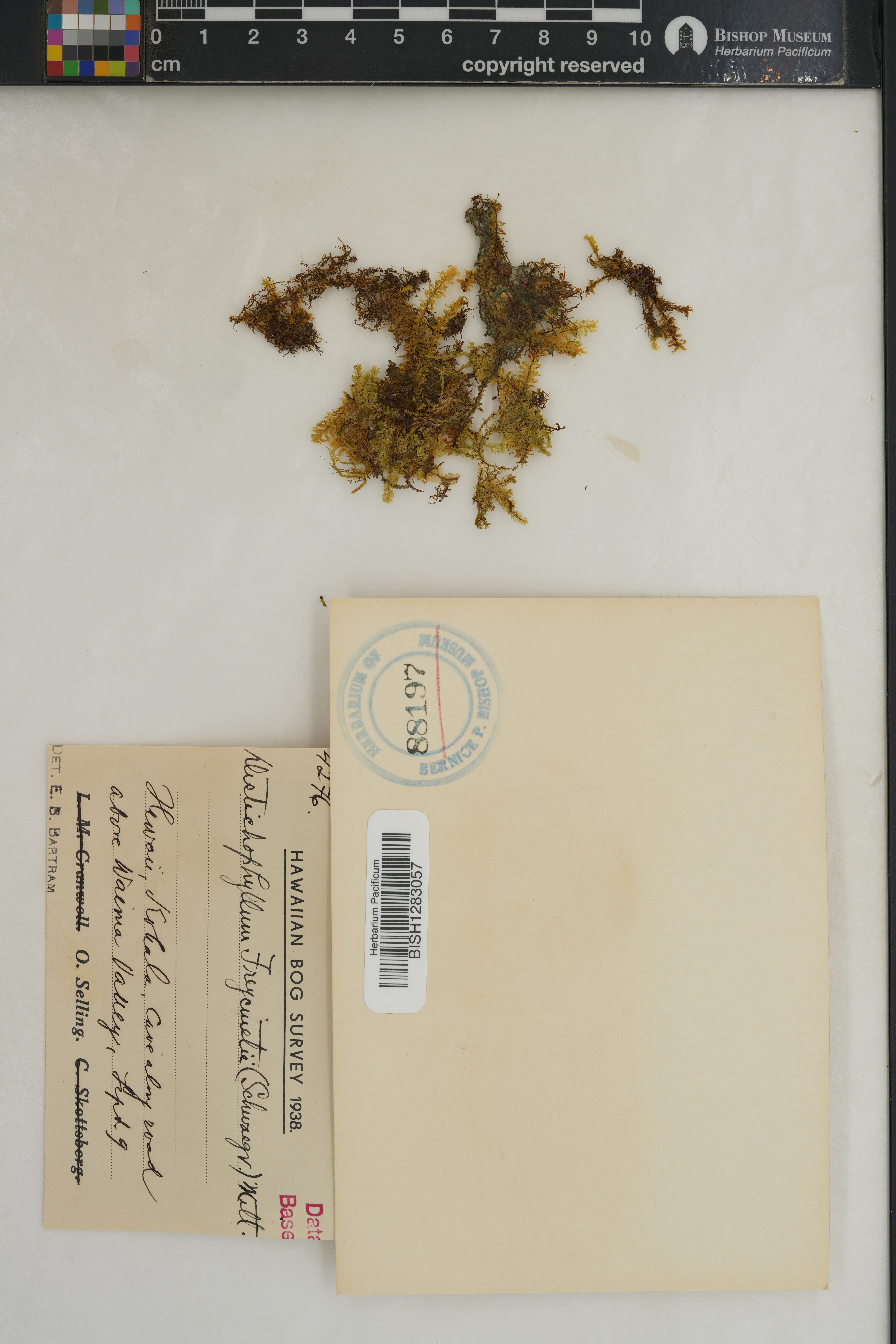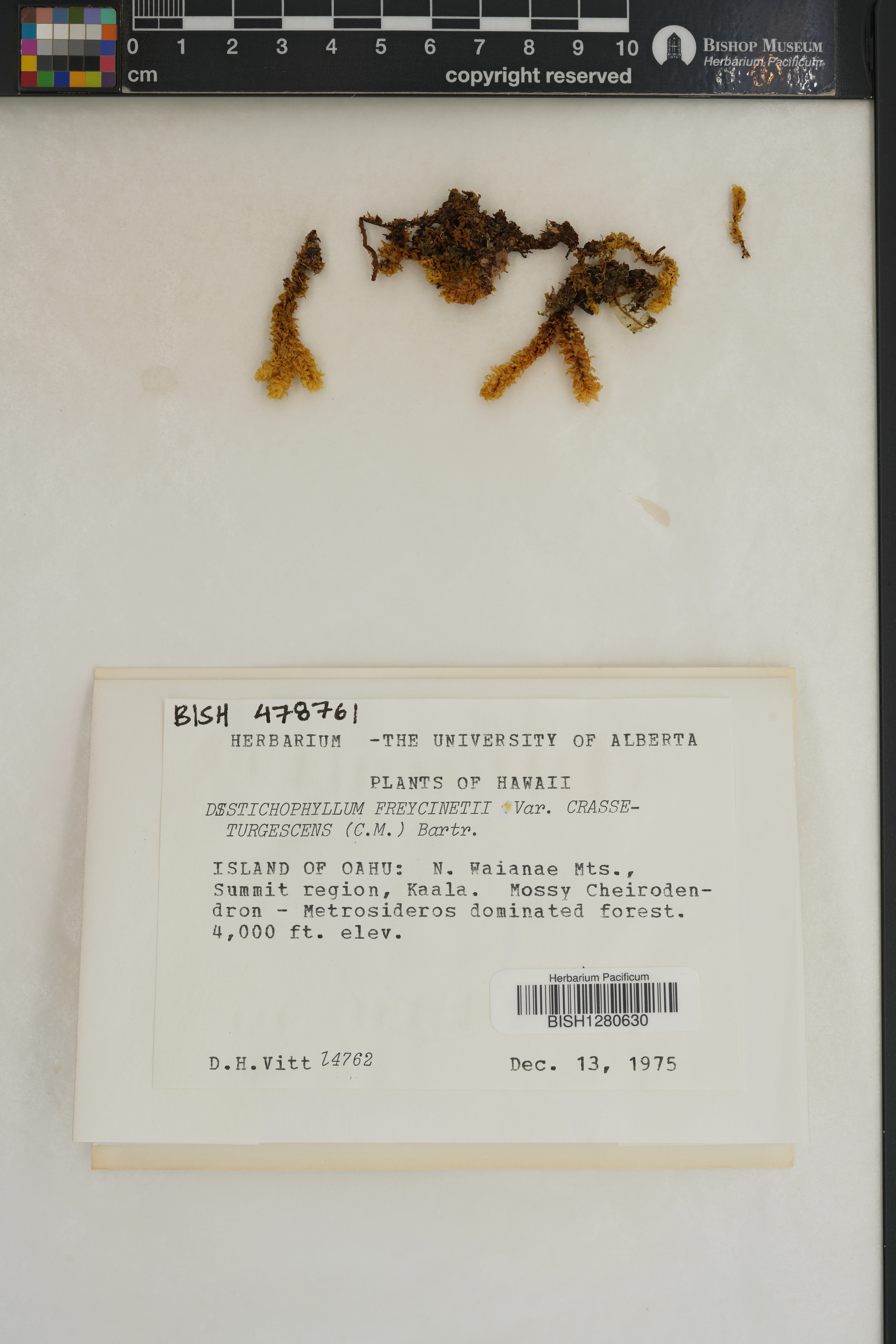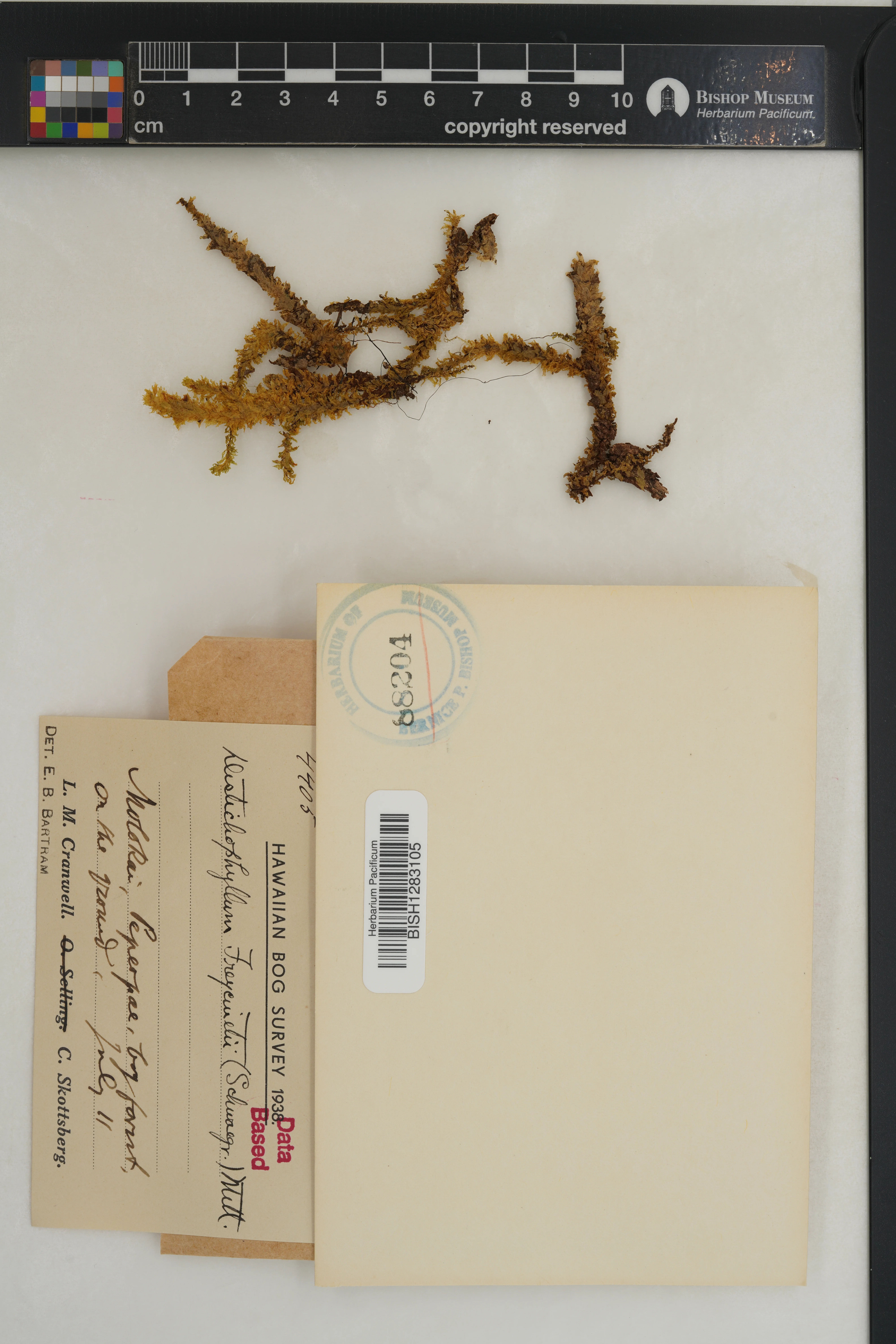 Kingdom: Viridiplantae Phylum: Bryophyta Class/Clade: Bryopsida Order: Hookeriales Family: Hookeriaceae Genus: Distichophyllum