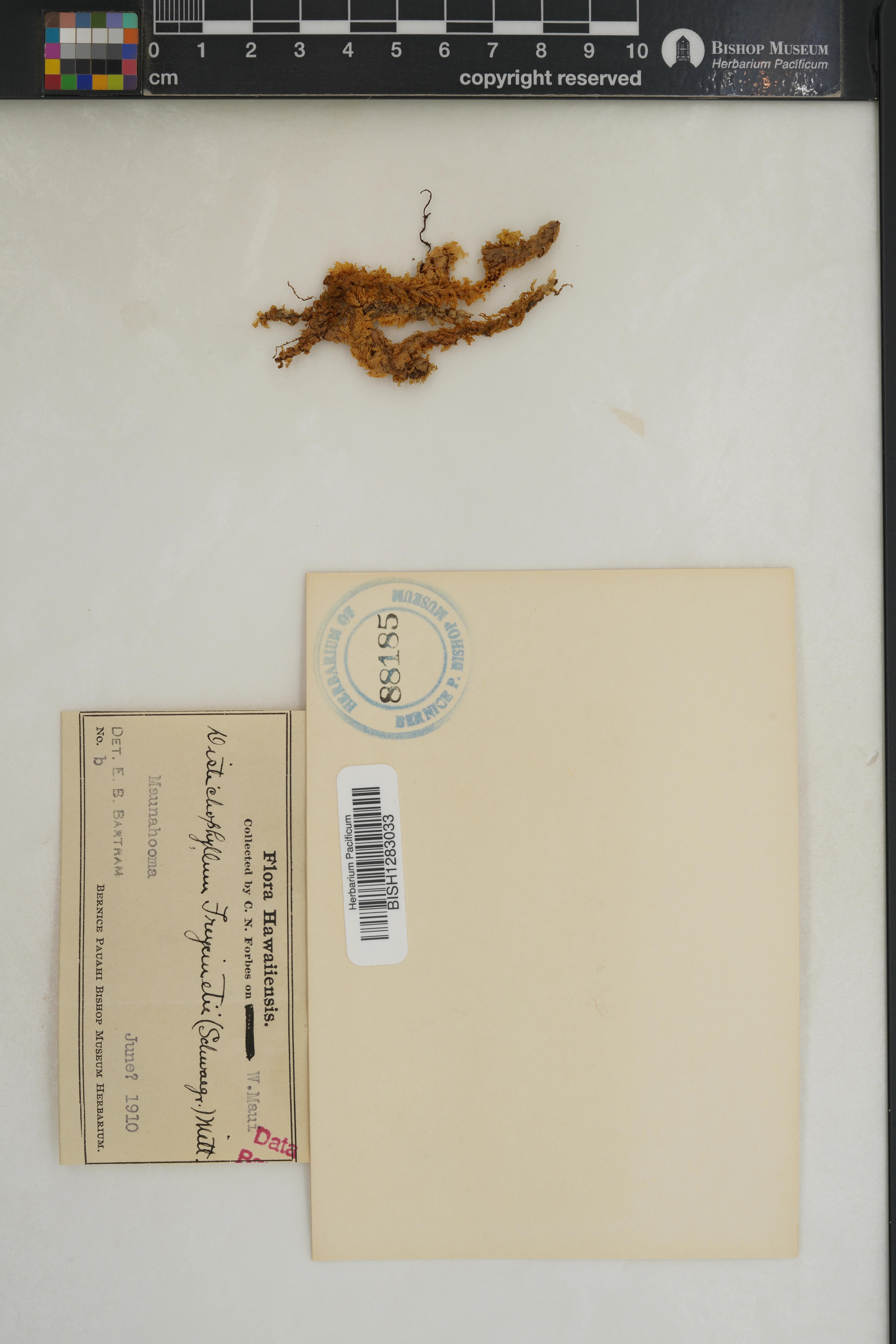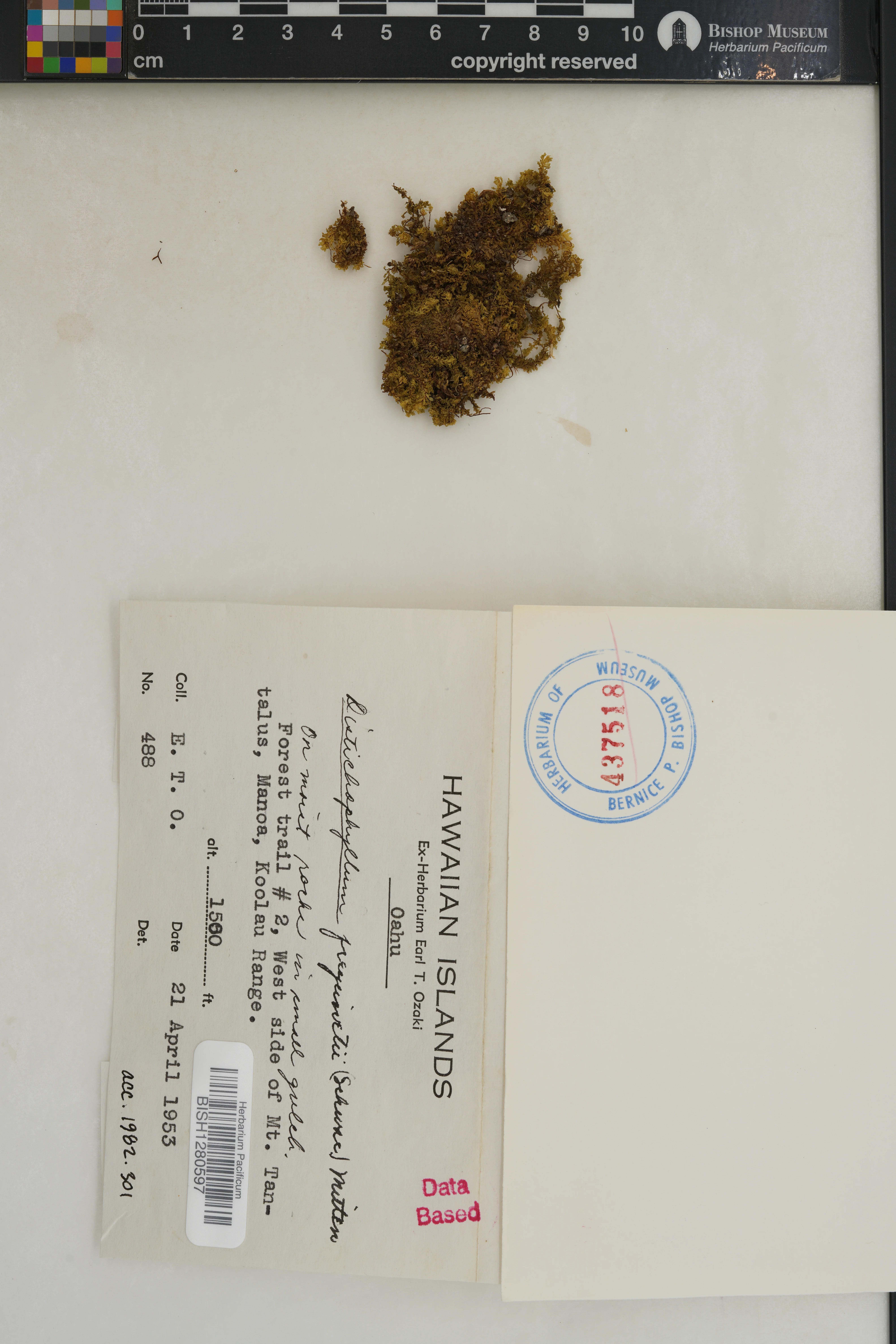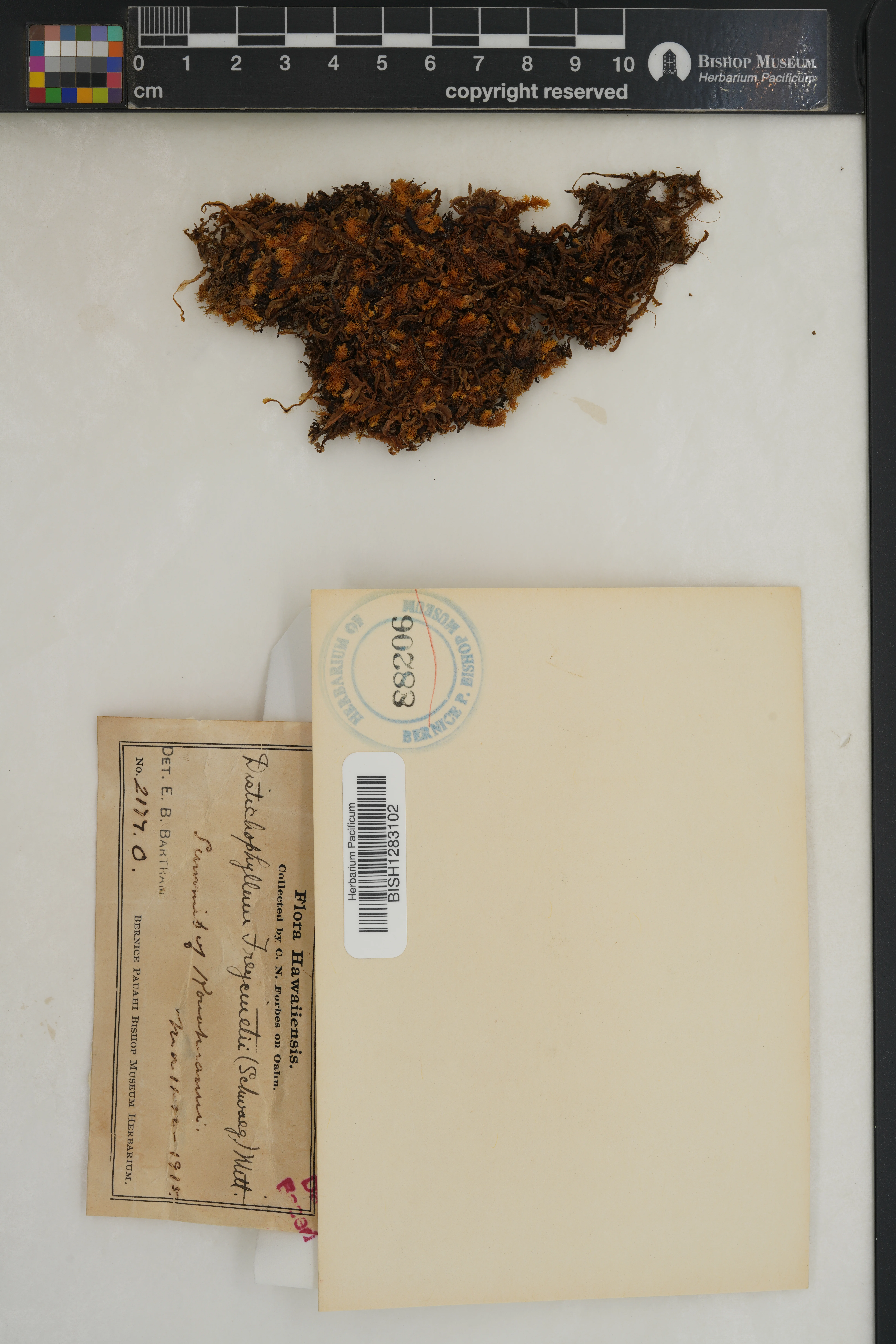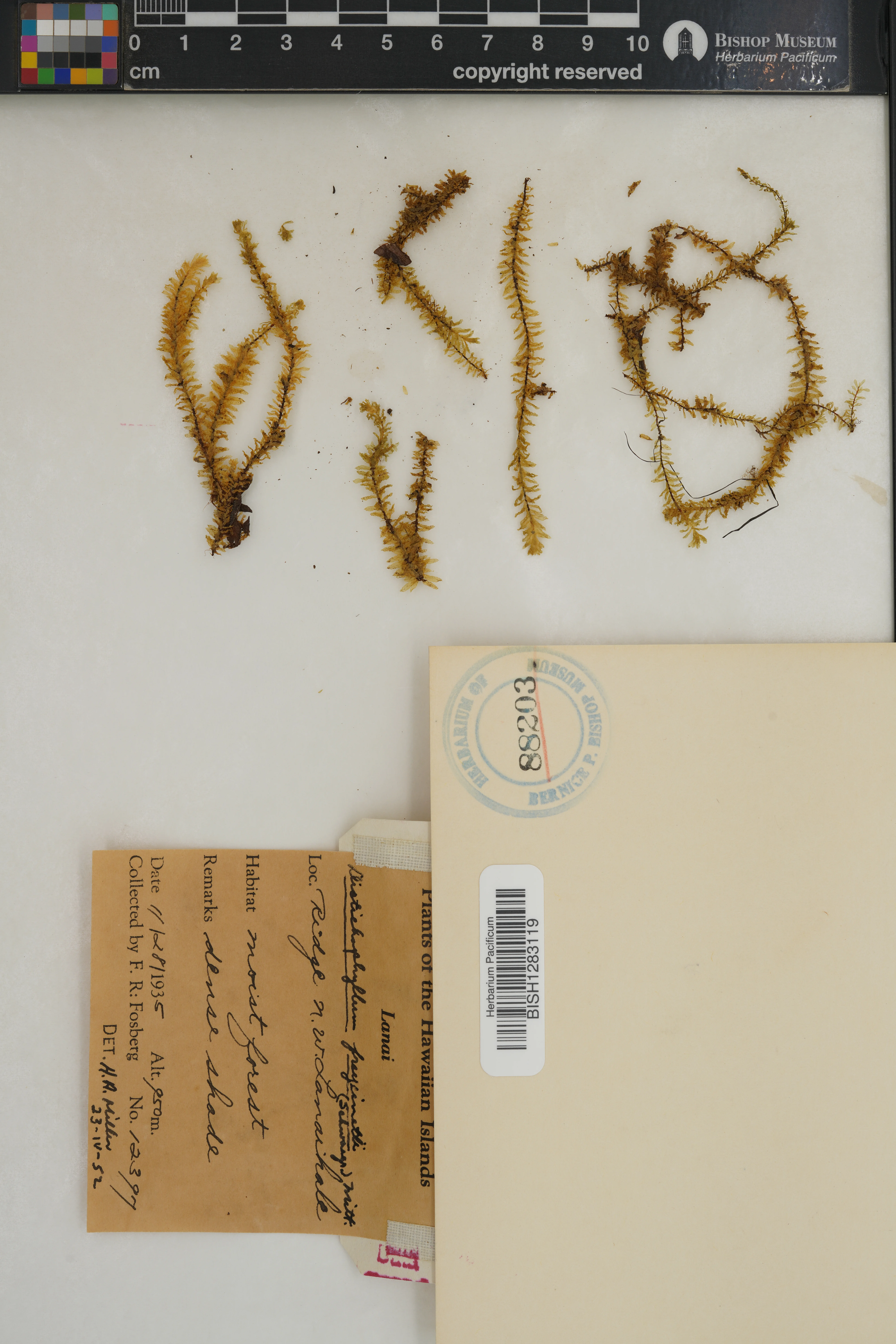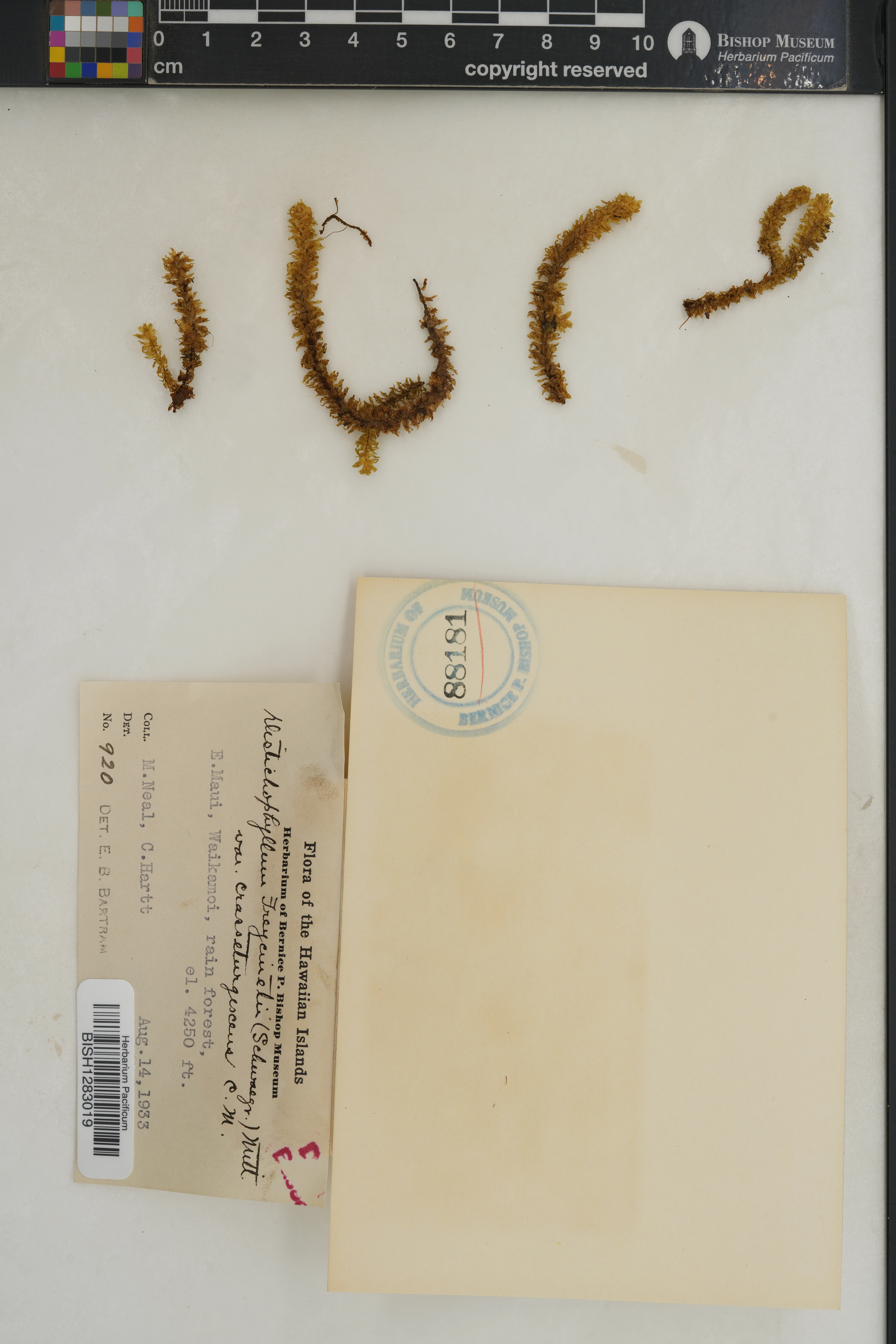 Kingdom: Viridiplantae Phylum: Bryophyta Class/Clade: Bryopsida Order: Hookeriales Family: Hookeriaceae Genus: Distichophyllum