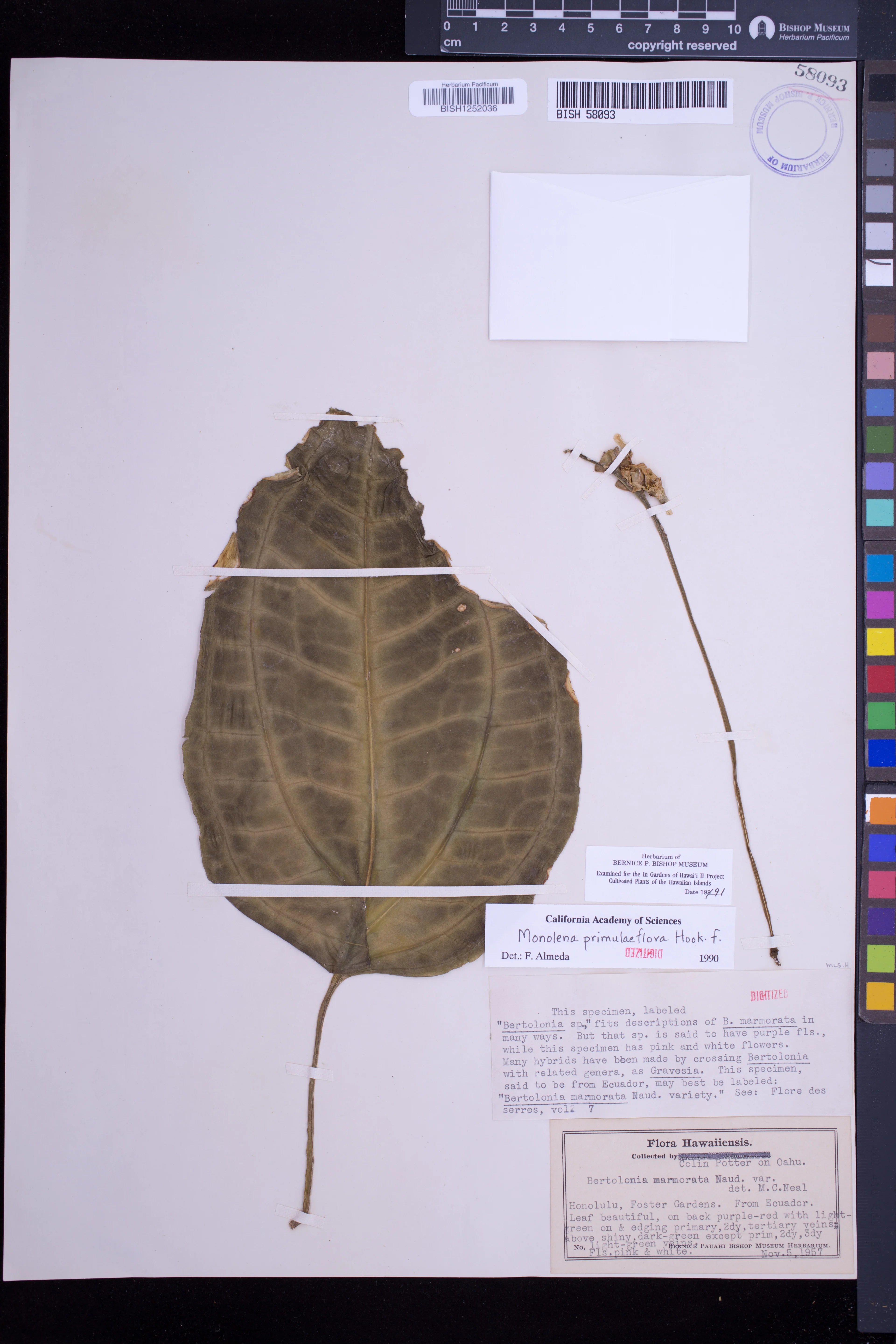 | 1 | Monolena primuliflora | Hook.f. | Honolulu; Foster Gardens | PRESERVED_SPECIMEN | Potter, C. | s.n. | Oahu | BISH | 11/5/1957 | |