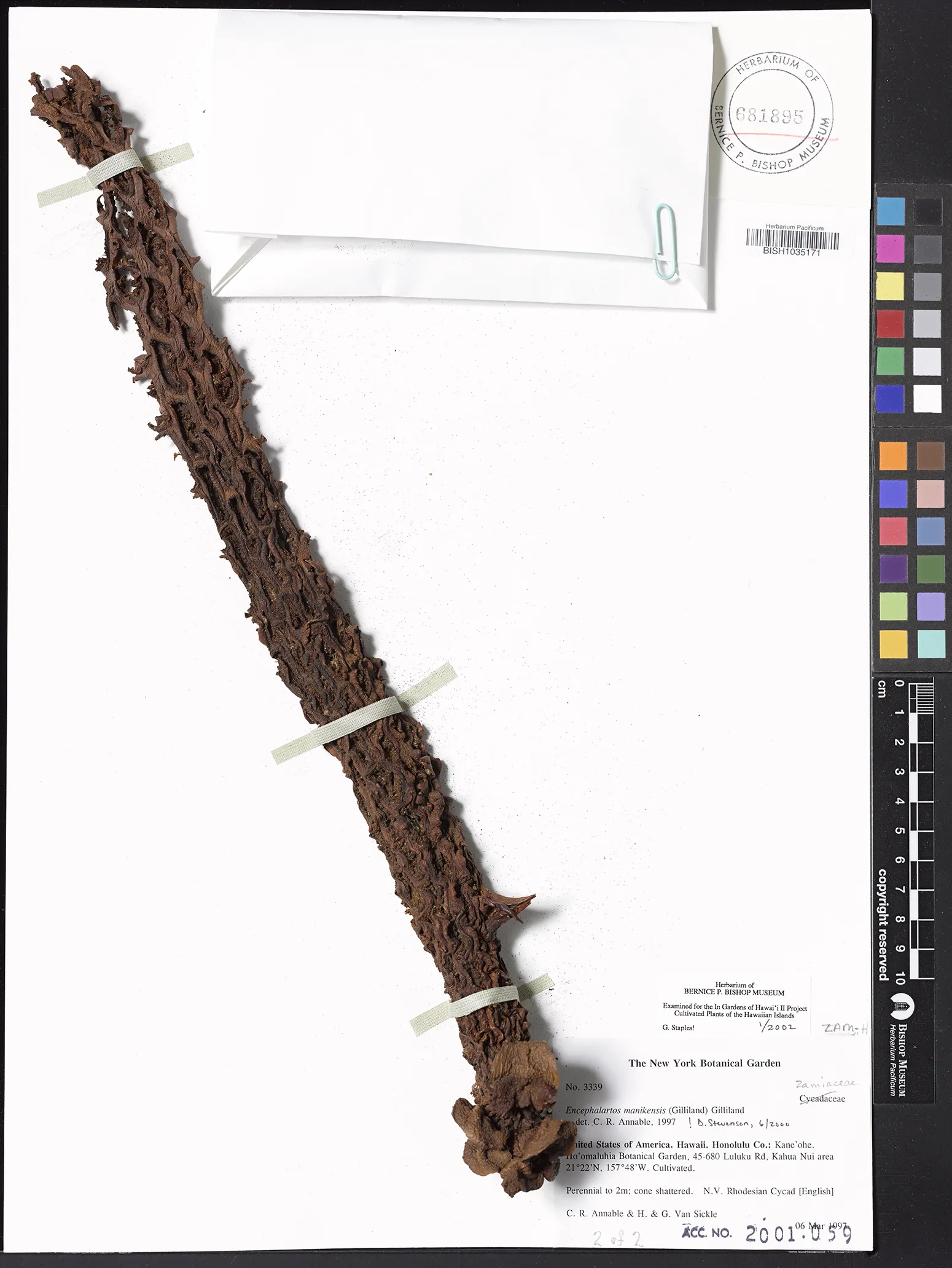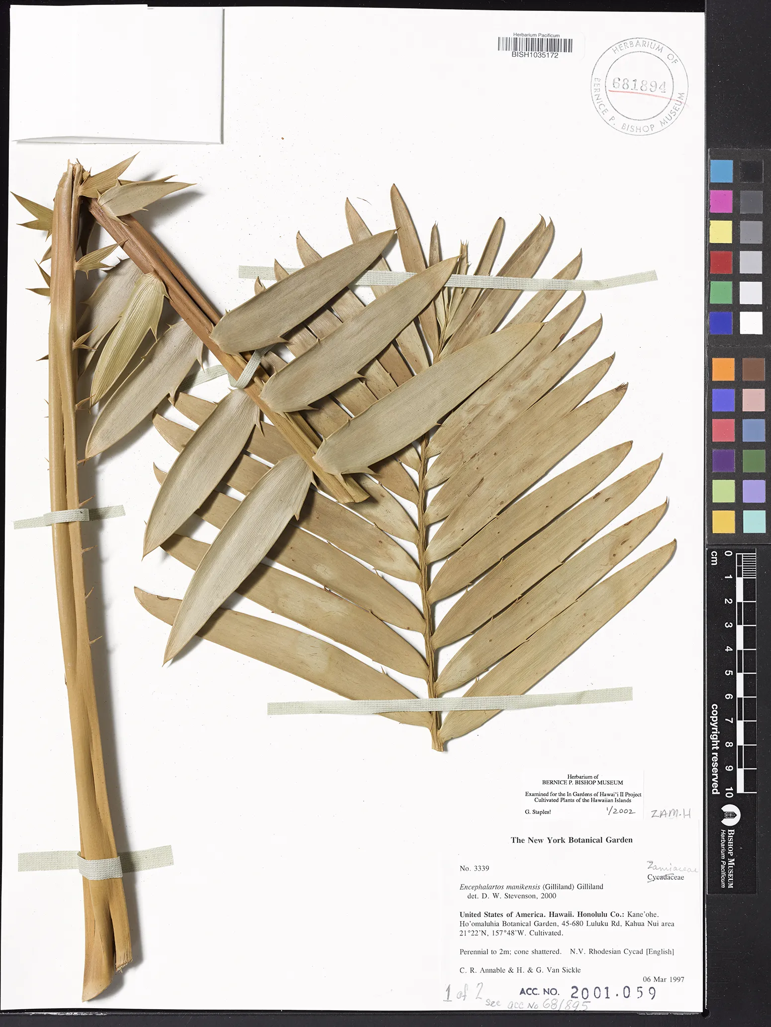 | 2 | Encephalartos manikensis | (Gilliland) Gilliland | Kaneohe, Hoomaluhia Botanical Garden, 45-680 Luluku Rd, Kahua Nui area | PRESERVED_SPECIMEN | Annable, C.R. | 3339 | Oahu | BISH | 3/6/1997 | |
