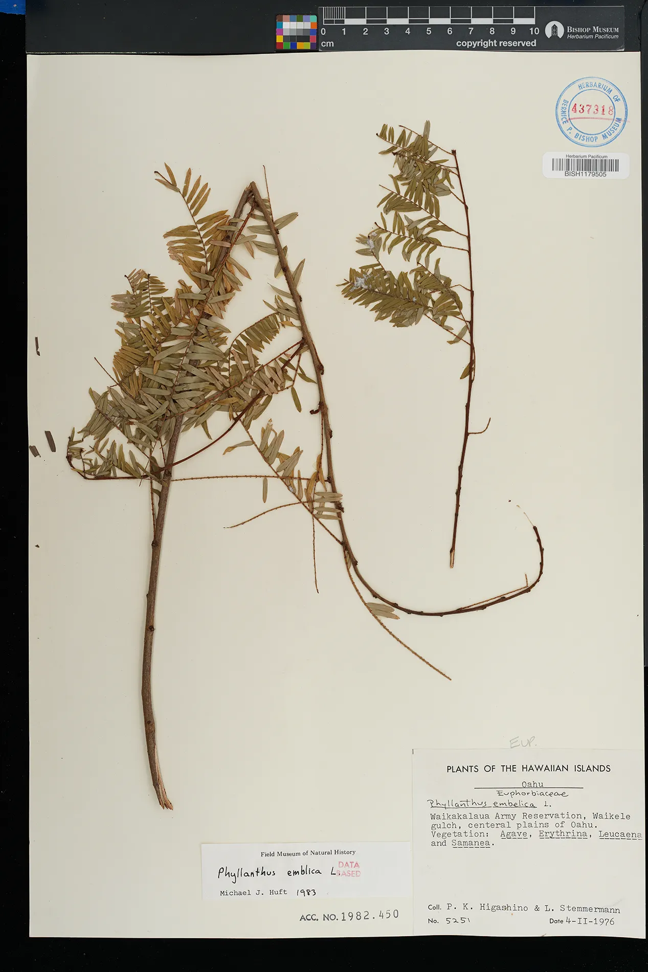 | 3 | Phyllanthus emblica | L. | Waikakalaua Army Reservation, Waikele Gulch | with Agave, Erythrina, Leucaena and Samanea | PRESERVED_SPECIMEN | Higashino, P.K. | 5251 | Oahu | BISH | 2/4/1976 |