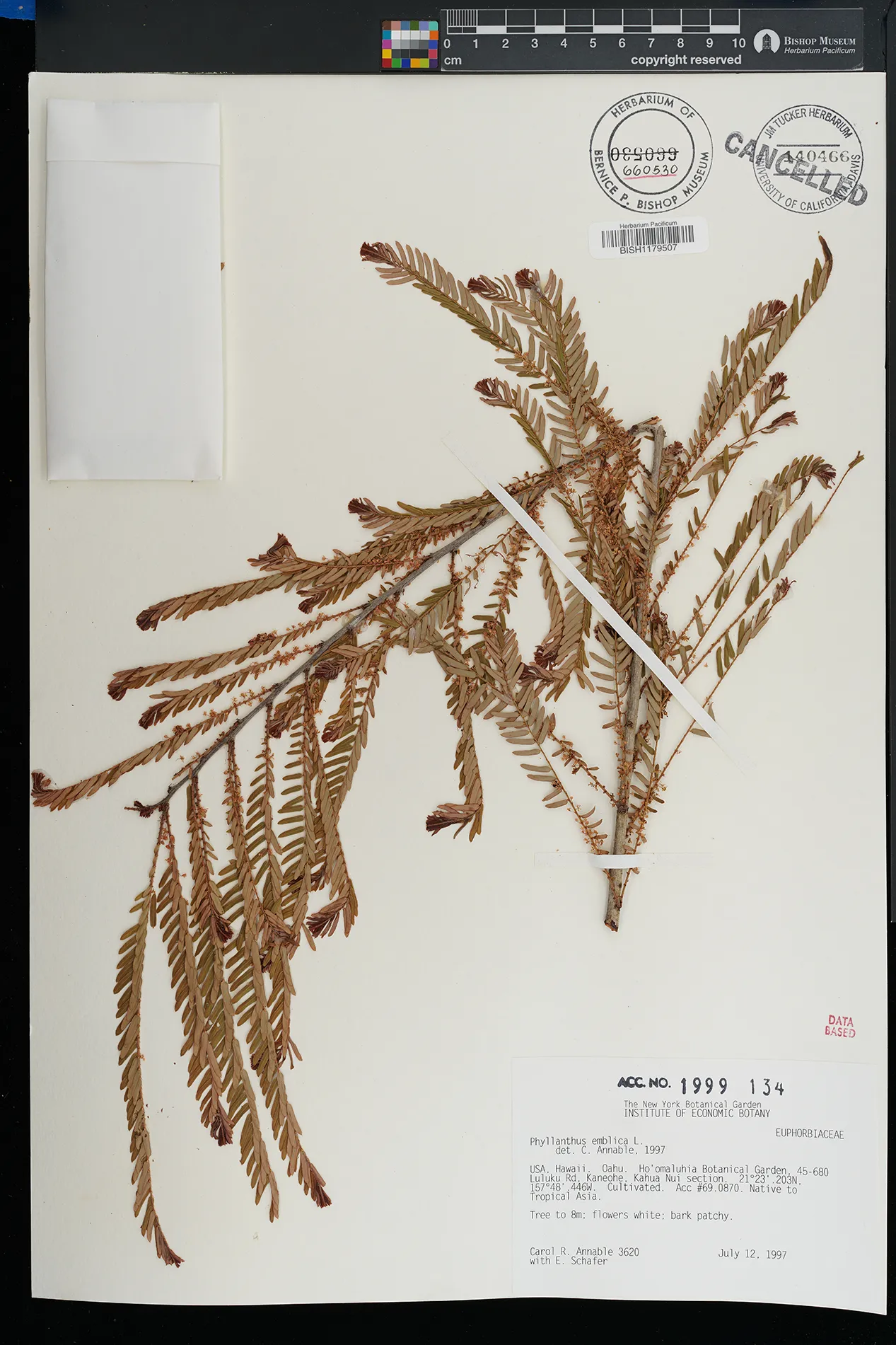 | 7 | Phyllanthus emblica | L. | Ho'omaluhia Botanical Garden, 45-680 Luluku Rd, Kahua Nui area | Cultivated | PRESERVED_SPECIMEN | C. R. Annable | 3620 | NY | 7/12/1997 | |