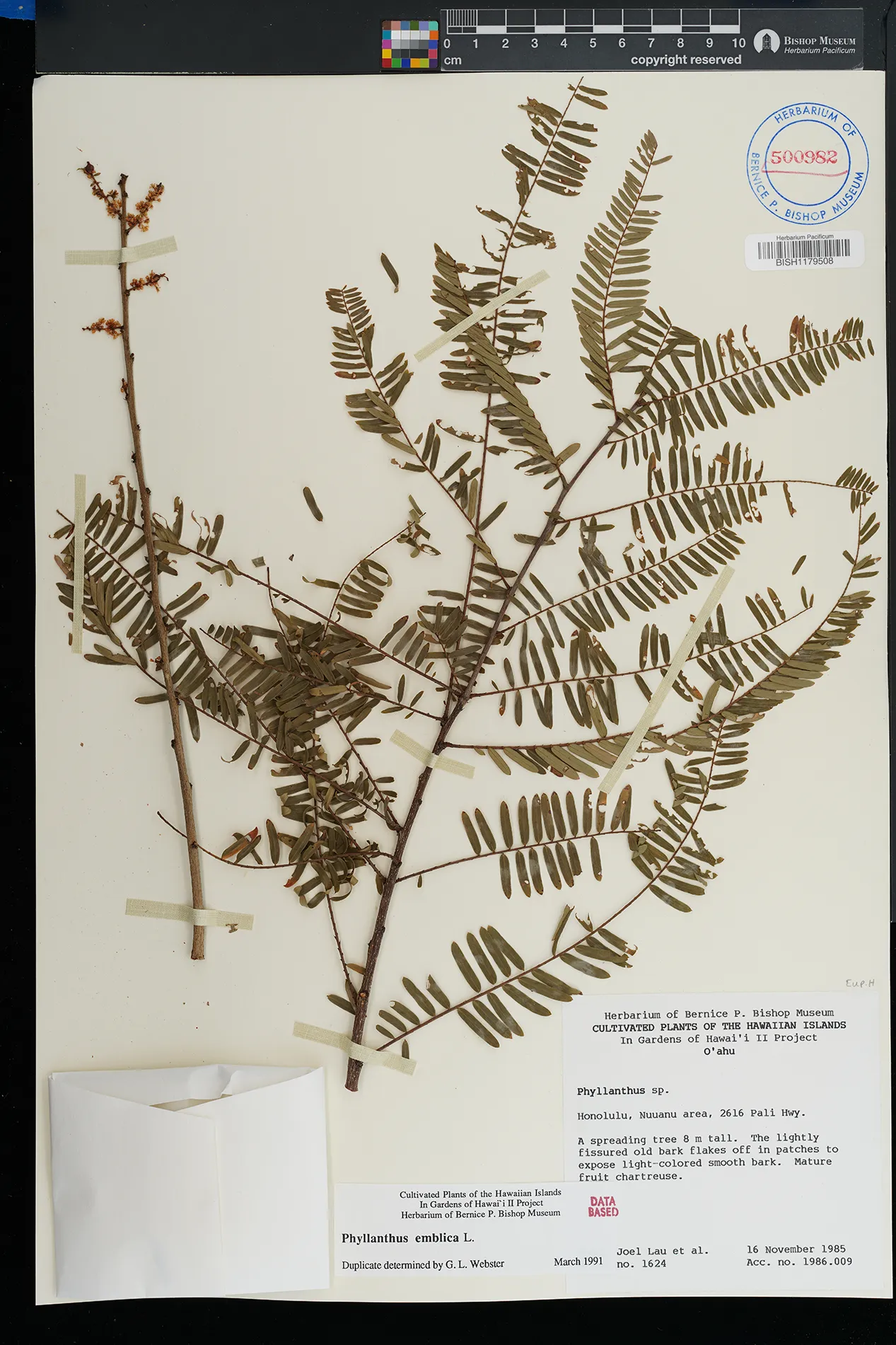 | 11 | Phyllanthus emblica | L. | Honolulu, Nuuanu area. 2616 Pali Hwy | PRESERVED_SPECIMEN | Lau, J. | 1624 | Oahu | BISH | 11/16/1985 | |