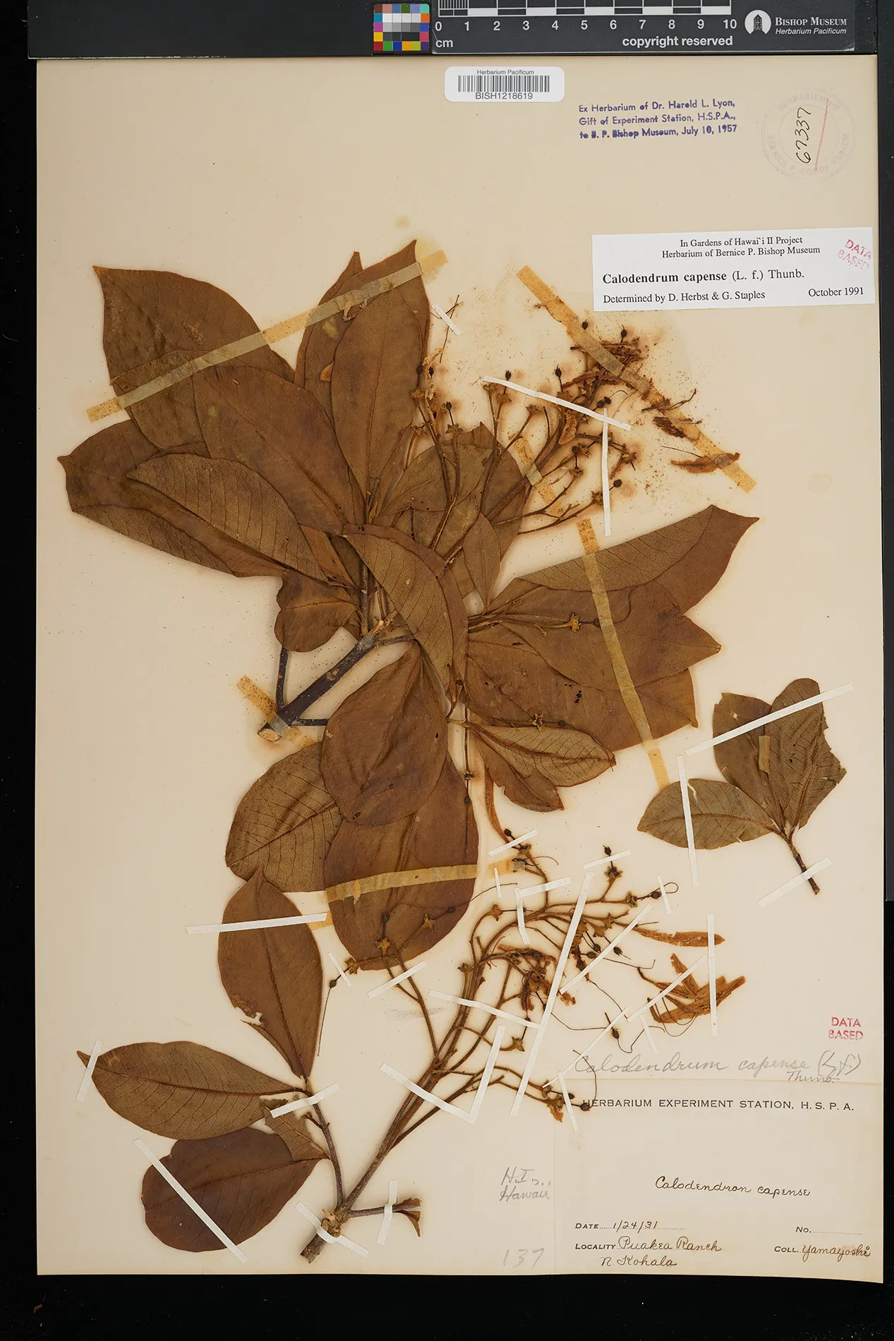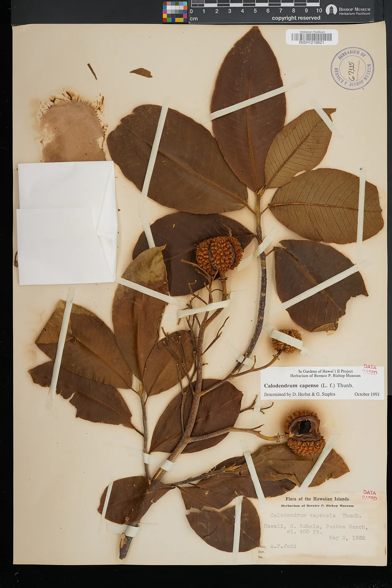 | 8 | Calodendrum capense | (L.f.) Thunb. | north kohala district: puakea ranch | PRESERVED_SPECIMEN | yamayoshi | collector number: 137 | Hawaii | BISH | 1/1/1931 |