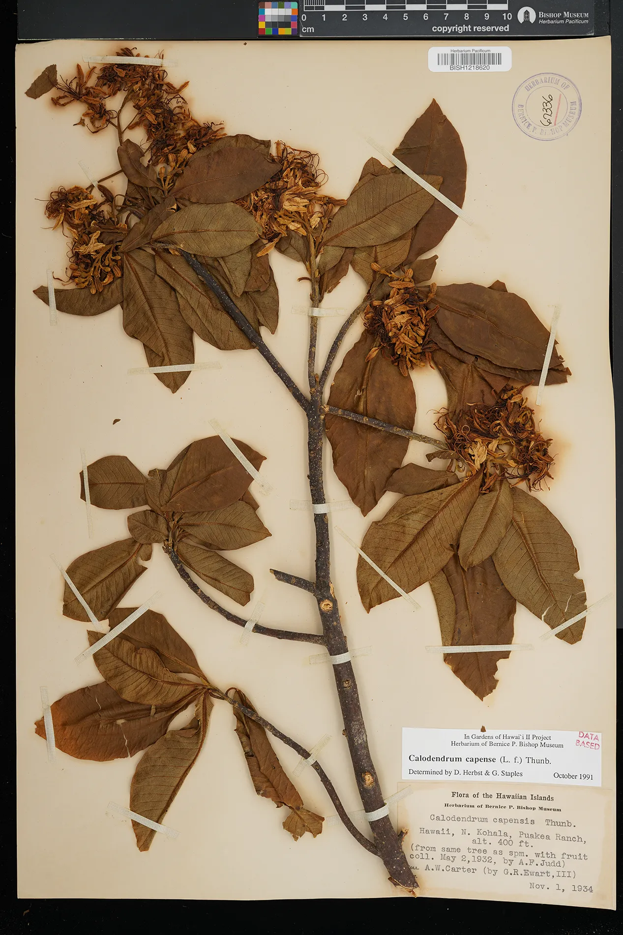 | 4 | Calodendrum capense | (L.f.) Thunb. | North Kohala District: Puakea Ranch | PRESERVED_SPECIMEN | Carter, A.W. | s.n. | Hawaii | BISH | 11/1/1934 | |