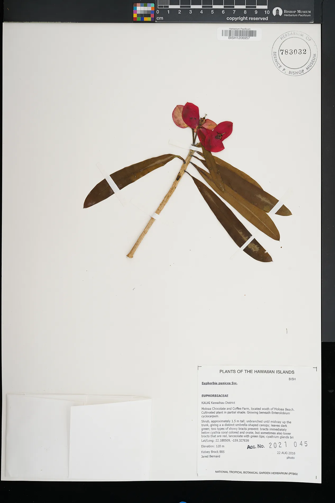 1 Euphorbia punicea Sw. Moloaa Chocolate and Coffee Farm, located south of Moloaa Beach. Cultivated plant in partial shade. PRESERVED_SPECIMEN Kelsey Brock 885 Kauai PTBG 8/22/2016