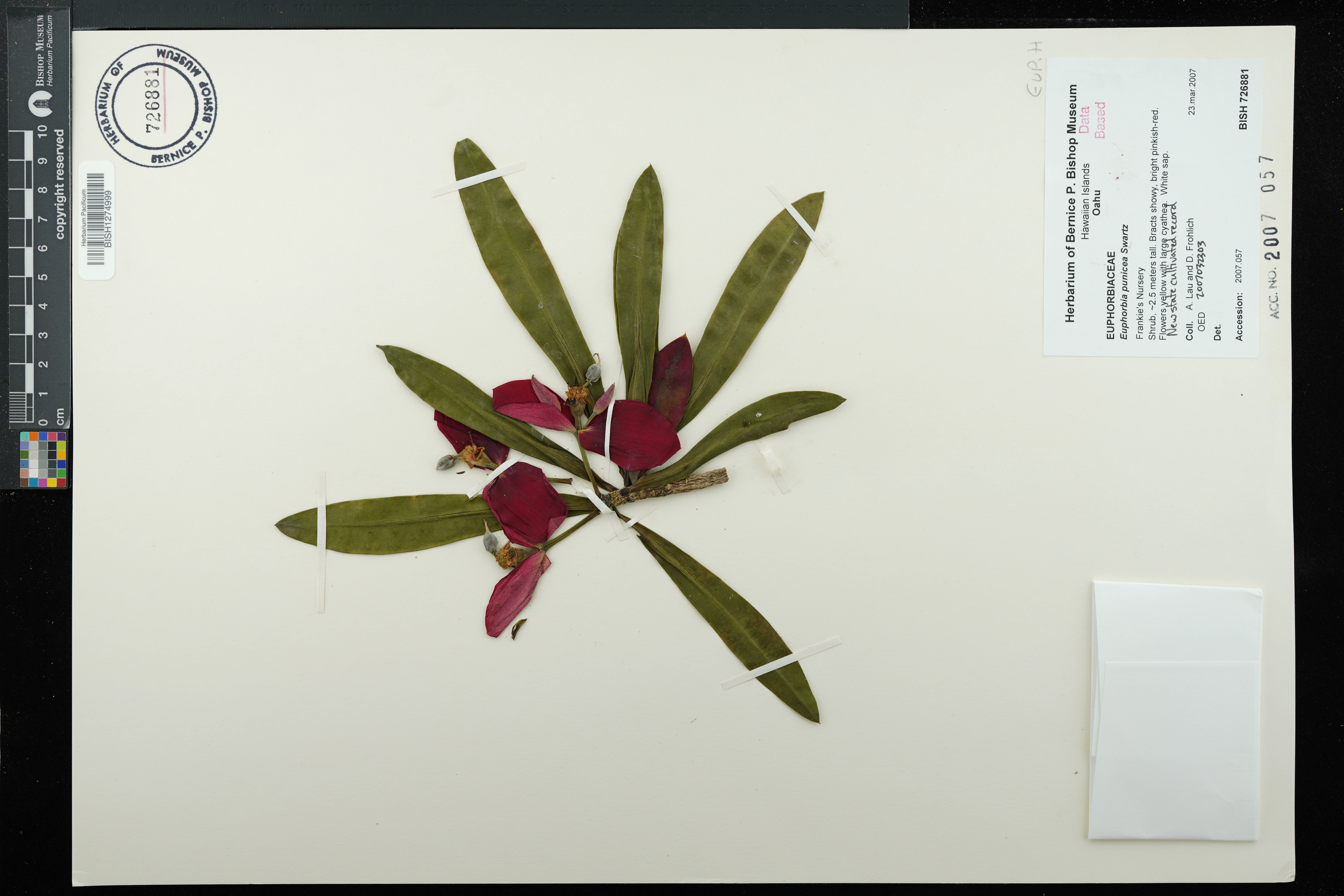 3 Euphorbia punicea Sw. Lihue. "German Hill". Lihue Lutheran Church. On either side of entrance to chapel. Cultivated. PRESERVED_SPECIMEN Tim Flynn 8727 Kauai PTBG 4/7/2017