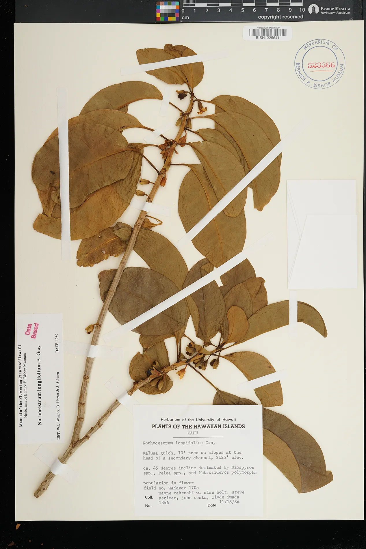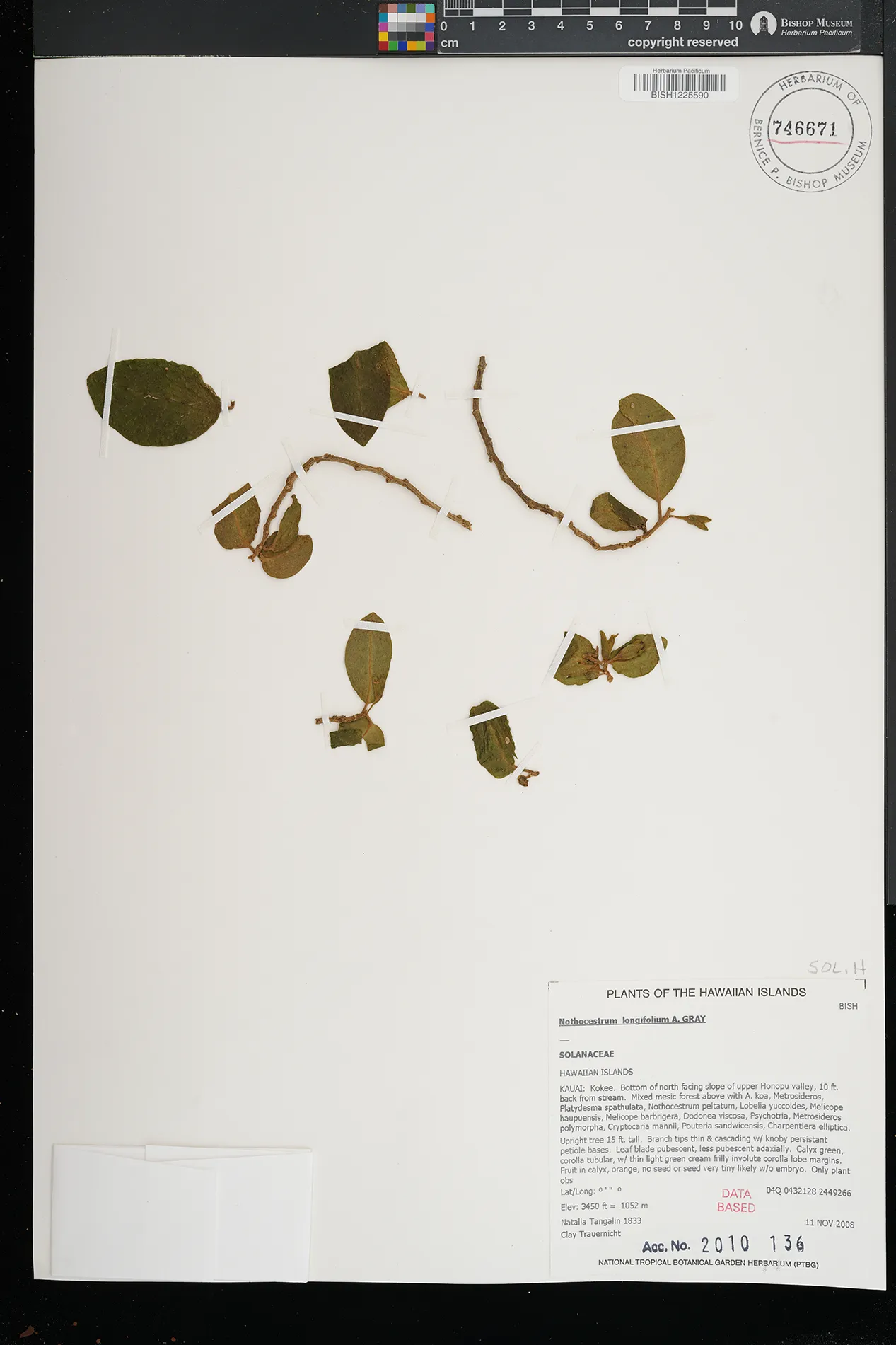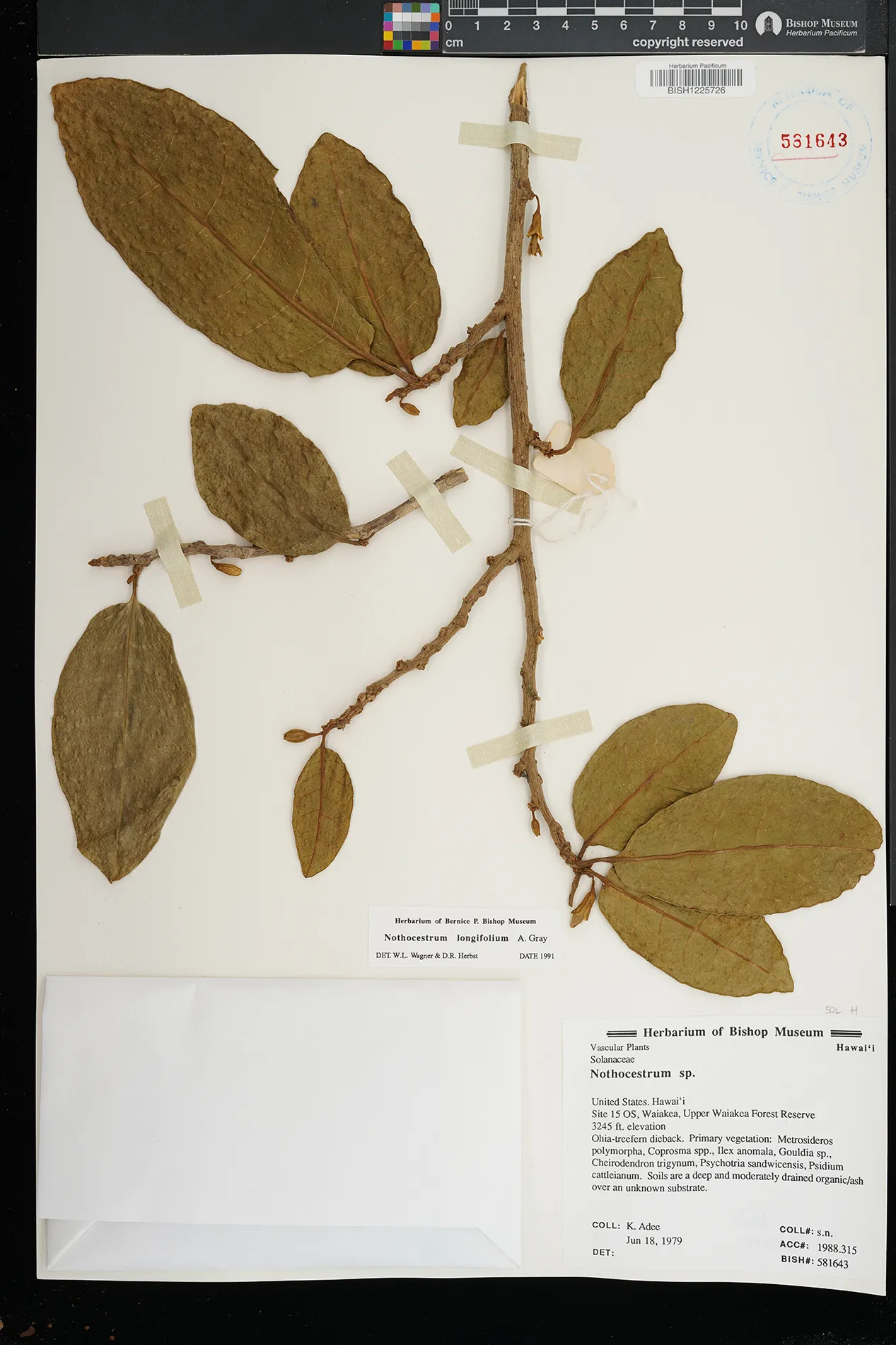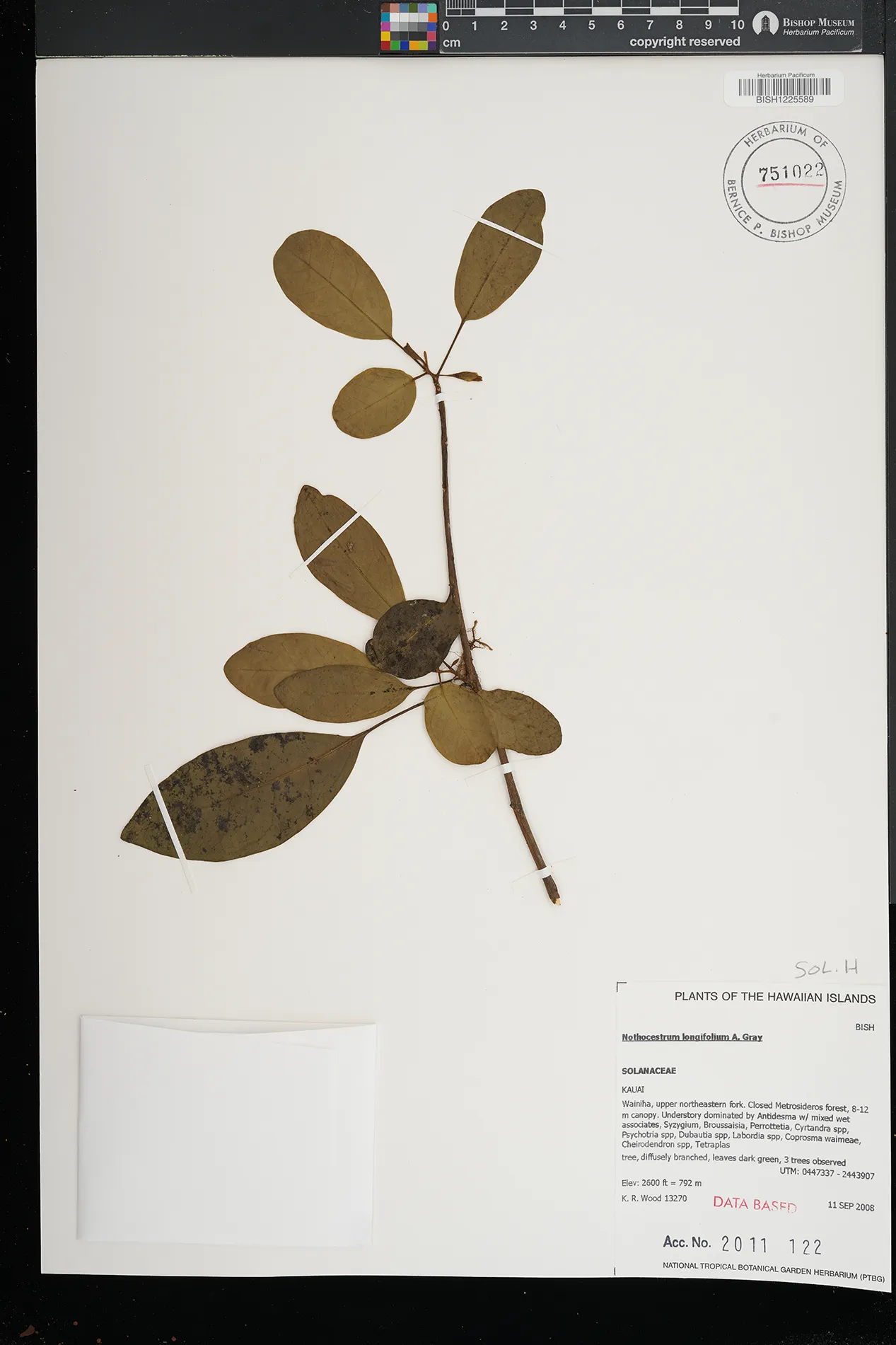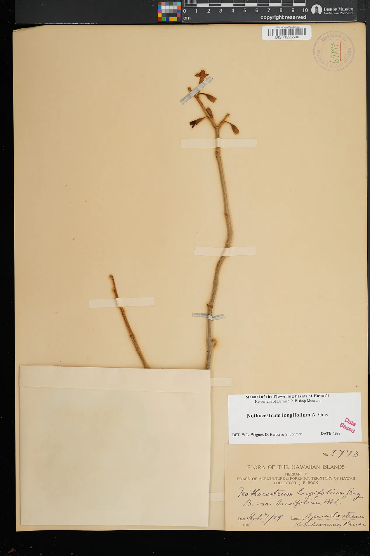near Kumakalii, elev. approx 600 m, tree growing beside Nothocestrum 2834 |