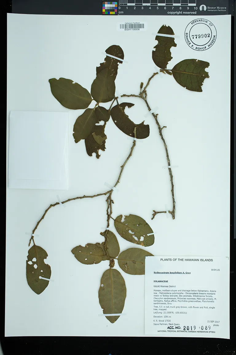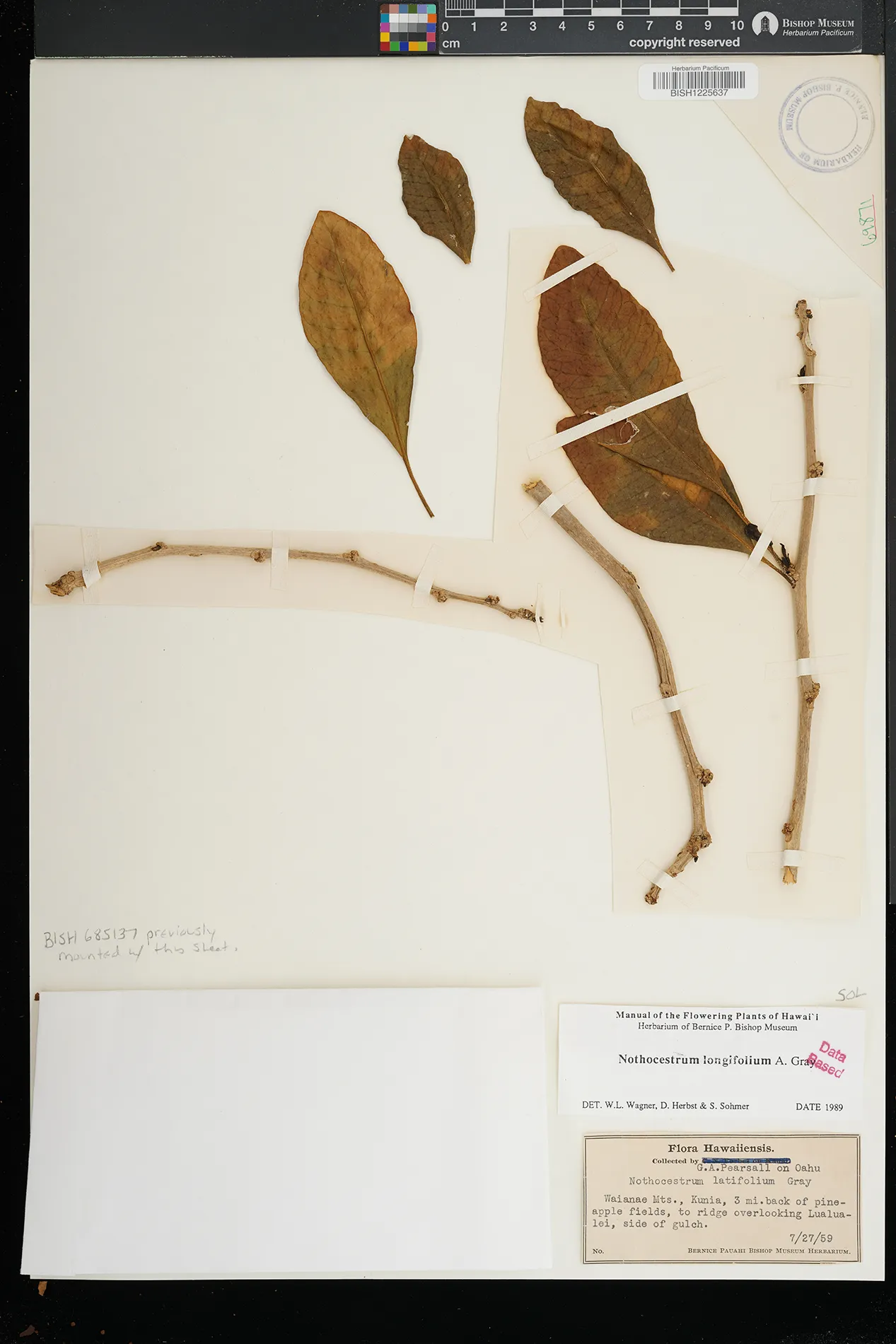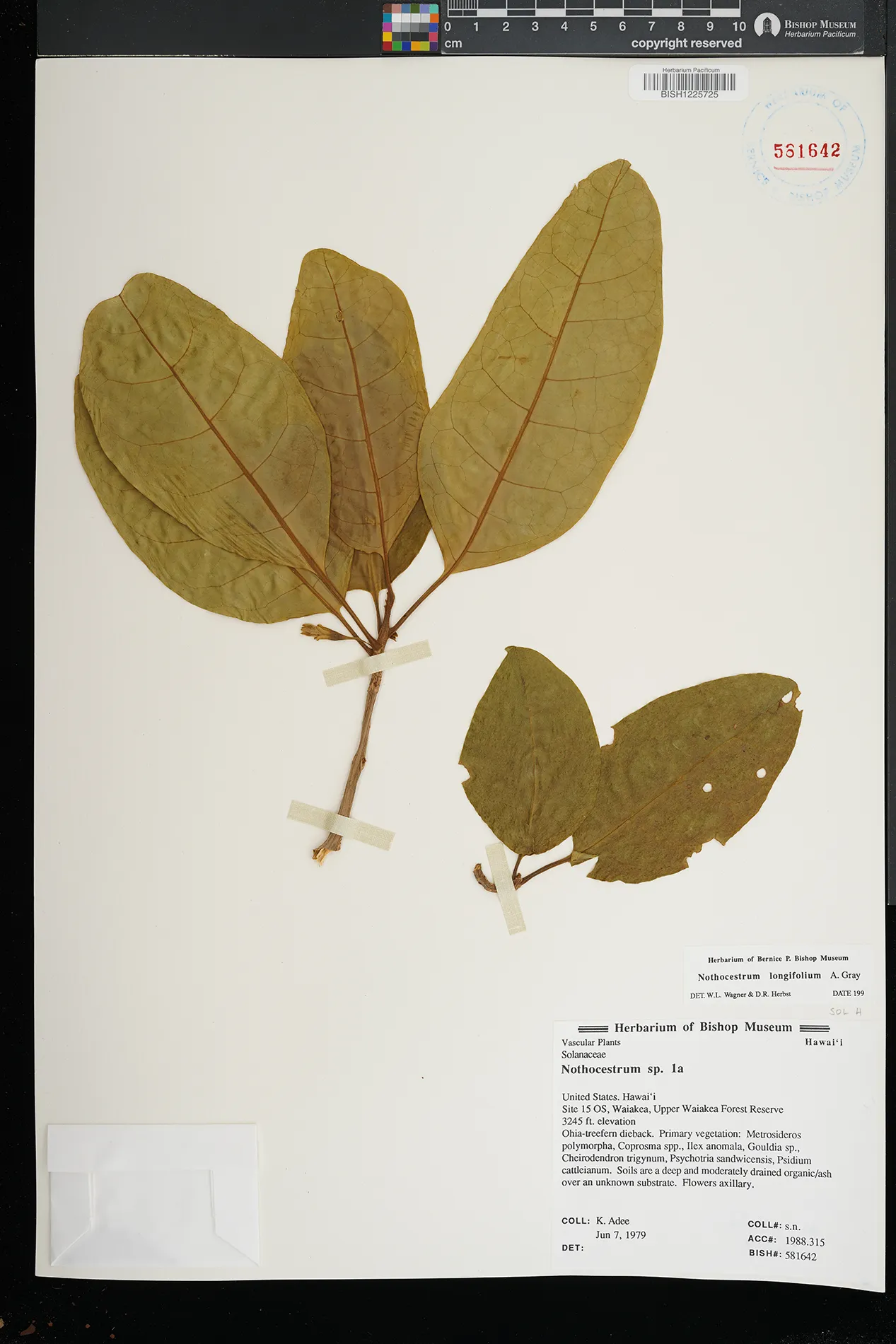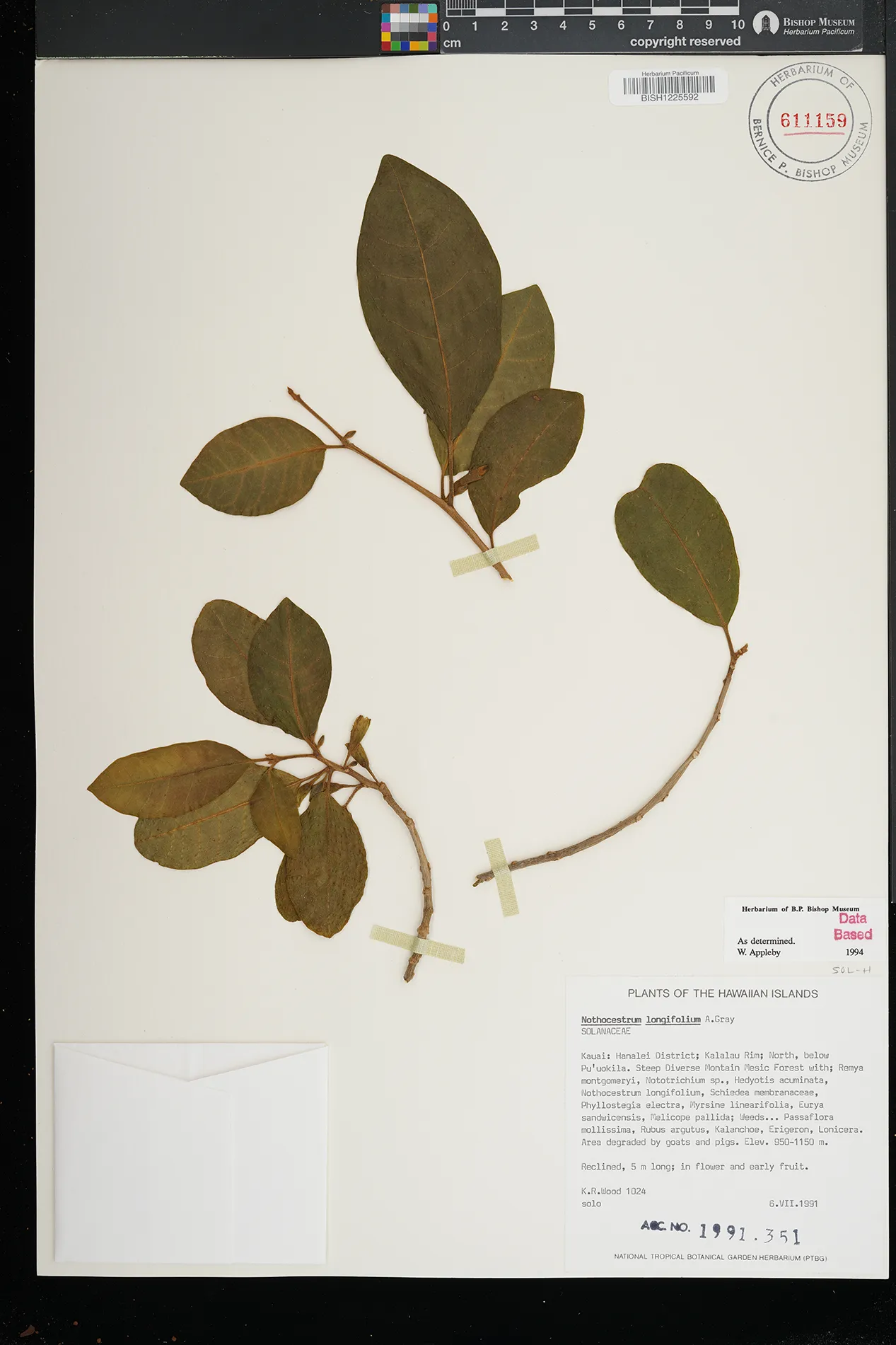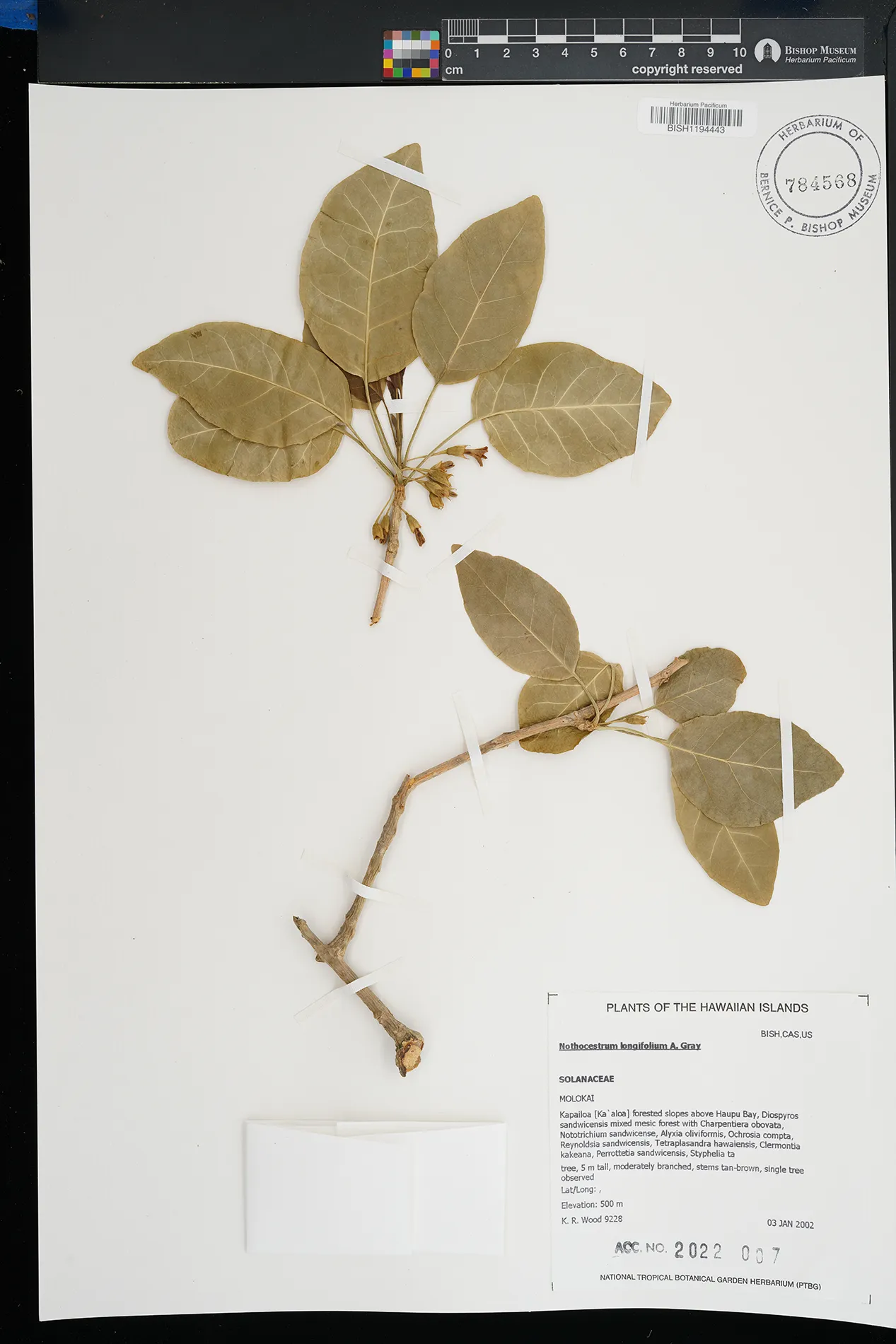near Kumakalii, elev. approx 600 m, tree growing beside Nothocestrum 2834 |