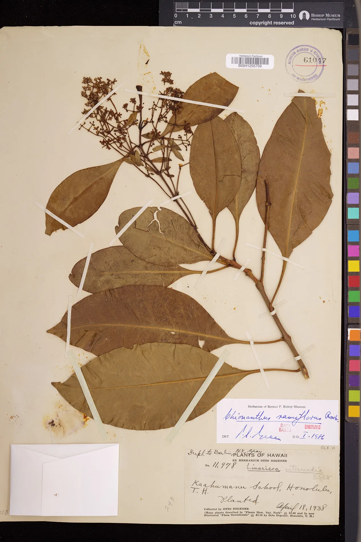 | 9 | Chionanthus ramiflorus | Roxb. | Kaahumanu School, Honolulu | PRESERVED_SPECIMEN | Degener, O. | 11978 | Oahu | BISH | 4/18/1938 | |