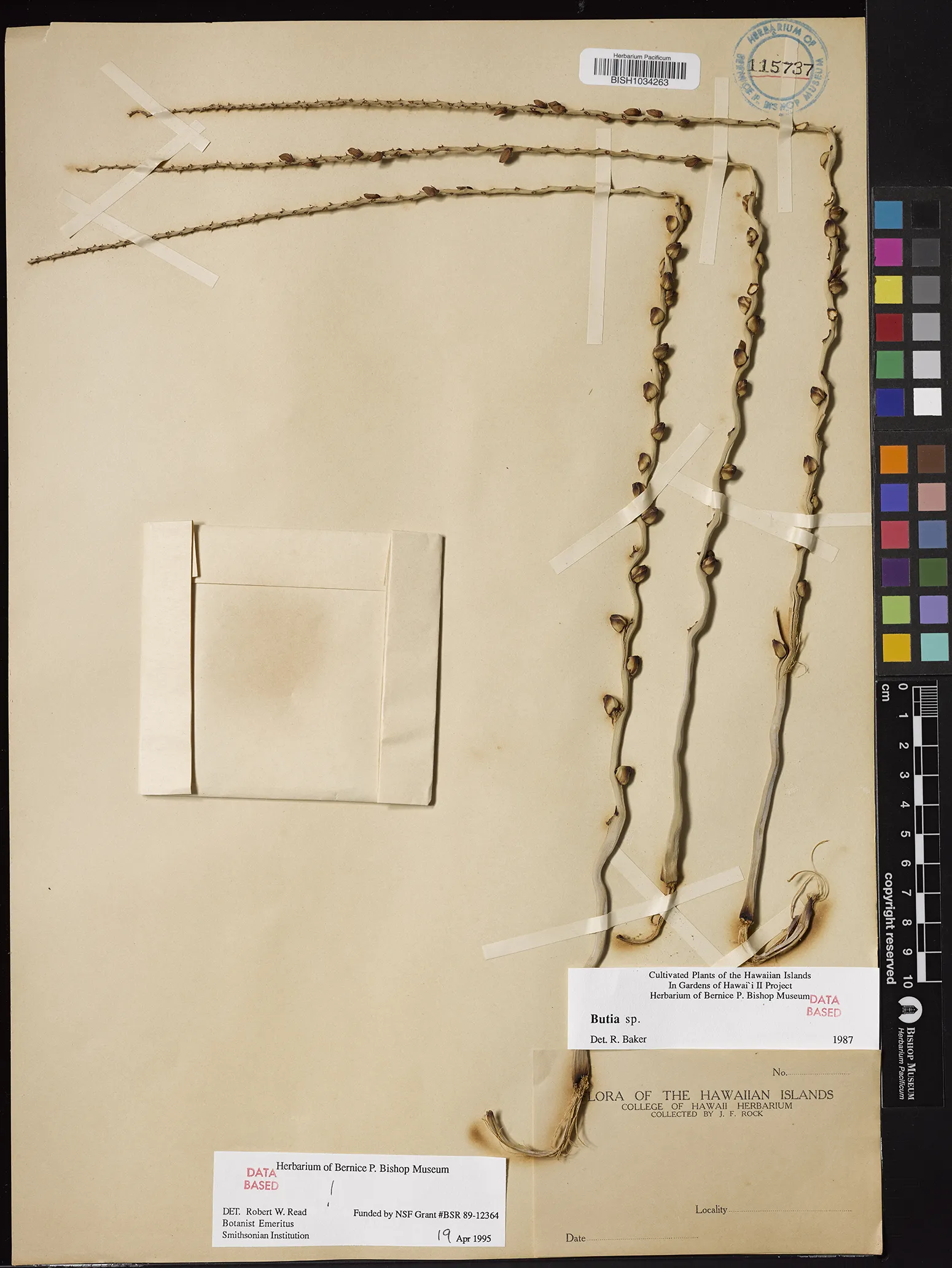 Kingdom: Viridiplantae Phylum: Magnoliophyta Class/Clade: Monocots Order: Arecales Family: Arecaceae Genus: Butia