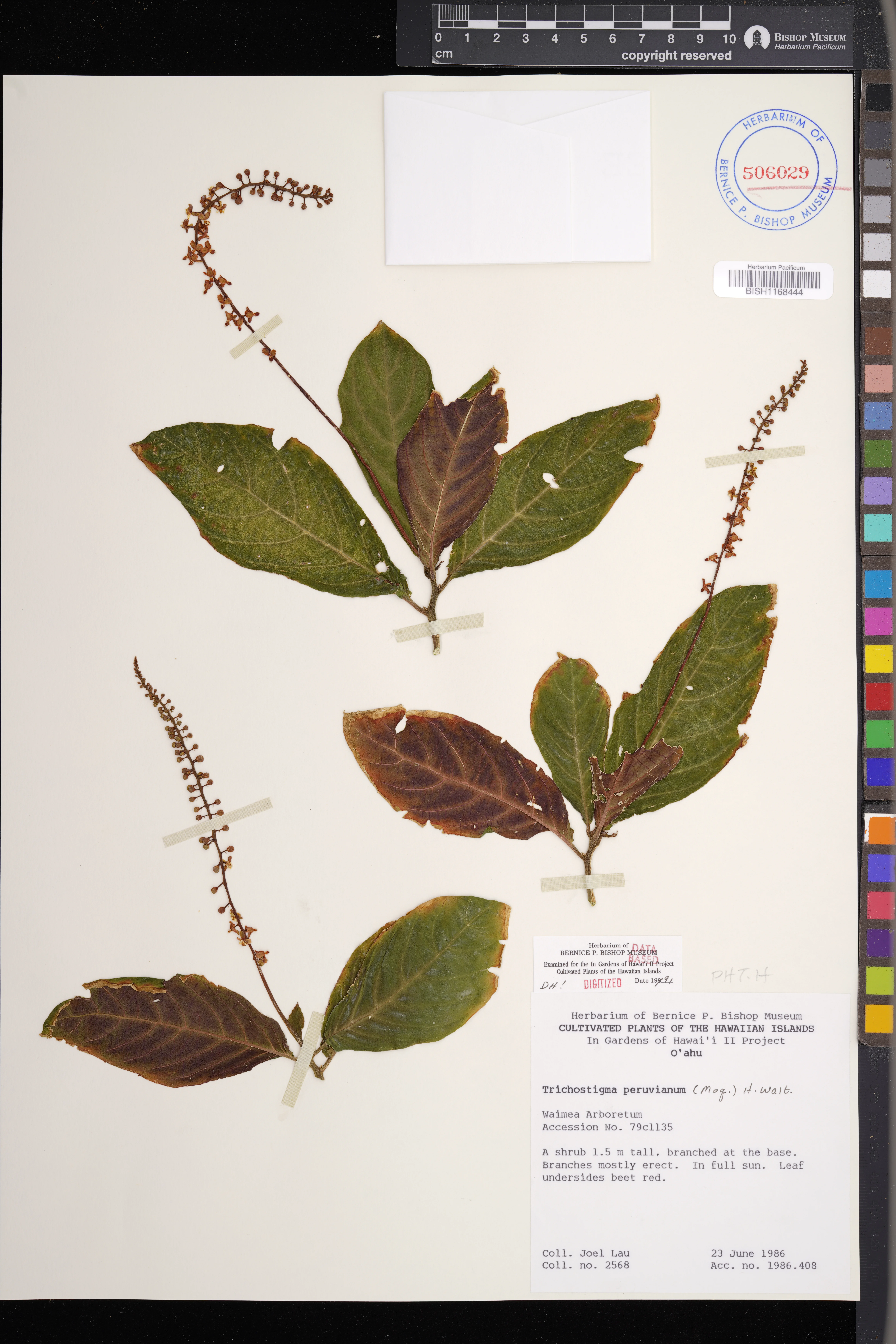 | 2 | Trichostigma peruvianum | (Moq.) H.Walter | Waimea Arboretum | In full sun. | PRESERVED_SPECIMEN | Lau, J. | 2568 | Oahu | BISH | 6/23/1986 |