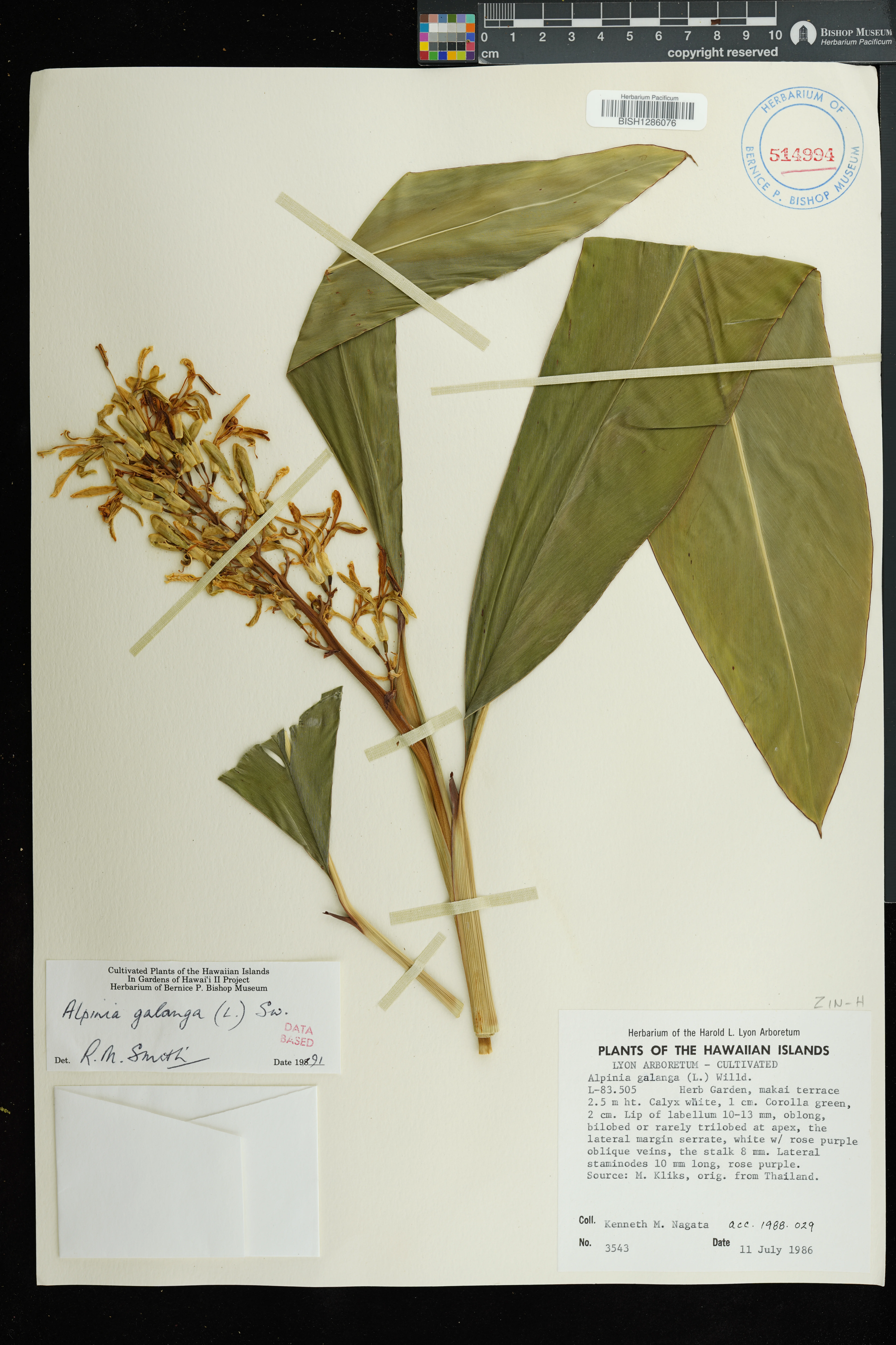 | 7 | Alpinia galanga | (L.) Willd. | manoa; herb garden, makai terrace, lyon arboretum | PRESERVED_SPECIMEN | nagata, k.m. | collector number: 3543 | Oahu | BISH | 7/11/1986 | |
