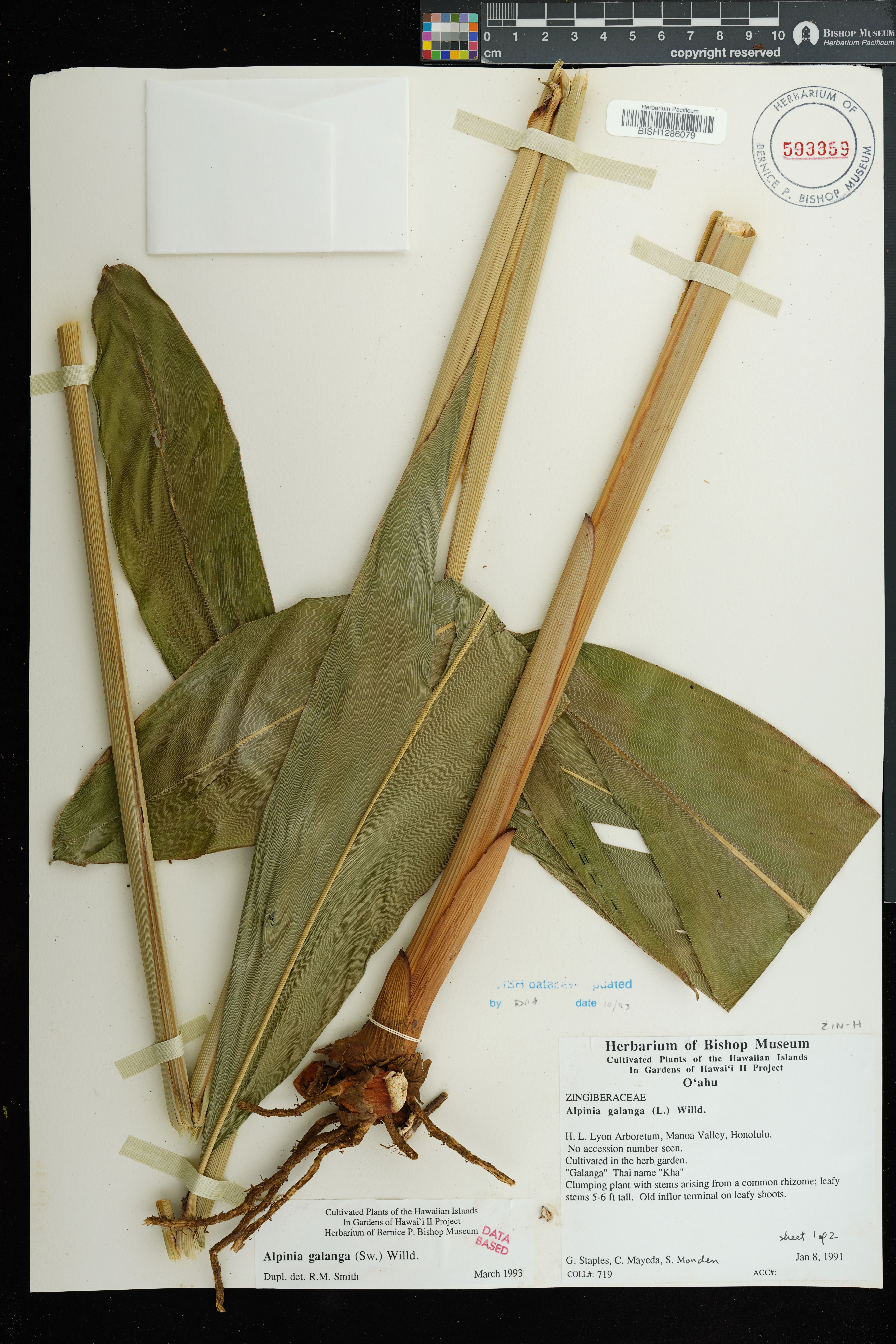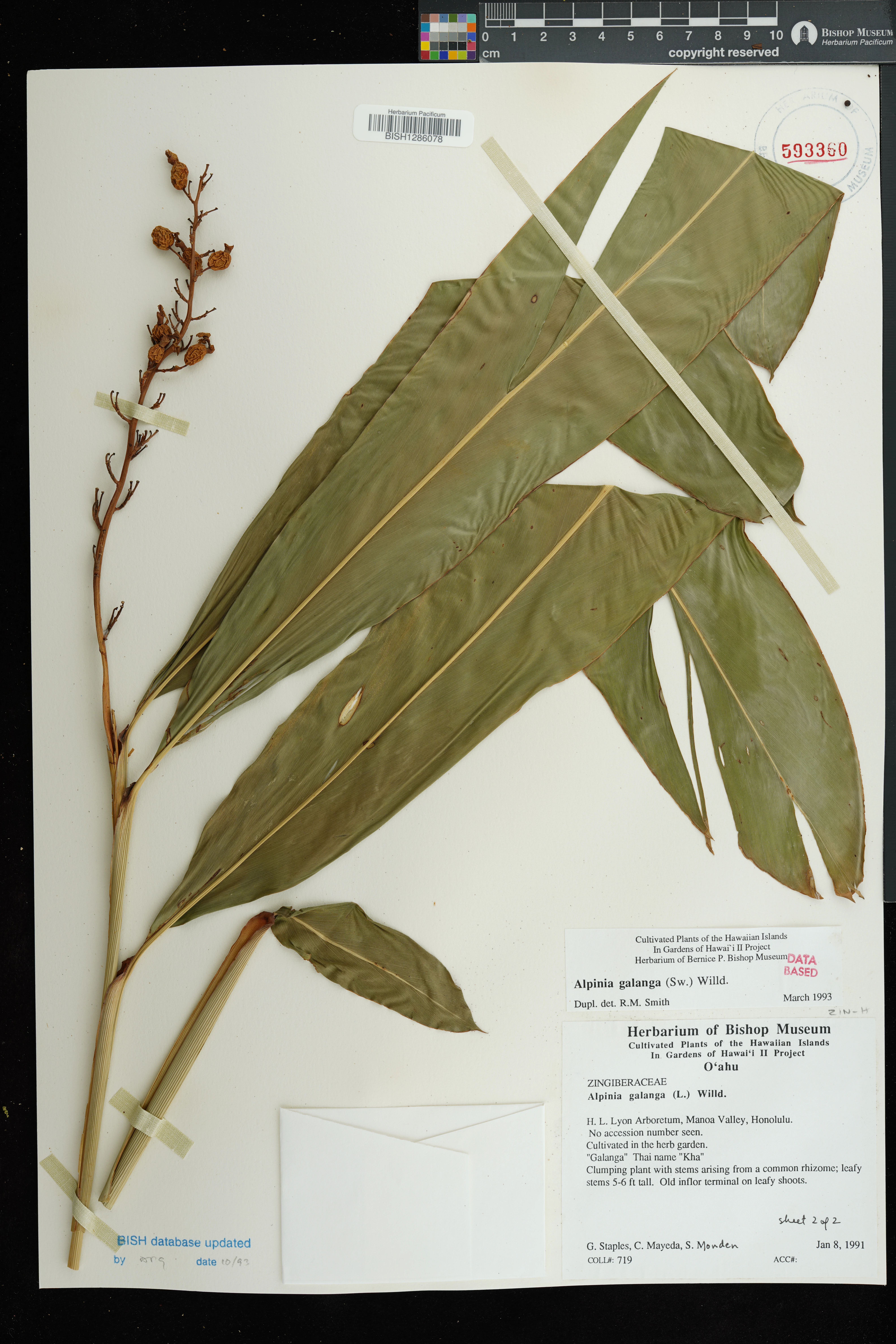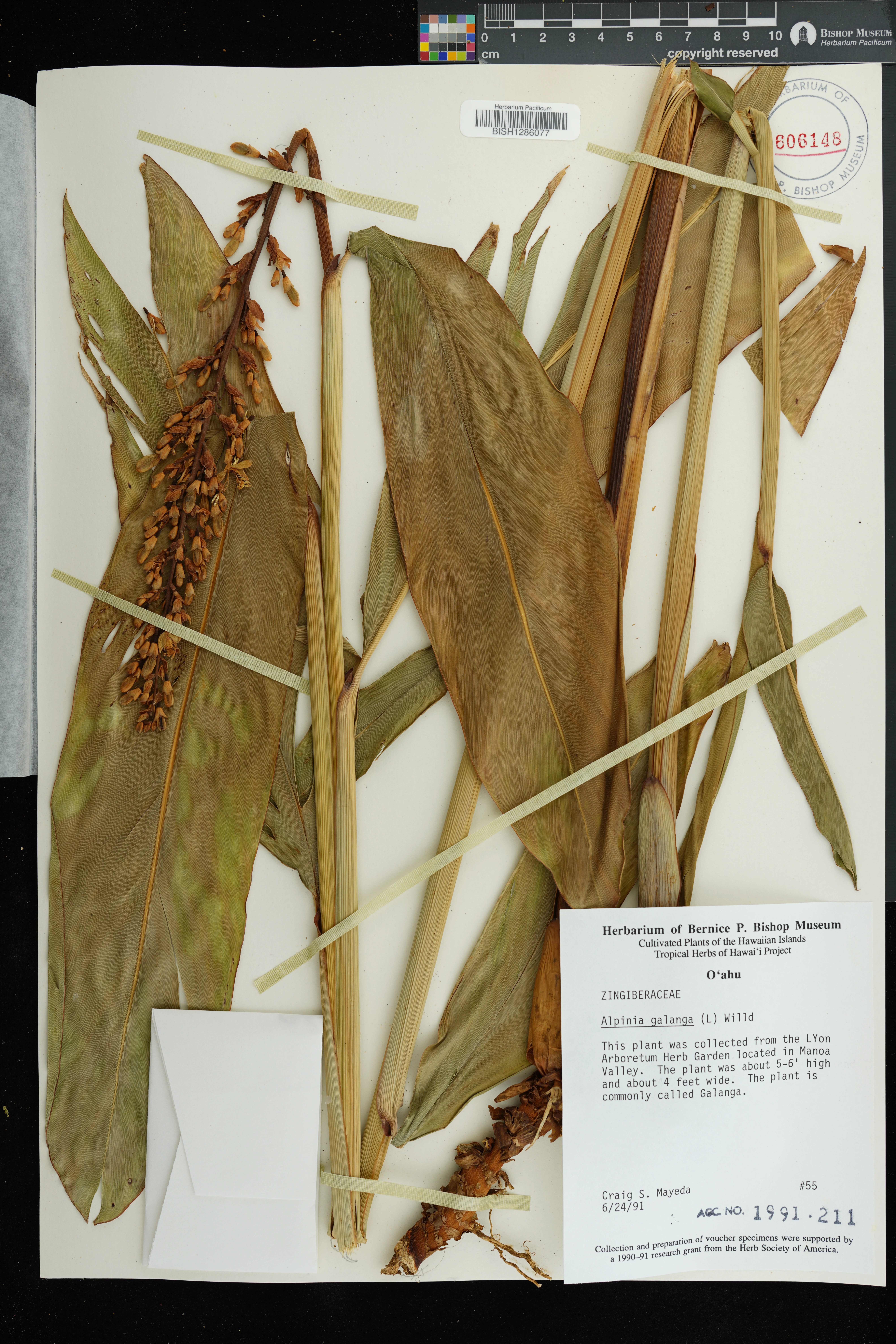 | 11 | Alpinia galanga | (L.) Willd. | honolulu: manoa valley; lyon arboretum | Cultivated in herb garden. | PRESERVED_SPECIMEN | staples, g.w. mayeda, c.; s monden | collector number: 719 | Oahu | BISH | 1/8/1991 |