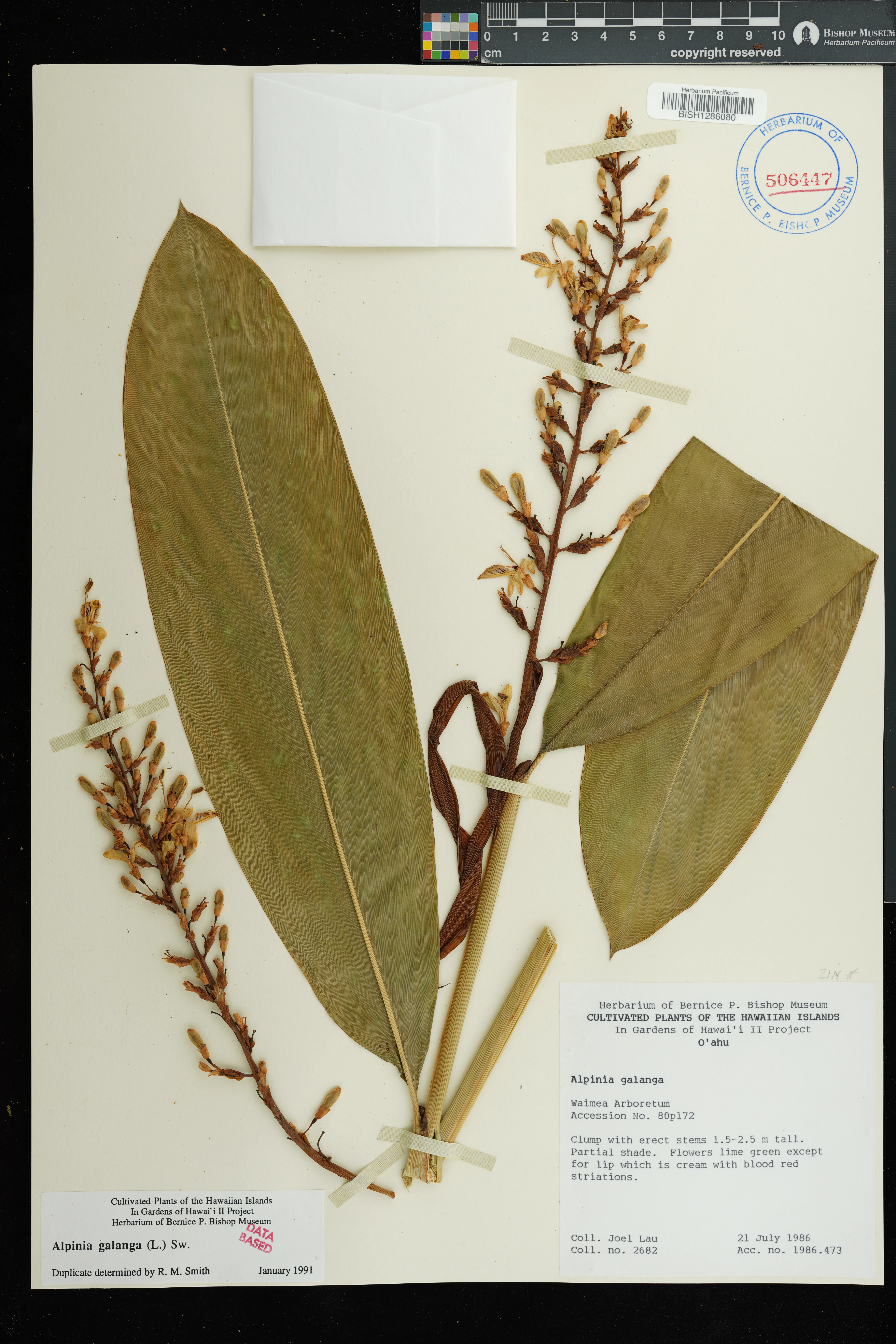 | 15 | Alpinia galanga | (L.) Willd. | Haleiwa; Waimea Arboretum | Growing in partial shade. | PRESERVED_SPECIMEN | Lau, J. | 2682 | Oahu | BISH | 7/21/1986 |