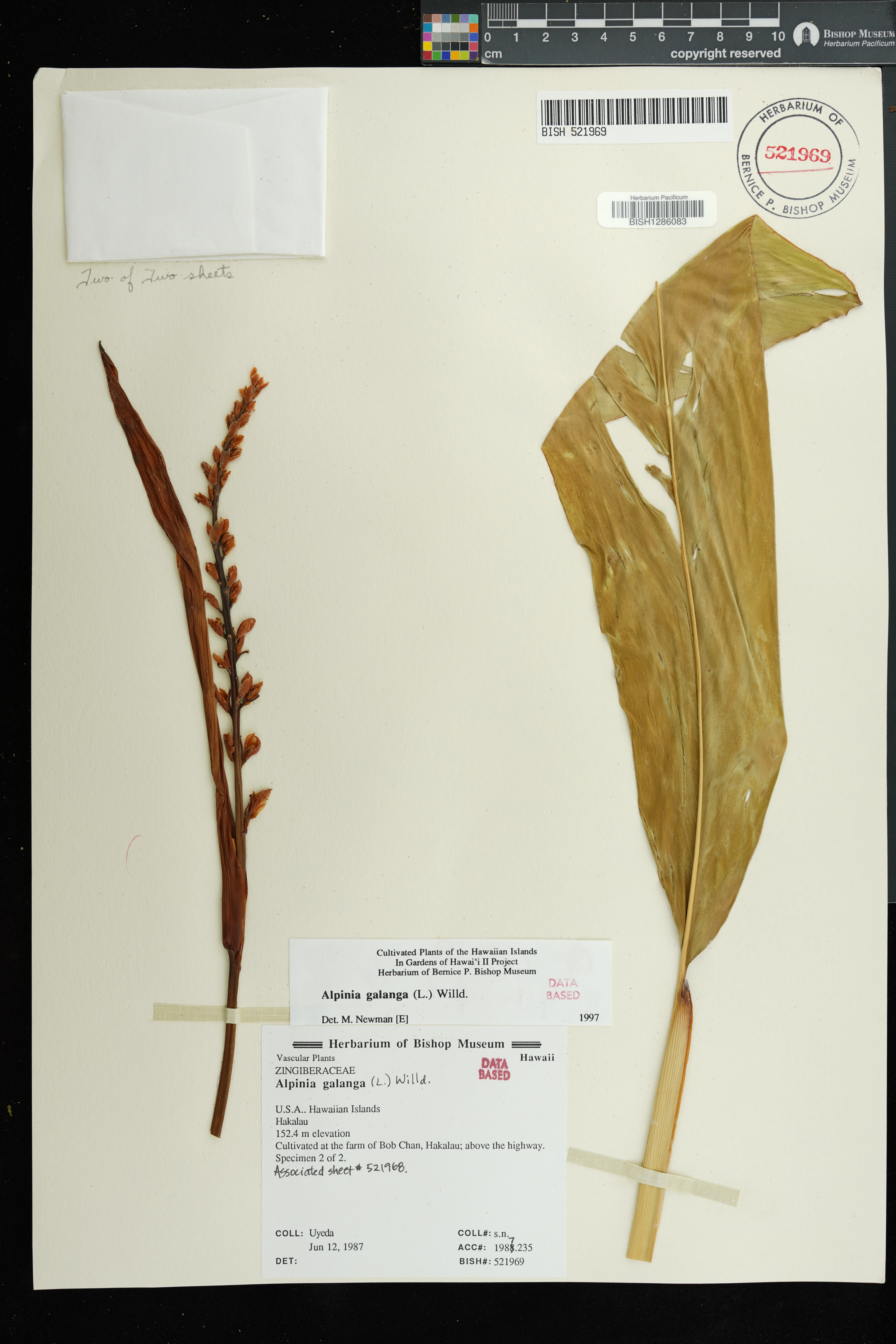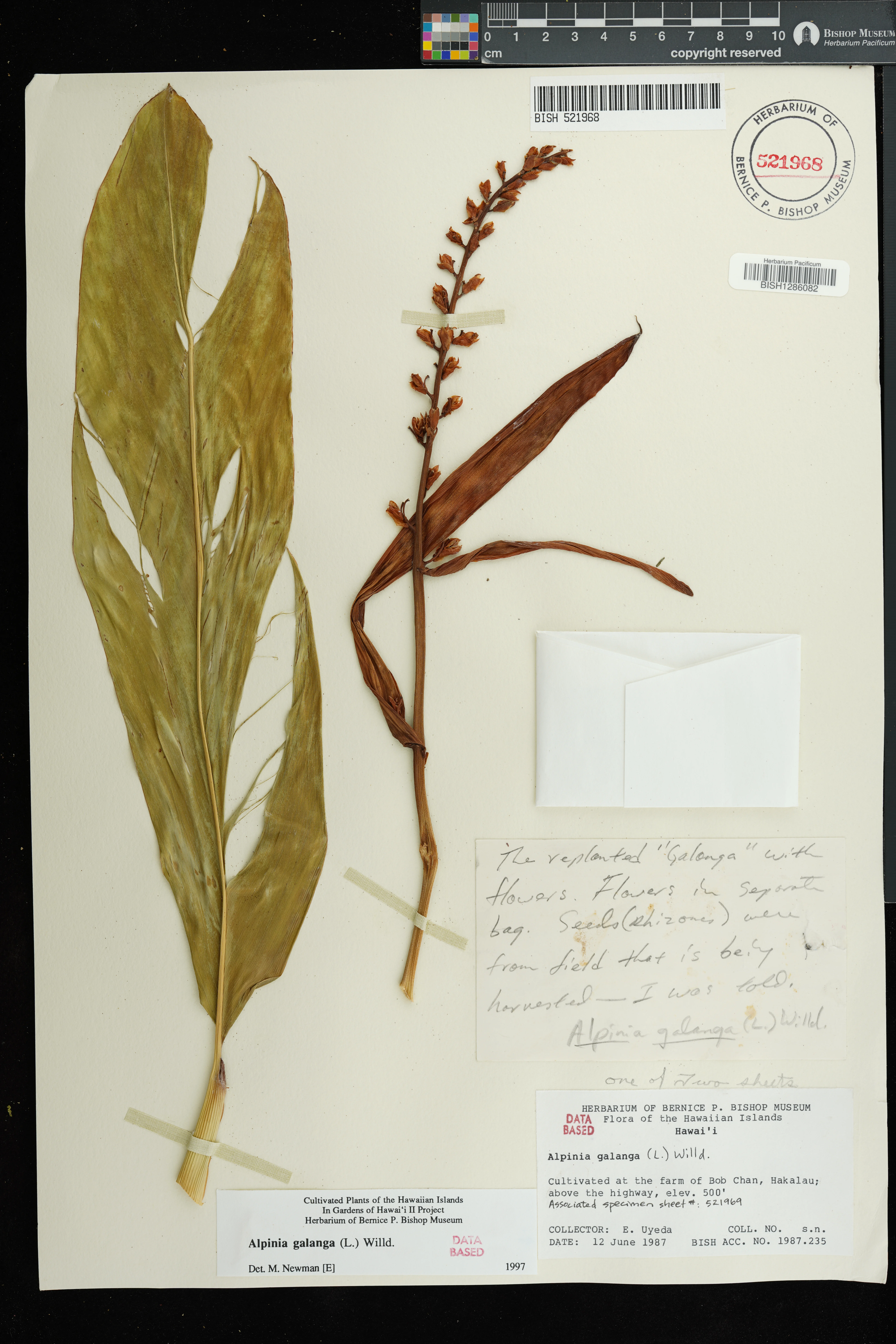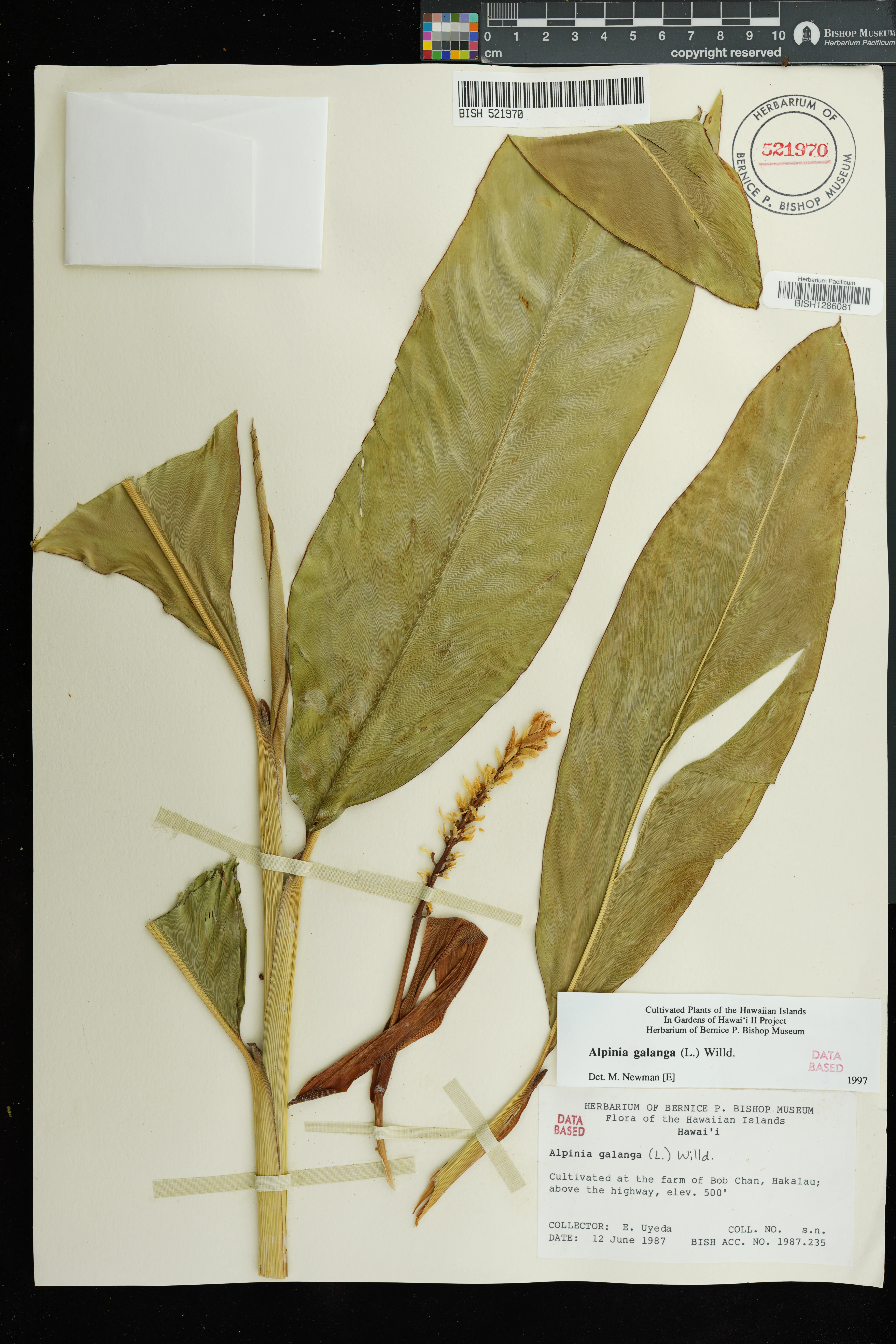| 5 | Alpinia galanga | (L.) Willd. | Hakalau; farm of Bob Chan, above the highway | PRESERVED_SPECIMEN | Uyeda, E. | s.n. | Hawaii | BISH | 6/12/1987 | |