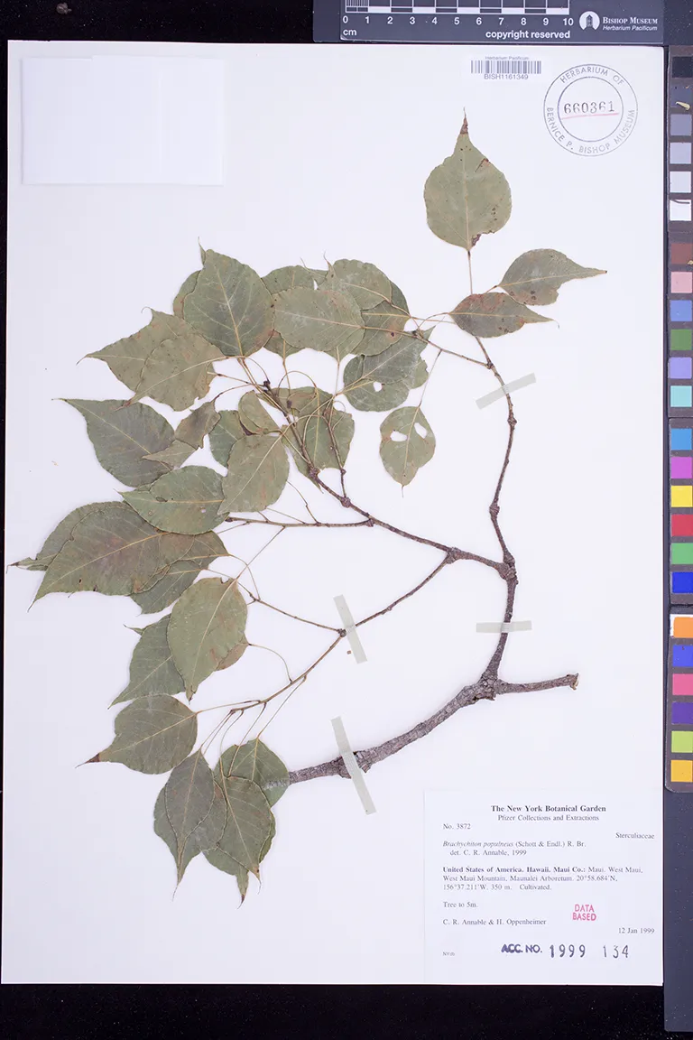 | 4 | Brachychiton populneus | (Schott & Endl.) R.Br. | Maui. West Maui, West Maui Mountain, Maunalei Arboretum | Cultivated | PRESERVED_SPECIMEN | C. R. Annable | 3872 | NY | 1/12/1999 | |