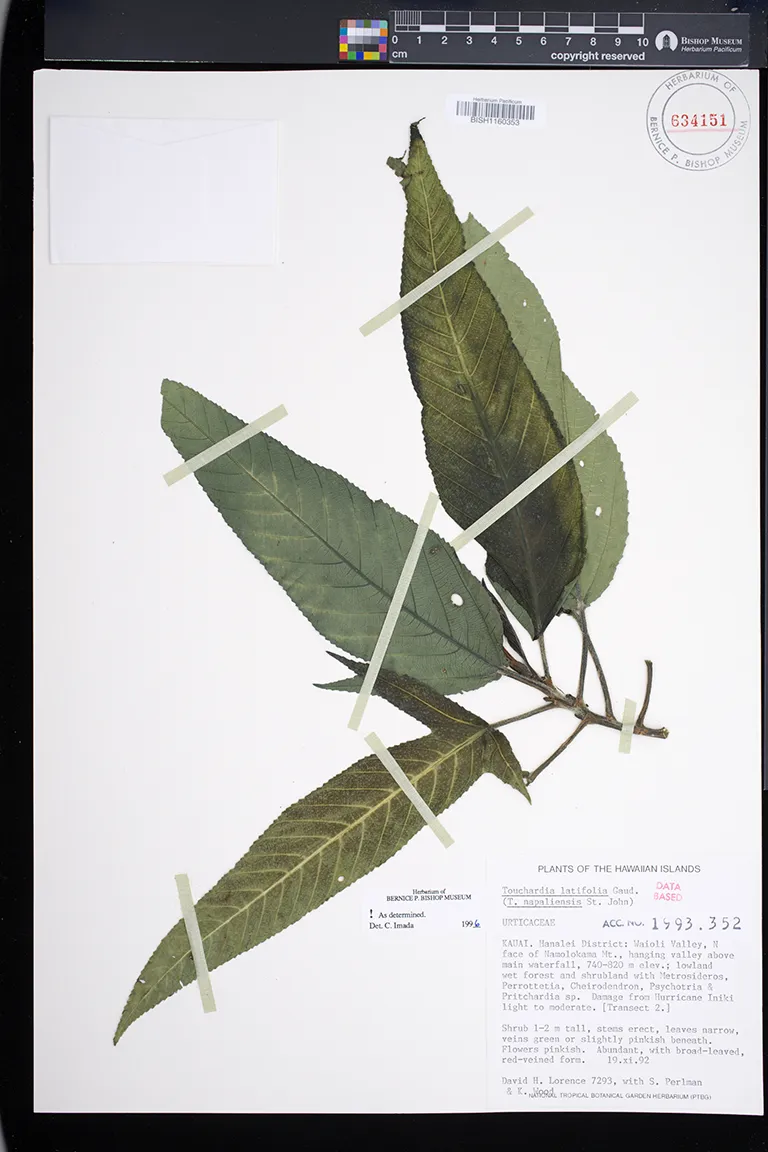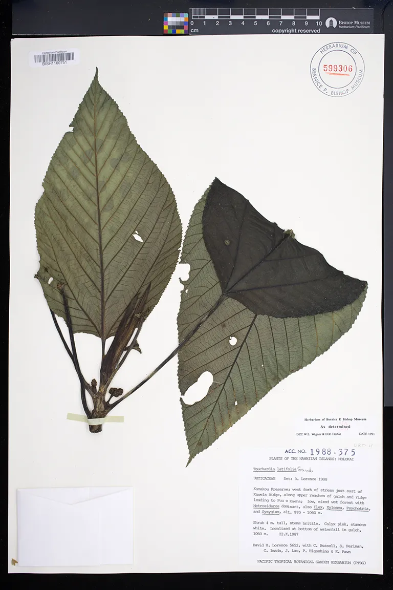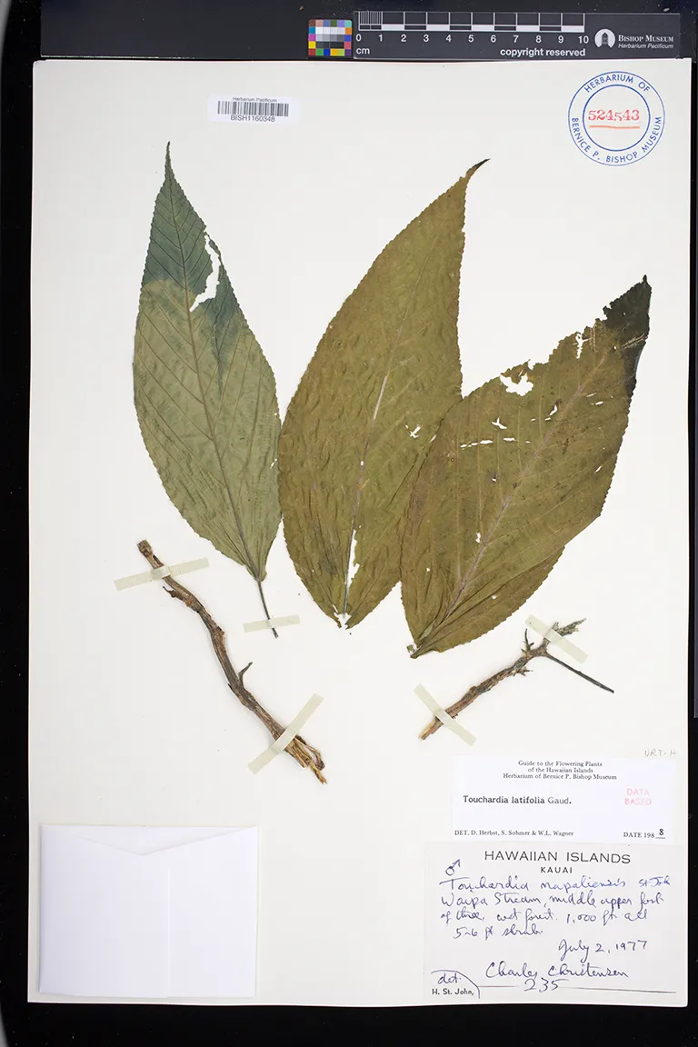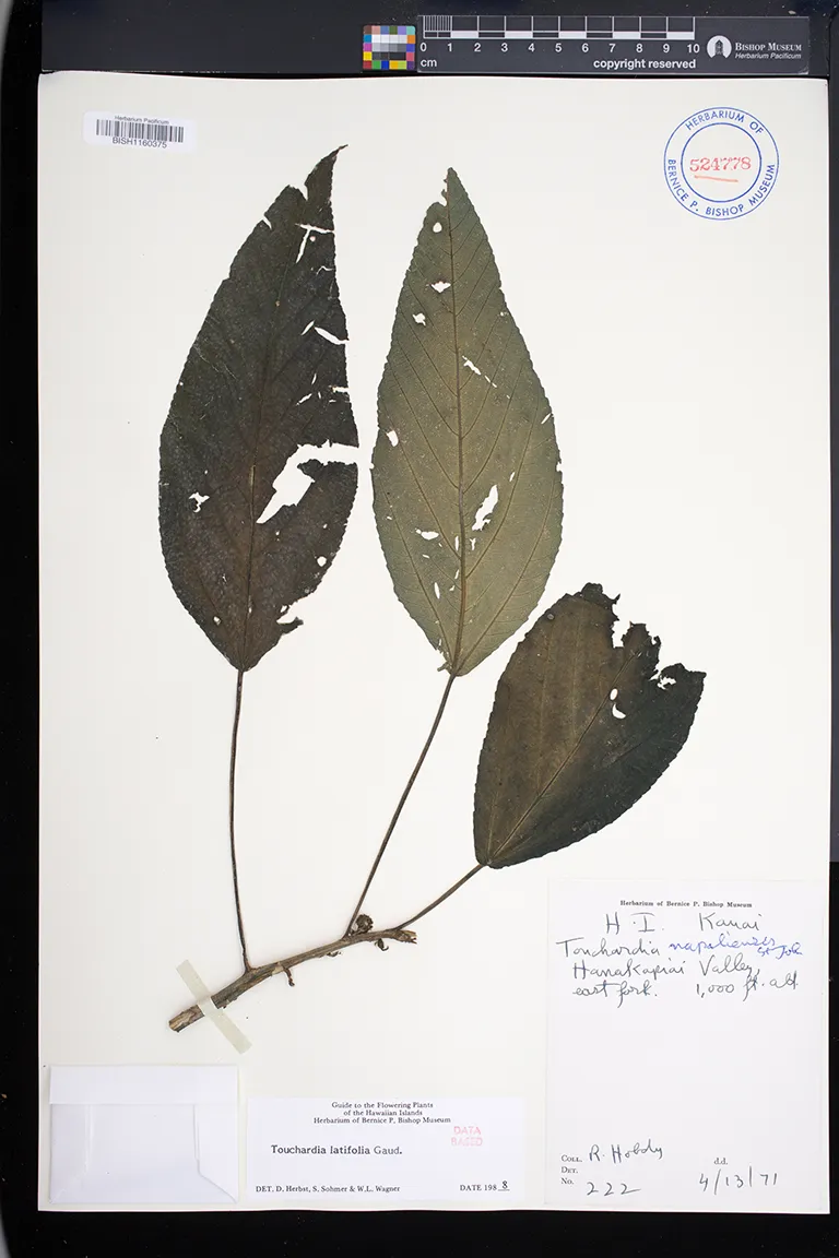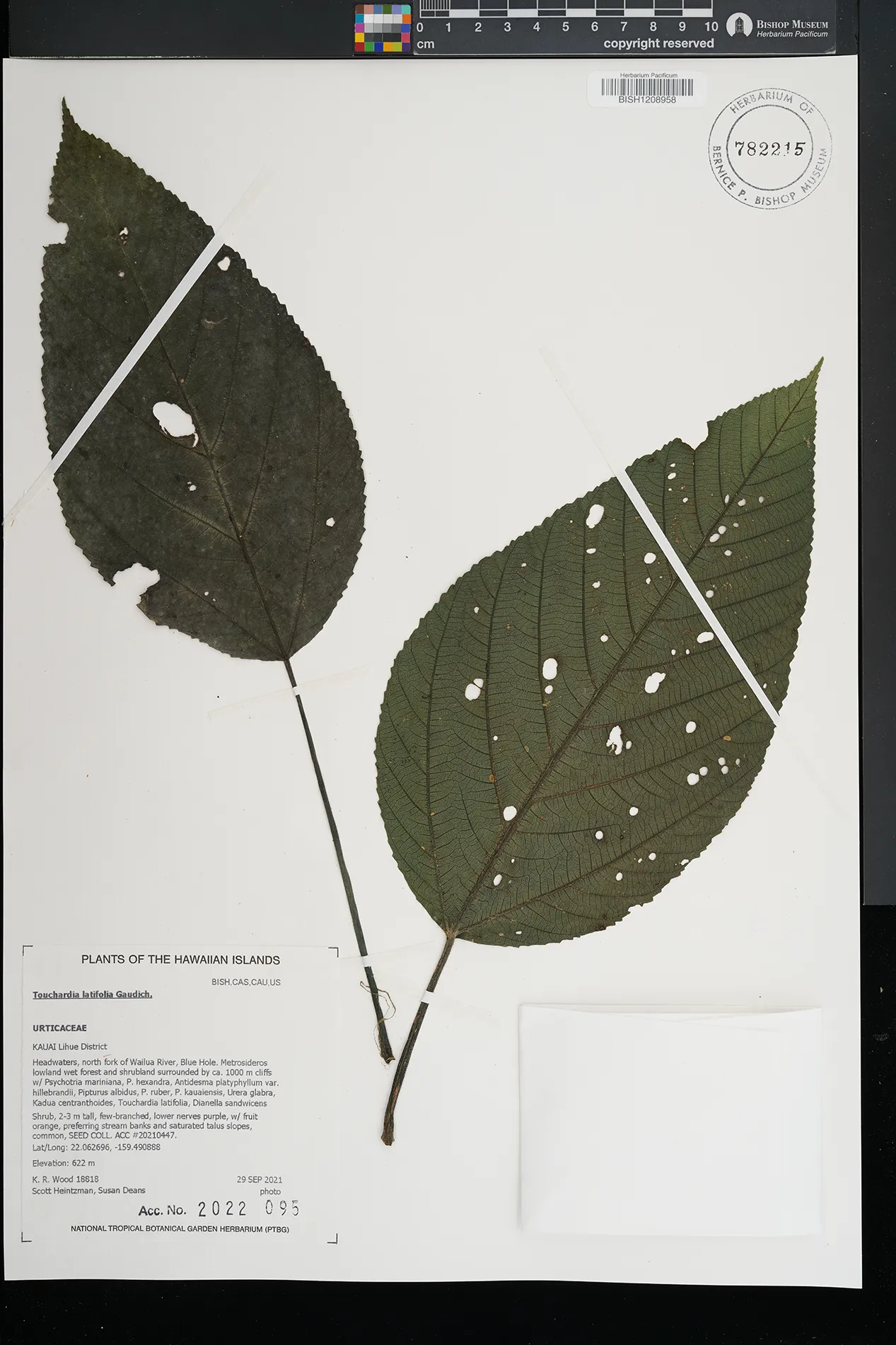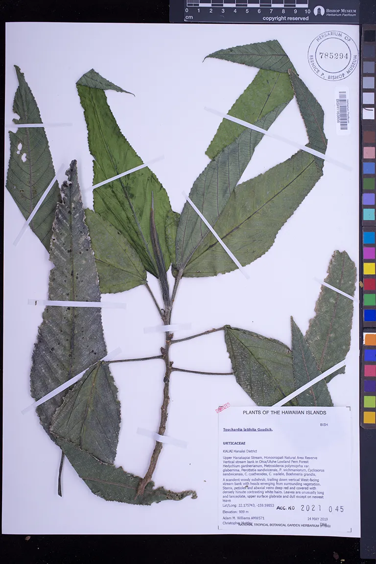 Streamside along bank with Aleurites overstory, Pisonia, Charpentiera, Pipturus, Clidemia, Cordyline & Zingiber. |