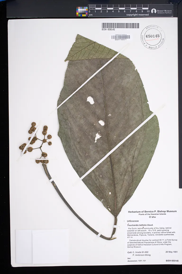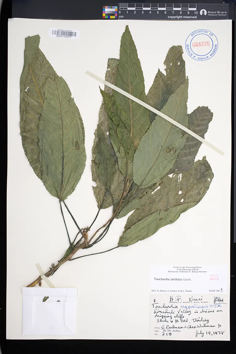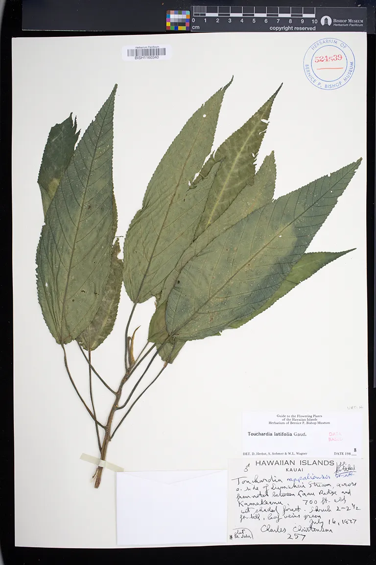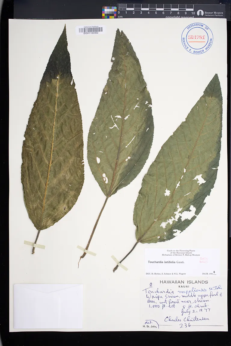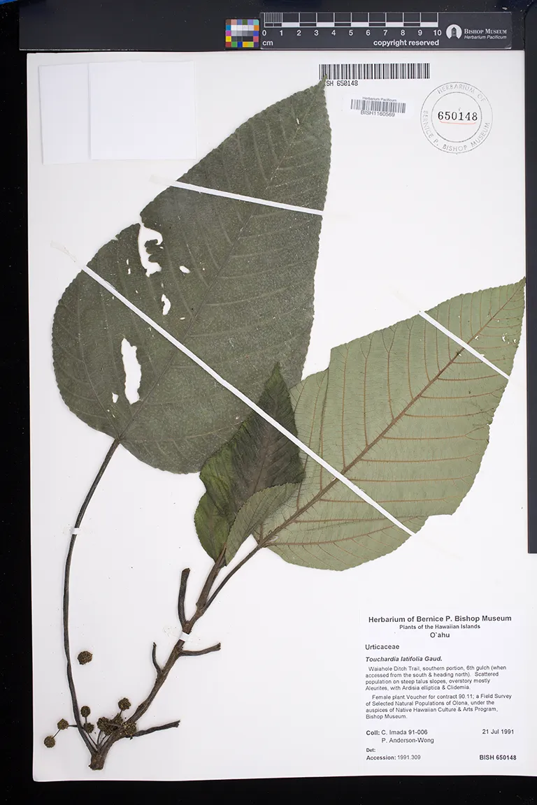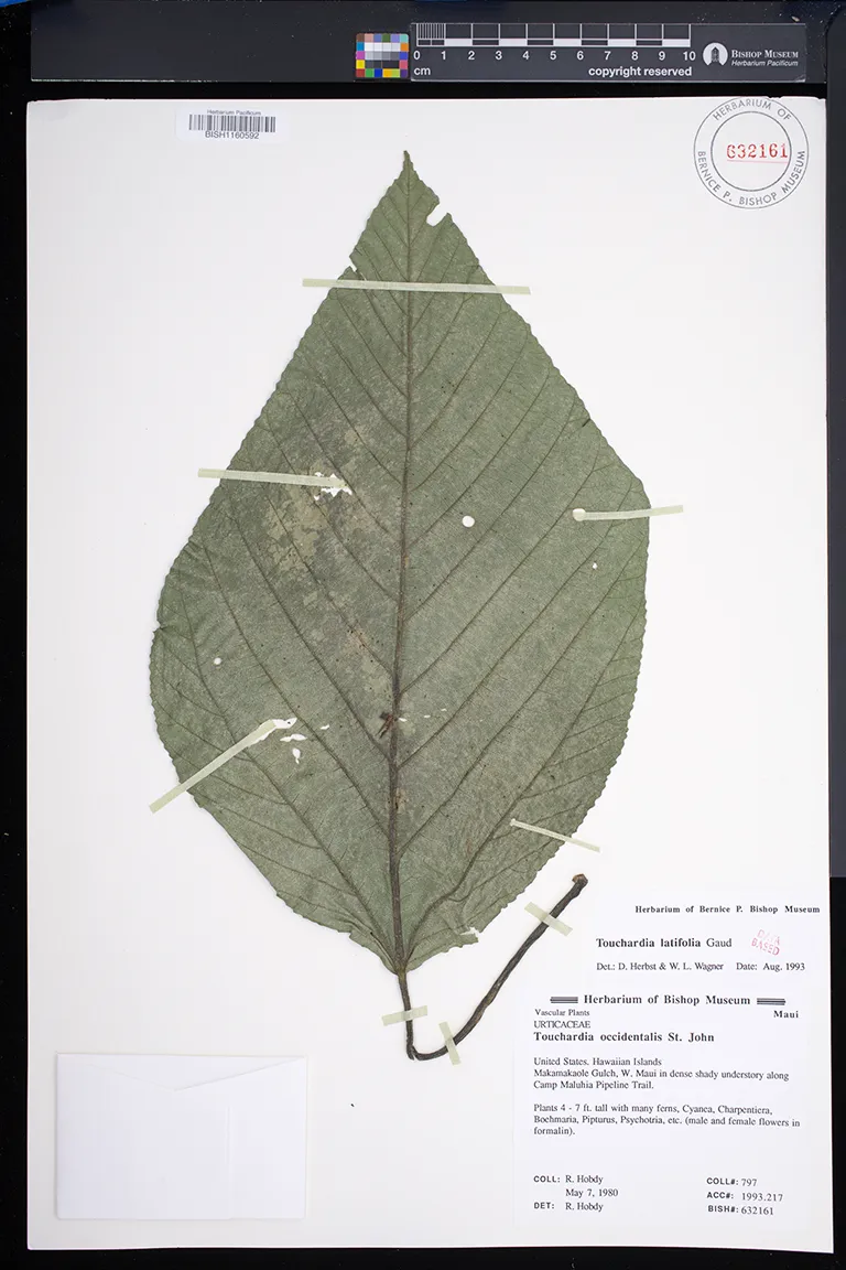 Streamside along bank with Aleurites overstory, Pisonia, Charpentiera, Pipturus, Clidemia, Cordyline & Zingiber. |