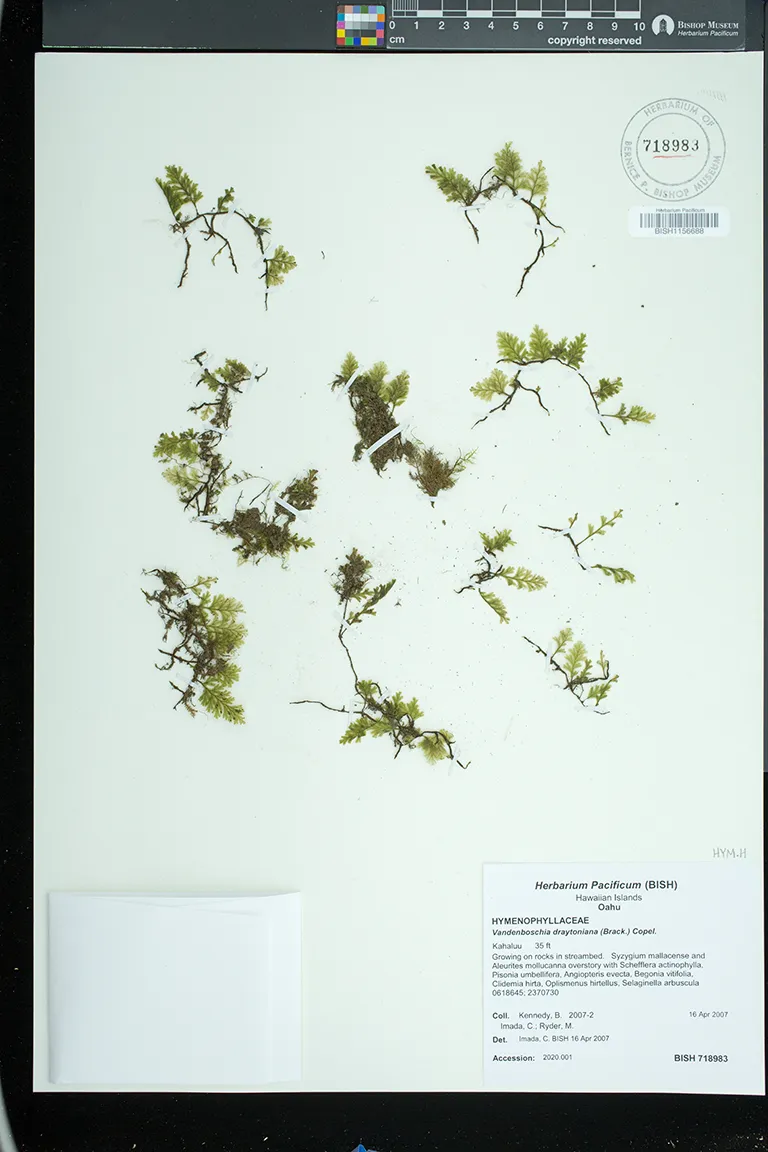 Palmer 2003:253 (K, O, Mo, L, M, H [as Vandenboschia draytoniana]); Ebihara et al. 2006:238/Snow et al. 2011:13 (COMBNOV, Syn. V. draytoniana = C. draytonianum); Faccenda, Arthur, et al. 2025:187 (remove L [no evidence of presence])