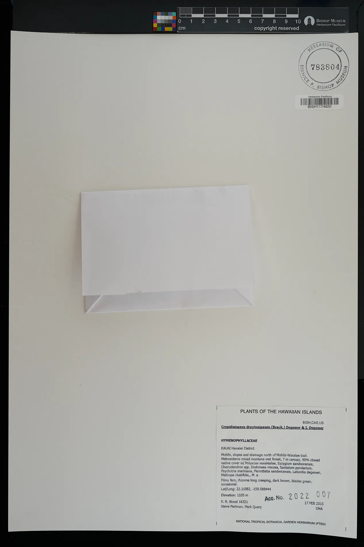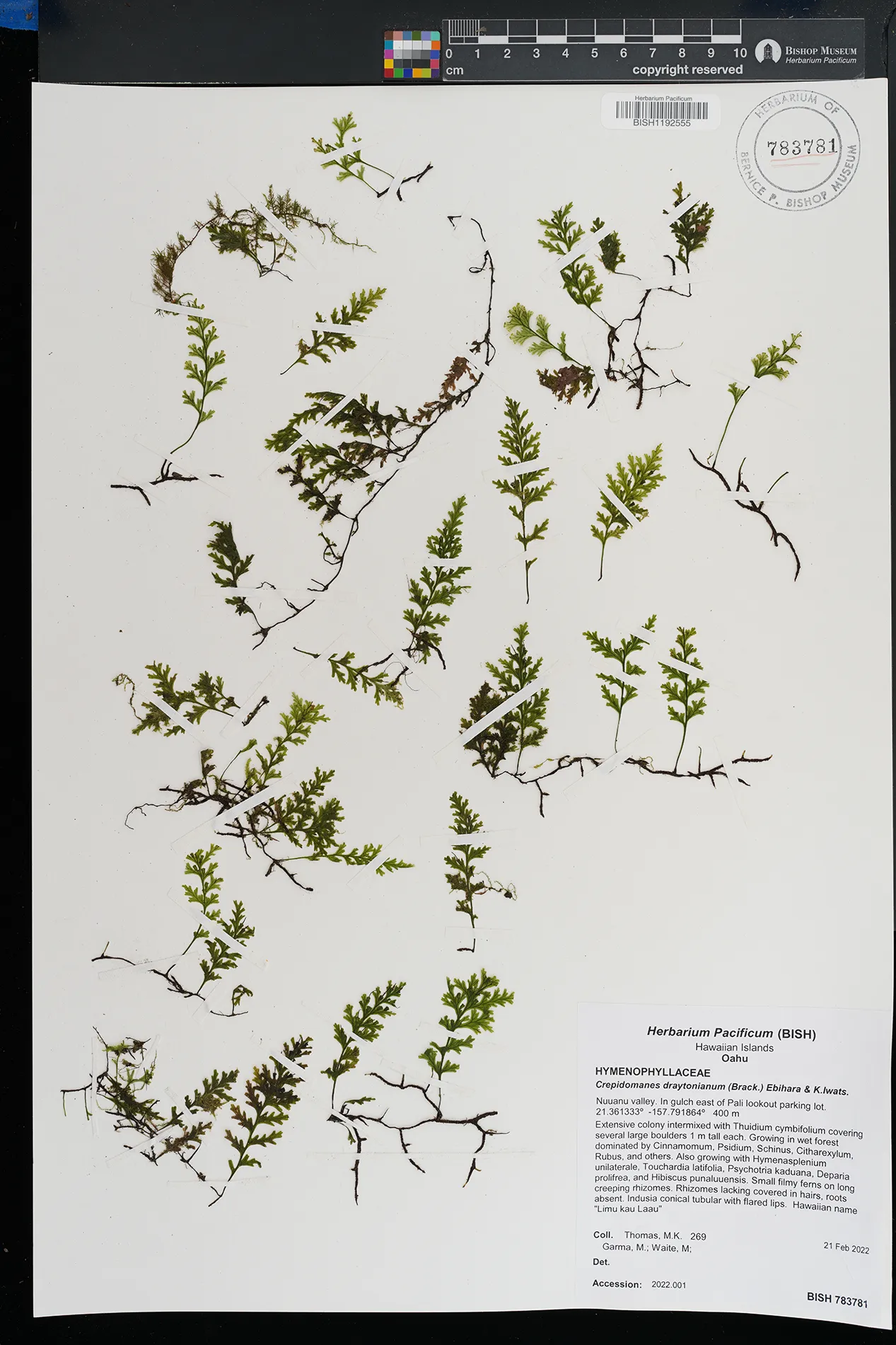 Kingdom: Viridiplantae Phylum: Pteridophyta Class/Clade: Polypodiopsida Order: Hymenophyllales Family: Hymenophyllaceae Genus: Crepidomanes
