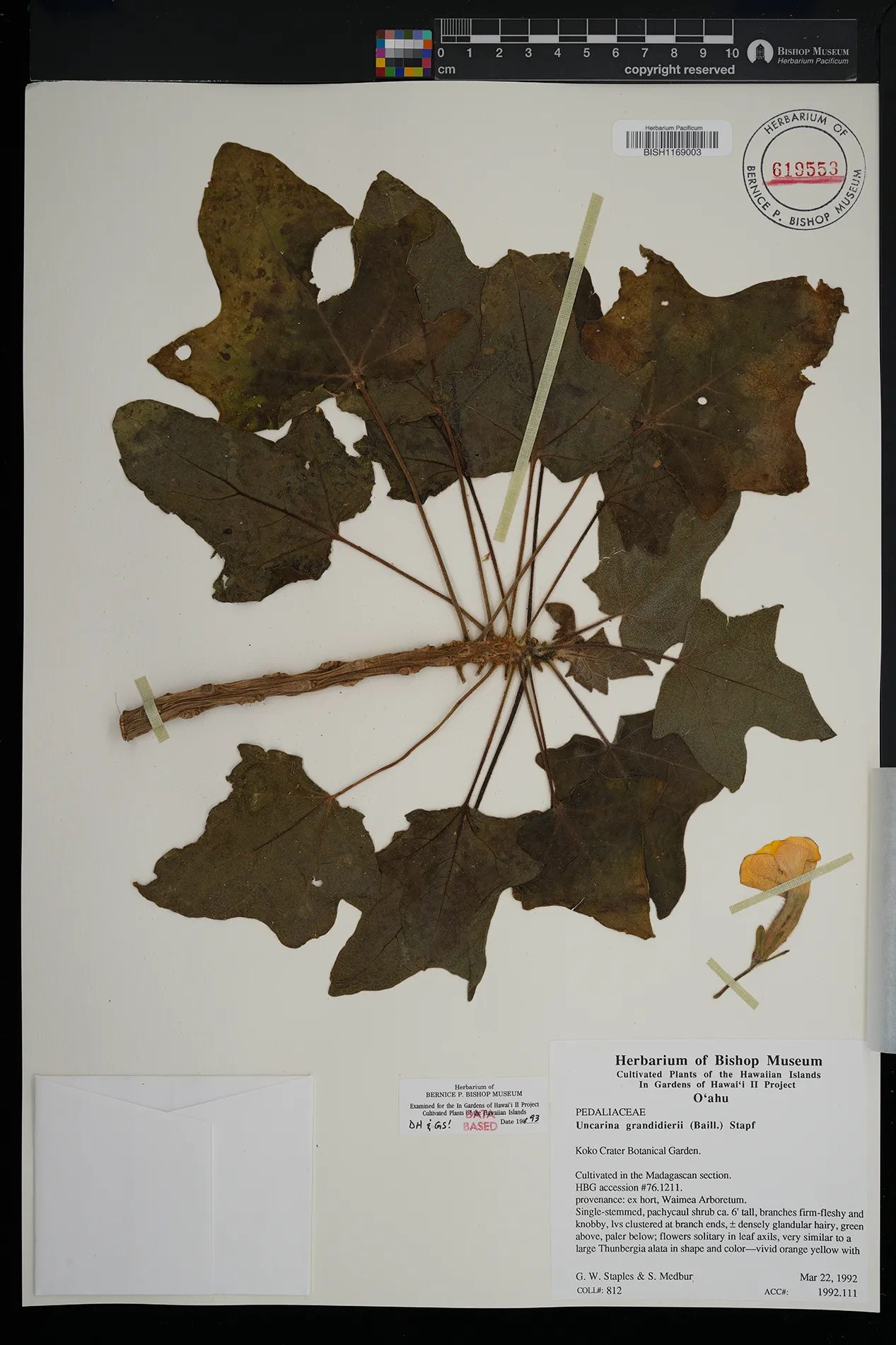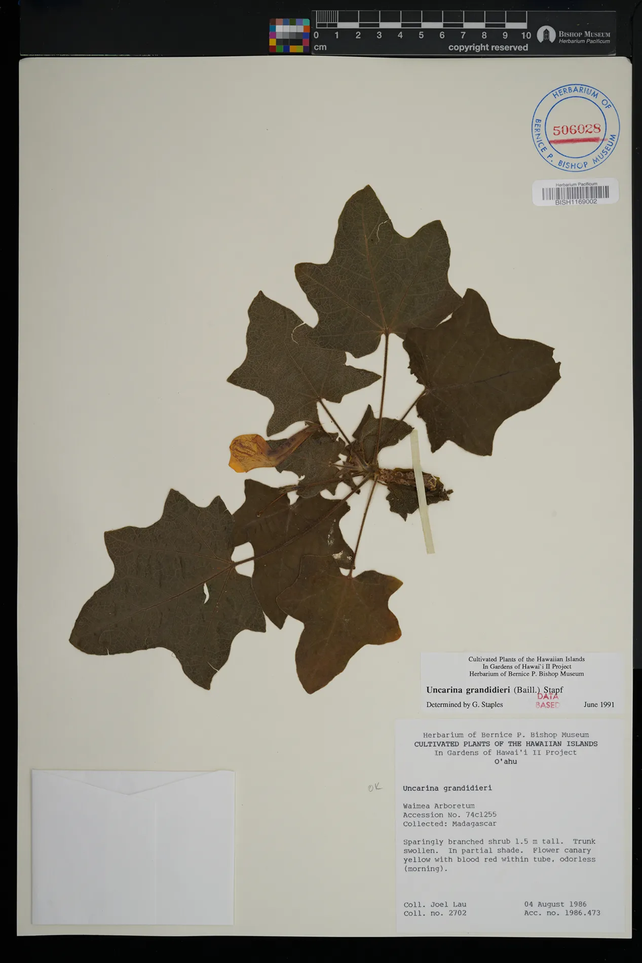 | 2 | Uncarina grandidieri | (Baill.) Stapf | Koko Crater Botanical Garden; cultivated in the Madagascan section | PRESERVED_SPECIMEN | Staples, G. | 812 | Oahu | BISH | 3/22/1992 | |