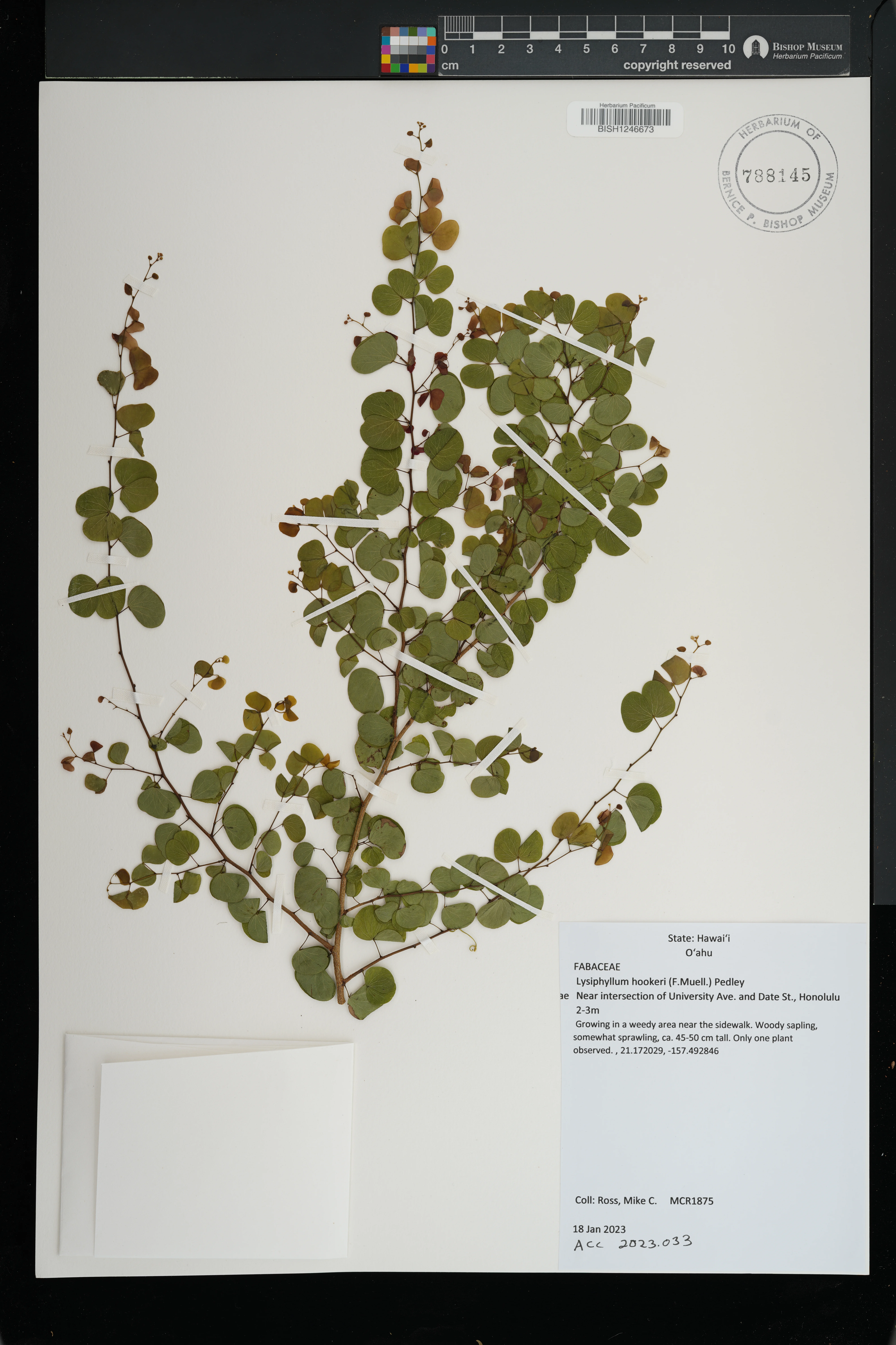 | 11 | Lysiphyllum hookeri | (F.Muell.) Pedley | Honolulu, Stevenson School grounds | PRESERVED_SPECIMEN | Pearsall, G.A. | s.n. | Oahu | BISH | ||