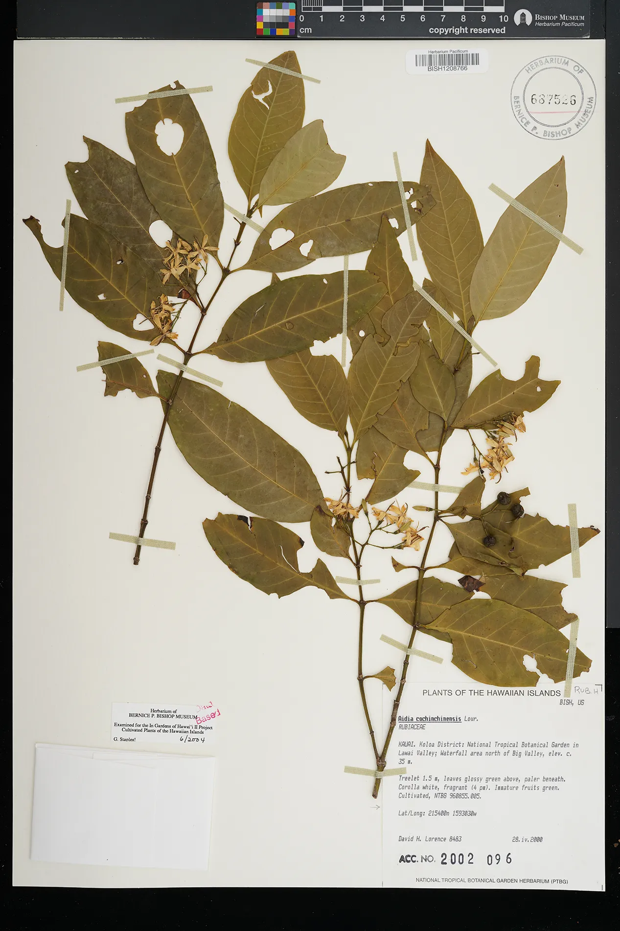 | 4 | Aidia cochinchinensis | Lour. | Koloa, Lawai, NTBG, waterfallarea N of Big Valley | PRESERVED_SPECIMEN | Lorence, D.H. | Collector Number: 8483 | Kauai | BISH | 4/28/2000 | |