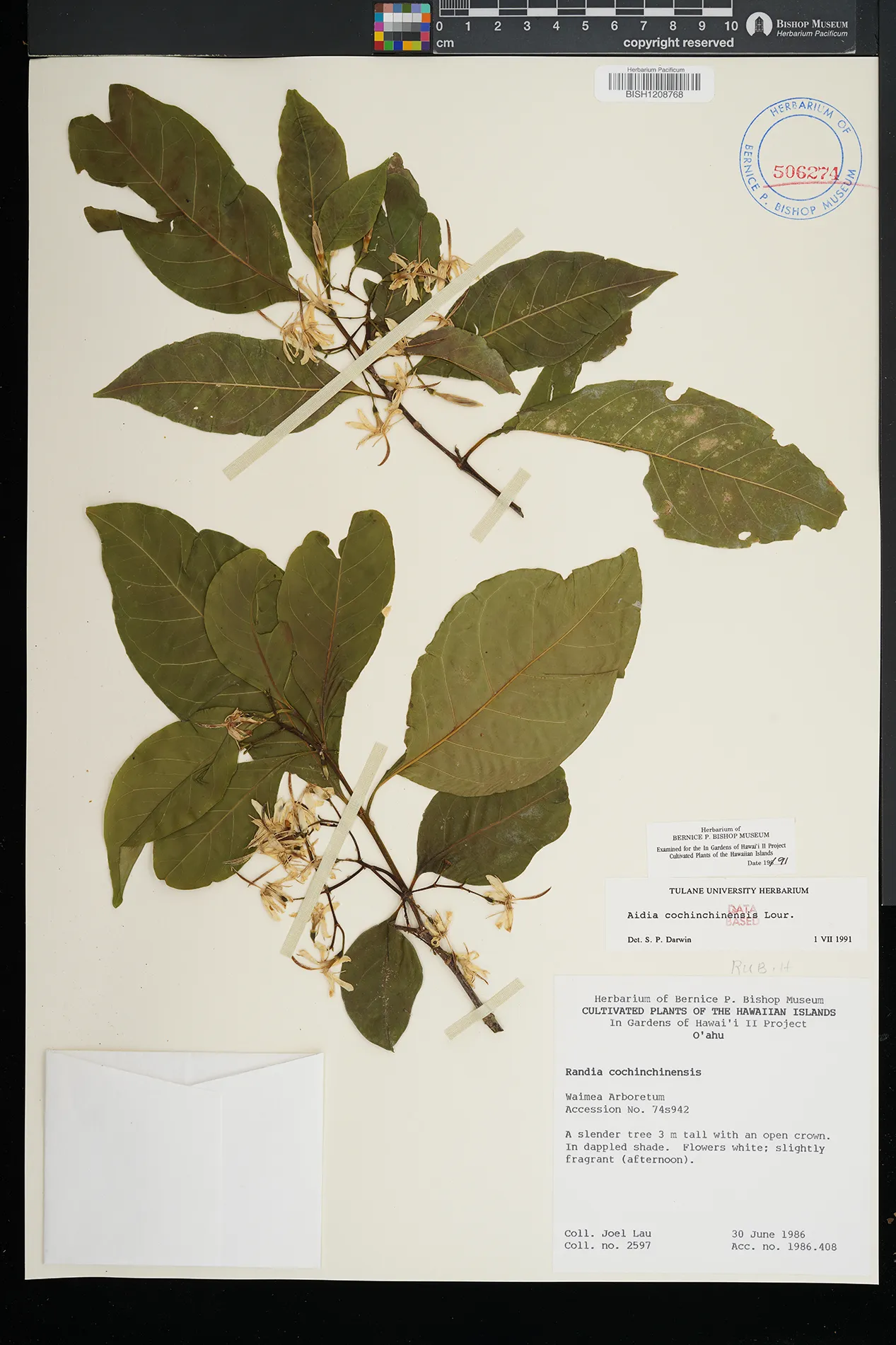 | 3 | Aidia cochinchinensis | Lour. | waimea arboretum | dappled shade | PRESERVED_SPECIMEN | lau, j. | collector number: 2597 | Oahu | BISH | 6/30/1986 |