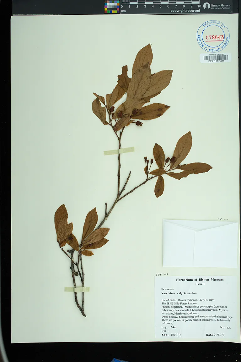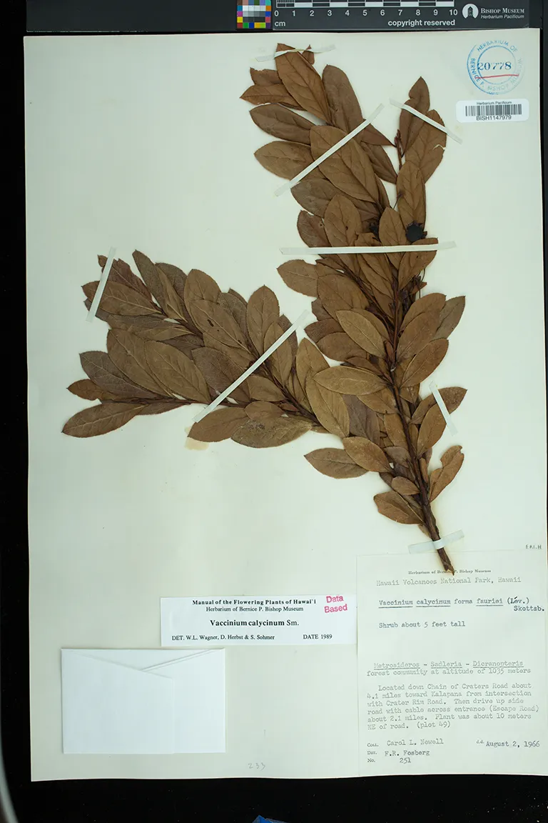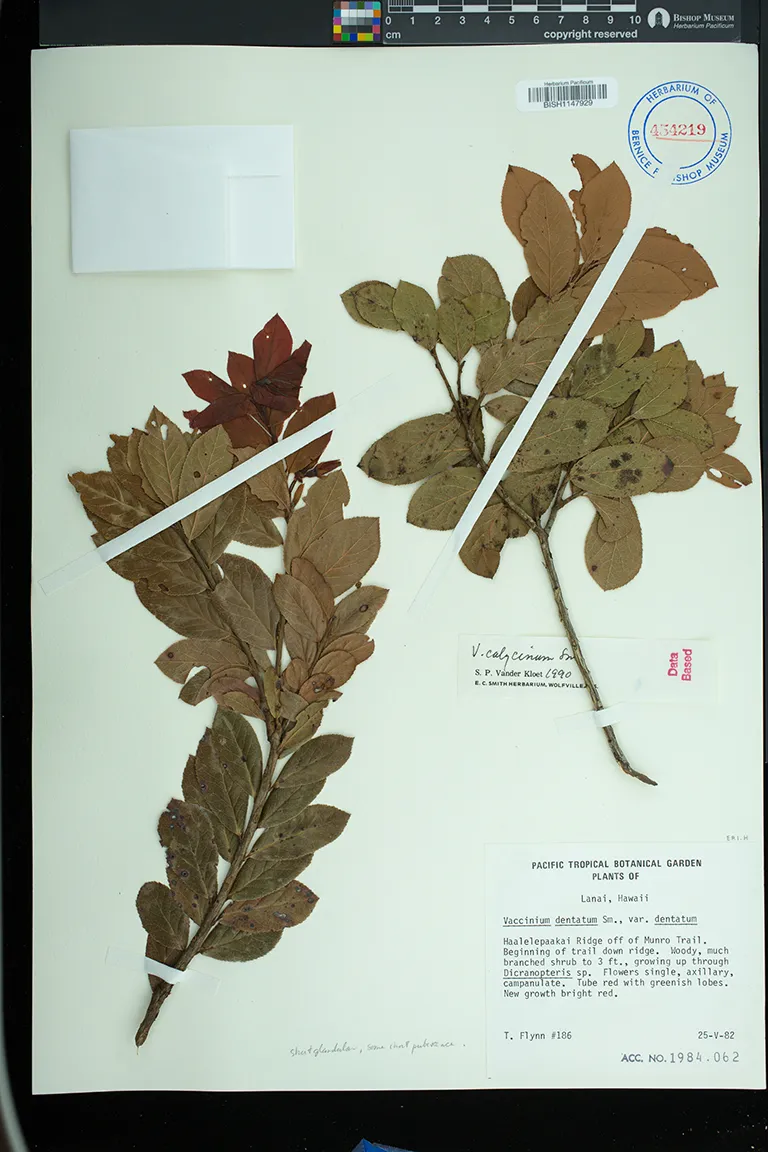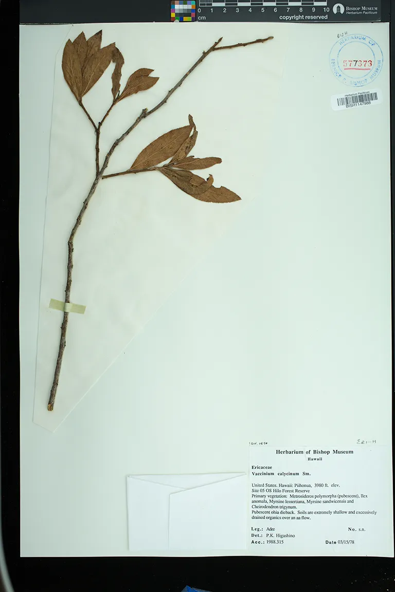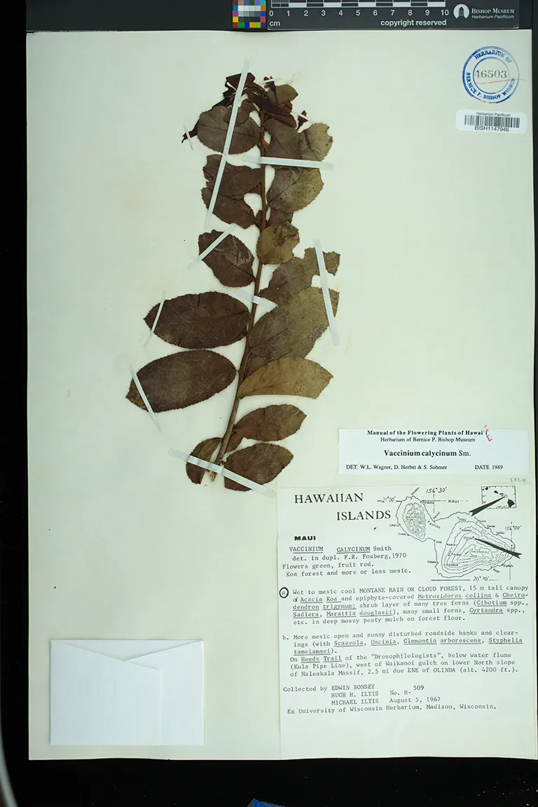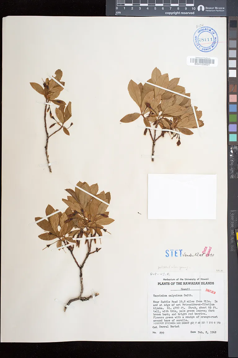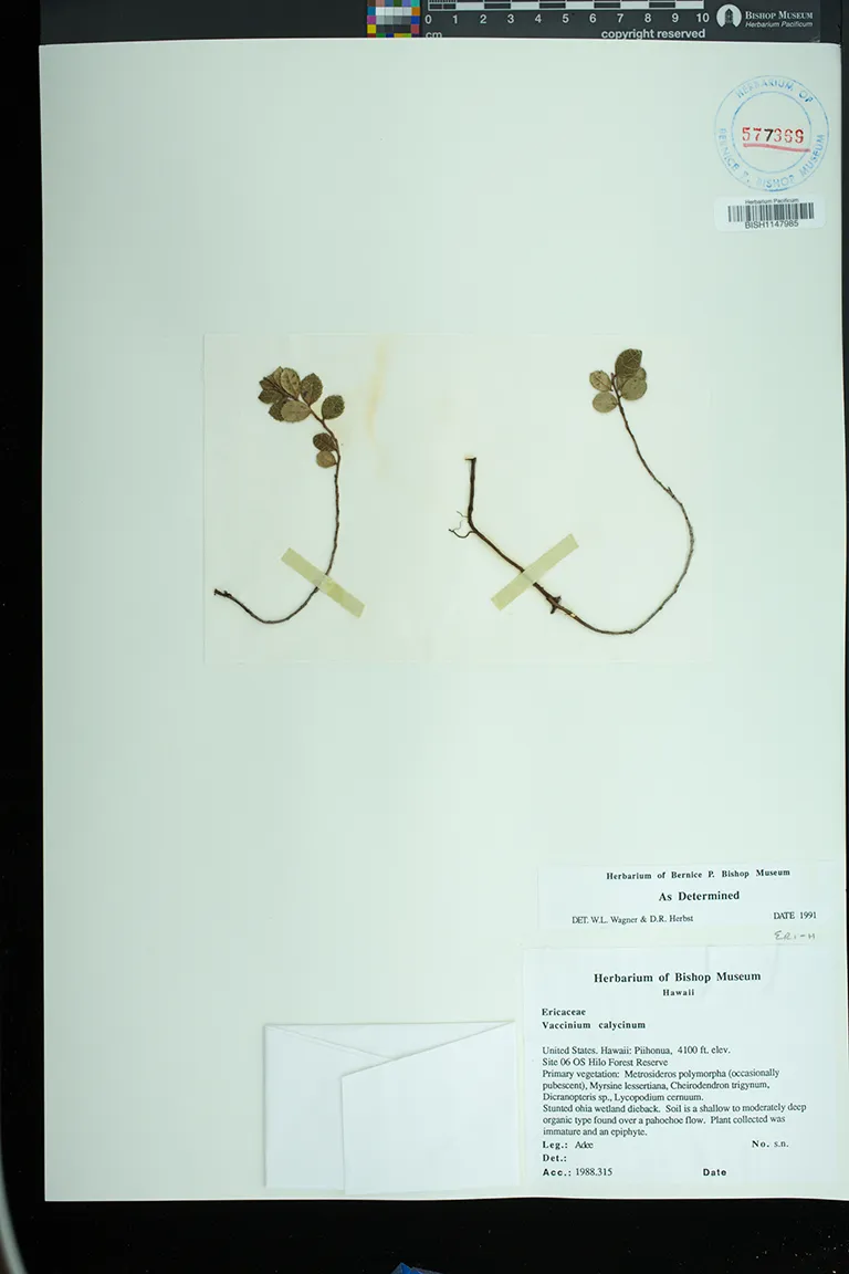 On a windswept ridgetop. Specimen was situated on open ground in 1-2 meter Ohia Montane Wet Shrubland. Associated vegetation: Metrosideros polymorpha, Cheirodendron trigynum, Eragrostis grandis, Styphelia tameiameiae, Palhinhaea cernua, Isachne distichophylla, Machaerina angustifolia, Plantago pachyphylla, Tibouchina herbacea. |