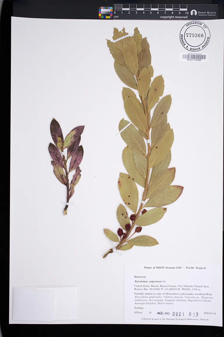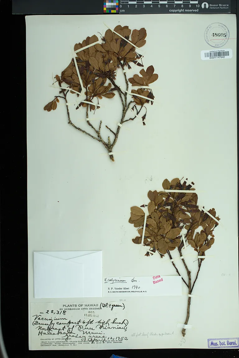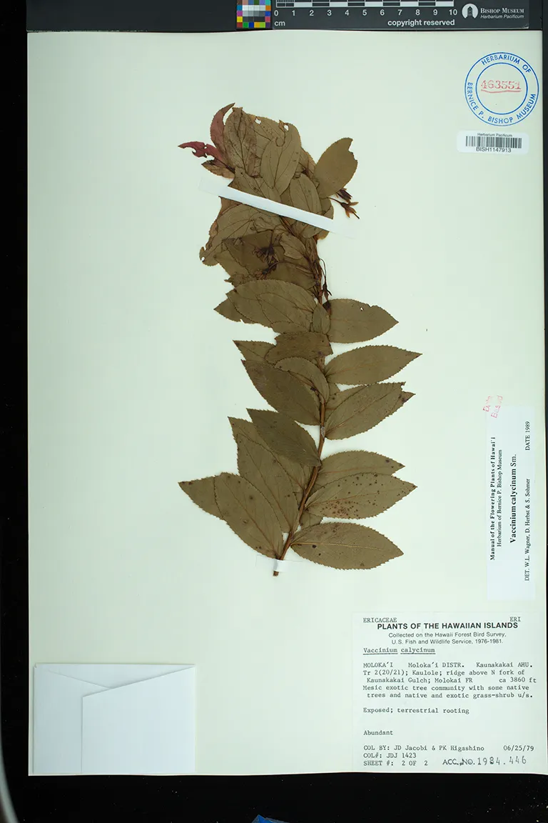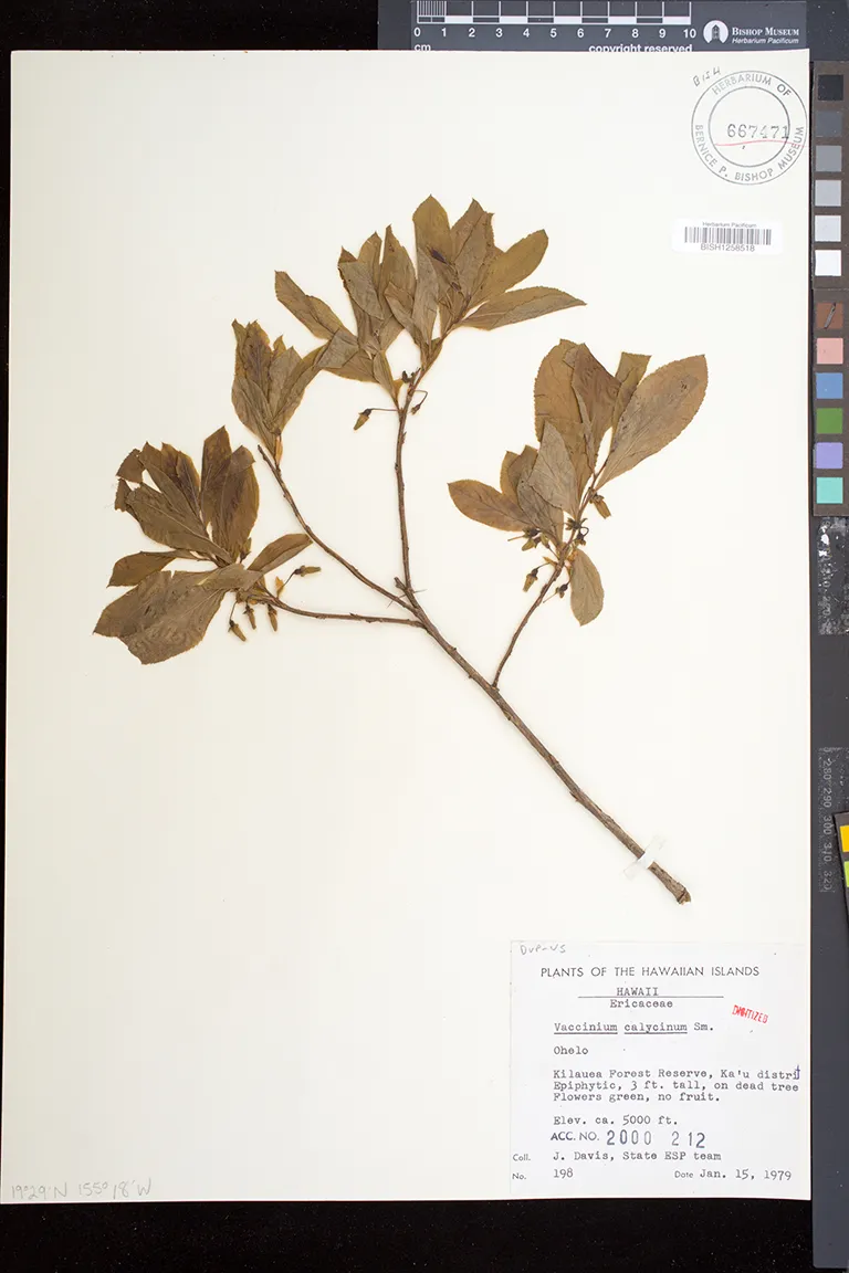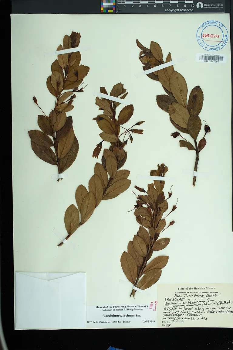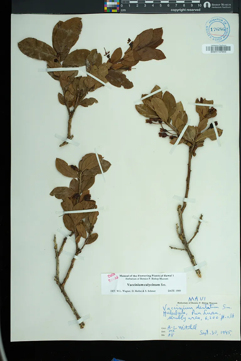 On a windswept ridgetop. Specimen was situated on open ground in 1-2 meter Ohia Montane Wet Shrubland. Associated vegetation: Metrosideros polymorpha, Cheirodendron trigynum, Eragrostis grandis, Styphelia tameiameiae, Palhinhaea cernua, Isachne distichophylla, Machaerina angustifolia, Plantago pachyphylla, Tibouchina herbacea. |