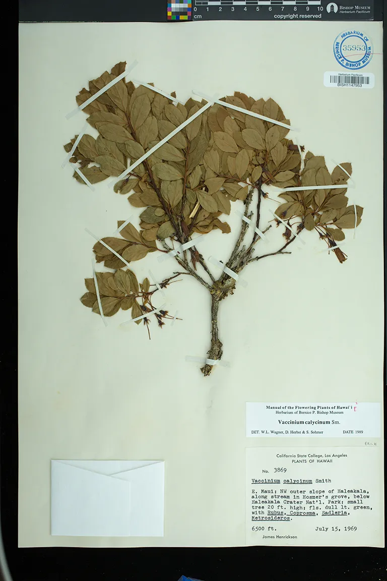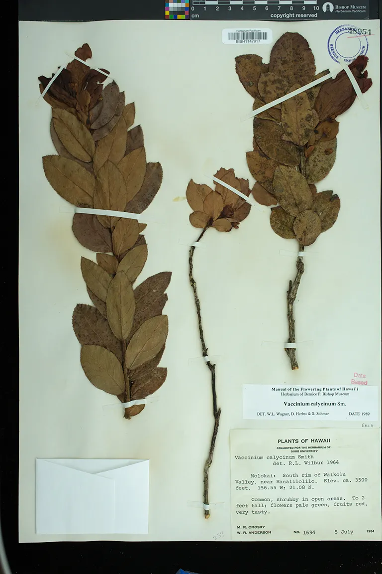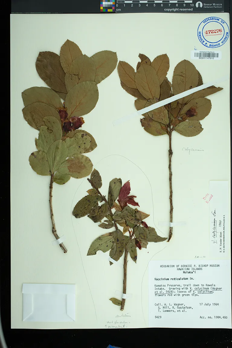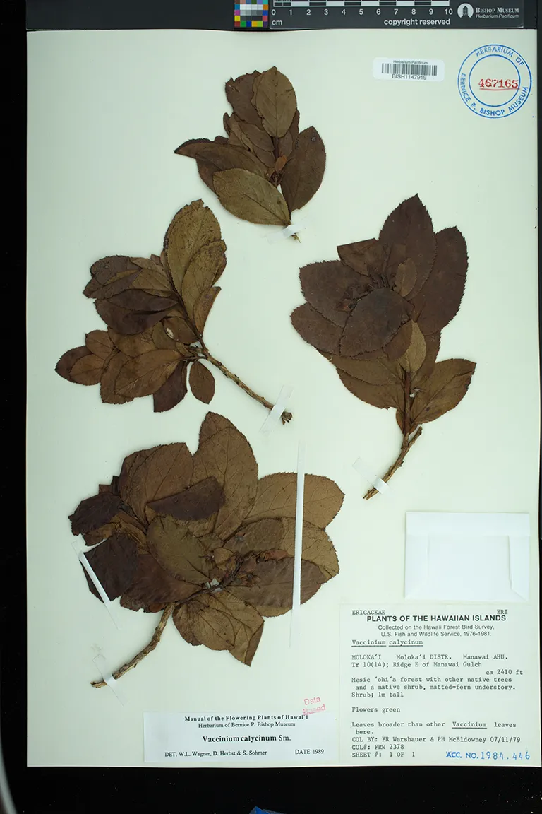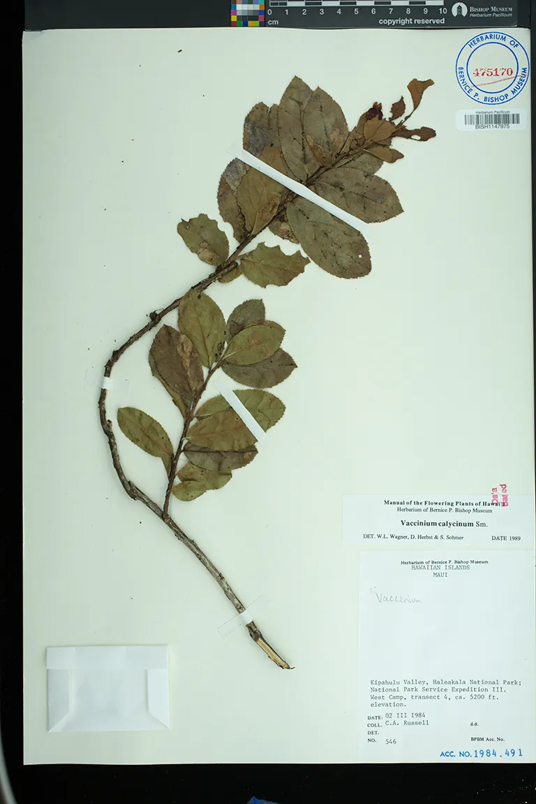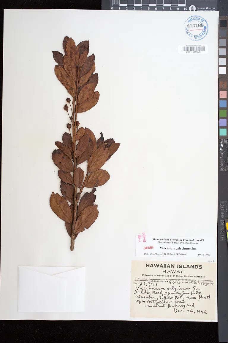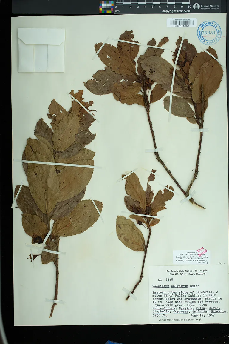 On a windswept ridgetop. Specimen was situated on open ground in 1-2 meter Ohia Montane Wet Shrubland. Associated vegetation: Metrosideros polymorpha, Cheirodendron trigynum, Eragrostis grandis, Styphelia tameiameiae, Palhinhaea cernua, Isachne distichophylla, Machaerina angustifolia, Plantago pachyphylla, Tibouchina herbacea. |