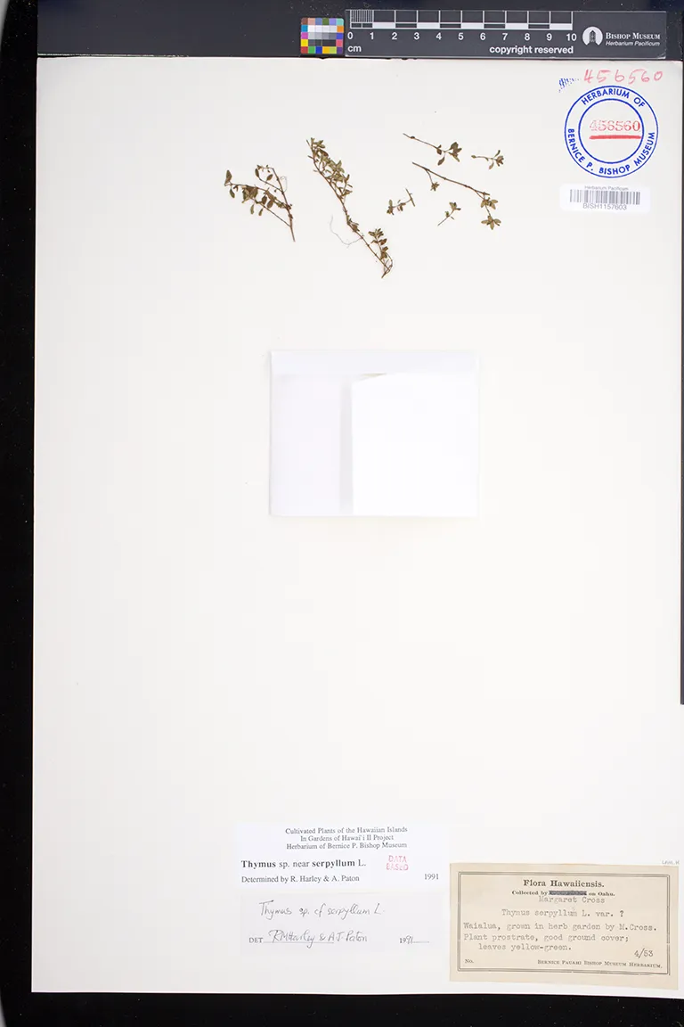 | 2 | Thymus serpyllum | L. | waialua; grown in herb garden by margaret cross | PRESERVED_SPECIMEN | cross, m. | collector number: s.n. | Oahu | BISH | 4/1/1953 |