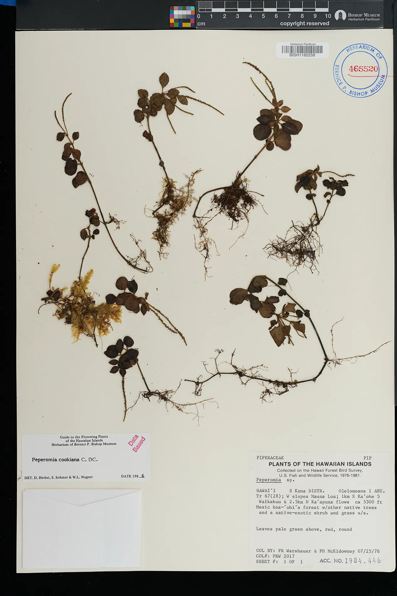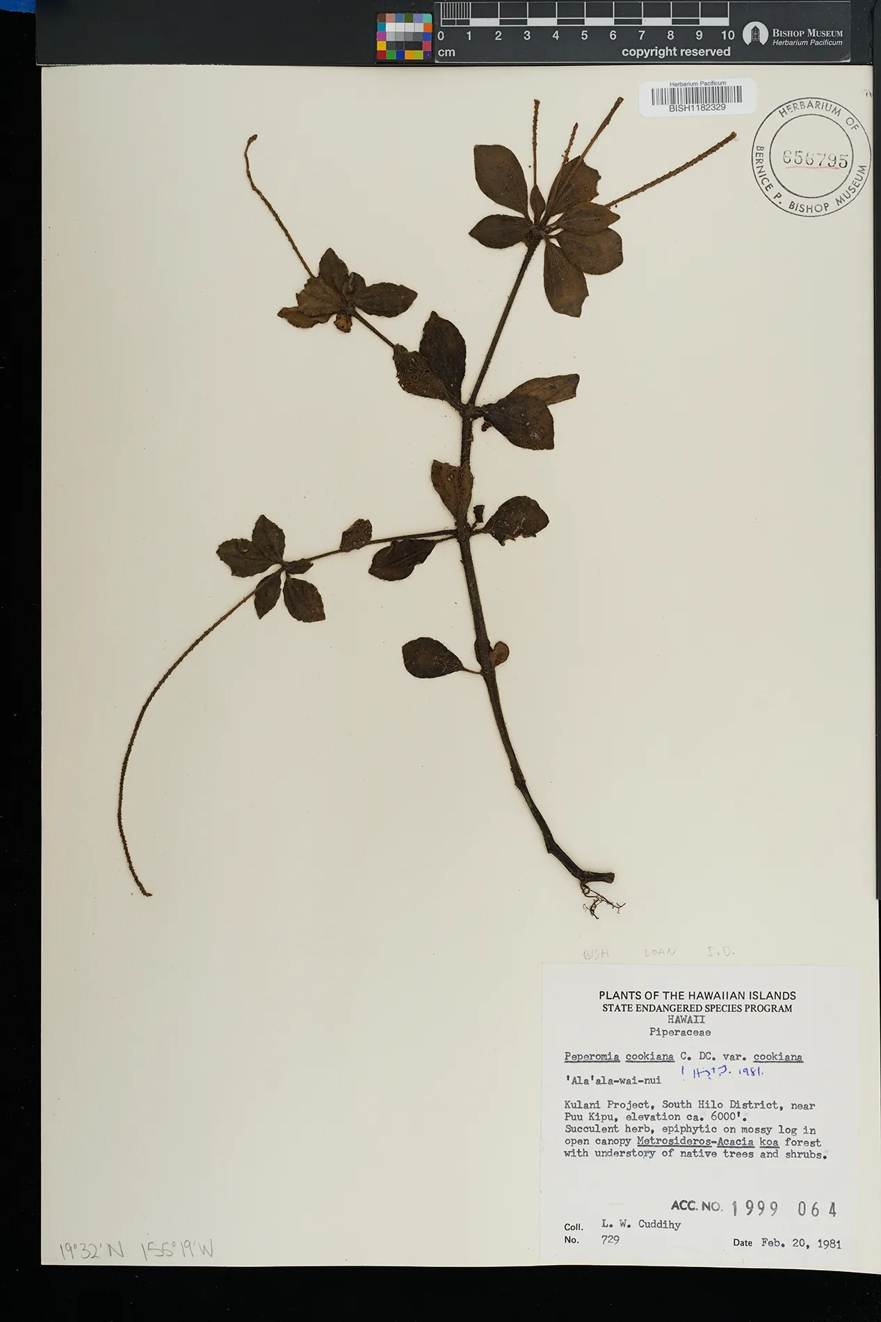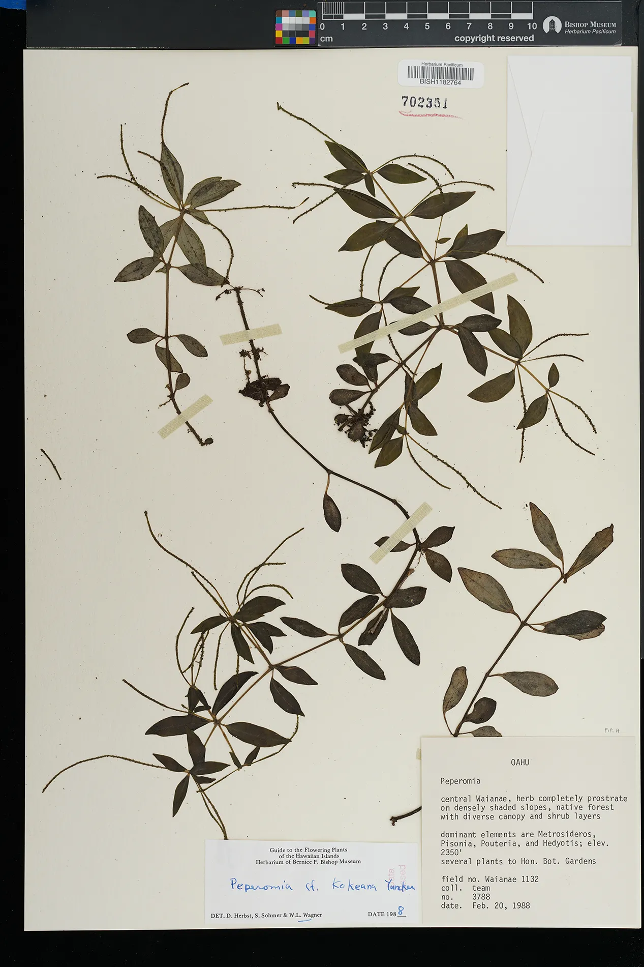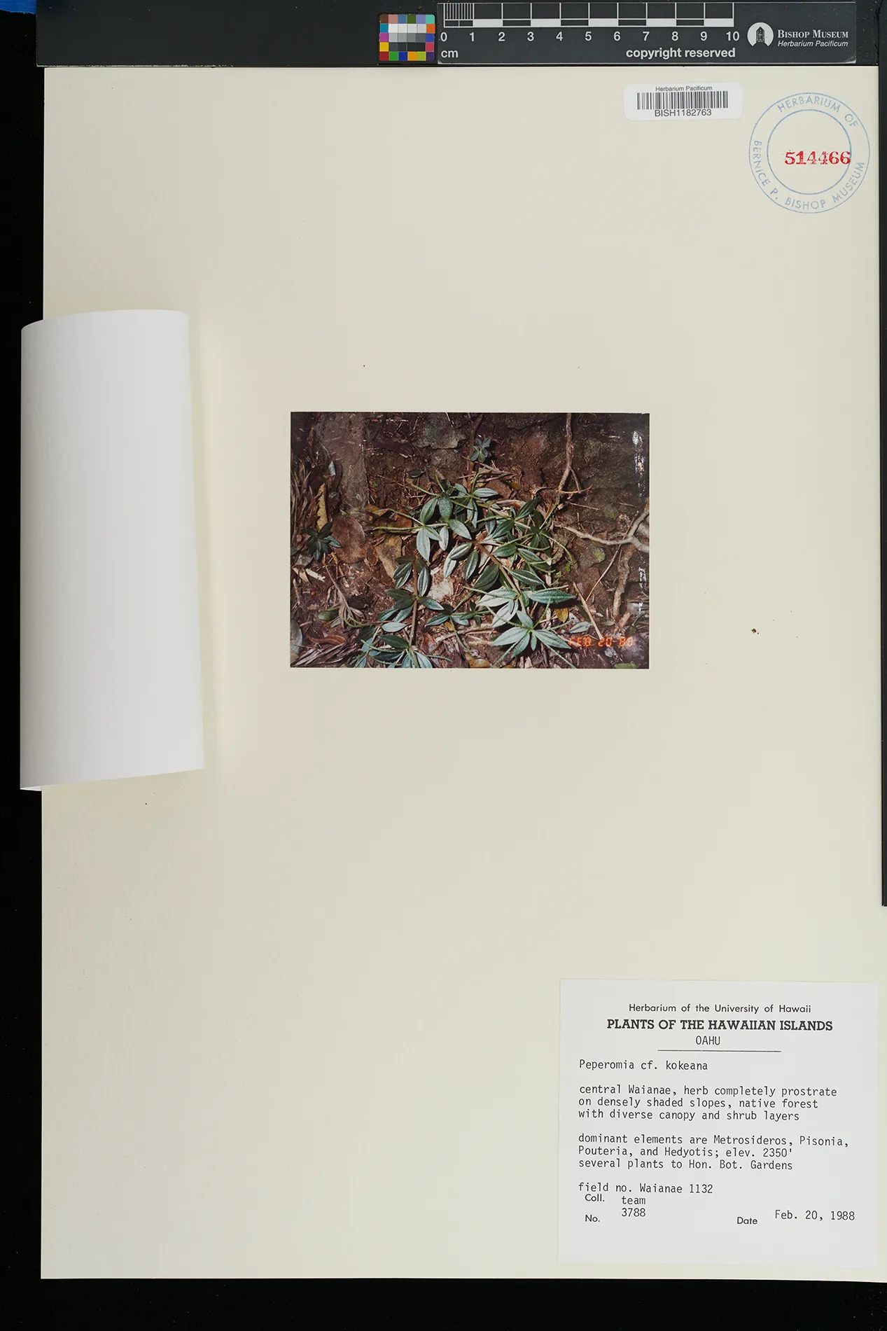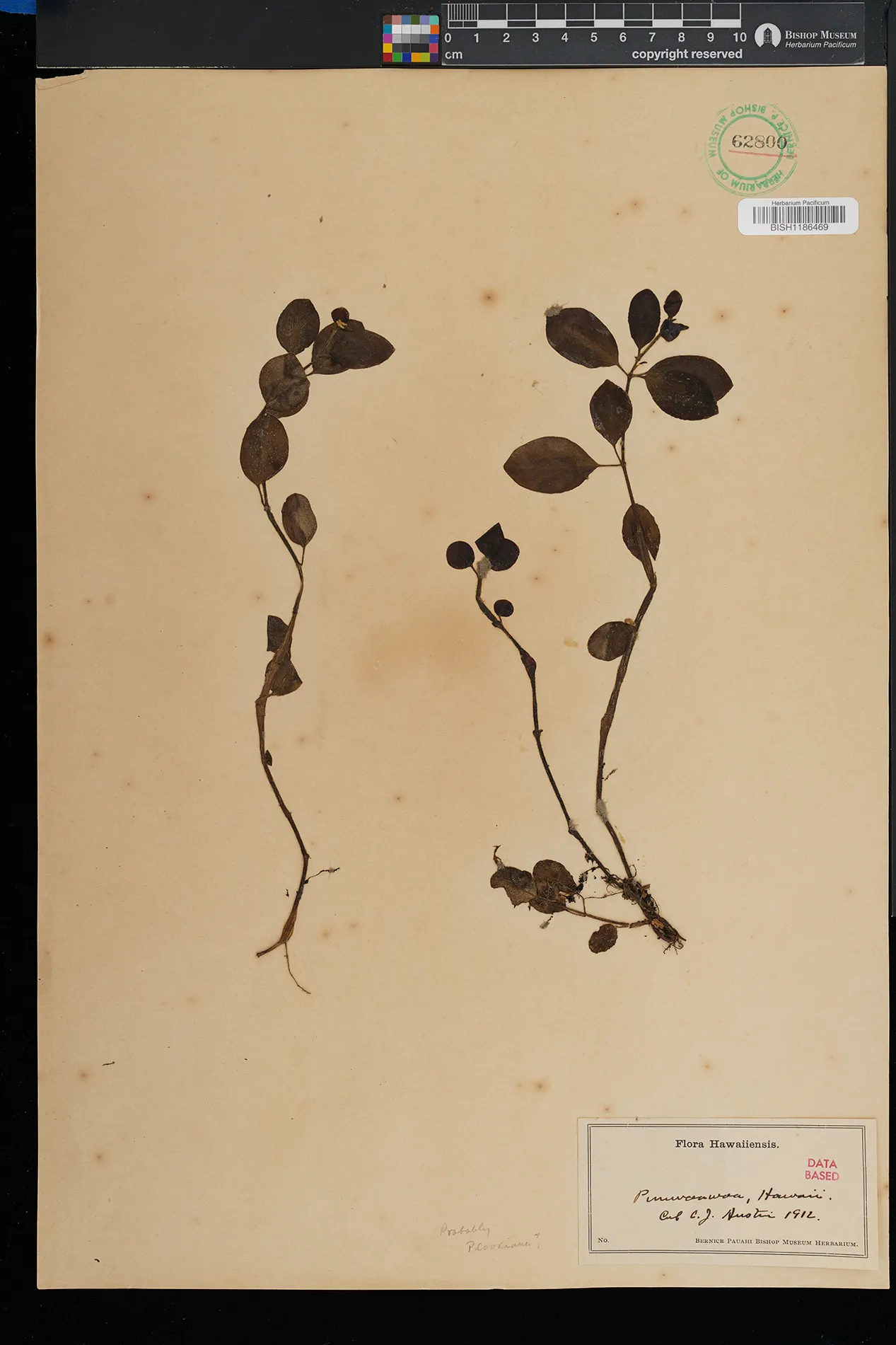 Ohia Mixed Mesic Forest a small herb covering the ground at 3800 ft on a ridge with Metrosideros, Cheirodendron, Myrsine, Dubautia, Hedyotis, Stenogyne and Liparis |