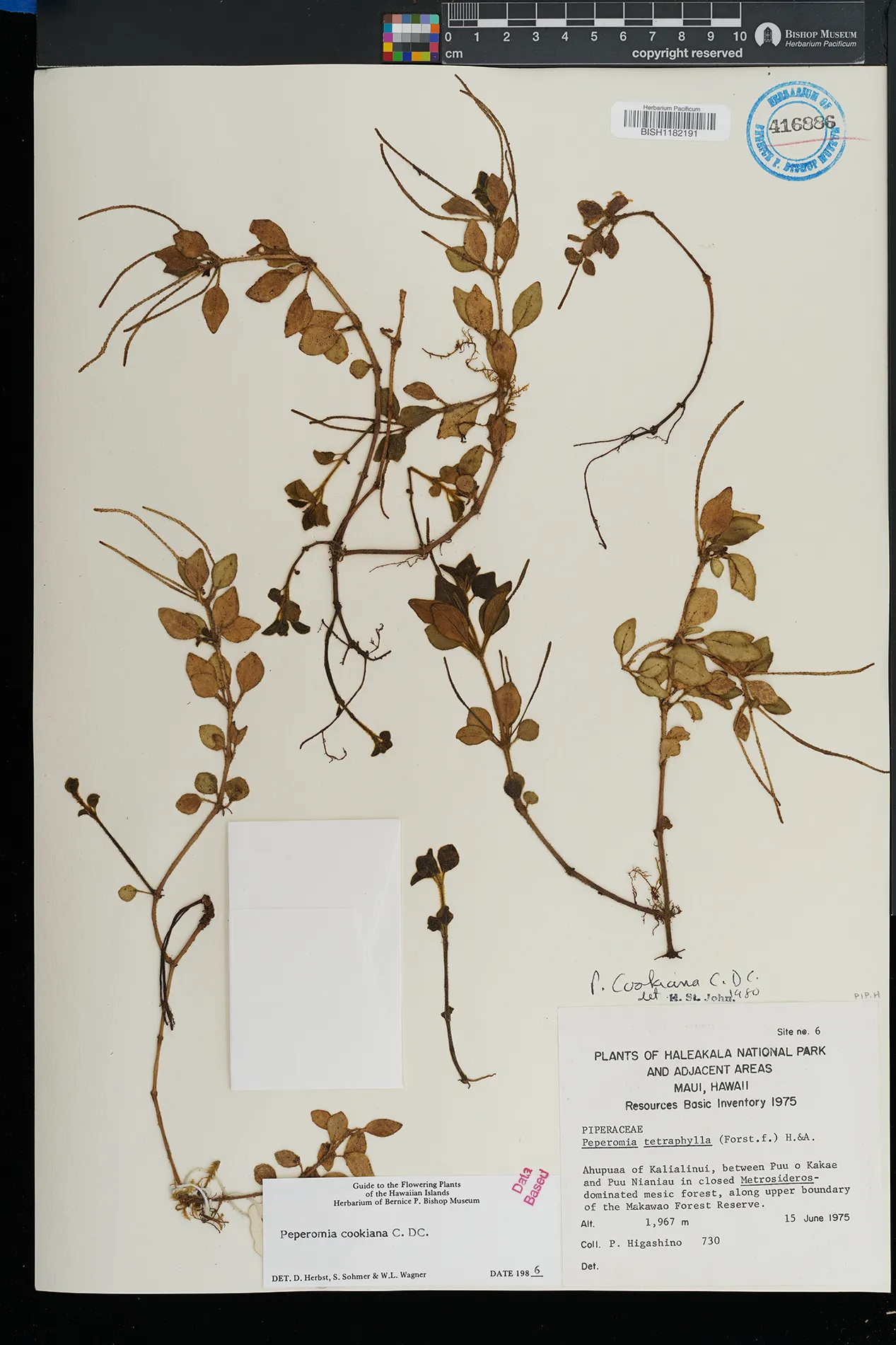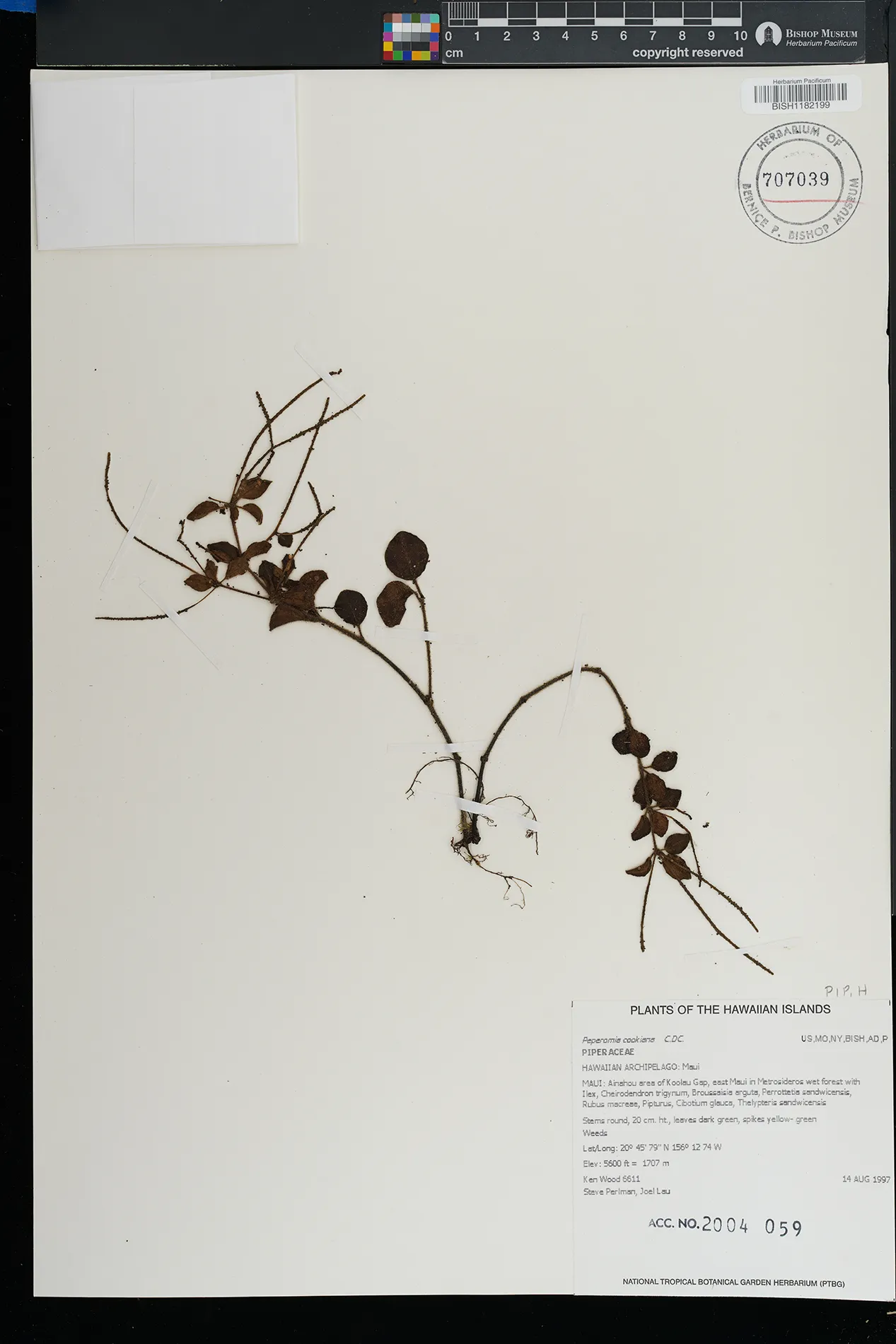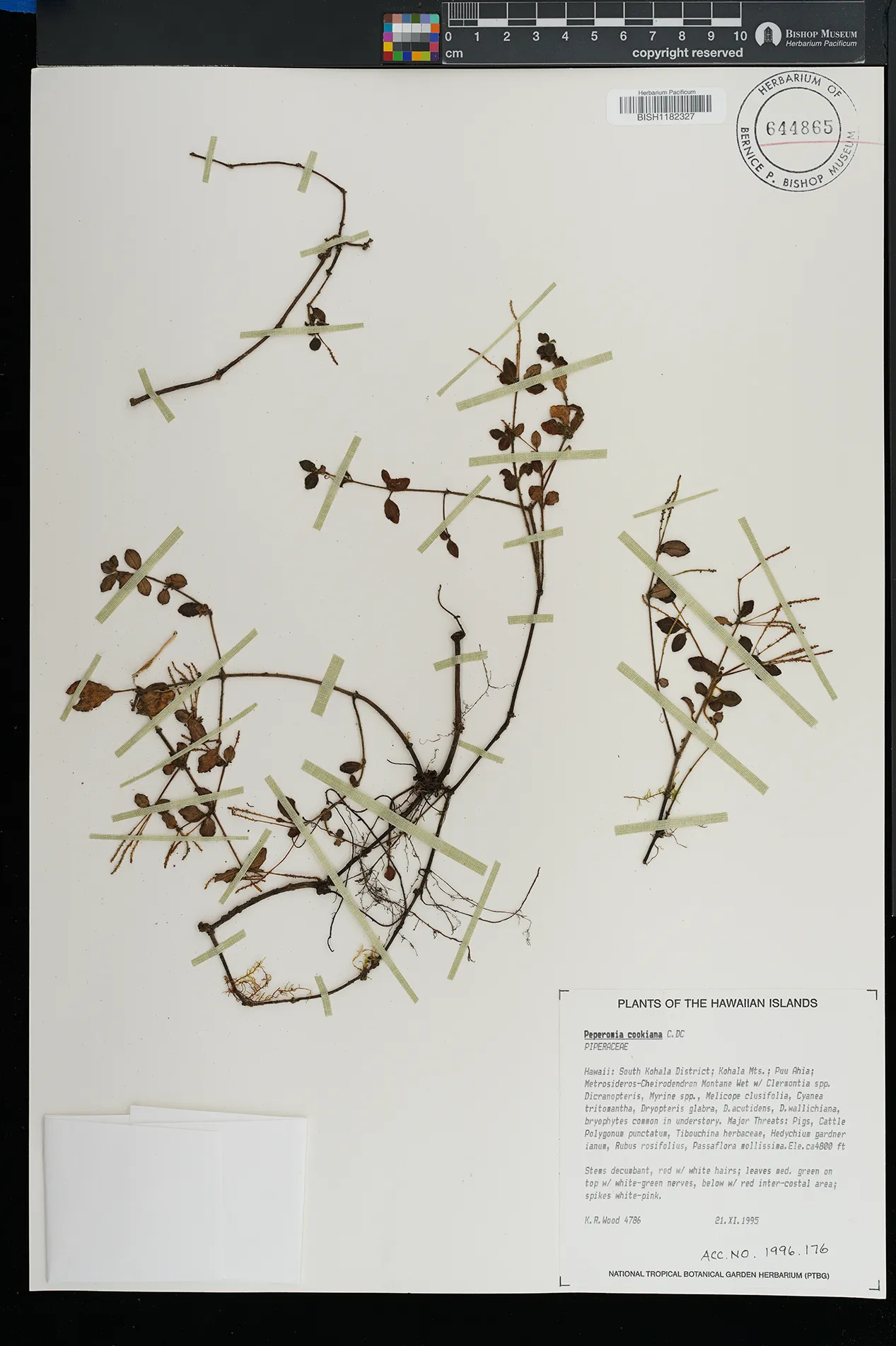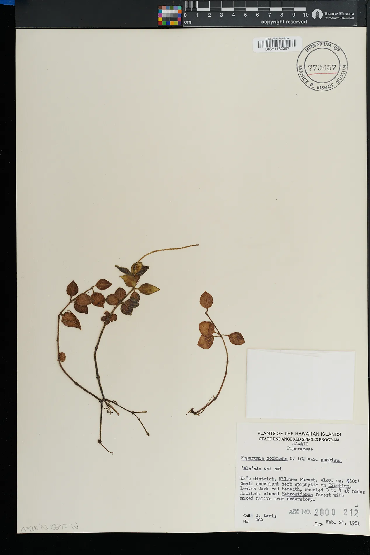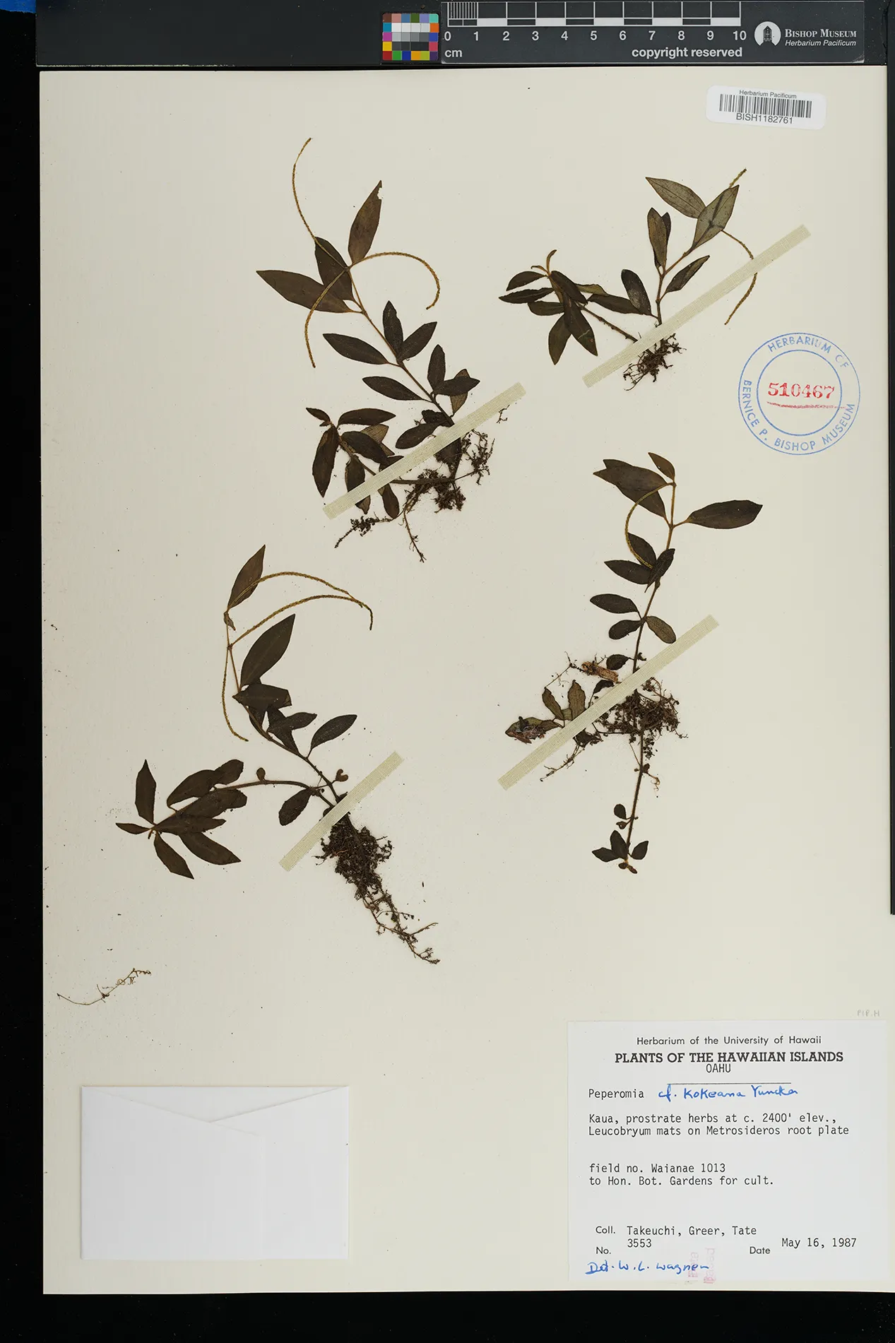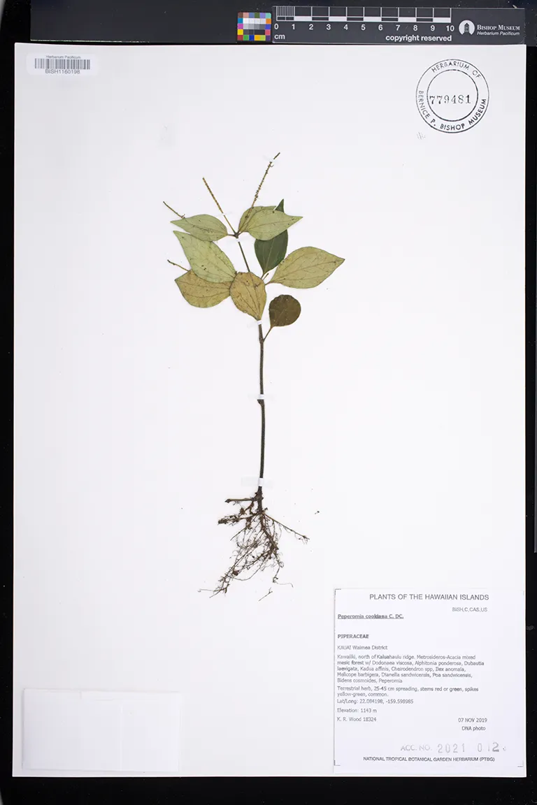Ohia Mixed Mesic Forest a small herb covering the ground at 3800 ft on a ridge with Metrosideros, Cheirodendron, Myrsine, Dubautia, Hedyotis, Stenogyne and Liparis |