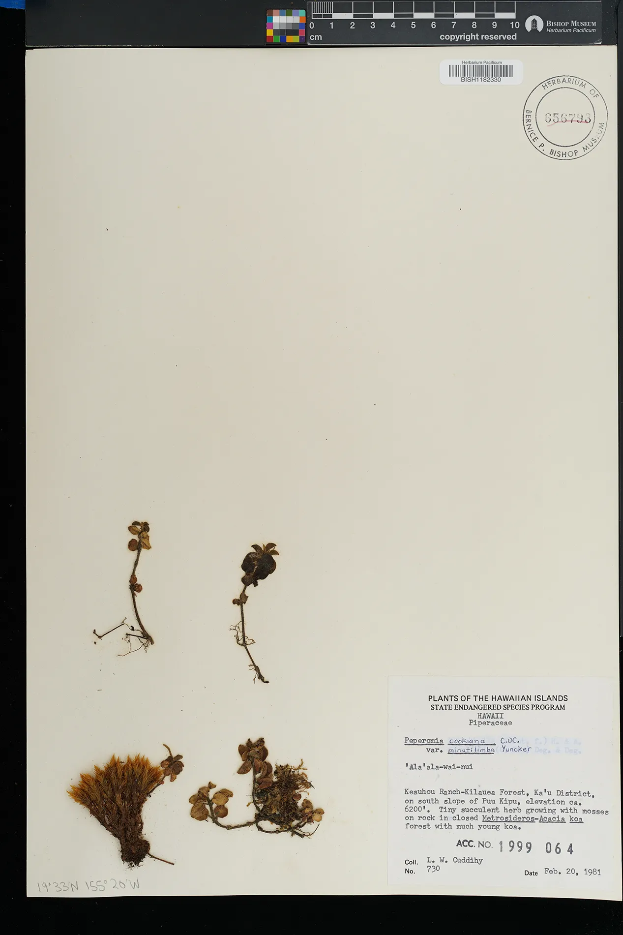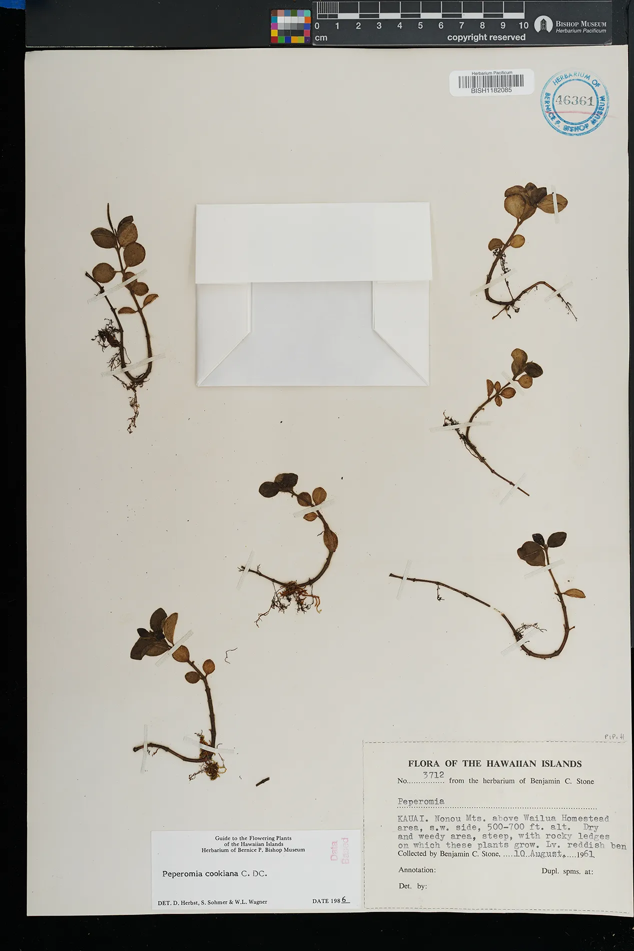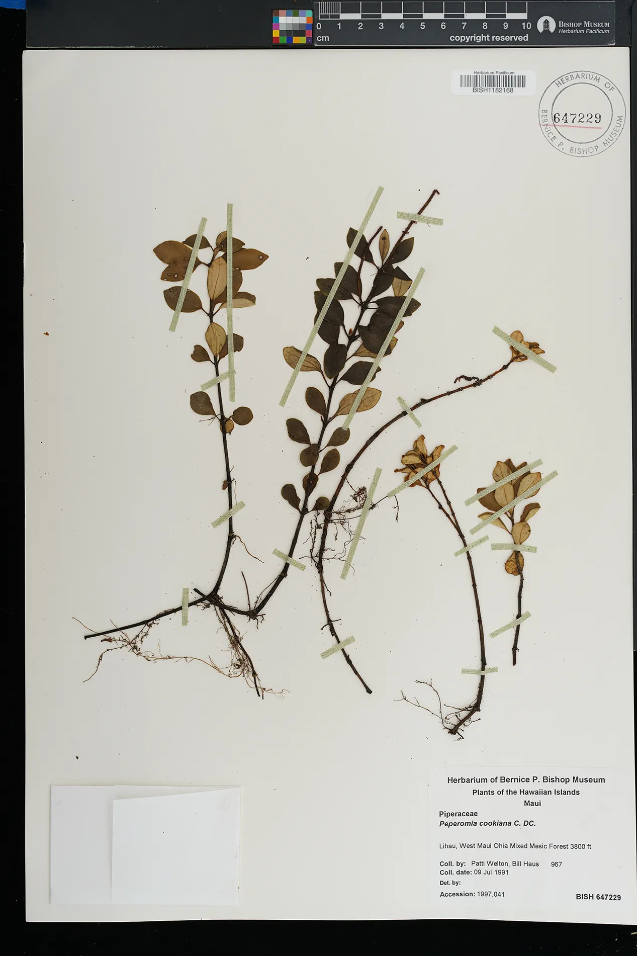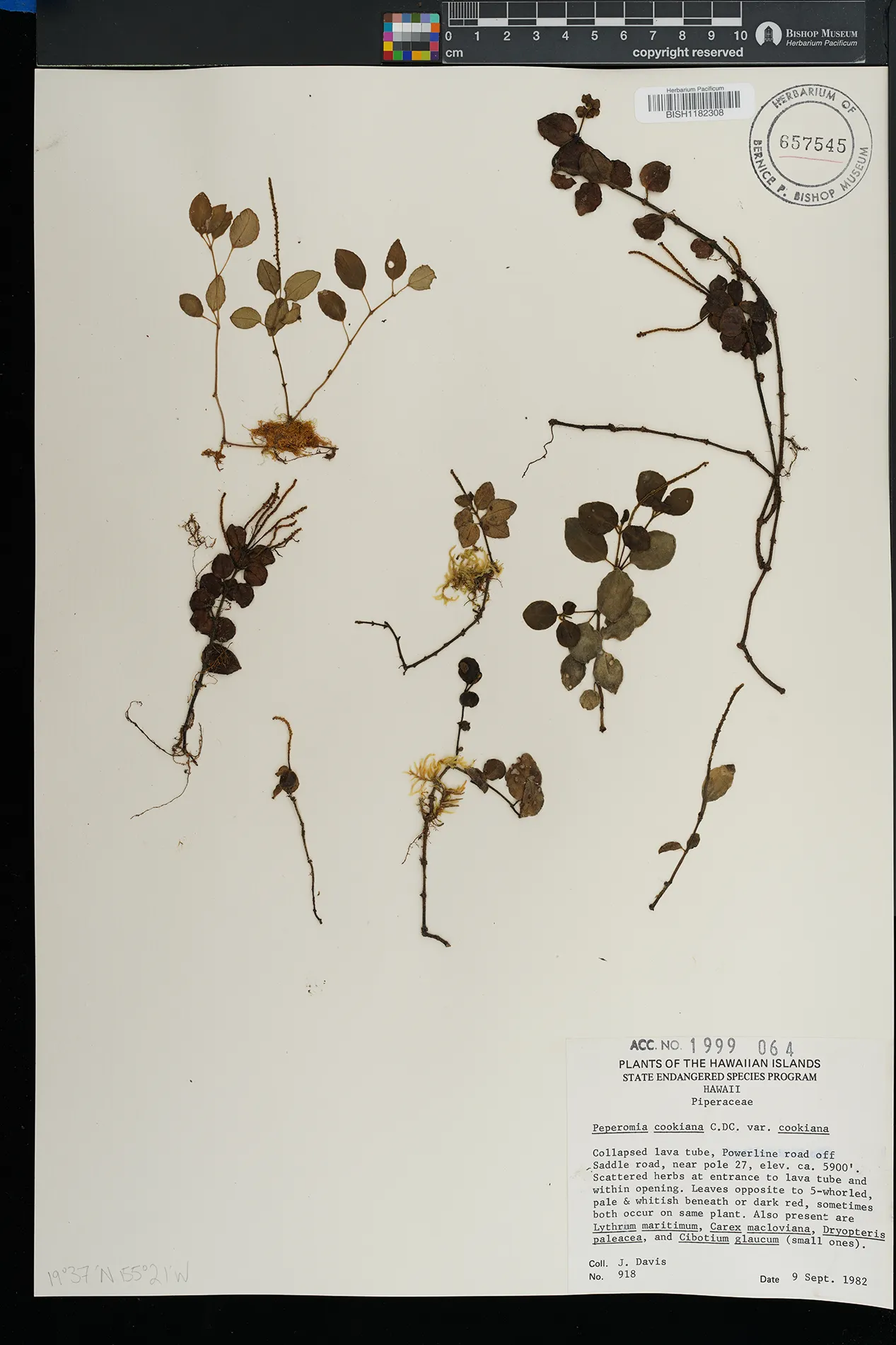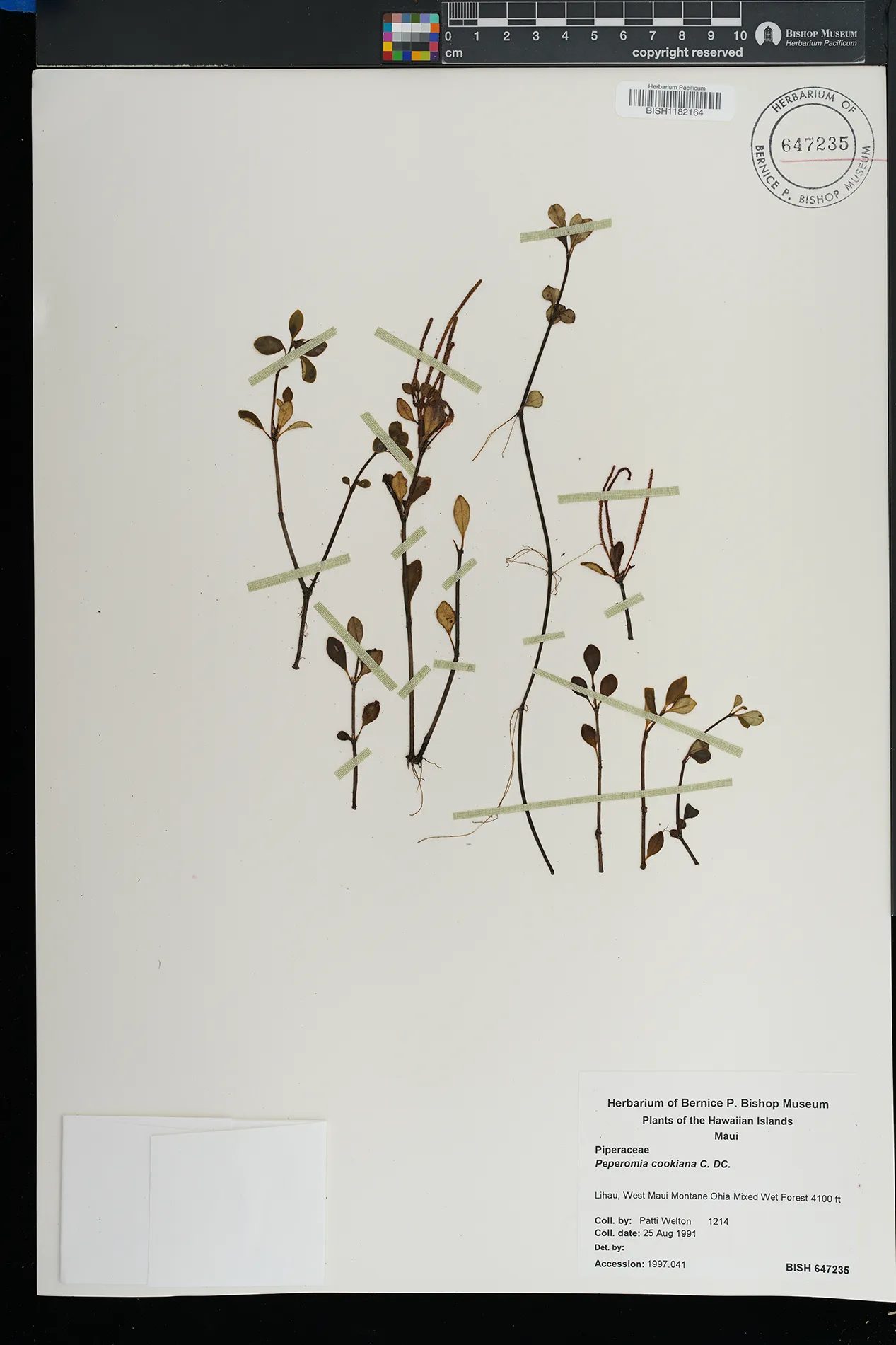 Ohia Mixed Mesic Forest a small herb covering the ground at 3800 ft on a ridge with Metrosideros, Cheirodendron, Myrsine, Dubautia, Hedyotis, Stenogyne and Liparis |