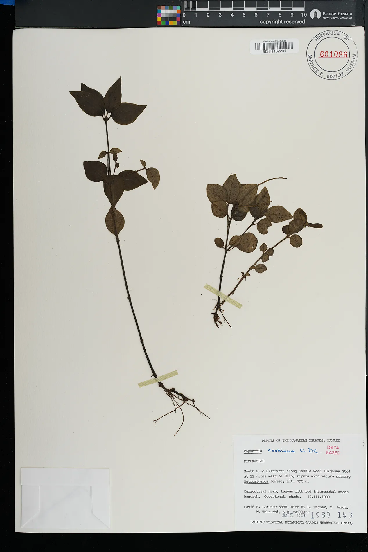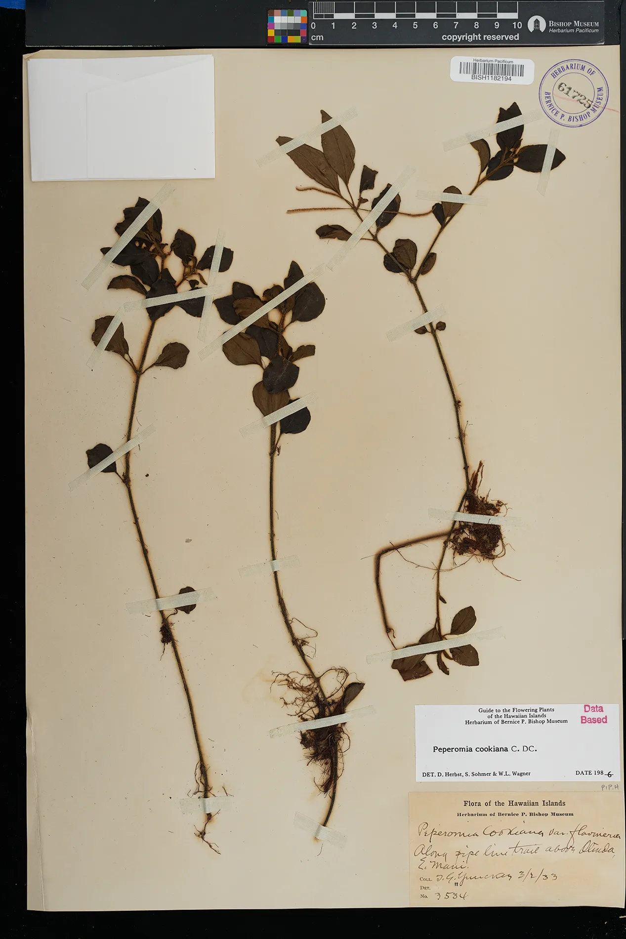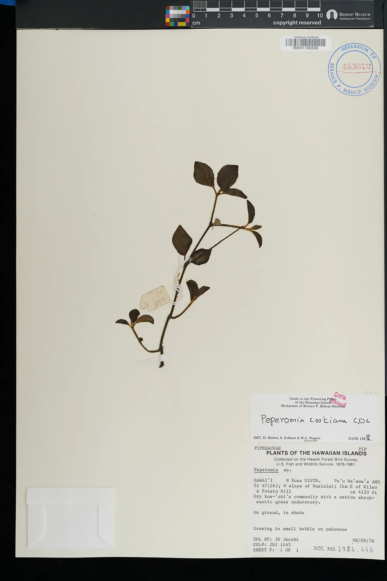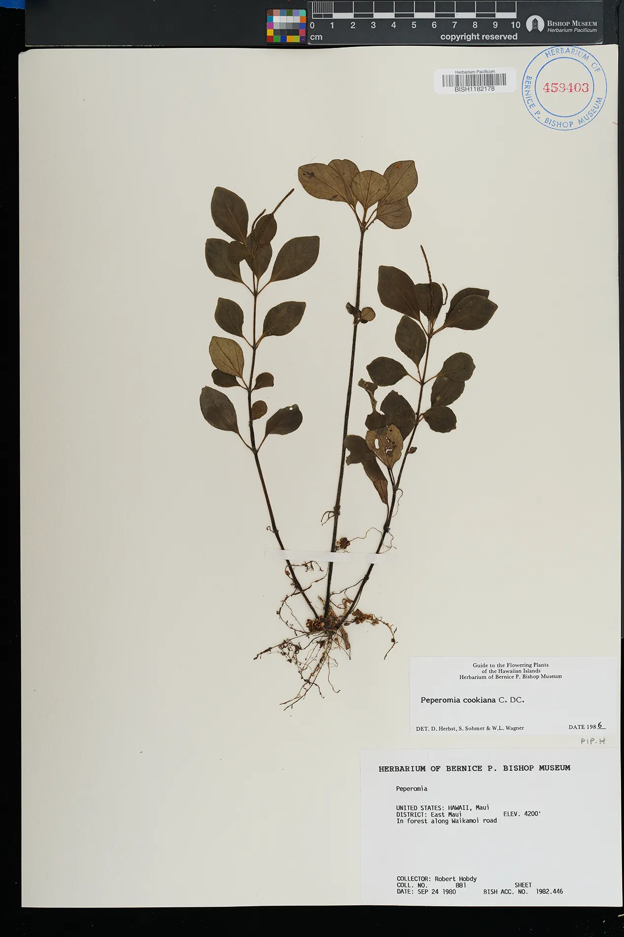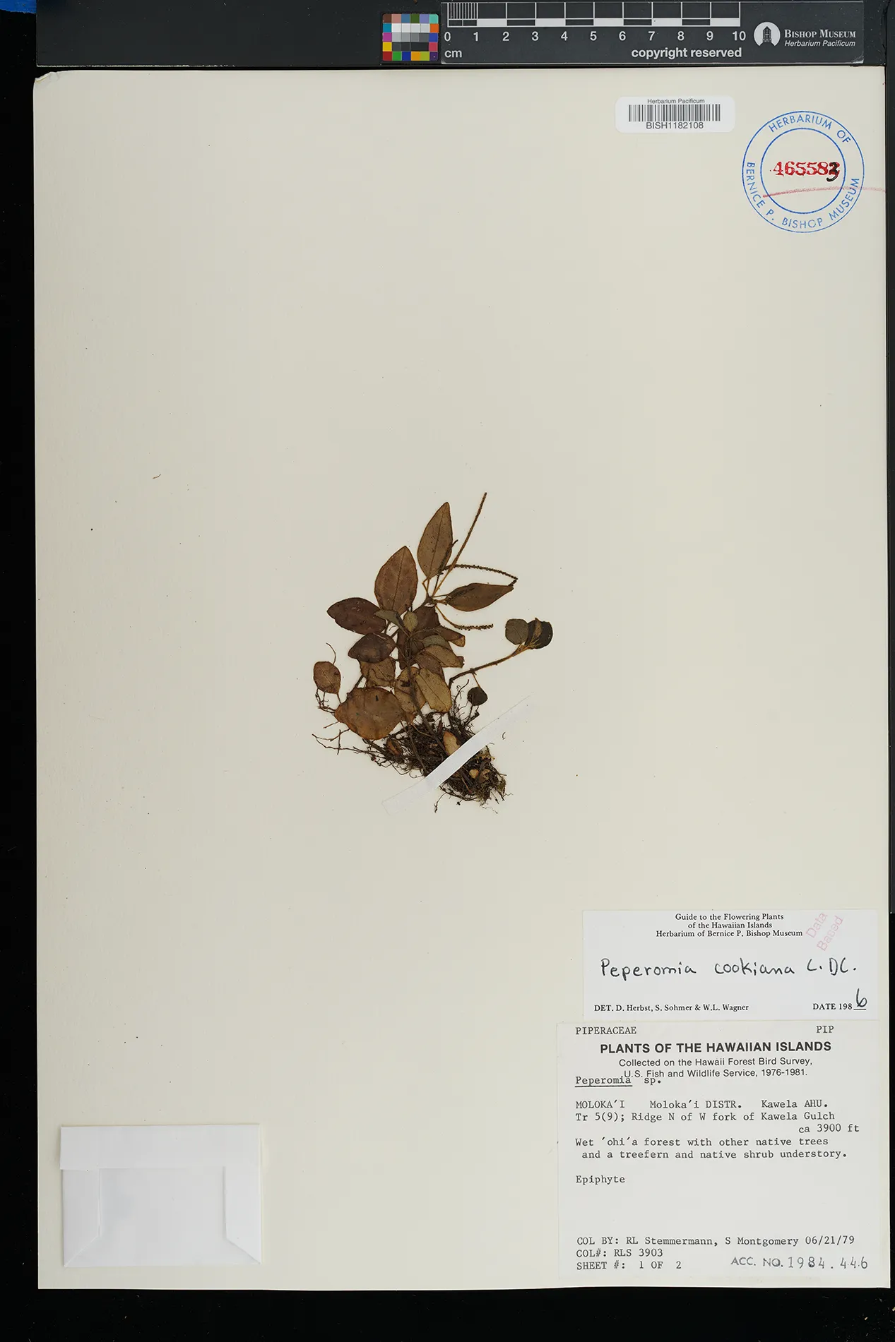 Ohia Mixed Mesic Forest a small herb covering the ground at 3800 ft on a ridge with Metrosideros, Cheirodendron, Myrsine, Dubautia, Hedyotis, Stenogyne and Liparis |