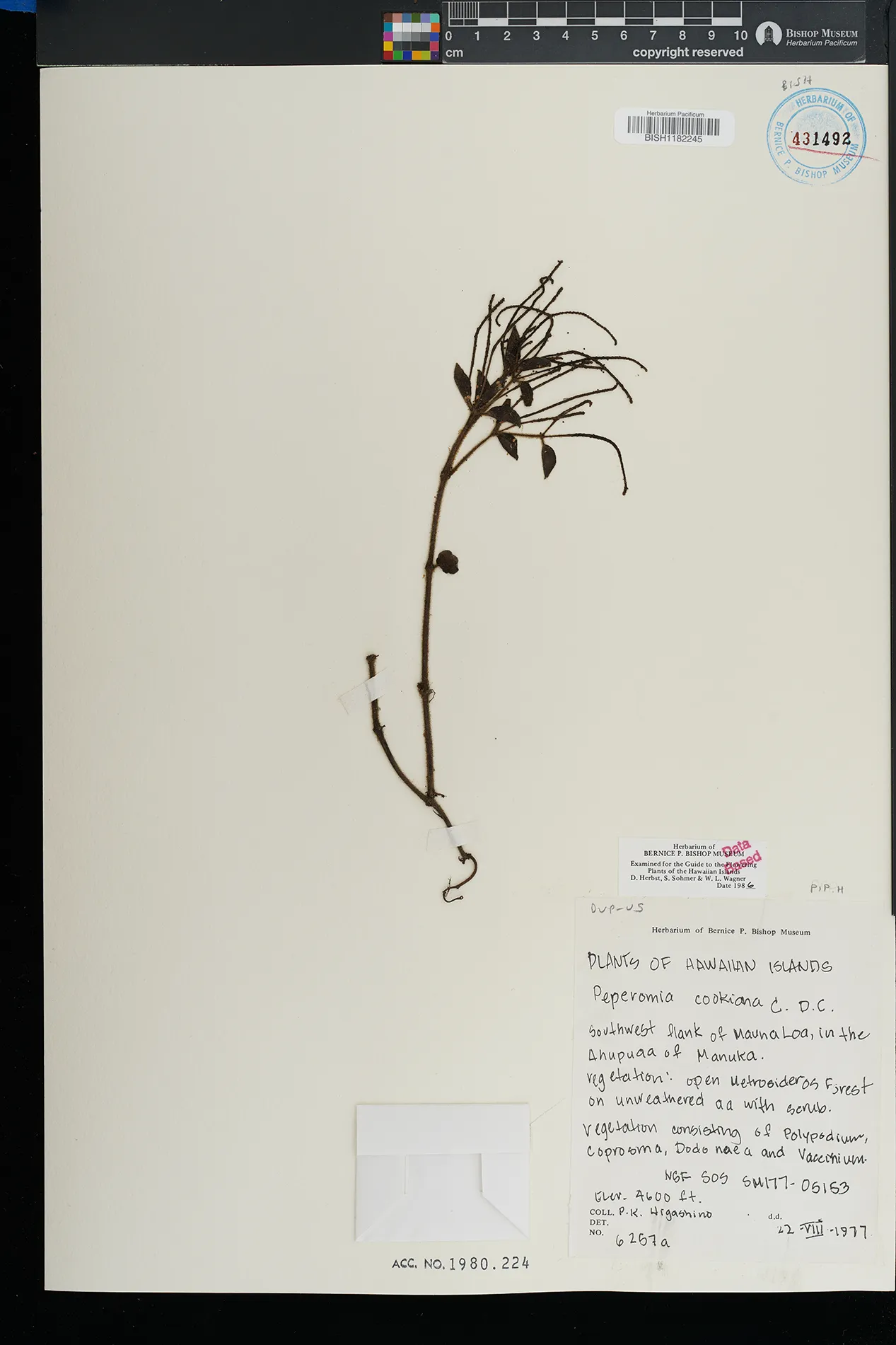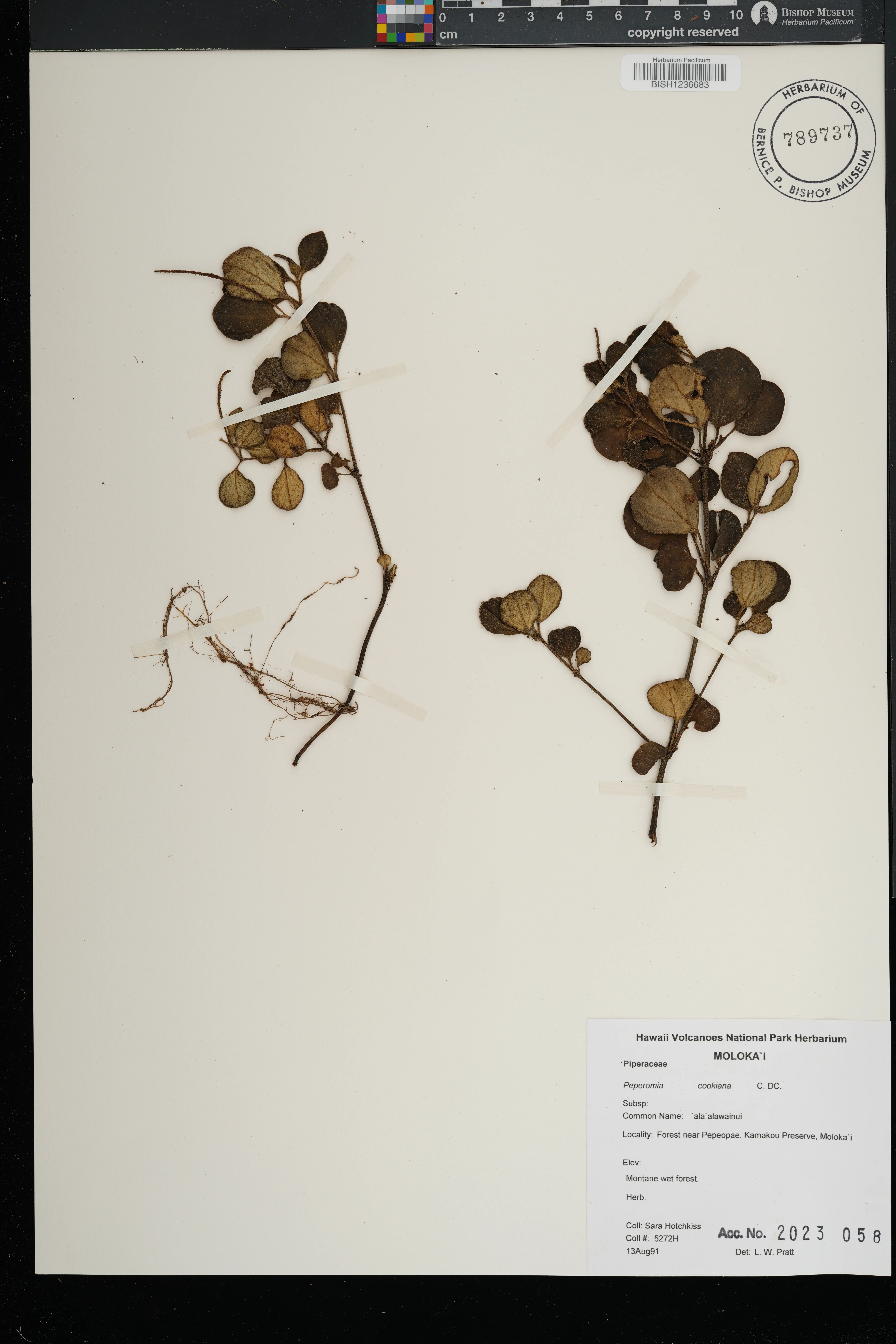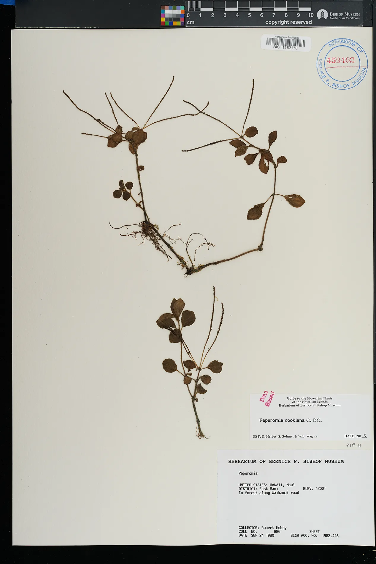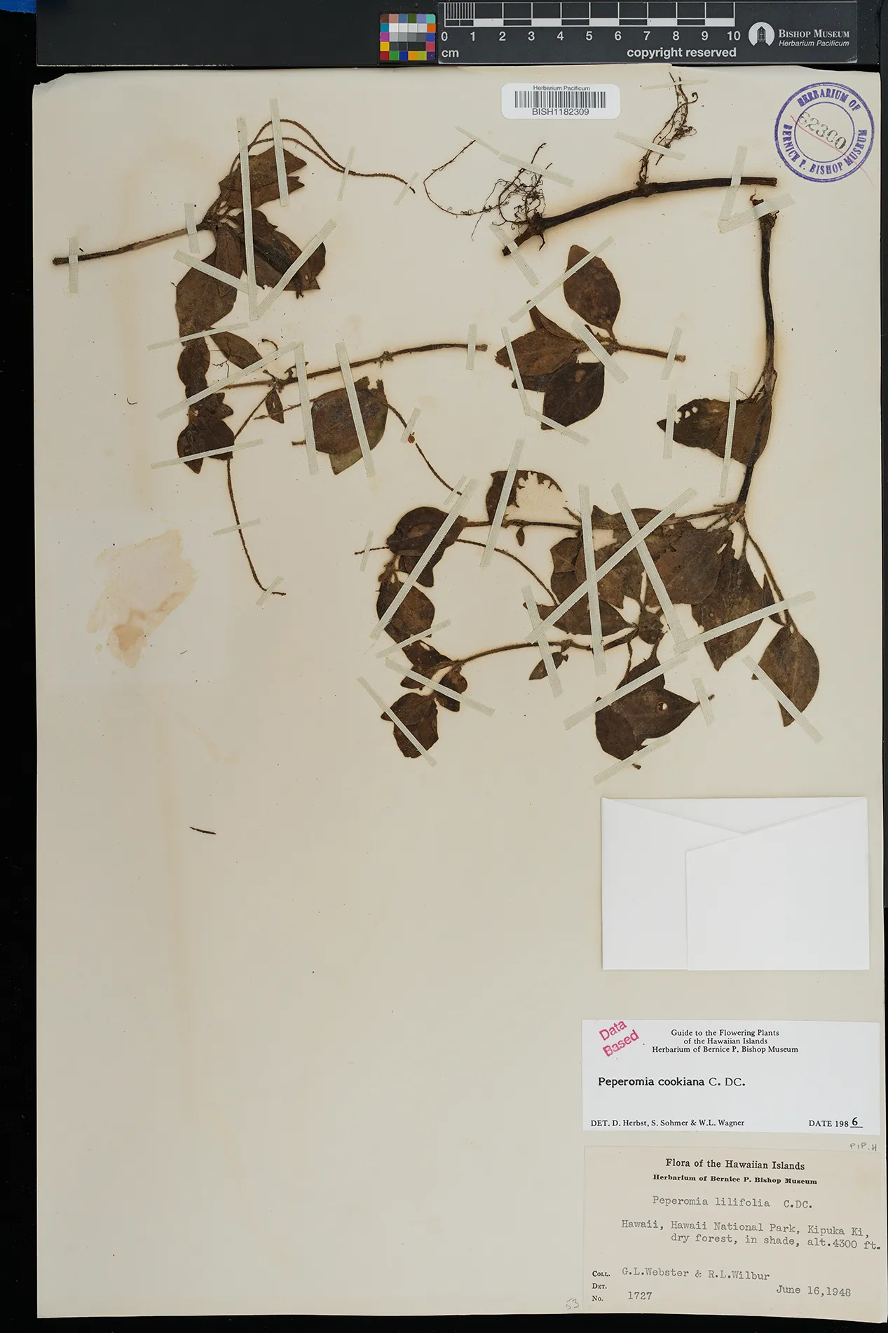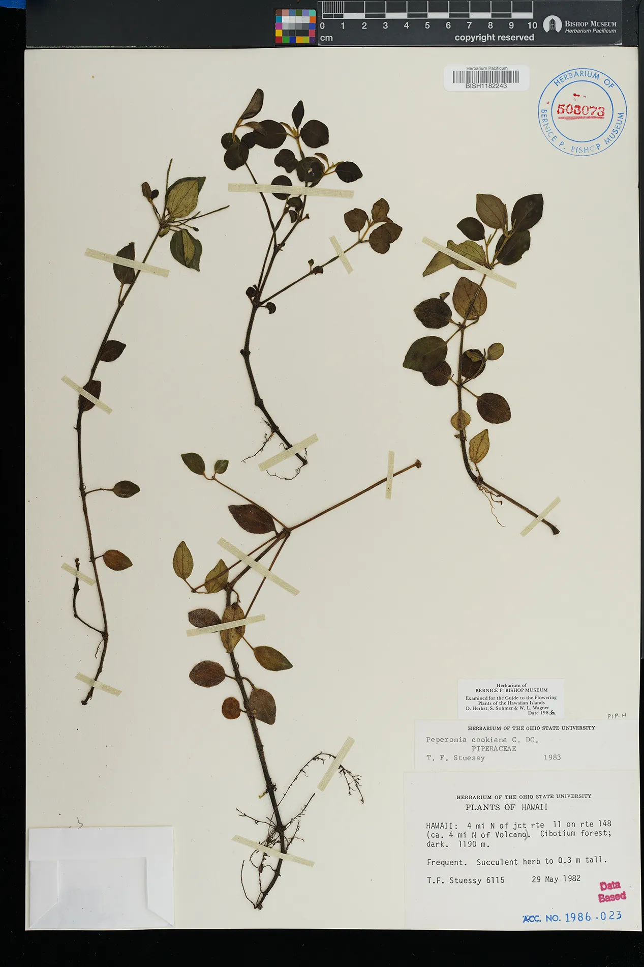 Ohia Mixed Mesic Forest a small herb covering the ground at 3800 ft on a ridge with Metrosideros, Cheirodendron, Myrsine, Dubautia, Hedyotis, Stenogyne and Liparis |