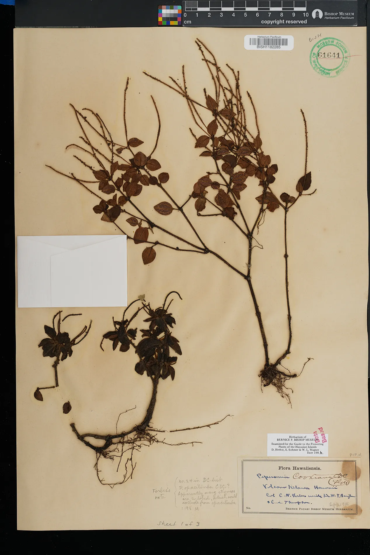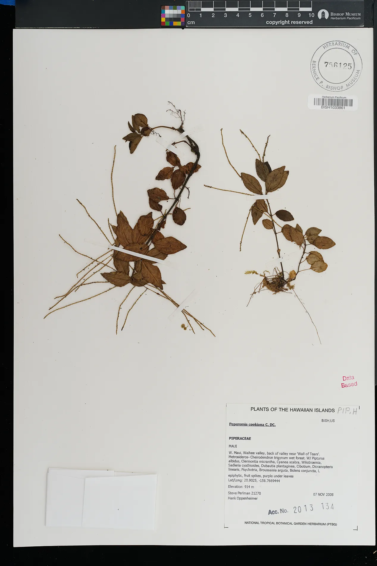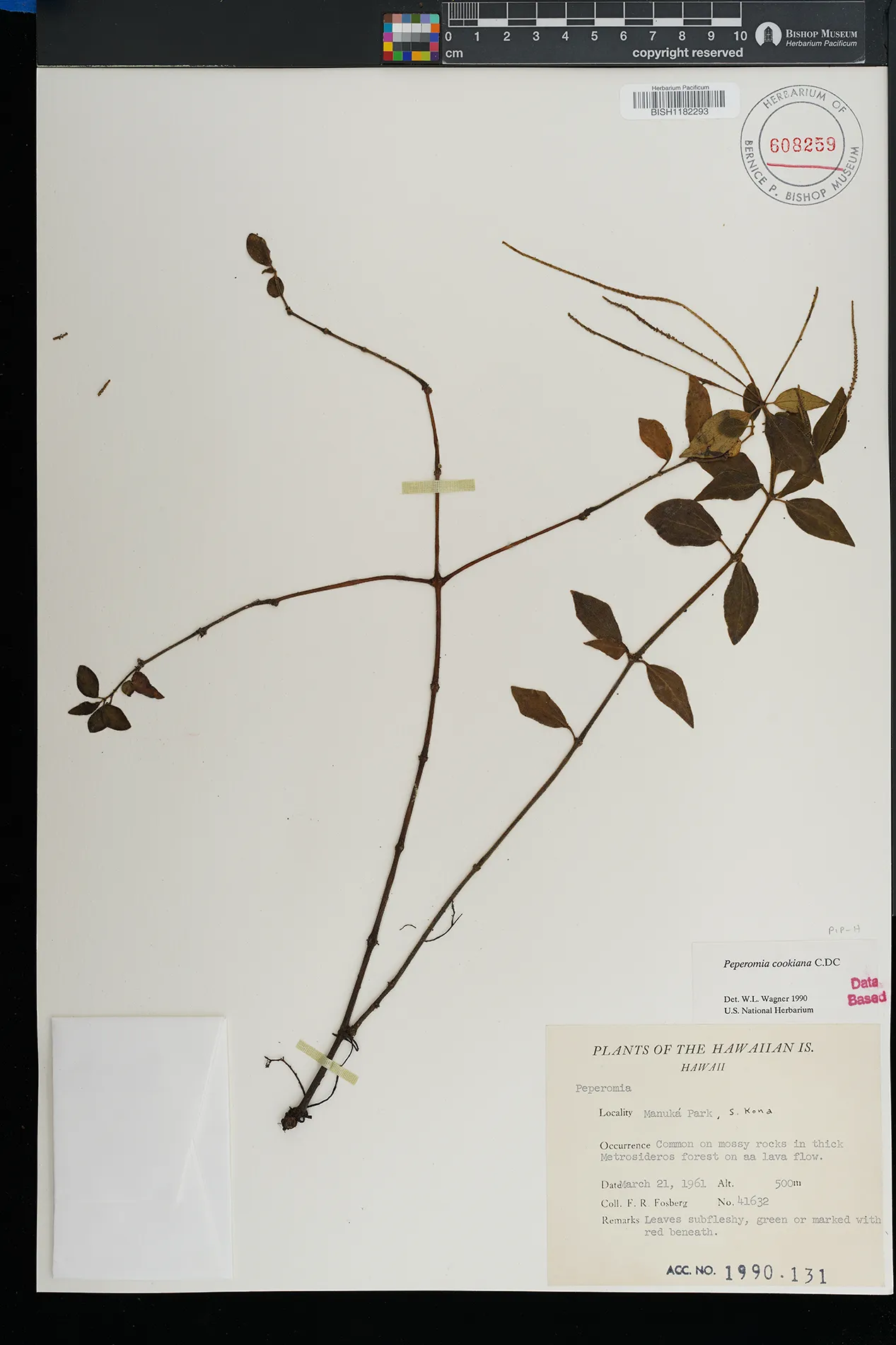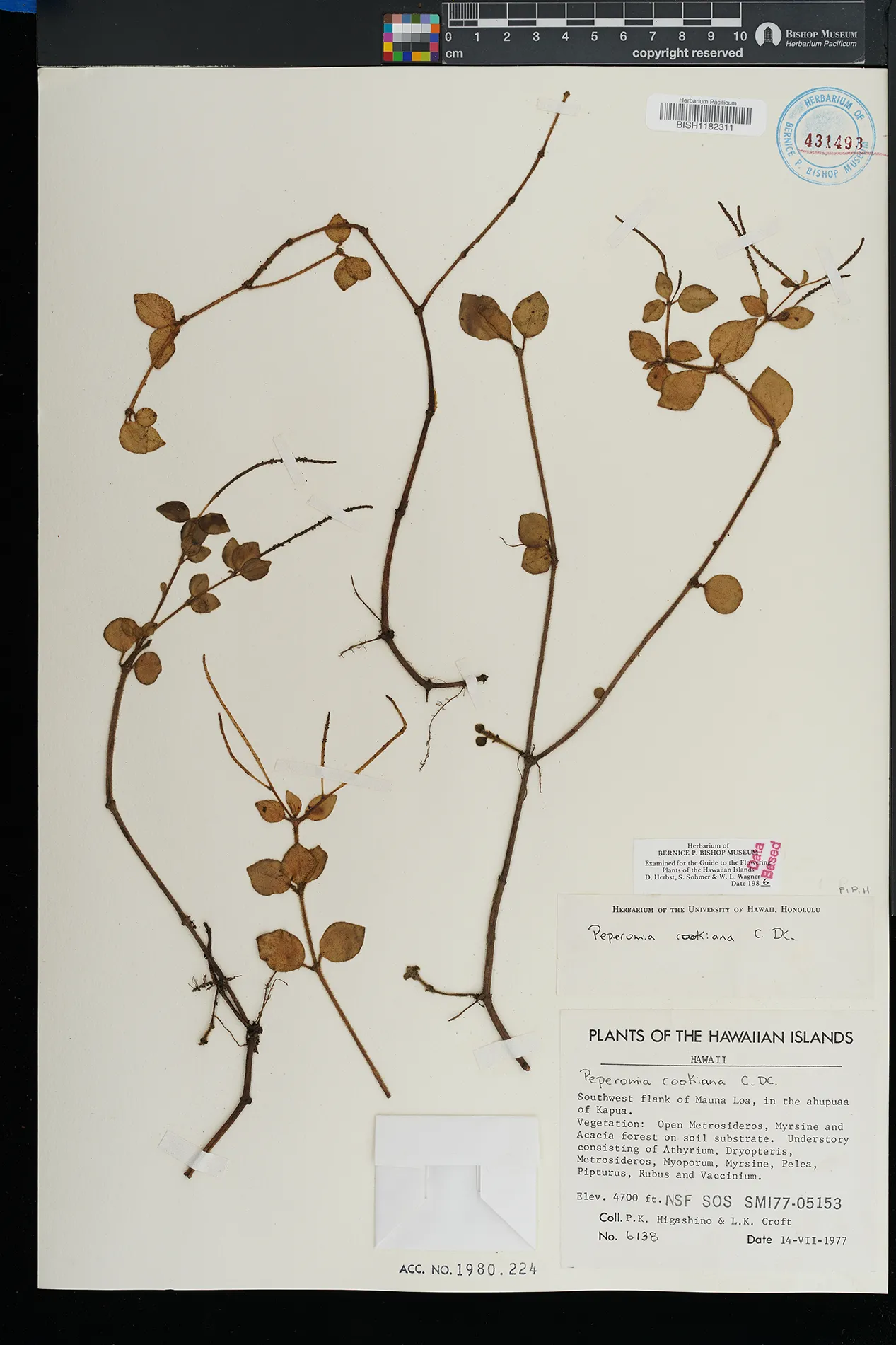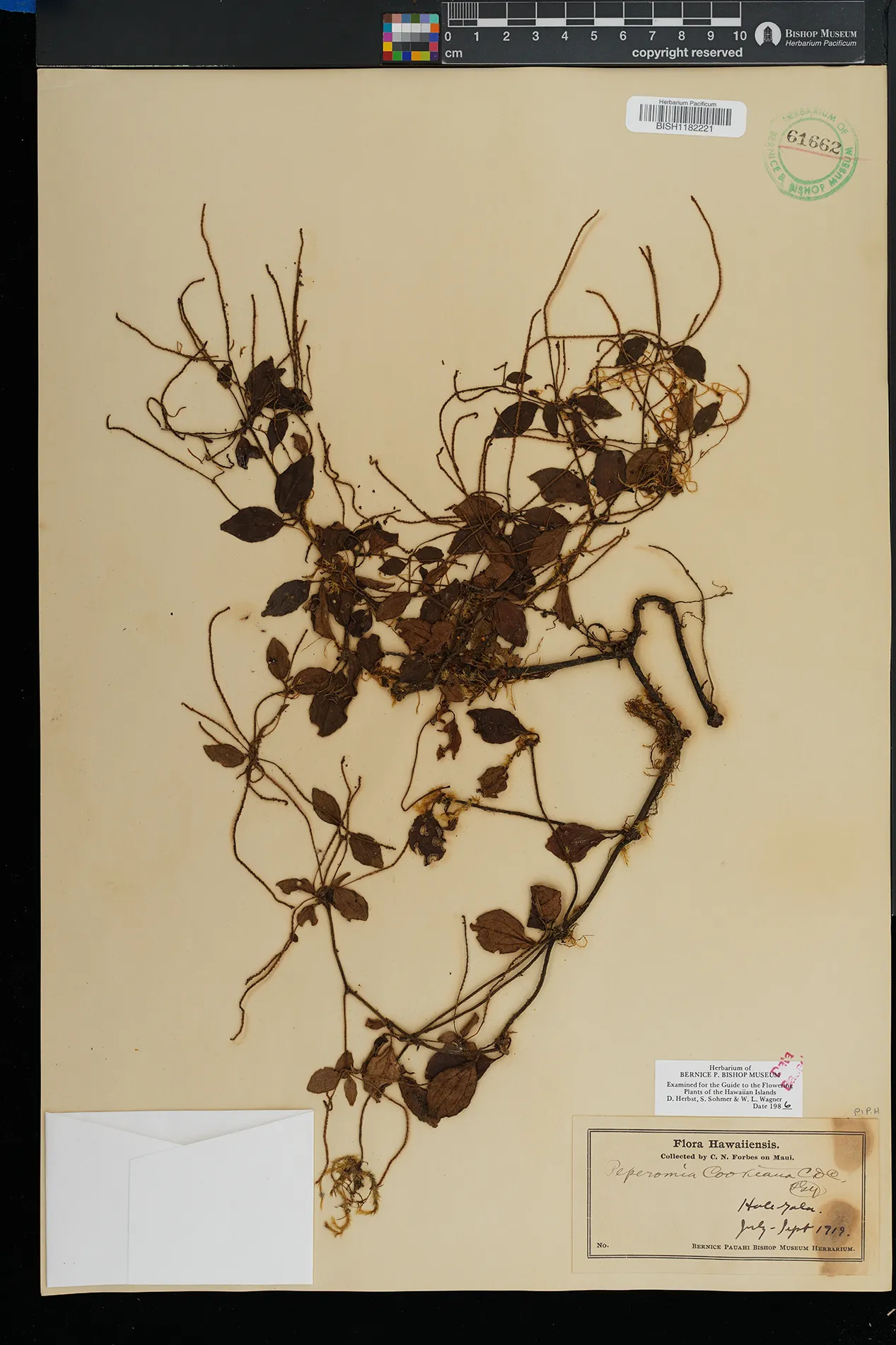 Ohia Mixed Mesic Forest a small herb covering the ground at 3800 ft on a ridge with Metrosideros, Cheirodendron, Myrsine, Dubautia, Hedyotis, Stenogyne and Liparis |