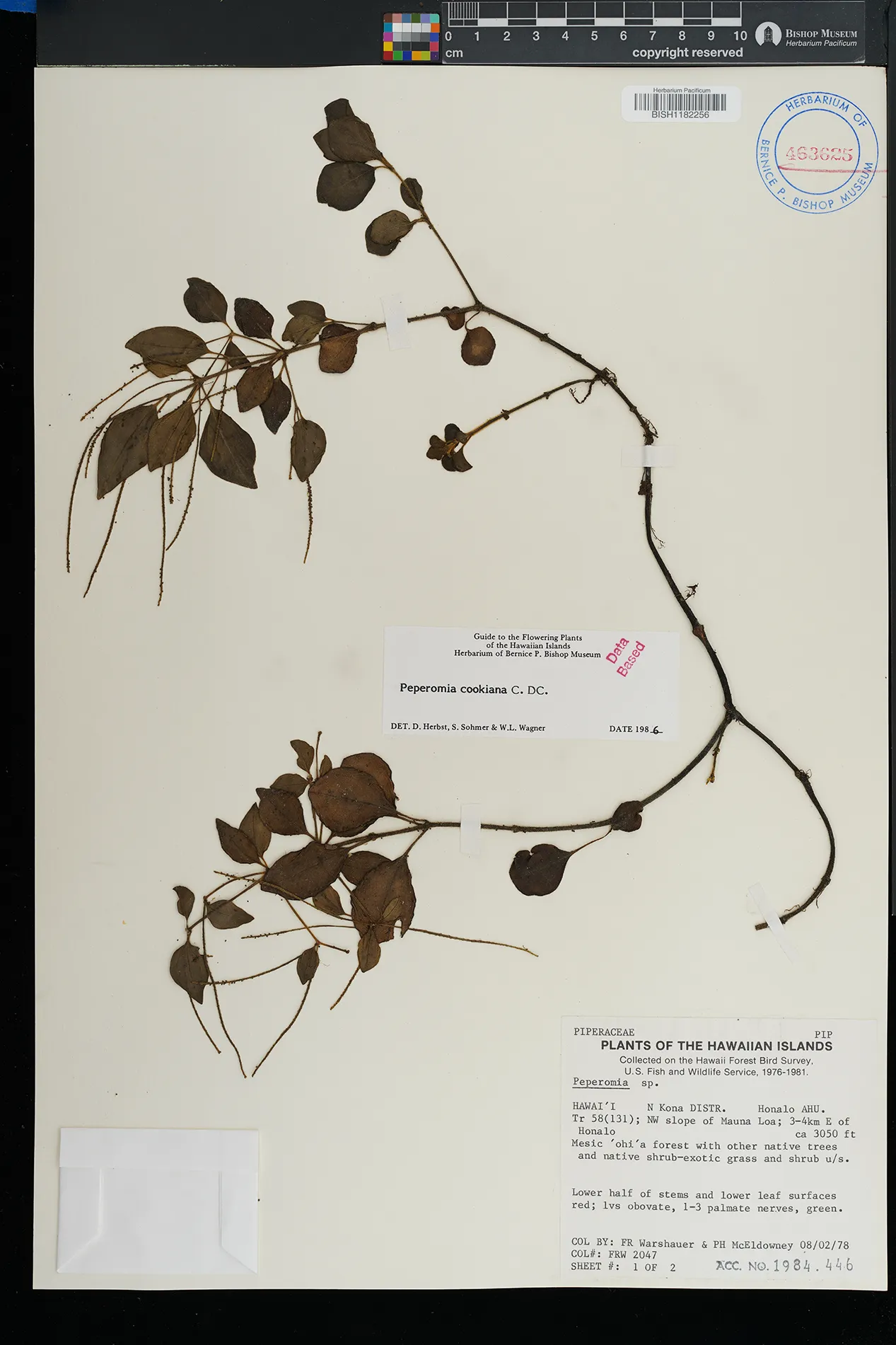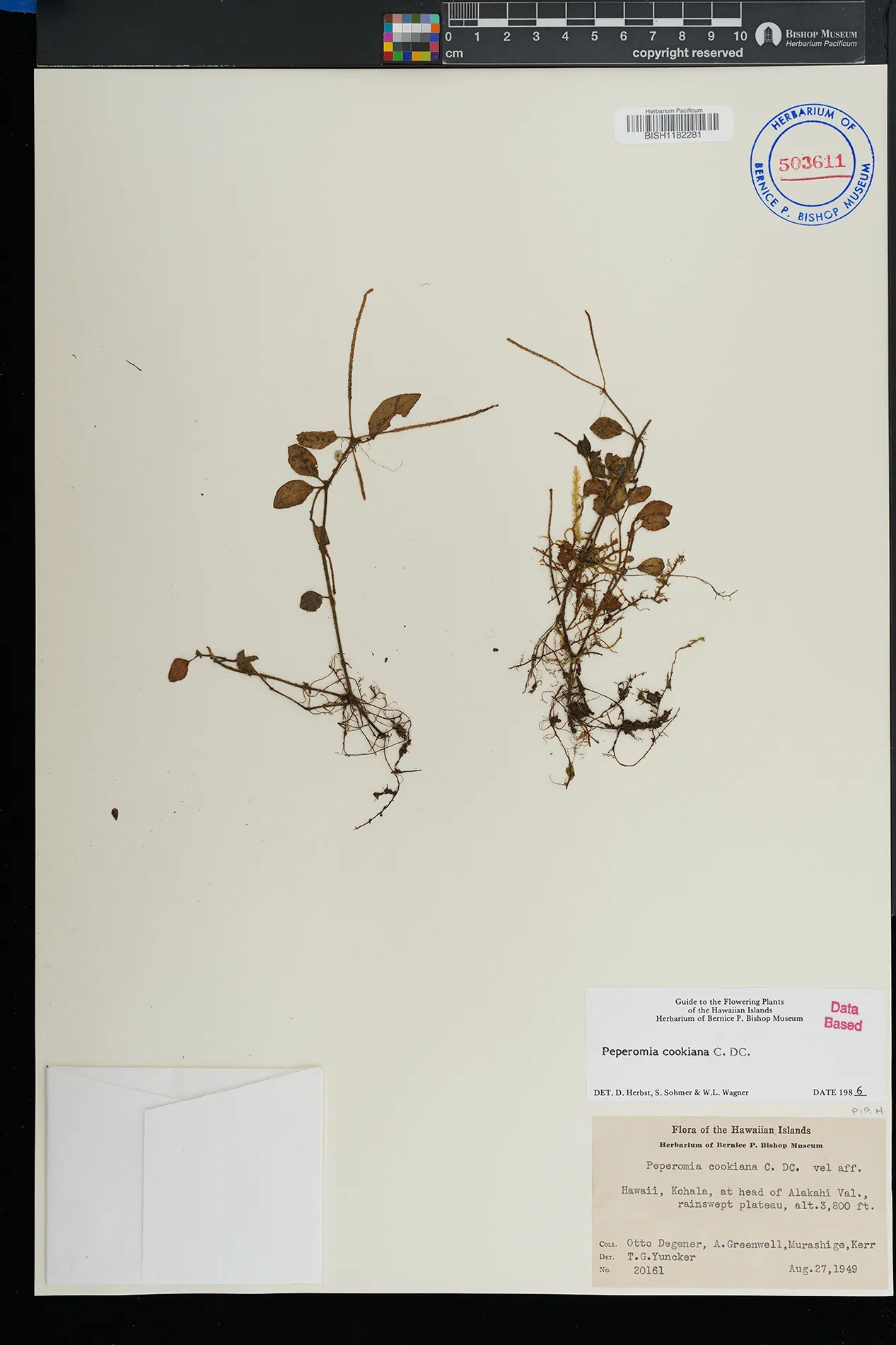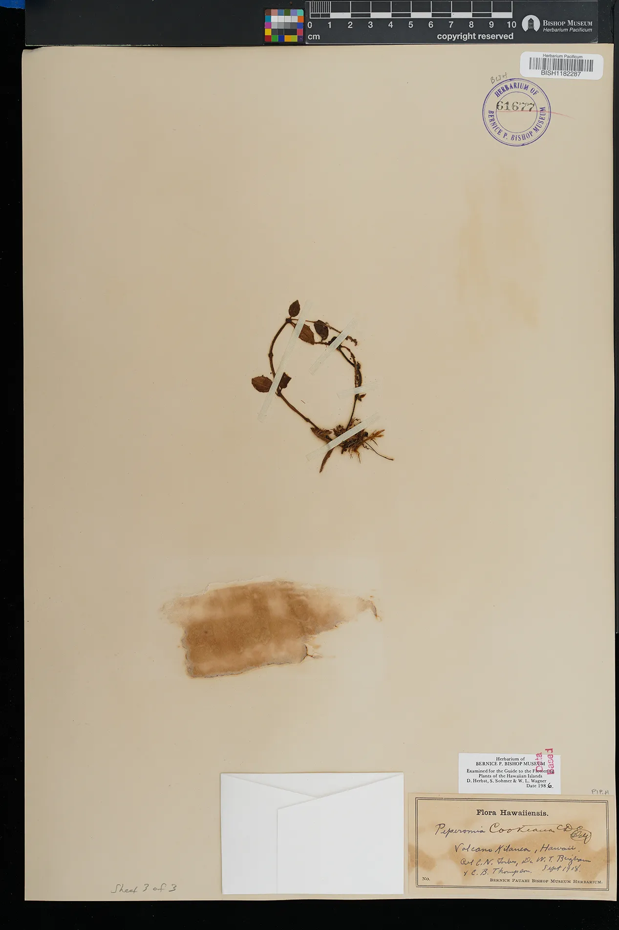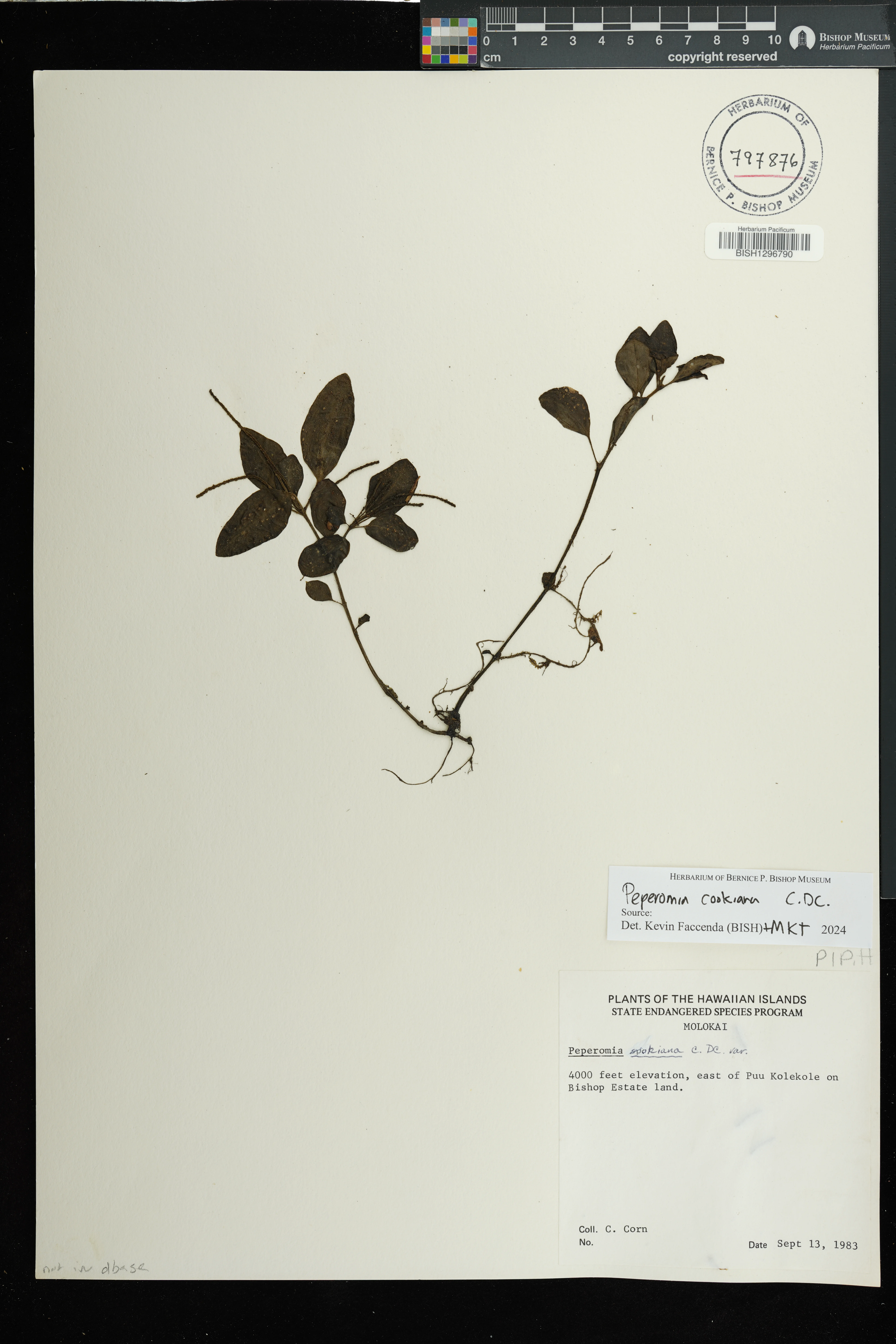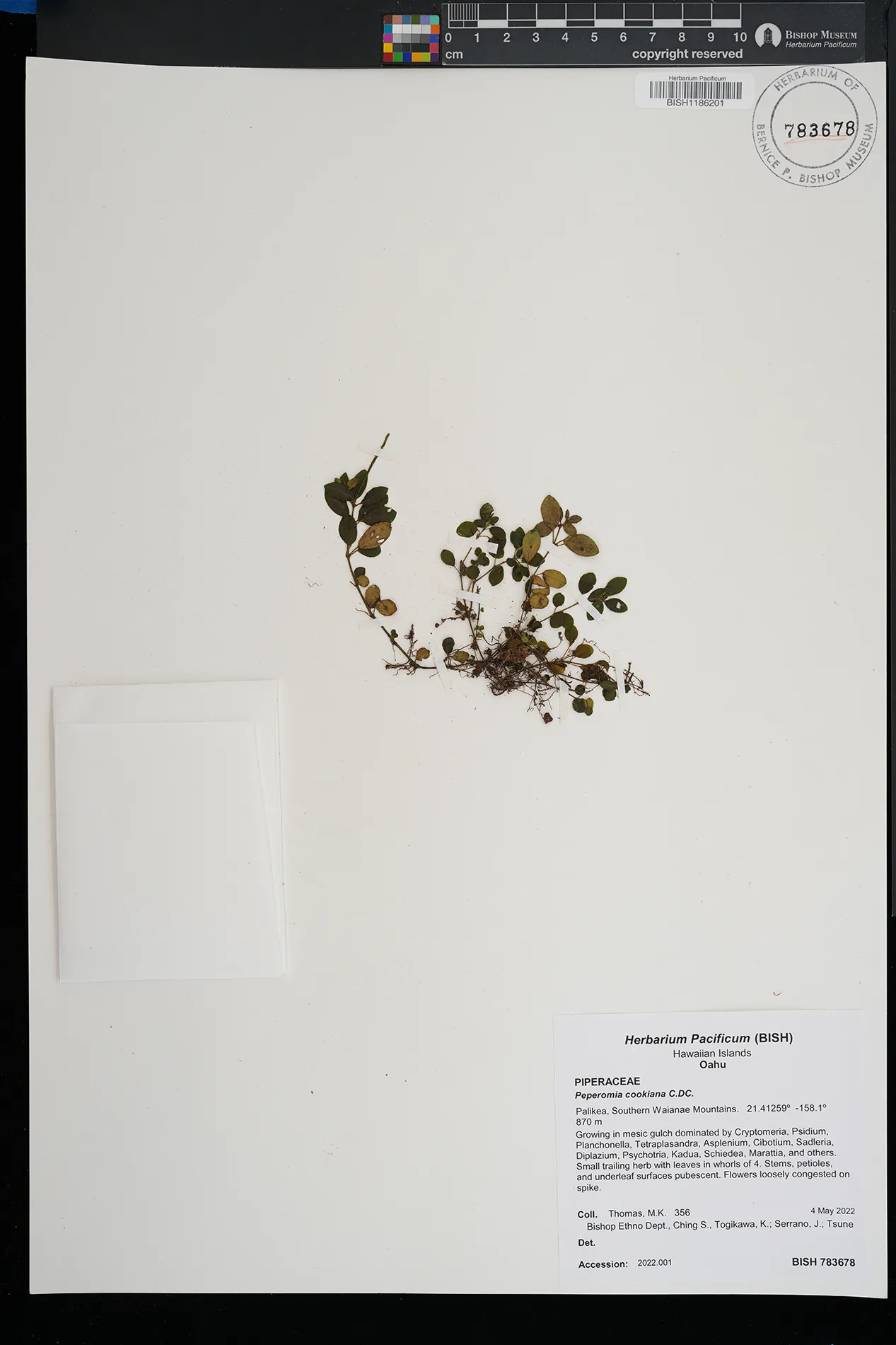 Ohia Mixed Mesic Forest a small herb covering the ground at 3800 ft on a ridge with Metrosideros, Cheirodendron, Myrsine, Dubautia, Hedyotis, Stenogyne and Liparis |