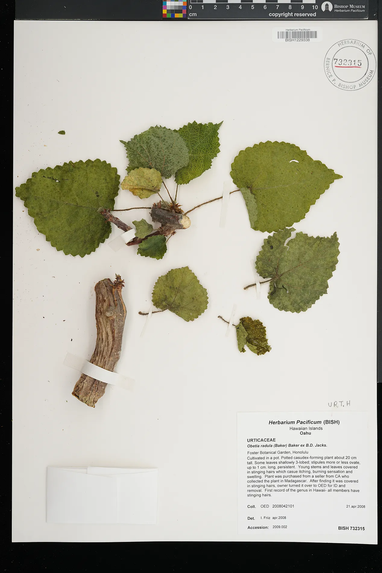 | 2 | Obetia radula | (Baker) Baker ex B.D.Jacks. | foster botanical garden, honolulu | Cultivated in a pot. | PRESERVED_SPECIMEN | oed frohlich, d.; lau, a. | collector number: 2008042101 | Oahu | BISH | 4/21/2008 |