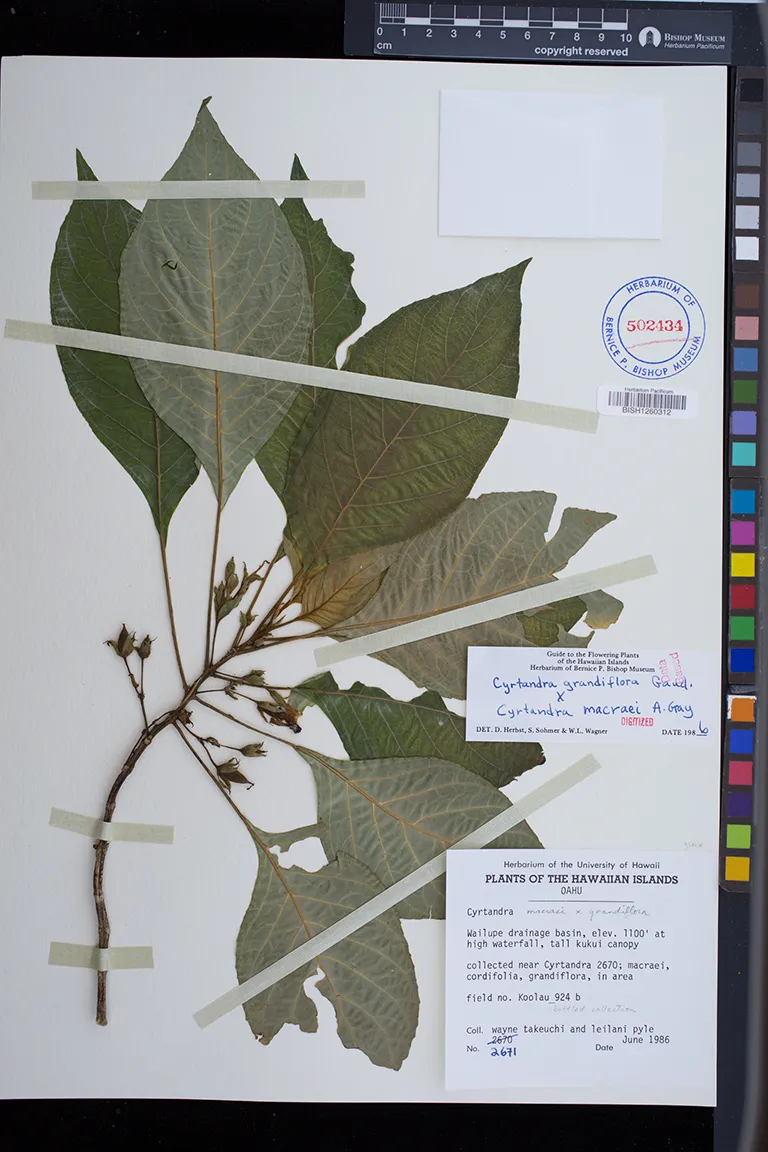 | 1 | Cyrtandra × opposita | Wailupe, high waterfall | kukui | Preserved_Specimen | Takeuchi, W.N. | 2671 | Oahu | BISH | 1986-06-01 | |